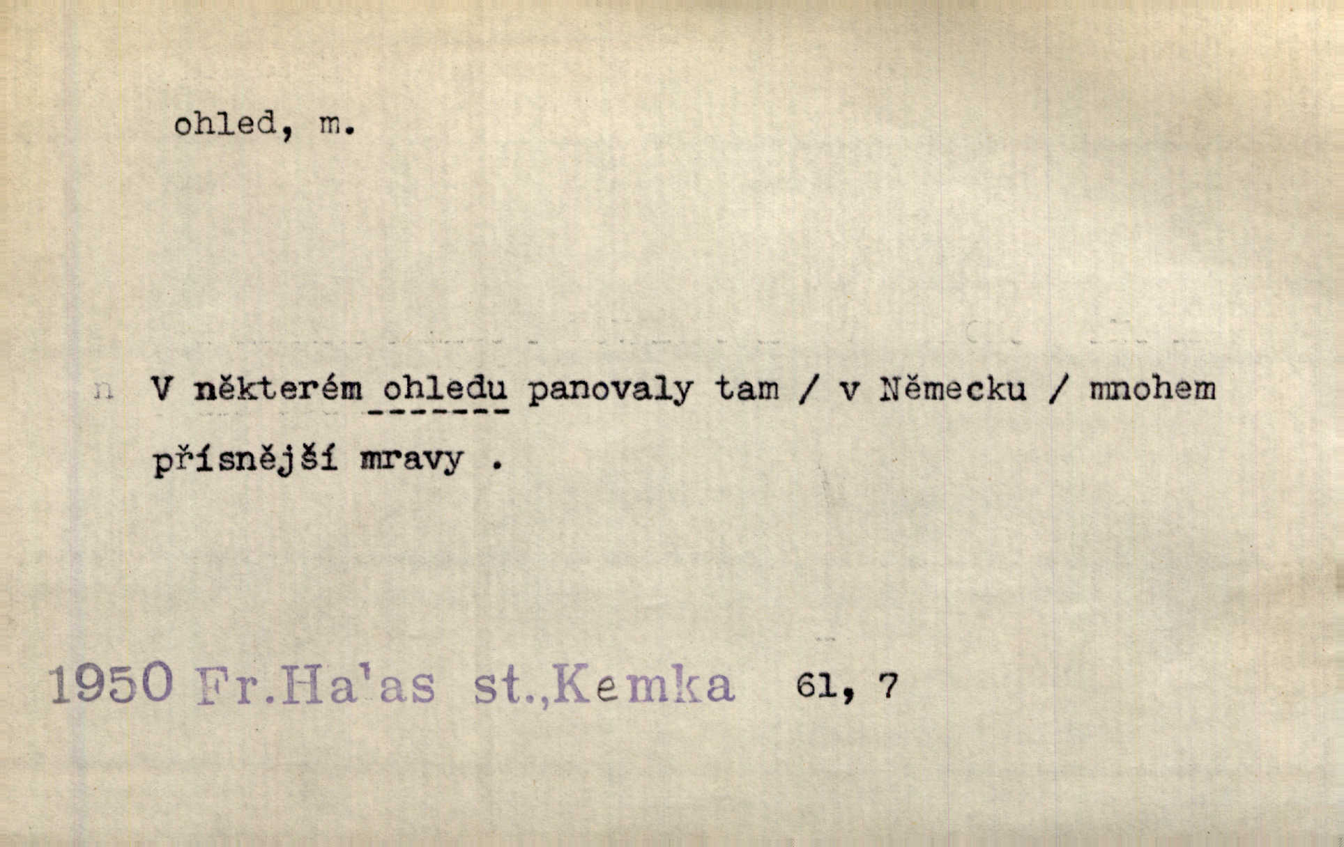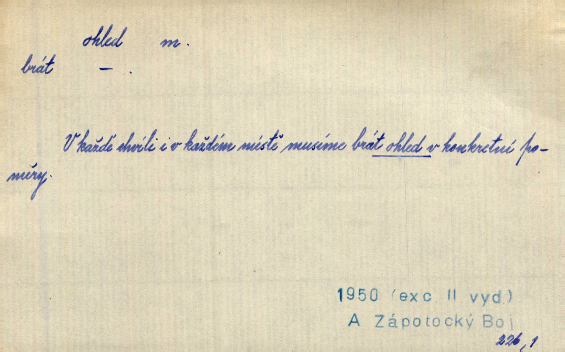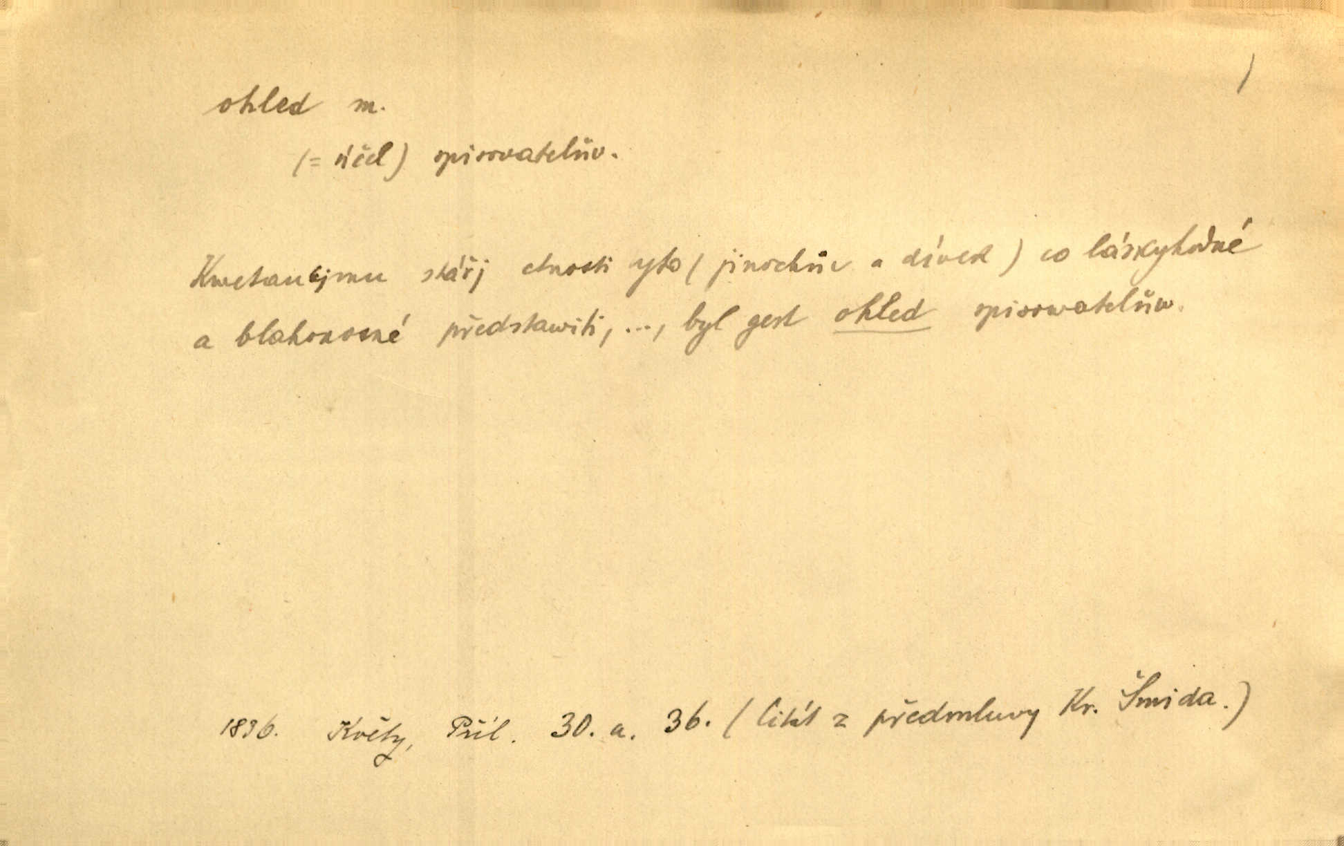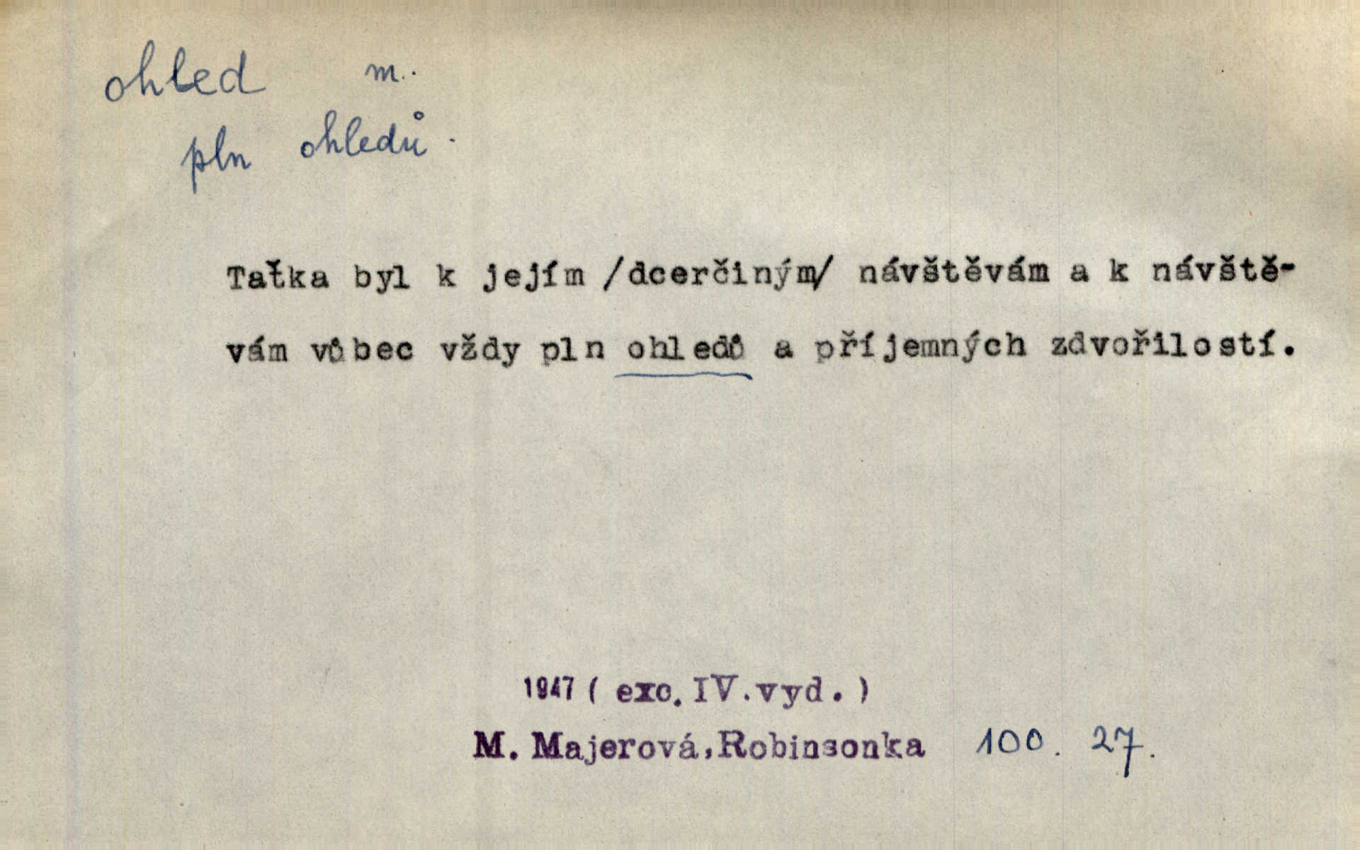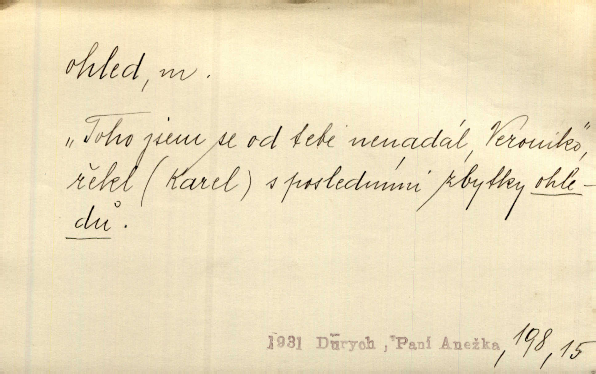 - ohled, -u m. zřetel k zájmu, potřebám, významu a pod. Výminkář nedořekl, snad s ohledem na Barušku. Rais. Budou [páni] přinuceni brát ohled na žádosti a potřeby lidu. Šmil. Nic ti nedali [rodiče], odbyli tě hůř než nějaký podruh, jaké tedy ohledy! Rais. Mám za svou povinnost mluviti o tak vážné věci zcela upřímně, bez obalu, bez ohledu. Bozd. Bylo potřebí člověka nevázaného ohledy ani k svým ani k cizím, aby pověděl své názory tak, jak je pověděl Chelčický. J. Vlč. Nezná společenských ohledů a ignoruje každou slušnost. Vrba. Odmítáme z právních ohledů nějaký čin, ale jako by se nechumelilo, přijímáme jeho důsledky. Dyk. Rozplakala se hlasitě, bez ohledu na to, kdo ji slyší. R. Svob. Zast. Jeho milost královská mu ohledem na zásluhy jeho rodu život daruje. Hál. Jitka se měla ohledem na slabé zdraví jen čtení, psaní a trochu počítání přiučiti. Svět. Ohledem na jeho posud zachovalé mravy odložilo se vyřknutí soudu. Tyl. Nejsi ještě dosti zkušený ohledem na ženské. Podl. D stránka, hledisko, s nichž se nějaká věc pozoruje, posuzuje. Dějiny národu českého jsou v nejednom ohledu poučnější a zajímavější nad dějiny jiných národův. Pal. V ohledu věrnosti žádnému mužskému co věřiti není. Sab. Rozumec je muž v každém ohledu ctihodný. Šmil. Bohatýři byli nejlepšími představiteli národa v ohledu duševném i mravném. Hol. V ohledu politickém byli [adamité] smýšlení republikánského. Jir. V ohledu látkovém byly nyní [za doby „Lumíra“] veškeré doby, veškeré země, veškeré národy, veškeré kultury stejně vítány. Arne N. D ohledy (dial. ohlady), -ů ohledávání, prohlídka. Rychtář přišel na ohledy, aby věznici k smrti souzené v krmích nebylo podáno jedu. Win. Společně se vydáme na ohledy některých těch idejí západnických. Kos. Pojedu dříve do pole než na ohledy za nevěstou námluvy. Jir. Přijdi [děvče] na ohledy, budu v loďce sám. Heyd. Vydal jsem se na ohledy, k panně pěkné na námluvy. Hol. Přijížděli králové z dalekých zemí k ní [princezně] na ohlady, ale ona žádného nechtěla. Něm. Mysl. ohledy zvěře přihlížení při lovu k velikosti zvěře, rychlosti letu a pod. D Arch. úmysl, záměr, cíl, účel. Vidělť škaredé tváře a patrný ohled, jen aby jej vytiskli. Tyl. Opustila jsi dům otcovský z ohledů zrádných? Tyl. Ničemníci kloní se až k zemi, by špatné své ohledy snáze v skutek přivesti mohli. Čel.