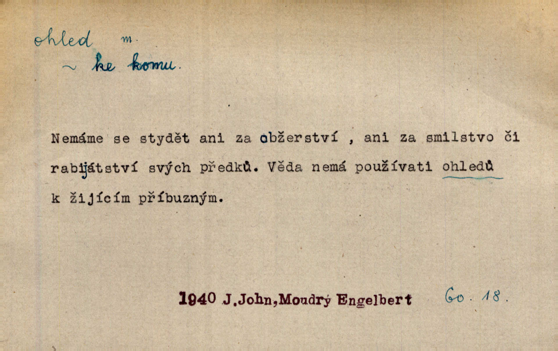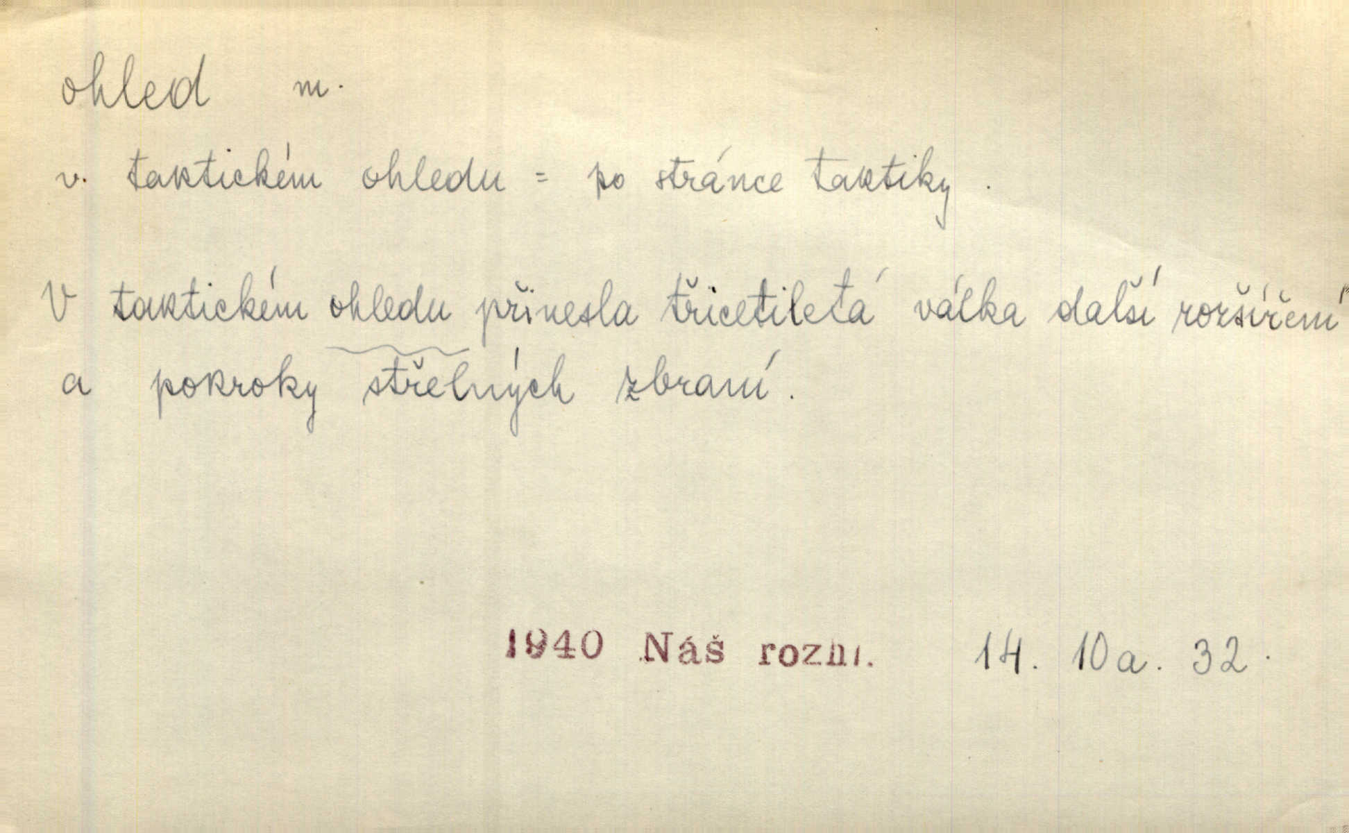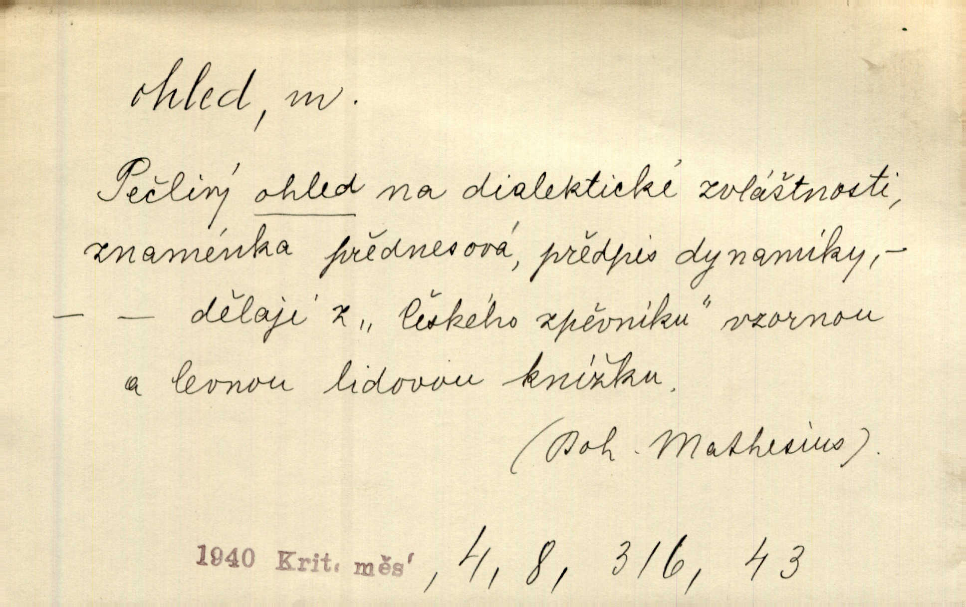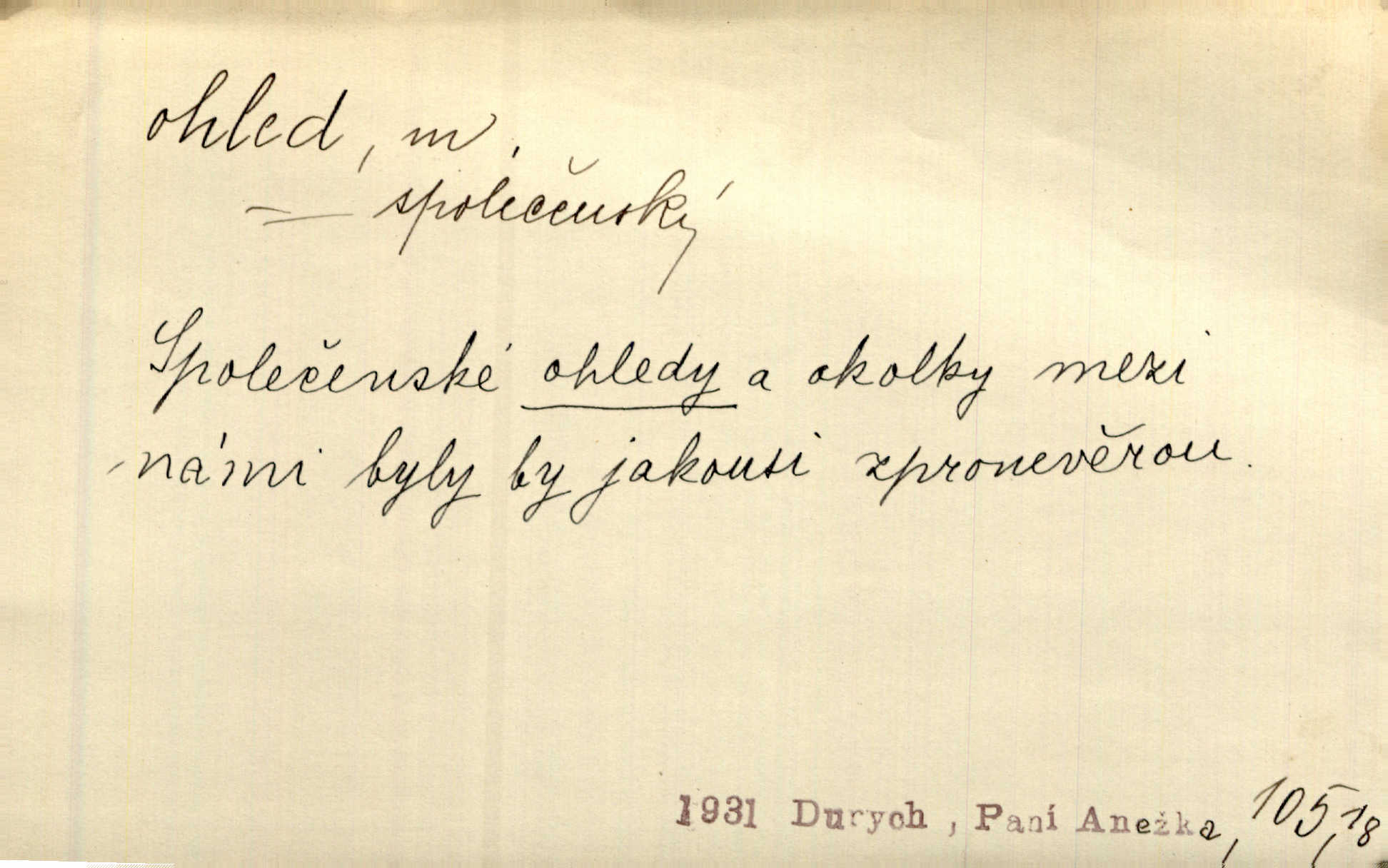 - ohled, -u m. zřetel k zájmu, potřebám, významu a pod. Výminkář nedořekl, snad s ohledem na Barušku. Rais. Budou [páni] přinuceni brát ohled na žádosti a potřeby lidu. Šmil. Nic ti nedali [rodiče], odbyli tě hůř než nějaký podruh, jaké tedy ohledy! Rais. Mám za svou povinnost mluviti o tak vážné věci zcela upřímně, bez obalu, bez ohledu. Bozd. Bylo potřebí člověka nevázaného ohledy ani k svým ani k cizím, aby pověděl své názory tak, jak je pověděl Chelčický. J. Vlč. Nezná společenských ohledů a ignoruje každou slušnost. Vrba. Odmítáme z právních ohledů nějaký čin, ale jako by se nechumelilo, přijímáme jeho důsledky. Dyk. Rozplakala se hlasitě, bez ohledu na to, kdo ji slyší. R. Svob. Zast. Jeho milost královská mu ohledem na zásluhy jeho rodu život daruje. Hál. Jitka se měla ohledem na slabé zdraví jen čtení, psaní a trochu počítání přiučiti. Svět. Ohledem na jeho posud zachovalé mravy odložilo se vyřknutí soudu. Tyl. Nejsi ještě dosti zkušený ohledem na ženské. Podl. D stránka, hledisko, s nichž se nějaká věc pozoruje, posuzuje. Dějiny národu českého jsou v nejednom ohledu poučnější a zajímavější nad dějiny jiných národův. Pal. V ohledu věrnosti žádnému mužskému co věřiti není. Sab. Rozumec je muž v každém ohledu ctihodný. Šmil. Bohatýři byli nejlepšími představiteli národa v ohledu duševném i mravném. Hol. V ohledu politickém byli [adamité] smýšlení republikánského. Jir. V ohledu látkovém byly nyní [za doby „Lumíra“] veškeré doby, veškeré země, veškeré národy, veškeré kultury stejně vítány. Arne N. D ohledy (dial. ohlady), -ů ohledávání, prohlídka. Rychtář přišel na ohledy, aby věznici k smrti souzené v krmích nebylo podáno jedu. Win. Společně se vydáme na ohledy některých těch idejí západnických. Kos. Pojedu dříve do pole než na ohledy za nevěstou námluvy. Jir. Přijdi [děvče] na ohledy, budu v loďce sám. Heyd. Vydal jsem se na ohledy, k panně pěkné na námluvy. Hol. Přijížděli králové z dalekých zemí k ní [princezně] na ohlady, ale ona žádného nechtěla. Něm. Mysl. ohledy zvěře přihlížení při lovu k velikosti zvěře, rychlosti letu a pod. D Arch. úmysl, záměr, cíl, účel. Vidělť škaredé tváře a patrný ohled, jen aby jej vytiskli. Tyl. Opustila jsi dům otcovský z ohledů zrádných? Tyl. Ničemníci kloní se až k zemi, by špatné své ohledy snáze v skutek přivesti mohli. Čel.