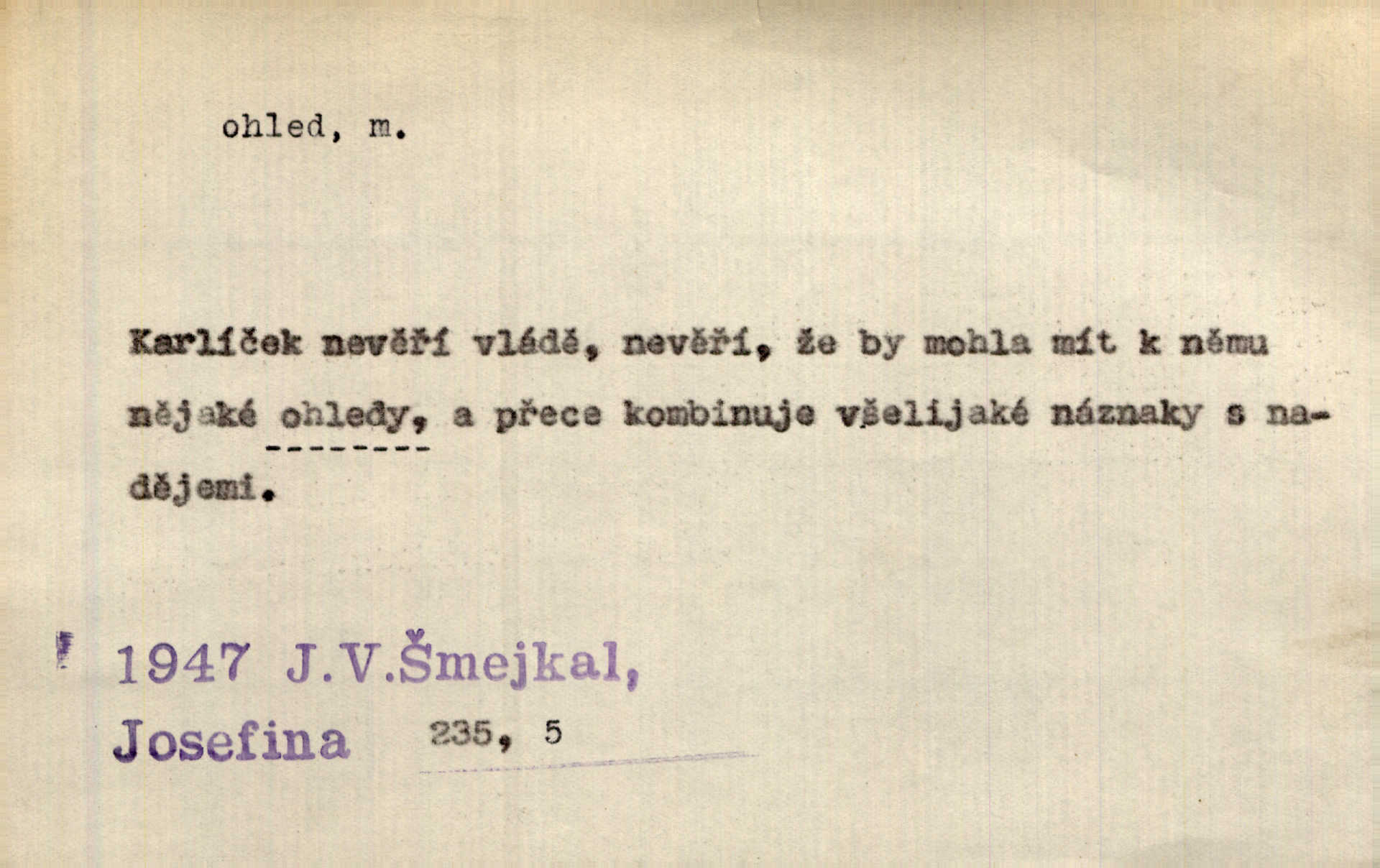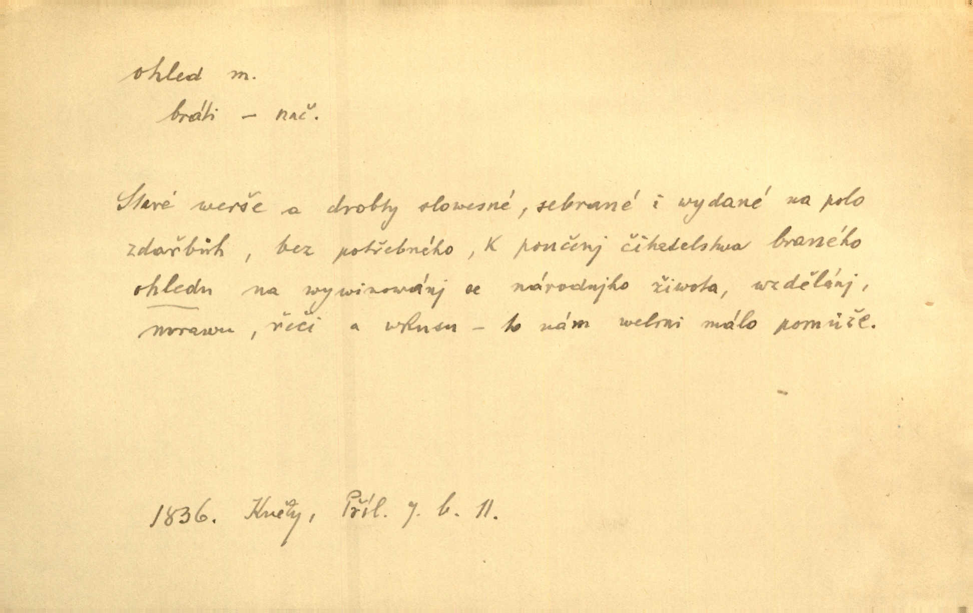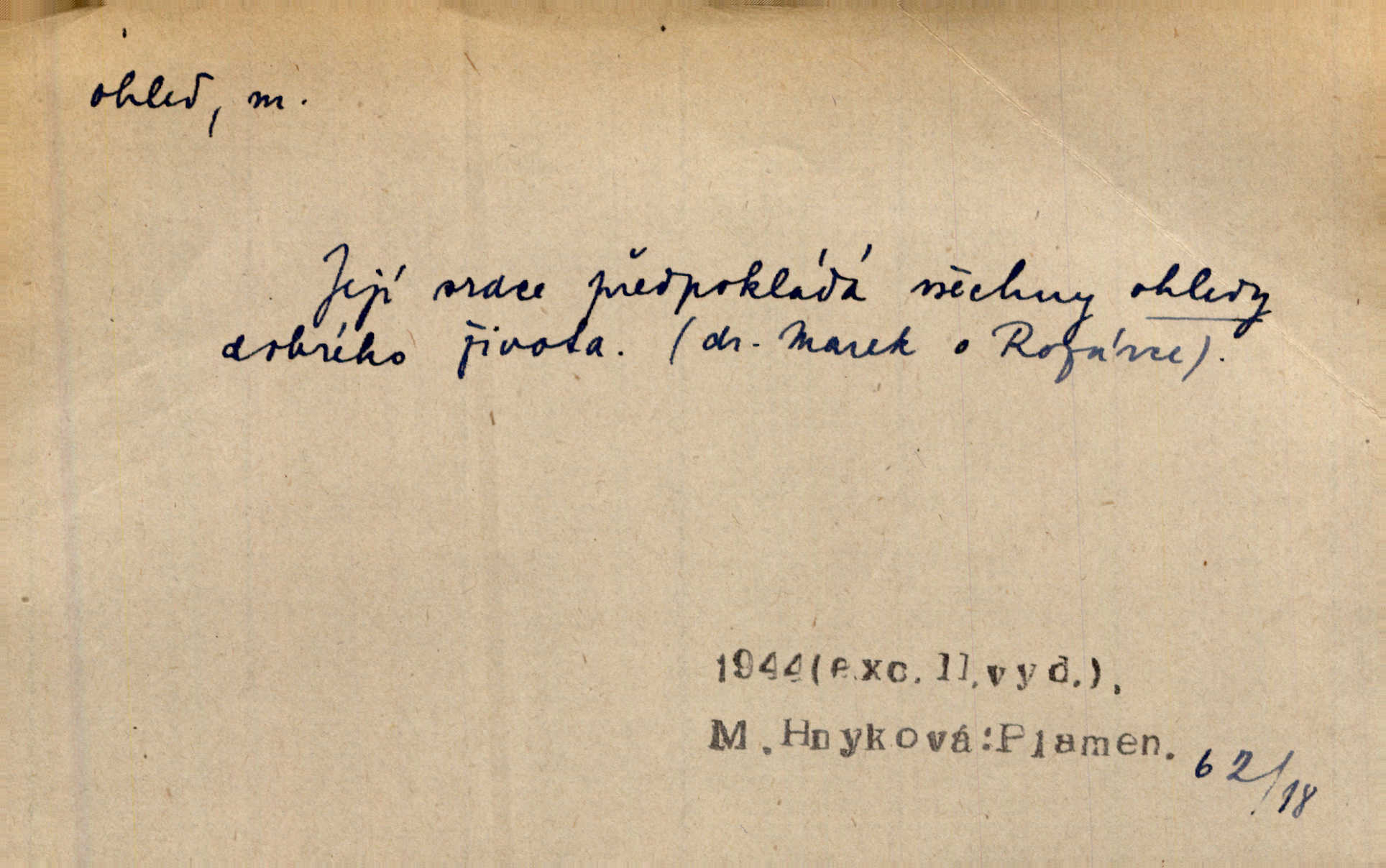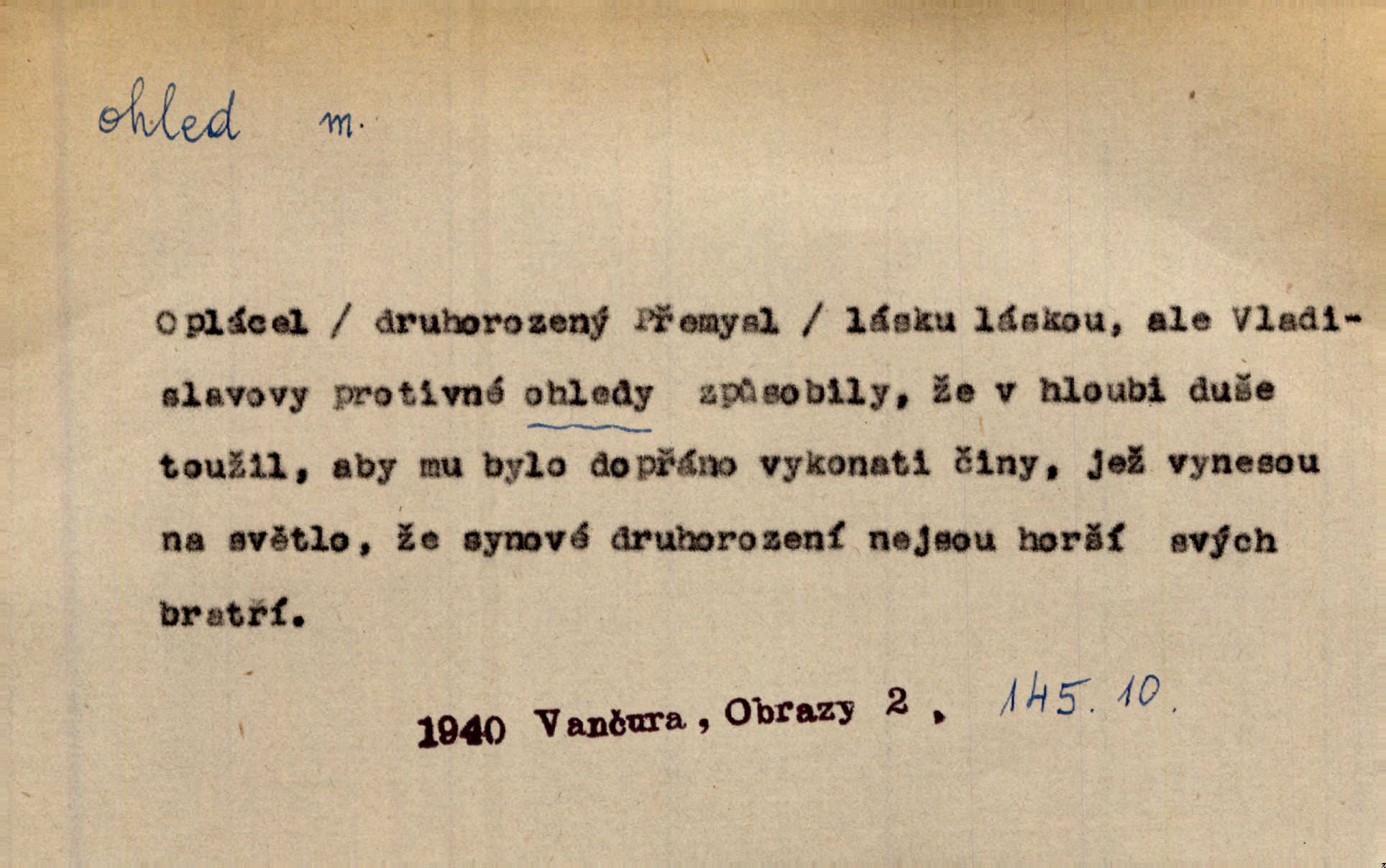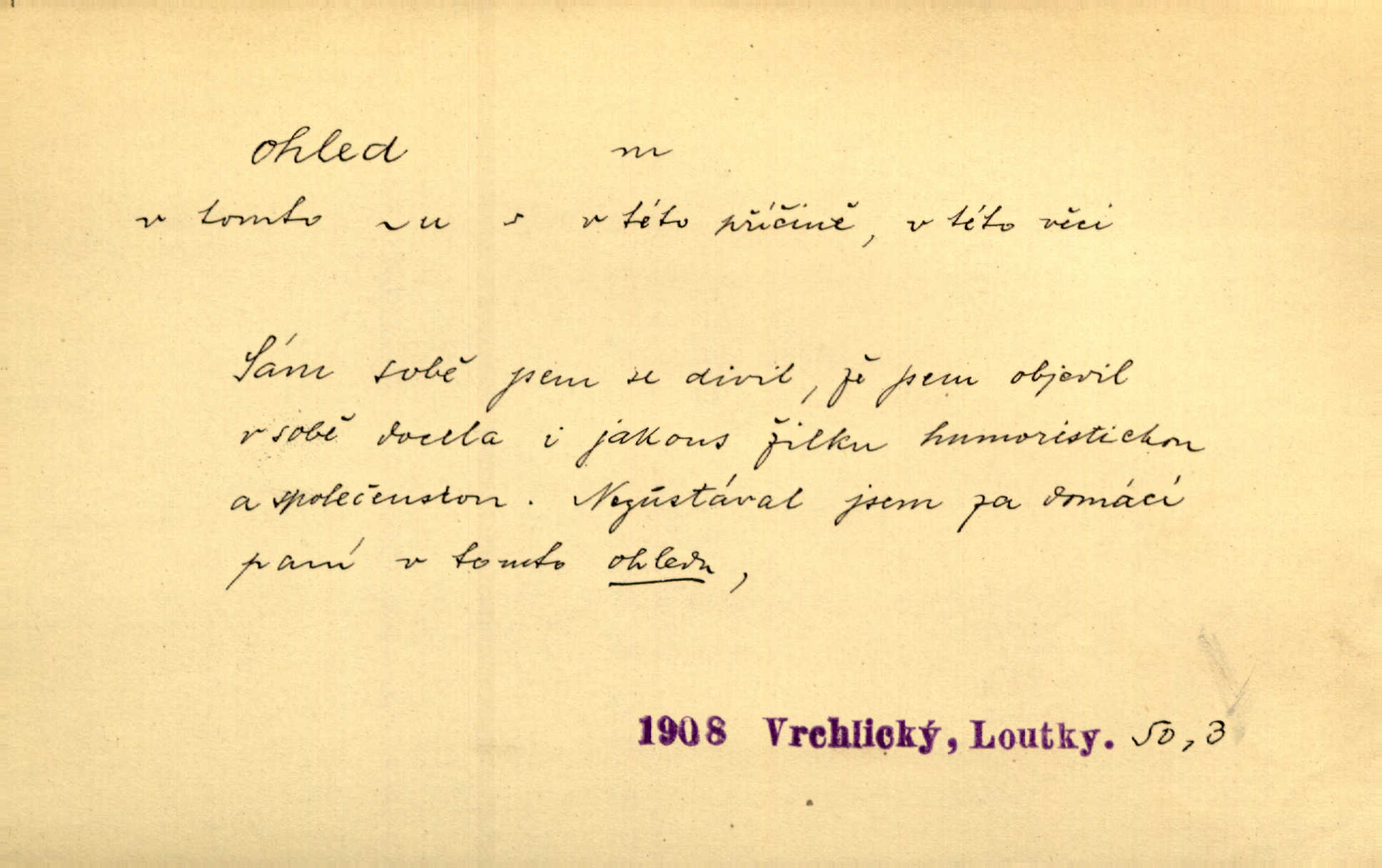 - ohled, -u m. zřetel k zájmu, potřebám, významu a pod. Výminkář nedořekl, snad s ohledem na Barušku. Rais. Budou [páni] přinuceni brát ohled na žádosti a potřeby lidu. Šmil. Nic ti nedali [rodiče], odbyli tě hůř než nějaký podruh, jaké tedy ohledy! Rais. Mám za svou povinnost mluviti o tak vážné věci zcela upřímně, bez obalu, bez ohledu. Bozd. Bylo potřebí člověka nevázaného ohledy ani k svým ani k cizím, aby pověděl své názory tak, jak je pověděl Chelčický. J. Vlč. Nezná společenských ohledů a ignoruje každou slušnost. Vrba. Odmítáme z právních ohledů nějaký čin, ale jako by se nechumelilo, přijímáme jeho důsledky. Dyk. Rozplakala se hlasitě, bez ohledu na to, kdo ji slyší. R. Svob. Zast. Jeho milost královská mu ohledem na zásluhy jeho rodu život daruje. Hál. Jitka se měla ohledem na slabé zdraví jen čtení, psaní a trochu počítání přiučiti. Svět. Ohledem na jeho posud zachovalé mravy odložilo se vyřknutí soudu. Tyl. Nejsi ještě dosti zkušený ohledem na ženské. Podl. D stránka, hledisko, s nichž se nějaká věc pozoruje, posuzuje. Dějiny národu českého jsou v nejednom ohledu poučnější a zajímavější nad dějiny jiných národův. Pal. V ohledu věrnosti žádnému mužskému co věřiti není. Sab. Rozumec je muž v každém ohledu ctihodný. Šmil. Bohatýři byli nejlepšími představiteli národa v ohledu duševném i mravném. Hol. V ohledu politickém byli [adamité] smýšlení republikánského. Jir. V ohledu látkovém byly nyní [za doby „Lumíra“] veškeré doby, veškeré země, veškeré národy, veškeré kultury stejně vítány. Arne N. D ohledy (dial. ohlady), -ů ohledávání, prohlídka. Rychtář přišel na ohledy, aby věznici k smrti souzené v krmích nebylo podáno jedu. Win. Společně se vydáme na ohledy některých těch idejí západnických. Kos. Pojedu dříve do pole než na ohledy za nevěstou námluvy. Jir. Přijdi [děvče] na ohledy, budu v loďce sám. Heyd. Vydal jsem se na ohledy, k panně pěkné na námluvy. Hol. Přijížděli králové z dalekých zemí k ní [princezně] na ohlady, ale ona žádného nechtěla. Něm. Mysl. ohledy zvěře přihlížení při lovu k velikosti zvěře, rychlosti letu a pod. D Arch. úmysl, záměr, cíl, účel. Vidělť škaredé tváře a patrný ohled, jen aby jej vytiskli. Tyl. Opustila jsi dům otcovský z ohledů zrádných? Tyl. Ničemníci kloní se až k zemi, by špatné své ohledy snáze v skutek přivesti mohli. Čel.