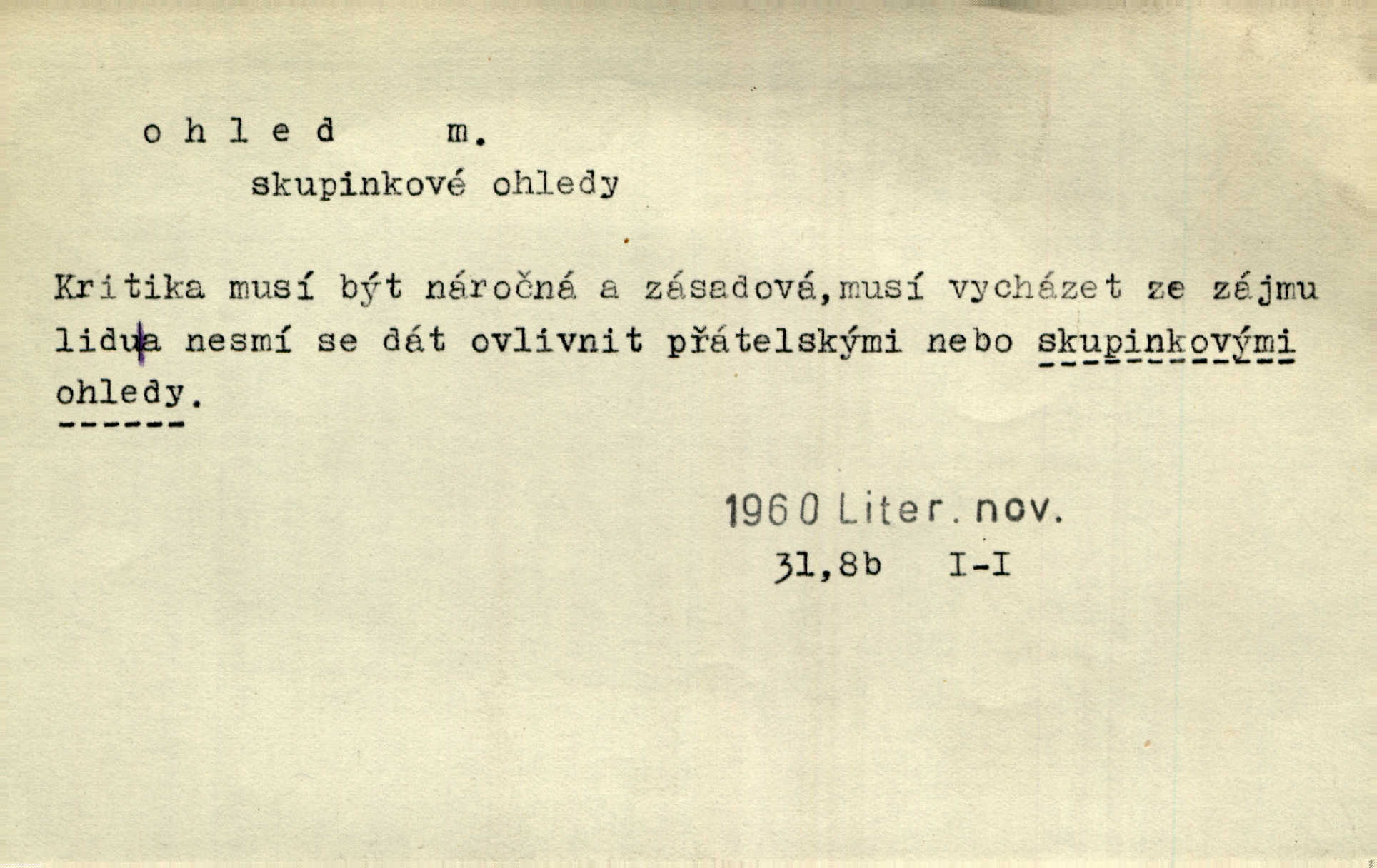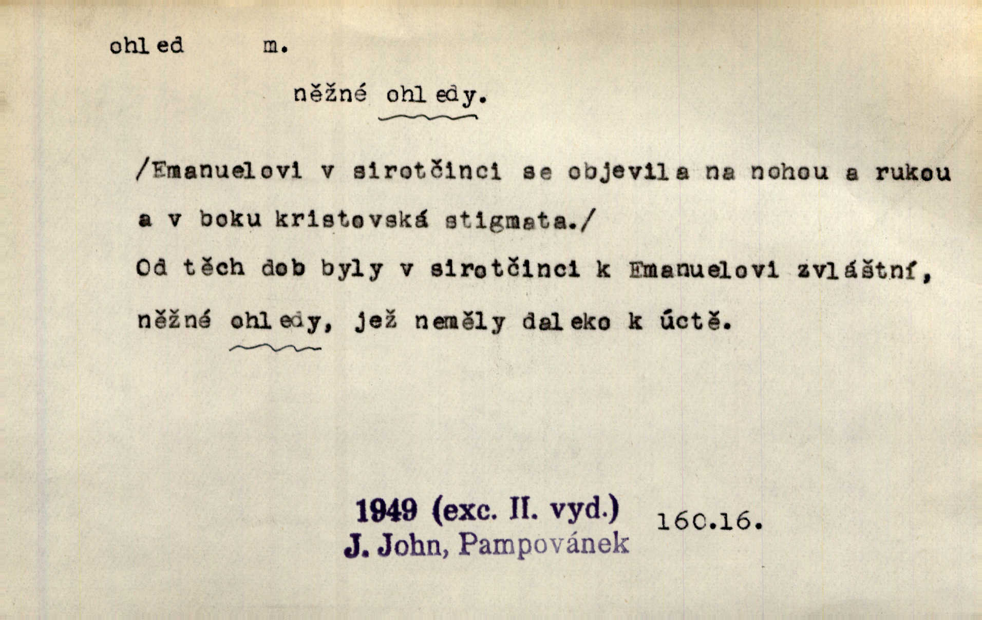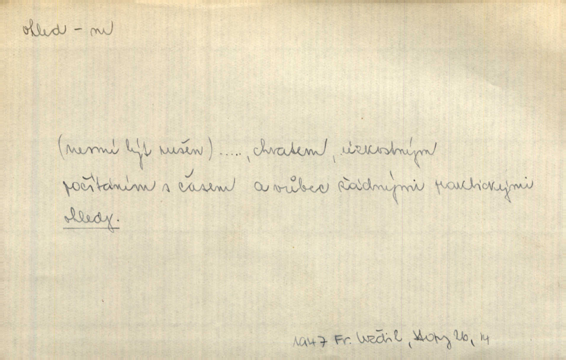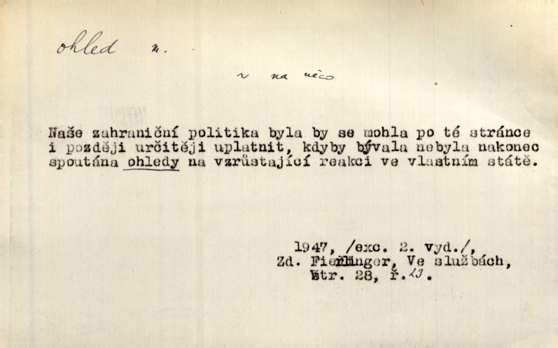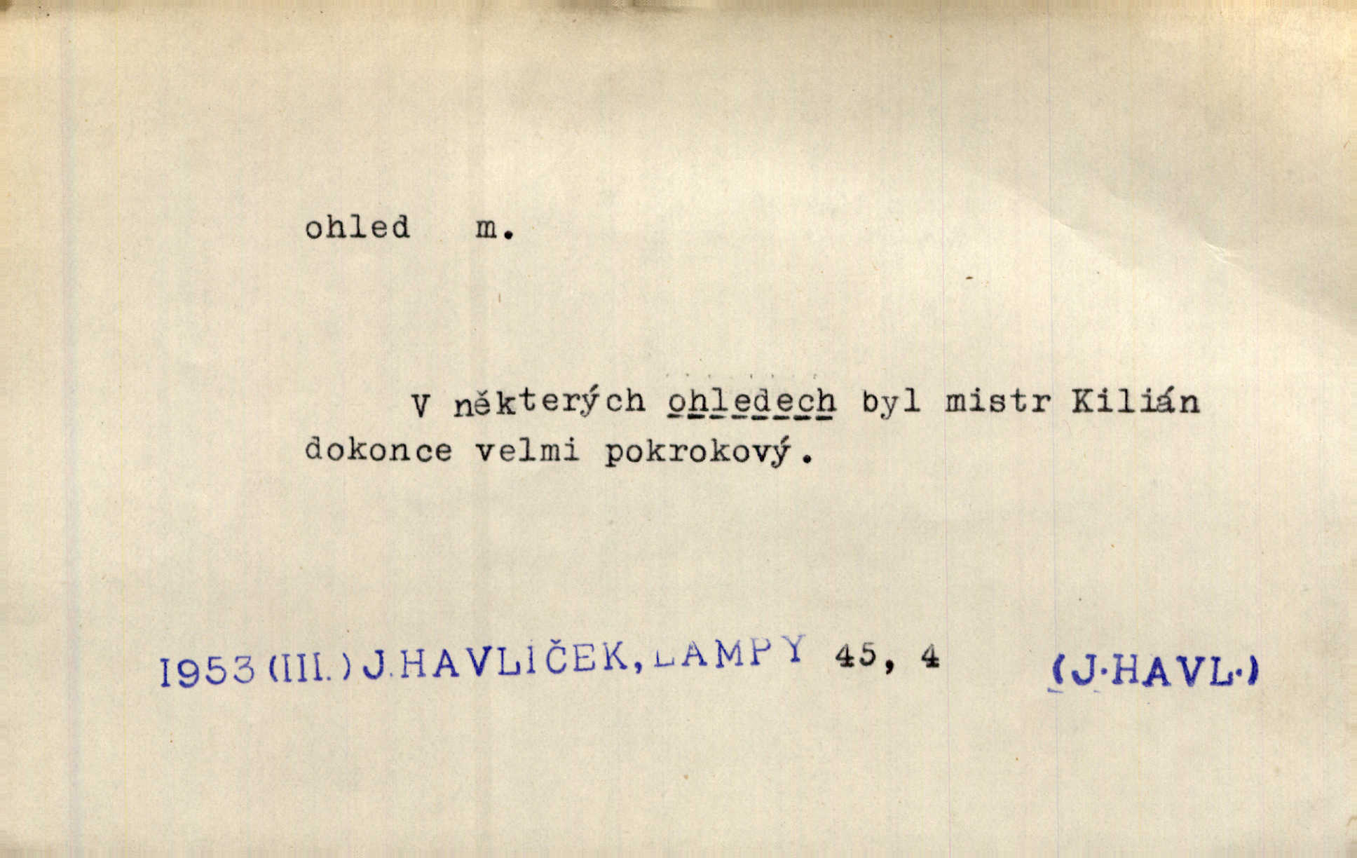 - ohled, -u m. zřetel k zájmu, potřebám, významu a pod. Výminkář nedořekl, snad s ohledem na Barušku. Rais. Budou [páni] přinuceni brát ohled na žádosti a potřeby lidu. Šmil. Nic ti nedali [rodiče], odbyli tě hůř než nějaký podruh, jaké tedy ohledy! Rais. Mám za svou povinnost mluviti o tak vážné věci zcela upřímně, bez obalu, bez ohledu. Bozd. Bylo potřebí člověka nevázaného ohledy ani k svým ani k cizím, aby pověděl své názory tak, jak je pověděl Chelčický. J. Vlč. Nezná společenských ohledů a ignoruje každou slušnost. Vrba. Odmítáme z právních ohledů nějaký čin, ale jako by se nechumelilo, přijímáme jeho důsledky. Dyk. Rozplakala se hlasitě, bez ohledu na to, kdo ji slyší. R. Svob. Zast. Jeho milost královská mu ohledem na zásluhy jeho rodu život daruje. Hál. Jitka se měla ohledem na slabé zdraví jen čtení, psaní a trochu počítání přiučiti. Svět. Ohledem na jeho posud zachovalé mravy odložilo se vyřknutí soudu. Tyl. Nejsi ještě dosti zkušený ohledem na ženské. Podl. D stránka, hledisko, s nichž se nějaká věc pozoruje, posuzuje. Dějiny národu českého jsou v nejednom ohledu poučnější a zajímavější nad dějiny jiných národův. Pal. V ohledu věrnosti žádnému mužskému co věřiti není. Sab. Rozumec je muž v každém ohledu ctihodný. Šmil. Bohatýři byli nejlepšími představiteli národa v ohledu duševném i mravném. Hol. V ohledu politickém byli [adamité] smýšlení republikánského. Jir. V ohledu látkovém byly nyní [za doby „Lumíra“] veškeré doby, veškeré země, veškeré národy, veškeré kultury stejně vítány. Arne N. D ohledy (dial. ohlady), -ů ohledávání, prohlídka. Rychtář přišel na ohledy, aby věznici k smrti souzené v krmích nebylo podáno jedu. Win. Společně se vydáme na ohledy některých těch idejí západnických. Kos. Pojedu dříve do pole než na ohledy za nevěstou námluvy. Jir. Přijdi [děvče] na ohledy, budu v loďce sám. Heyd. Vydal jsem se na ohledy, k panně pěkné na námluvy. Hol. Přijížděli králové z dalekých zemí k ní [princezně] na ohlady, ale ona žádného nechtěla. Něm. Mysl. ohledy zvěře přihlížení při lovu k velikosti zvěře, rychlosti letu a pod. D Arch. úmysl, záměr, cíl, účel. Vidělť škaredé tváře a patrný ohled, jen aby jej vytiskli. Tyl. Opustila jsi dům otcovský z ohledů zrádných? Tyl. Ničemníci kloní se až k zemi, by špatné své ohledy snáze v skutek přivesti mohli. Čel.