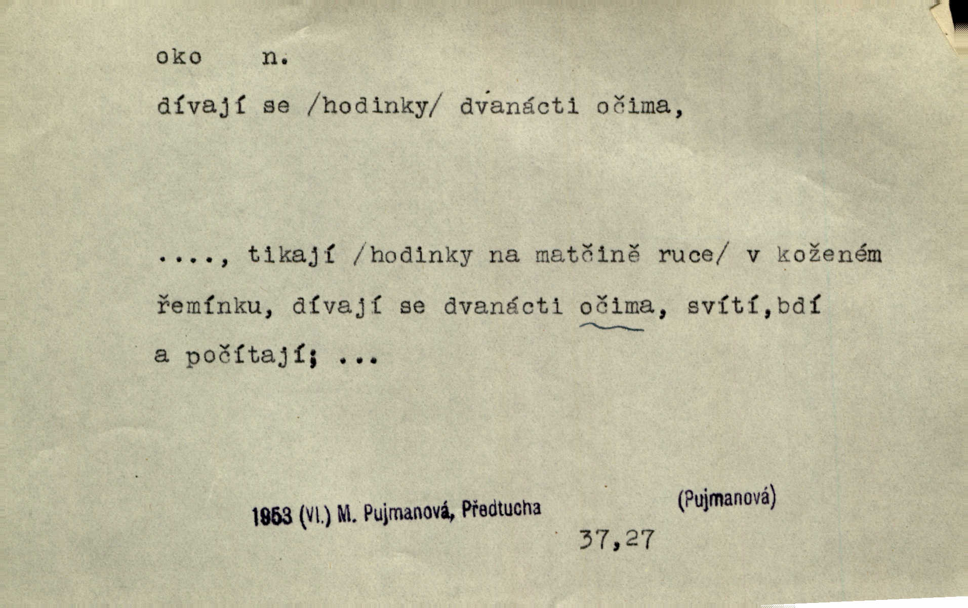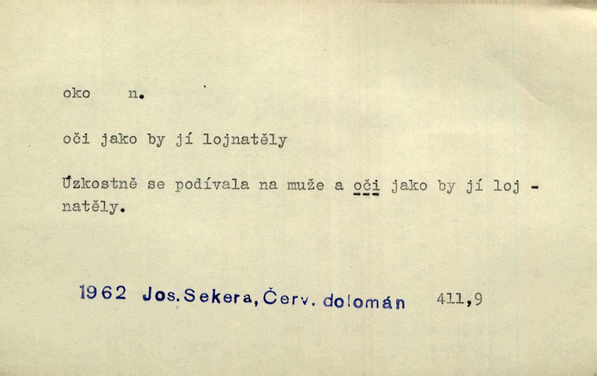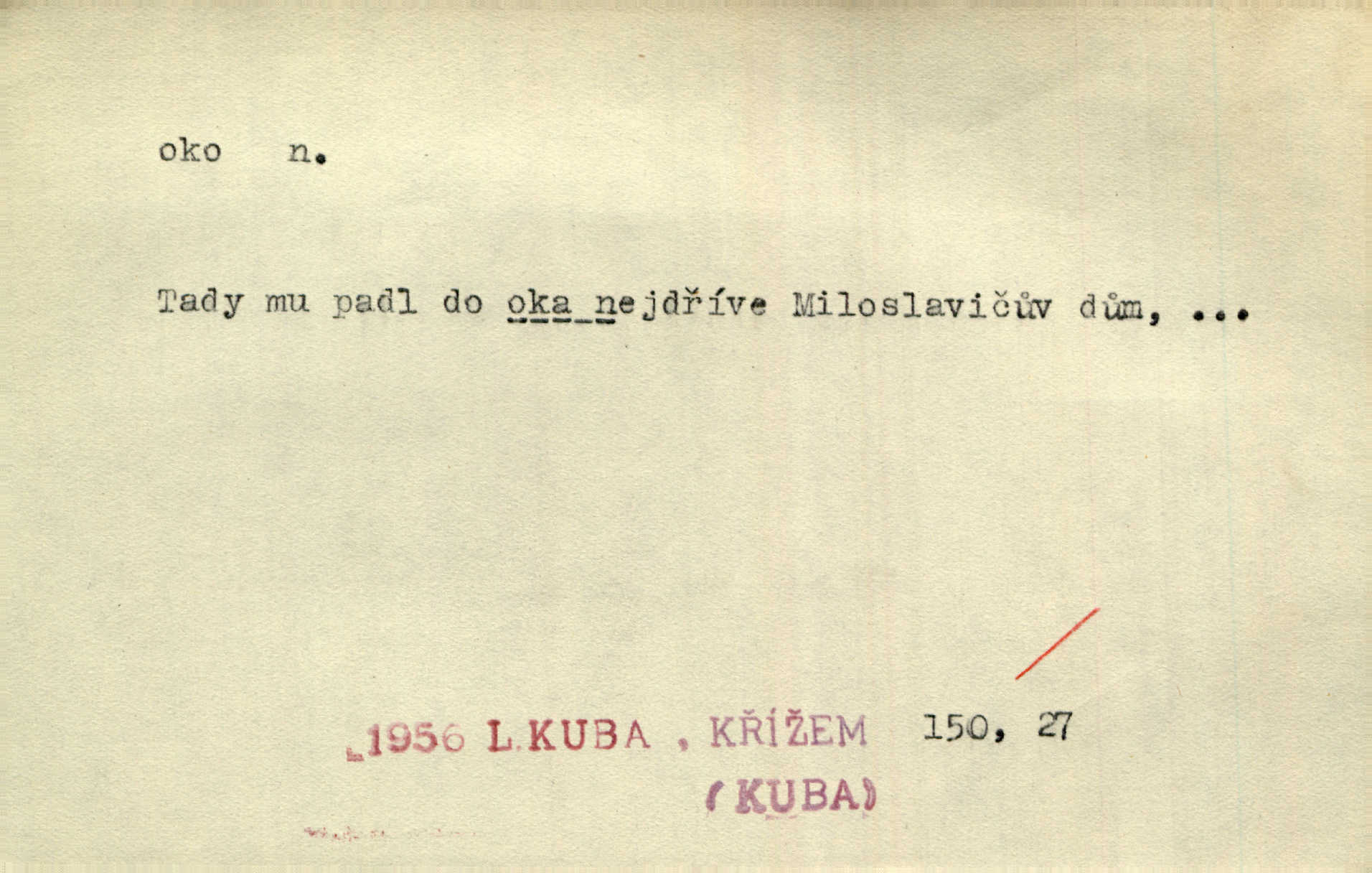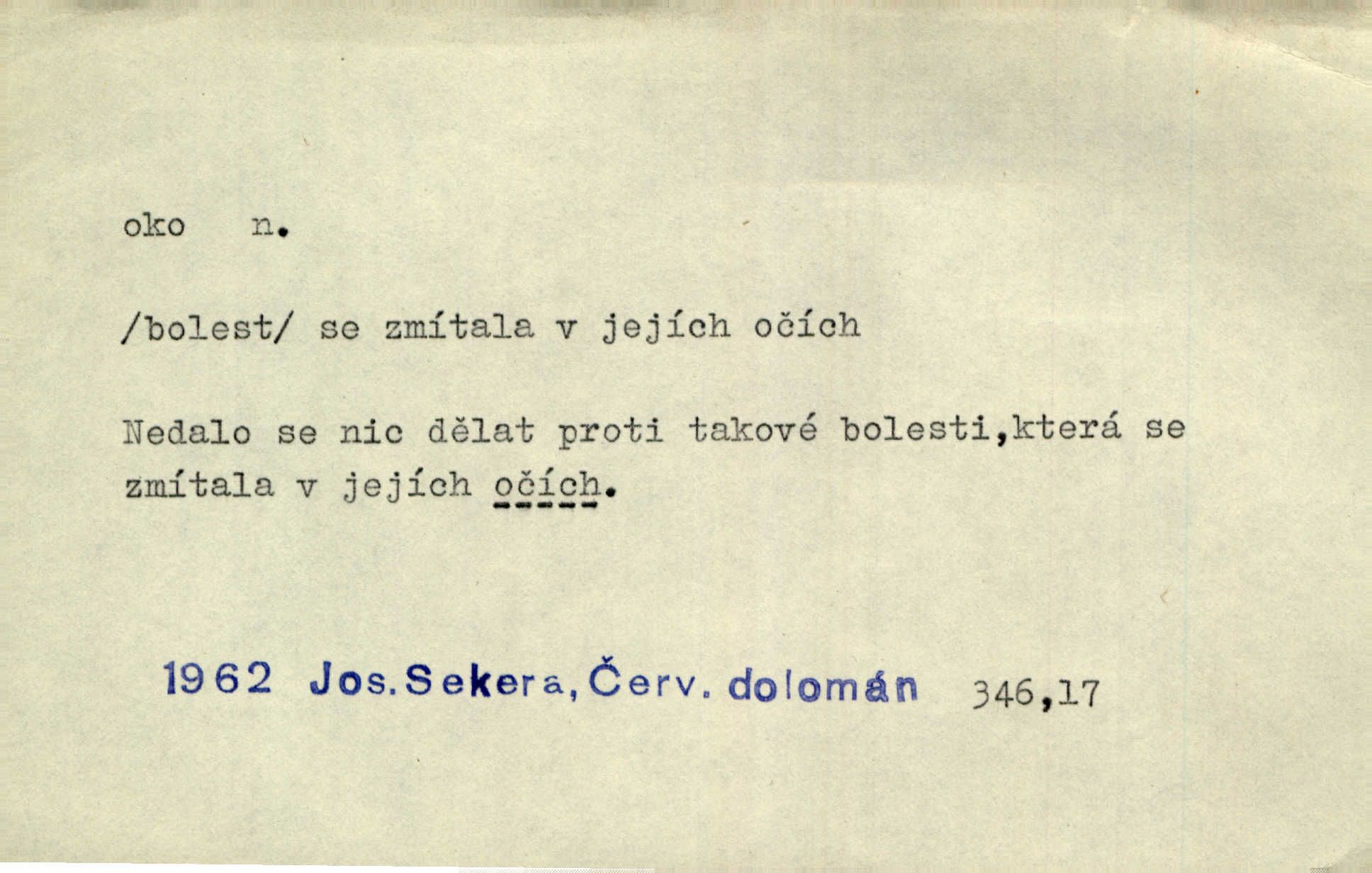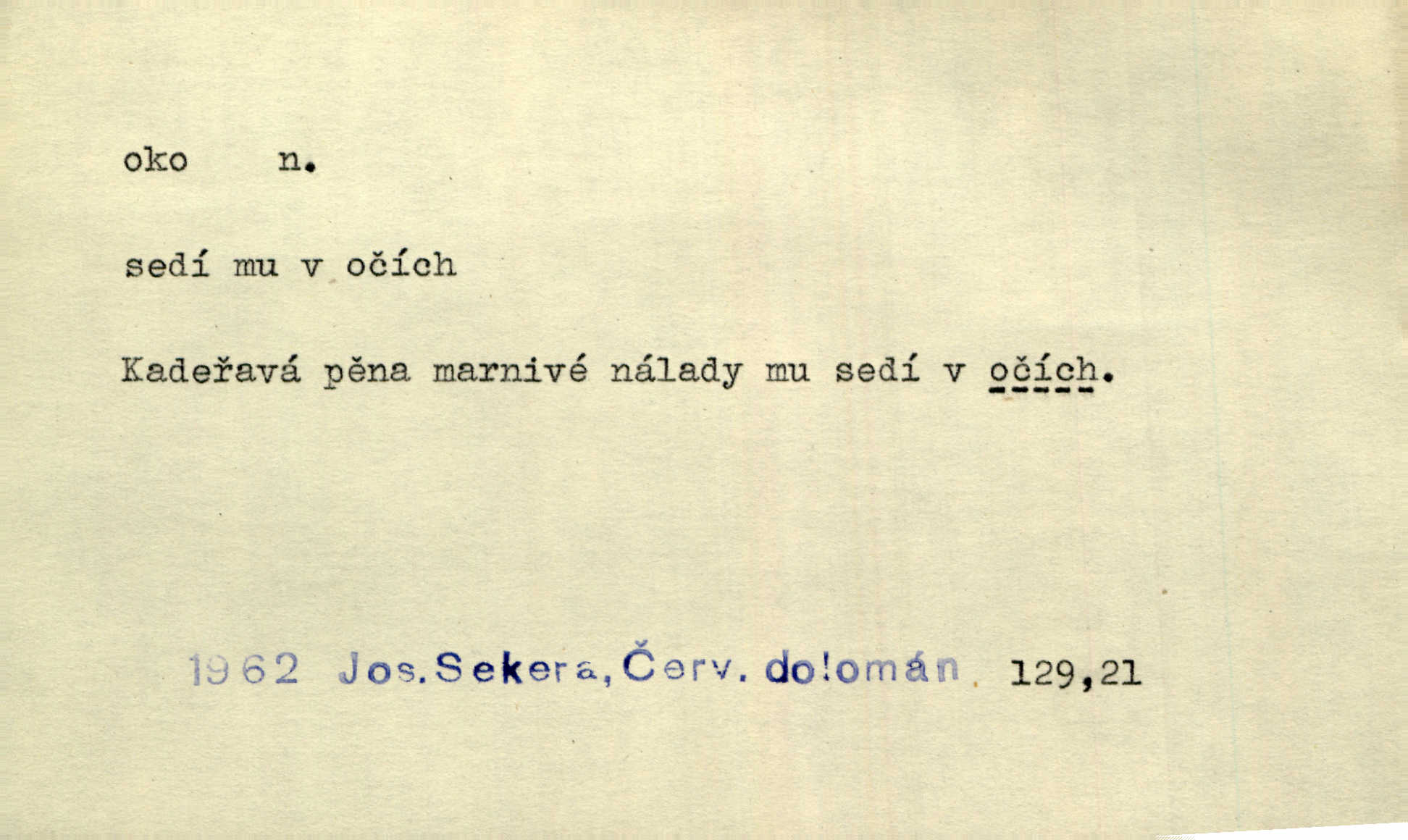 - oko, -a n. (pl. o tělesném ústrojí, velmi zř. jindy, oči, -í, -ím, -ích, -ima; jinak oka, ok atd.) sídlo zraku, orgán zrakový. Domovnice byla na jedno oko slepá. R. Svob. Bylo ji [hvězdu] pouhým okem velmi patrně pozorovati. Lum. Pozvedl oči ke stropu a počítal polohlasně. Šim. Sklopila oči, neodpovídala. Šmil. Mužské oči se po ní točily. Šmil. Na tisíce očí hledělo zvědavě za nimi. Šmil. Před očima se jí dělaly mžitky. Šmil. [Králíci] s červenýma očima. Čech. [Dívka] očima mrskla na stranu. Merh. Se zalíbením hodil okem po Mrštinovi. Šmil. Zabodl se očima do tváře té druhé [dívky]. Merh. Oko harfenistovo pátravě pohlíželo na mne oči, zrak. Ner. Jen oko jeho plálo výmluvné. Vrch. Ty máš mladší oko, podívej se. Šmil. Toto oko ve tříhranu s paprsky vyobrazuje Boha. Oko Boží. J. V. Svob. Ustál. sp. Jak tu stála v mladistvém zjevu, mohla matka oči na ní nechat. Podl. [Spánek] brzy zaklížil unaveným turistům oči. Šmil. Náciček se cpal, až mu oči vylézaly z důlkův. Šim. Hrdlo sípá, v sloup mu stojí oči. Heyd. Madlenka se naň trochu podivně plným okem podívala. Šmil. Zřel [Terminus] tupým okem klidně k reji všemu [bohů na Olympu] tupě. Vrch. Pokynul okem hajnému, aby mu čerstvé vody navážil. Šmil. Lidé proklínali toho [zločince]‚ že zaslouží smrt, že mu lotrovství z očí kouká je jasně zřejmé. Něm. Její úsměv byl andělský, ale z očí koukal satanáš. Švan. Zloděj stál zkroušeně před abbém, jenž vlídného oka s něho nespustil díval se na něho vlídně. Šmil. Odhodlal se, že půjde, kam ho oči povedou. Paleč. Oči chtěly, kapsa však nemohla. Jir. Jak před divem stojíš, na vrchu hlavy oči máš [před mlátičkou] divíš se. Vrch. Vyvalila oči za starcem. Šmil. Uvědom si to všecko náležitě, milý čtenáři, a budeš pak teprve udiveně kulit oči nad našimi veřejnými mravy. Šal. To by byl otvíral teprve oči Karásek! Šal. Hladoví otrhánci čumějící, oči na šťopkách, na pekaře, pekoucího chléb. Šal. Na své oči viděl, jak mocna je láska Verunčina očitě, jasně. Šmil. Rád sám o všem na vlastní oči se přesvědčil a proto hojně cestoval. Vrch. Usedám [v kavárně]‚ a tu mi padne do oka neobyčejná postava muže u vedlejšího stolu všimnu si. Hol. Padla mu do oka — no, ona je holka k světu zalíbila se mu. Šim. Barva listovních známek má býti nápadná, do očí bijící. Čas. Ráz prvního typu arciť bije do očí. Durd. Teprve nynějšího cara píchá do očí i pouhý stín demokratického zřízení. Čas. Tato červeň [záclon] zařezala se mu do očí. Merh. Ten krásný obraz síly a zdraví svěže se vtlačil do Filousových očí. Merh. Uzřel průvod, jenž mu živě na oči uváděl, co o dvorních slavnostech čítal. Jir. Nemohu přece míti oči všude. Šrám. Můj bože, kam jsem dala oči! Vždyť jsem vás měla při každém dechnutí na mysli. Šmil. Paní správcová nebyla jí [babičce] pěkna v očích, proto, že se nesla výše než narostla. Něm. Padni oko nebo zub, já od tebe neupustím za žádných okolností. Šmil. Spím jen na jedno oko. Šal. [Hafani] se položí někde do stínu měsíčního světla a spíce na půl oka občas ze sna zavyjí. Nov. Můžete pokojně na obě oči spáti, s Verunkou mluvil váš Jakub naposledy. Šmil. Mrština skoro oka nezamhouřil. Šmil. Vy potřebujete přítele, který by vám oči otevřel zjevil pravdu. Štěp. Ostatně, že to bylo poprvé — zavru oko prominu to. Kosm. Je tady krasavic, budou vás milovati, s očima zamhouřenýma hned si vás budou bráti bez rozmýšlení. Svob. Zavřu oči, aniž bych viděl moře zemru. Poláč. Než zavru k poslednímu spánku oči, to aspoň chtěl bych viděti. Vrch. Nebylo však to jen působení cizího štěstí, ale i jakési rozhorlení nad tím, že maji ženy oči zavázané nechápou. Svob. [Císař] neví, co stojí měsíčně regiment pěchoty, a nechá si od vévody bavorského sypati do očí prach a předkládati šílené účty. Dur. Při celé té komedii nešlo o nic jiného než o to, jak nasypat písek do očí širokým vrstvám. Šal. Mně bělmo na očích neuděláte mne neobelstíte. Šmil. Když bude pan správce černě koukat, zamažou se mu oči. Něm. „Zlatý voči!“ švihl Veselý do řehotu kamarádů. A to znamenalo: Zlaté oči, které to na papíře uvidí. Herrm. „Podívejte se [kuřátka] ještě jednou, ale oči do drápků!“ Tak si přispůsobil [chlapec] frási „vzít oči do hrsti“ dobře si prohlédnout. Hol. Vyčetli jsme si i nos mezi očima všechno. J. Kvap. Ostatek sjednal s ním kancléř ve své komoře mezi čtyřma očima důvěrně, v soukromí. Jir. Měsíček svítil jako rybí oko jasně. Ondrák. Jsem mu [dědečkovi] jako sůl v očích protivný. Podl. Mlýn podolský mele ve dne v noci; to práškovi je trnem v oči. Heyd. Nevím, že vám Josef takovým trnem v očích. Šmil. Divadlo jest jim trnem v oku a zrazují od návštěvy jeho. Hol. Opatrovali nemocnou jako oko v hlavě. Šmil. V jedné věci jako by jí [matce] byla z oka vypadla: co jednou si umínila, od toho živou mocí nepopustila. Šmil. „O tys mé pravé oko!“ zaradoval se Kolda opora. Ehrenb. Jsou [rabíni] oči zákona, které pronikají smysl všech tajů. Vrch. Po oku jen kradmo z okenečka zírá [dívka] tajně. Heyd. Smával jsem se tomu matce do očí, nedbaje, že ji popuzuju přímo. Podl. Sochař mu do očí tvrdil, že Deidias vykládal něco o volech. Švan. Mohl jste mi nyní říci tu hroznou věc z oka do oka, a já… já neučinila nic přímo. Šrám. Každá [žena] se staví do očí, jako by byla beránek, a zatím je drakem. Paleč. V krámě Žehurově vážilo se zřídka. Obyčejně useklo a hodilo se od oka. Šim. [Bohatec] jen pro oko a chloubu tolikero hostí sezvati dal odiv. Ehrenb. To 