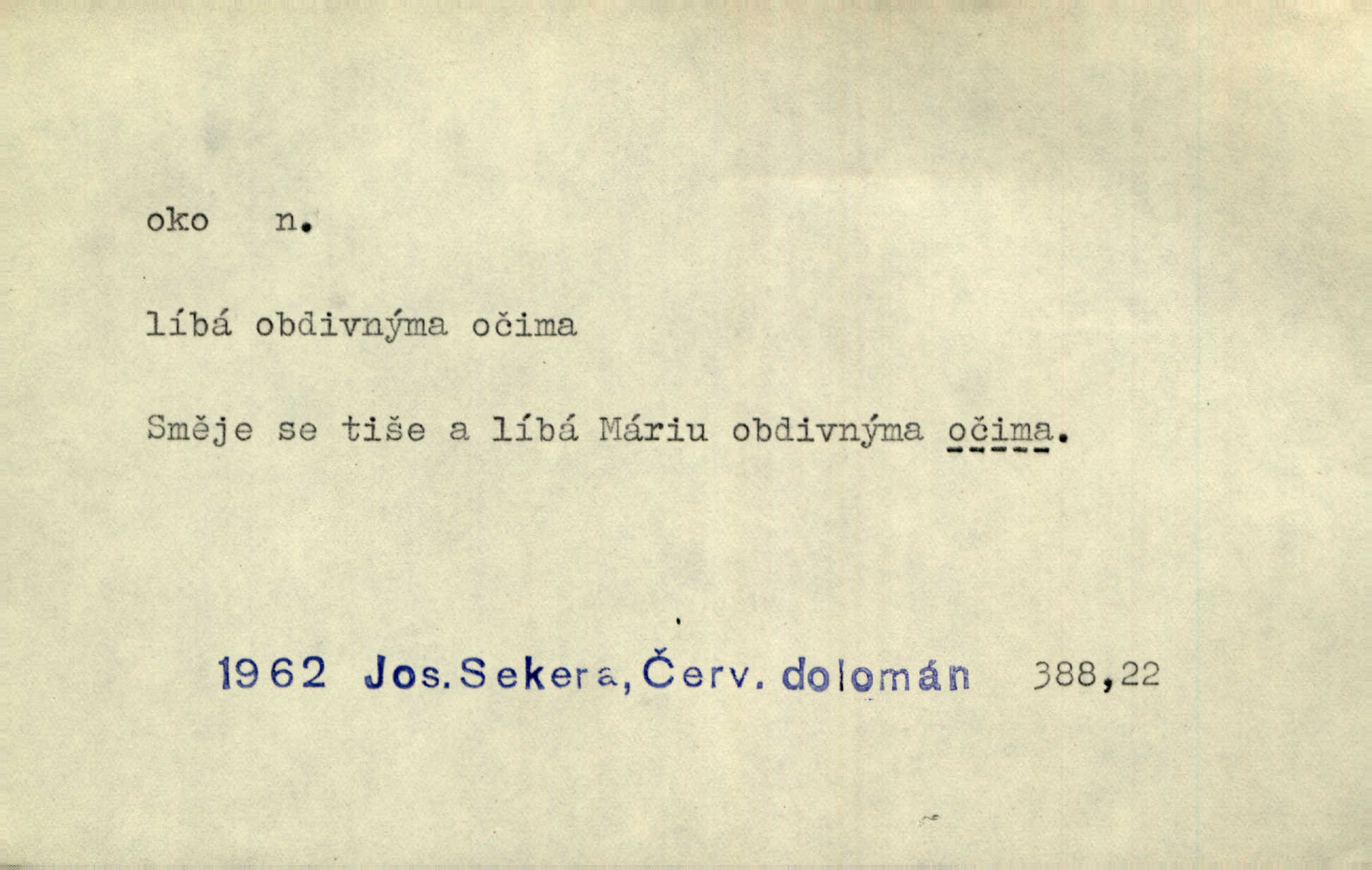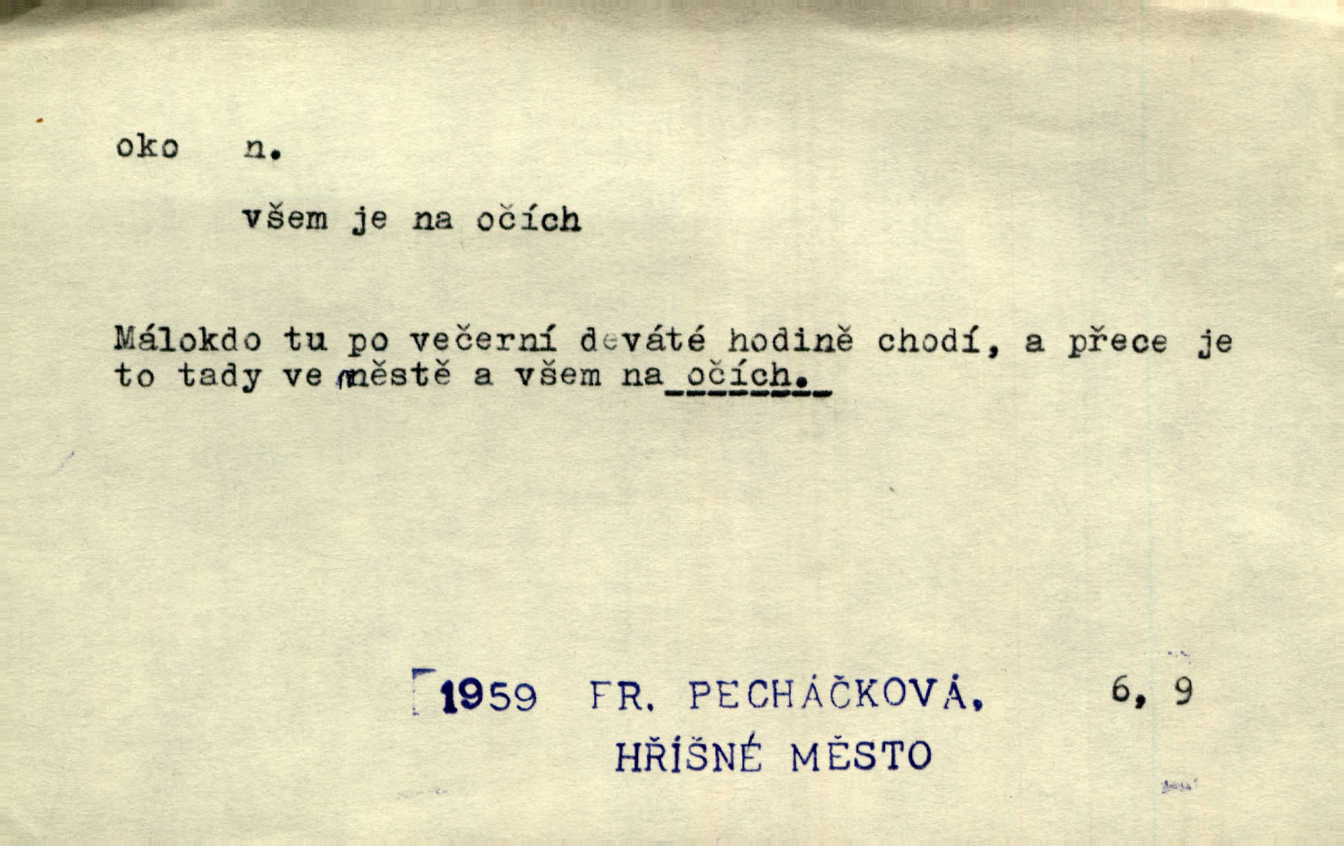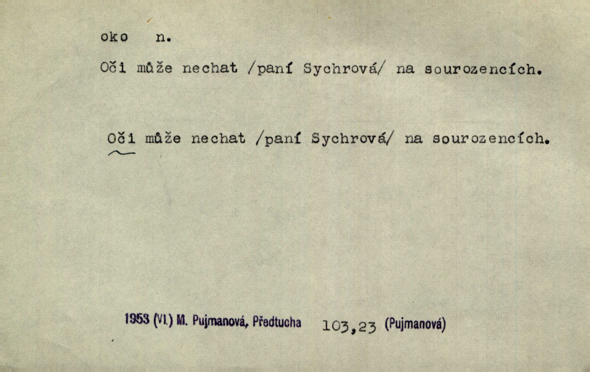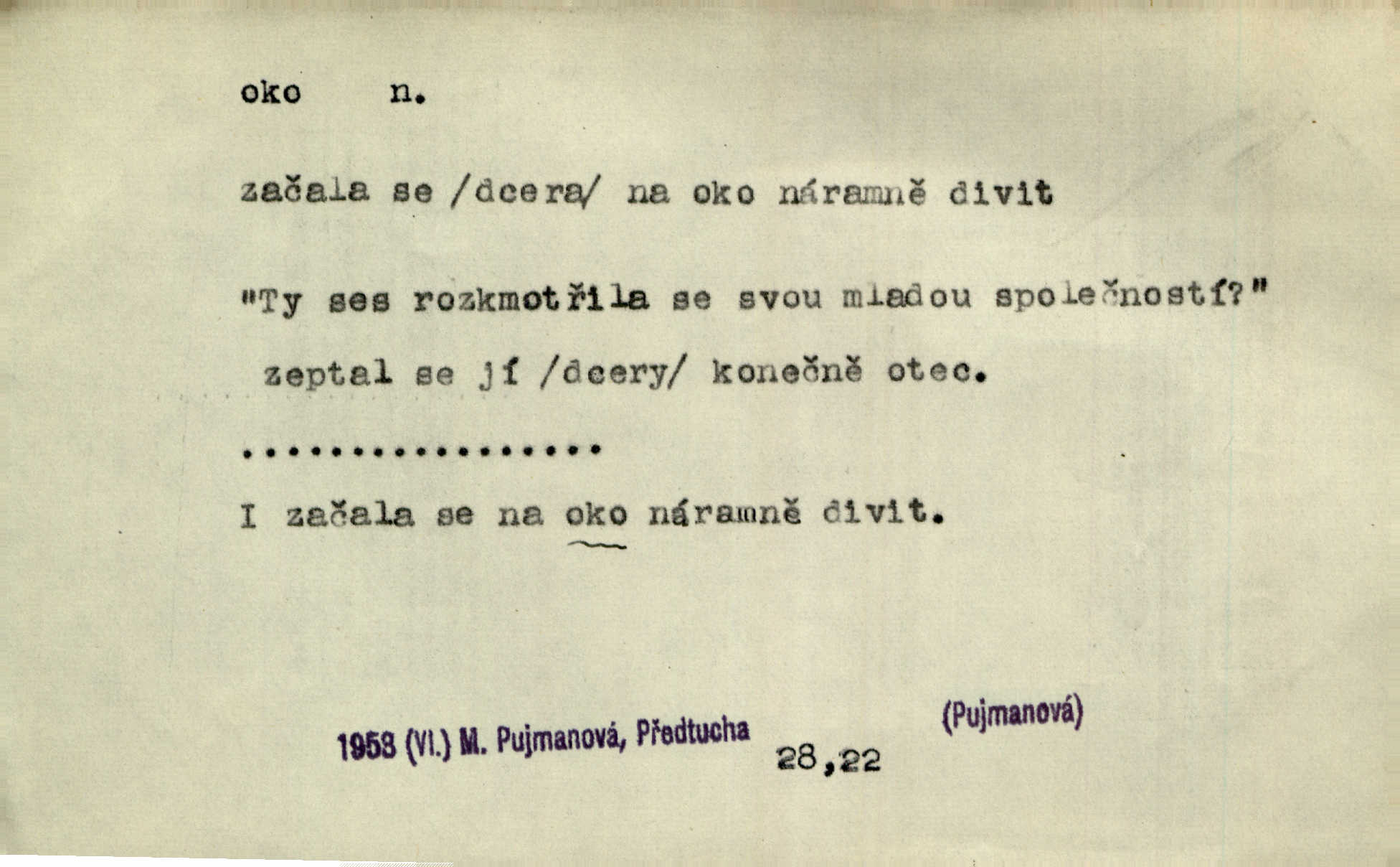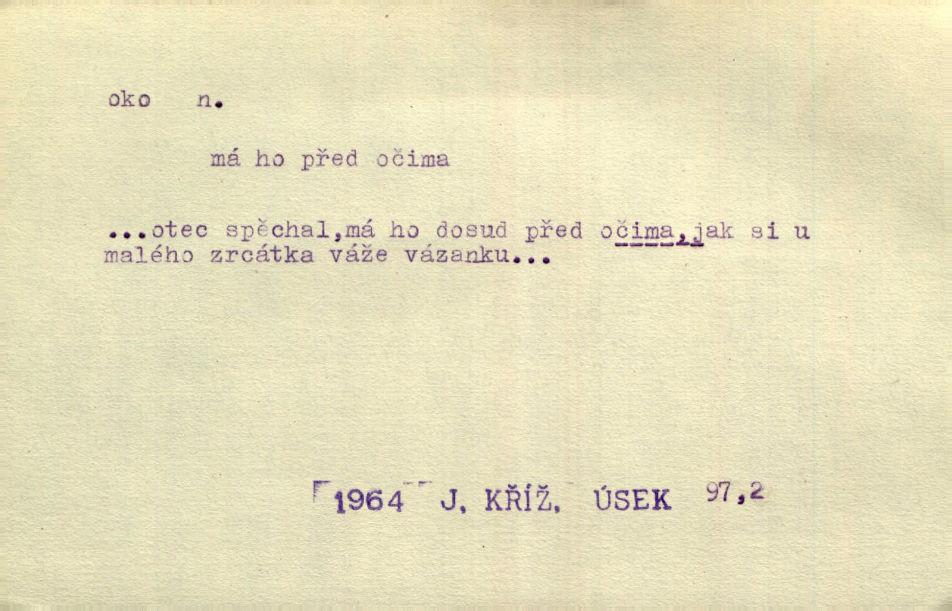 - oko, -a n. (pl. o tělesném ústrojí, velmi zř. jindy, oči, -í, -ím, -ích, -ima; jinak oka, ok atd.) sídlo zraku, orgán zrakový. Domovnice byla na jedno oko slepá. R. Svob. Bylo ji [hvězdu] pouhým okem velmi patrně pozorovati. Lum. Pozvedl oči ke stropu a počítal polohlasně. Šim. Sklopila oči, neodpovídala. Šmil. Mužské oči se po ní točily. Šmil. Na tisíce očí hledělo zvědavě za nimi. Šmil. Před očima se jí dělaly mžitky. Šmil. [Králíci] s červenýma očima. Čech. [Dívka] očima mrskla na stranu. Merh. Se zalíbením hodil okem po Mrštinovi. Šmil. Zabodl se očima do tváře té druhé [dívky]. Merh. Oko harfenistovo pátravě pohlíželo na mne oči, zrak. Ner. Jen oko jeho plálo výmluvné. Vrch. Ty máš mladší oko, podívej se. Šmil. Toto oko ve tříhranu s paprsky vyobrazuje Boha. Oko Boží. J. V. Svob. Ustál. sp. Jak tu stála v mladistvém zjevu, mohla matka oči na ní nechat. Podl. [Spánek] brzy zaklížil unaveným turistům oči. Šmil. Náciček se cpal, až mu oči vylézaly z důlkův. Šim. Hrdlo sípá, v sloup mu stojí oči. Heyd. Madlenka se naň trochu podivně plným okem podívala. Šmil. Zřel [Terminus] tupým okem klidně k reji všemu [bohů na Olympu] tupě. Vrch. Pokynul okem hajnému, aby mu čerstvé vody navážil. Šmil. Lidé proklínali toho [zločince]‚ že zaslouží smrt, že mu lotrovství z očí kouká je jasně zřejmé. Něm. Její úsměv byl andělský, ale z očí koukal satanáš. Švan. Zloděj stál zkroušeně před abbém, jenž vlídného oka s něho nespustil díval se na něho vlídně. Šmil. Odhodlal se, že půjde, kam ho oči povedou. Paleč. Oči chtěly, kapsa však nemohla. Jir. Jak před divem stojíš, na vrchu hlavy oči máš [před mlátičkou] divíš se. Vrch. Vyvalila oči za starcem. Šmil. Uvědom si to všecko náležitě, milý čtenáři, a budeš pak teprve udiveně kulit oči nad našimi veřejnými mravy. Šal. To by byl otvíral teprve oči Karásek! Šal. Hladoví otrhánci čumějící, oči na šťopkách, na pekaře, pekoucího chléb. Šal. Na své oči viděl, jak mocna je láska Verunčina očitě, jasně. Šmil. Rád sám o všem na vlastní oči se přesvědčil a proto hojně cestoval. Vrch. Usedám [v kavárně]‚ a tu mi padne do oka neobyčejná postava muže u vedlejšího stolu všimnu si. Hol. Padla mu do oka — no, ona je holka k světu zalíbila se mu. Šim. Barva listovních známek má býti nápadná, do očí bijící. Čas. Ráz prvního typu arciť bije do očí. Durd. Teprve nynějšího cara píchá do očí i pouhý stín demokratického zřízení. Čas. Tato červeň [záclon] zařezala se mu do očí. Merh. Ten krásný obraz síly a zdraví svěže se vtlačil do Filousových očí. Merh. Uzřel průvod, jenž mu živě na oči uváděl, co o dvorních slavnostech čítal. Jir. Nemohu přece míti oči všude. Šrám. Můj bože, kam jsem dala oči! Vždyť jsem vás měla při každém dechnutí na mysli. Šmil. Paní správcová nebyla jí [babičce] pěkna v očích, proto, že se nesla výše než narostla. Něm. Padni oko nebo zub, já od tebe neupustím za žádných okolností. Šmil. Spím jen na jedno oko. Šal. [Hafani] se položí někde do stínu měsíčního světla a spíce na půl oka občas ze sna zavyjí. Nov. Můžete pokojně na obě oči spáti, s Verunkou mluvil váš Jakub naposledy. Šmil. Mrština skoro oka nezamhouřil. Šmil. Vy potřebujete přítele, který by vám oči otevřel zjevil pravdu. Štěp. Ostatně, že to bylo poprvé — zavru oko prominu to. Kosm. Je tady krasavic, budou vás milovati, s očima zamhouřenýma hned si vás budou bráti bez rozmýšlení. Svob. Zavřu oči, aniž bych viděl moře zemru. Poláč. Než zavru k poslednímu spánku oči, to aspoň chtěl bych viděti. Vrch. Nebylo však to jen působení cizího štěstí, ale i jakési rozhorlení nad tím, že maji ženy oči zavázané nechápou. Svob. [Císař] neví, co stojí měsíčně regiment pěchoty, a nechá si od vévody bavorského sypati do očí prach a předkládati šílené účty. Dur. Při celé té komedii nešlo o nic jiného než o to, jak nasypat písek do očí širokým vrstvám. Šal. Mně bělmo na očích neuděláte mne neobelstíte. Šmil. Když bude pan správce černě koukat, zamažou se mu oči. Něm. „Zlatý voči!“ švihl Veselý do řehotu kamarádů. A to znamenalo: Zlaté oči, které to na papíře uvidí. Herrm. „Podívejte se [kuřátka] ještě jednou, ale oči do drápků!“ Tak si přispůsobil [chlapec] frási „vzít oči do hrsti“ dobře si prohlédnout. Hol. Vyčetli jsme si i nos mezi očima všechno. J. Kvap. Ostatek sjednal s ním kancléř ve své komoře mezi čtyřma očima důvěrně, v soukromí. Jir. Měsíček svítil jako rybí oko jasně. Ondrák. Jsem mu [dědečkovi] jako sůl v očích protivný. Podl. Mlýn podolský mele ve dne v noci; to práškovi je trnem v oči. Heyd. Nevím, že vám Josef takovým trnem v očích. Šmil. Divadlo jest jim trnem v oku a zrazují od návštěvy jeho. Hol. Opatrovali nemocnou jako oko v hlavě. Šmil. V jedné věci jako by jí [matce] byla z oka vypadla: co jednou si umínila, od toho živou mocí nepopustila. Šmil. „O tys mé pravé oko!“ zaradoval se Kolda opora. Ehrenb. Jsou [rabíni] oči zákona, které pronikají smysl všech tajů. Vrch. Po oku jen kradmo z okenečka zírá [dívka] tajně. Heyd. Smával jsem se tomu matce do očí, nedbaje, že ji popuzuju přímo. Podl. Sochař mu do očí tvrdil, že Deidias vykládal něco o volech. Švan. Mohl jste mi nyní říci tu hroznou věc z oka do oka, a já… já neučinila nic přímo. Šrám. Každá [žena] se staví do očí, jako by byla beránek, a zatím je drakem. Paleč. V krámě Žehurově vážilo se zřídka. Obyčejně useklo a hodilo se od oka. Šim. [Bohatec] jen pro oko a chloubu tolikero hostí sezvati dal odiv. Ehrenb. To 