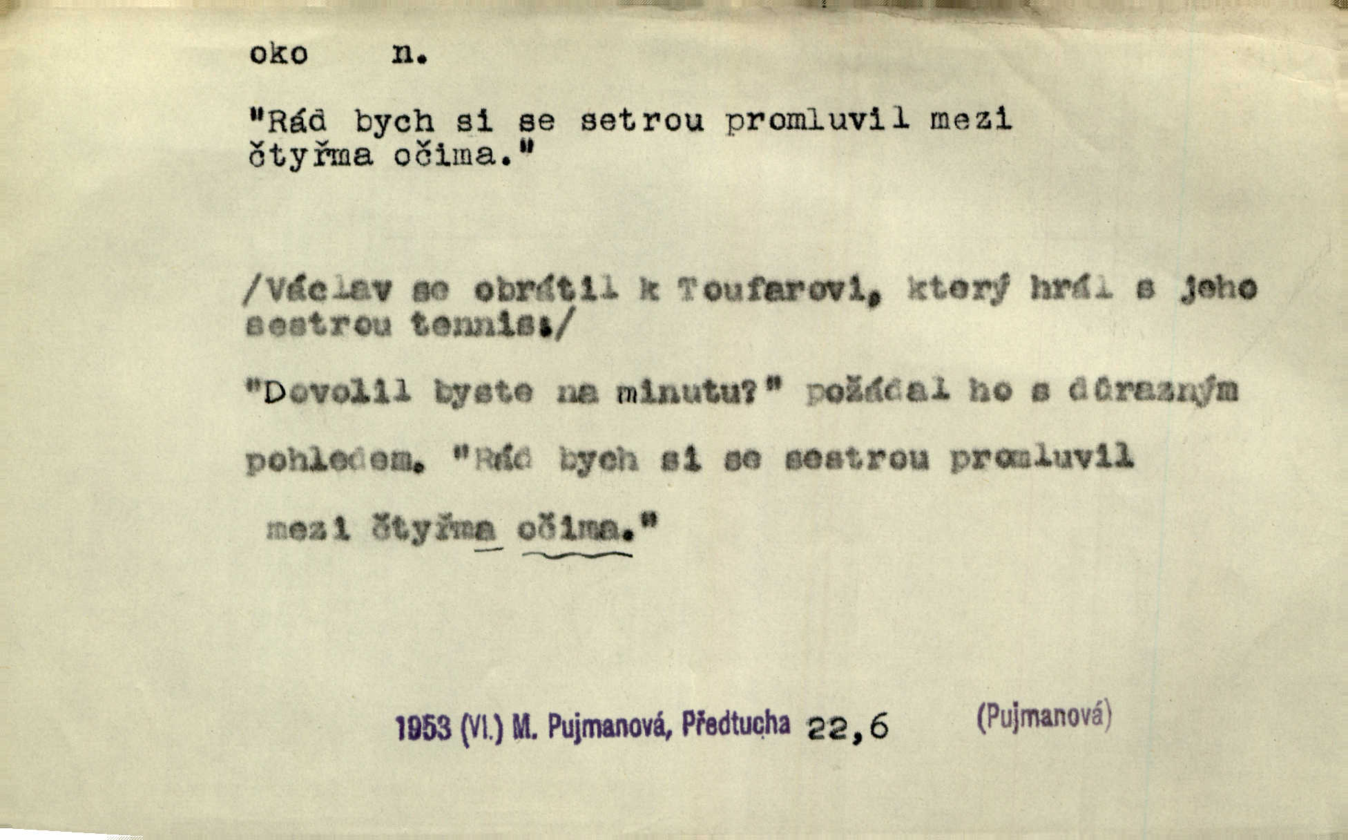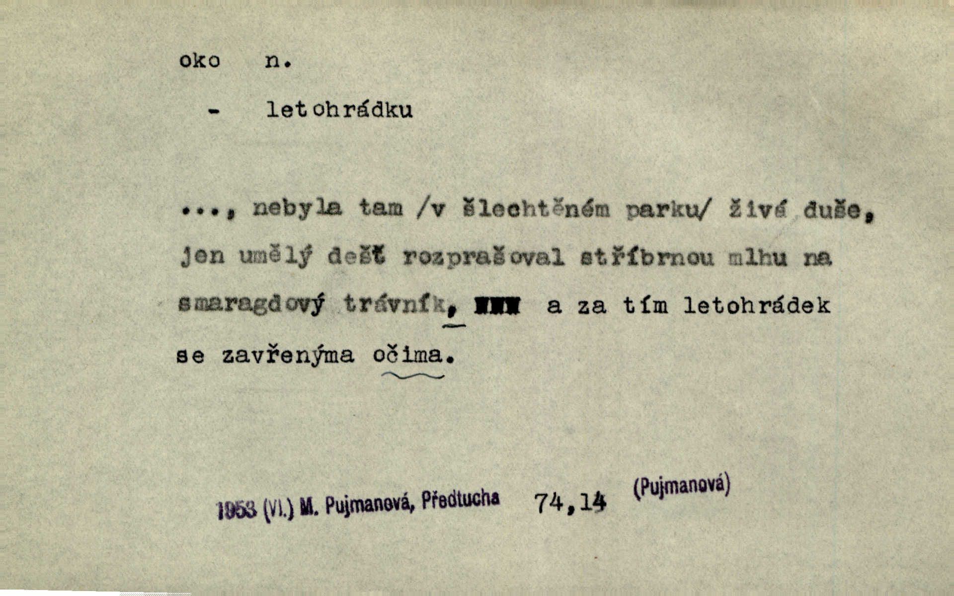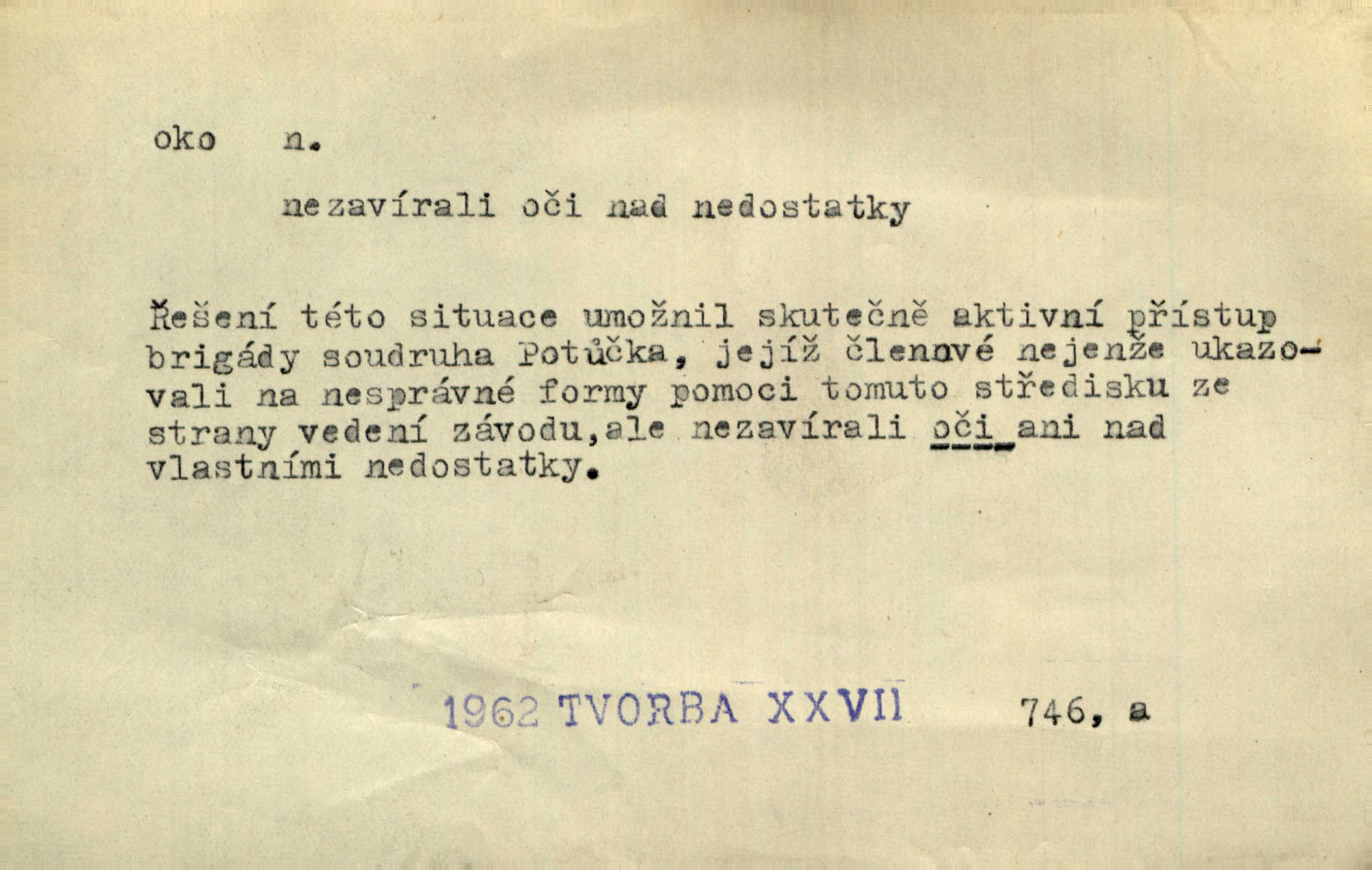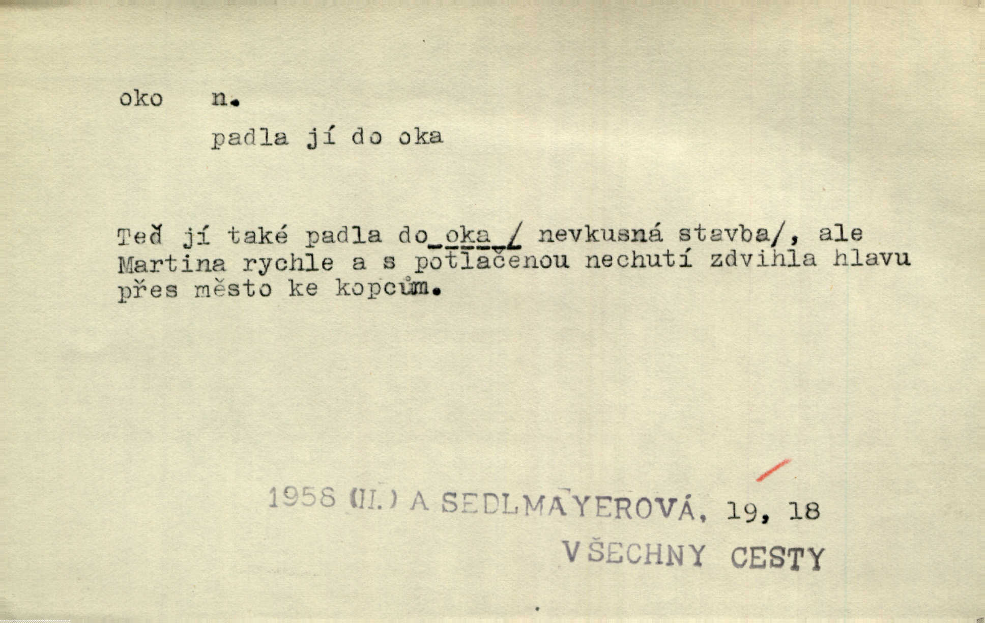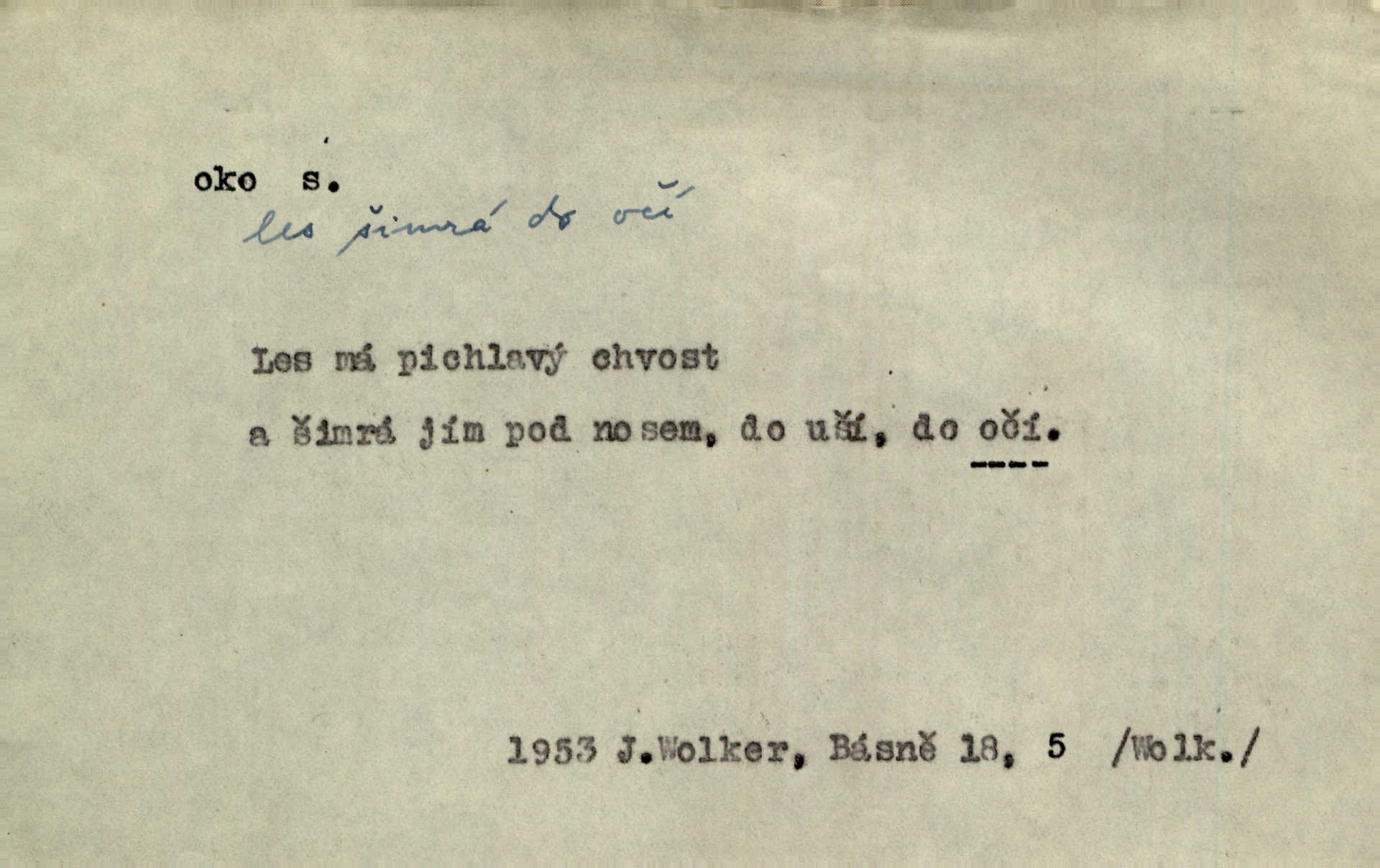 - oko, -a n. (pl. o tělesném ústrojí, velmi zř. jindy, oči, -í, -ím, -ích, -ima; jinak oka, ok atd.) sídlo zraku, orgán zrakový. Domovnice byla na jedno oko slepá. R. Svob. Bylo ji [hvězdu] pouhým okem velmi patrně pozorovati. Lum. Pozvedl oči ke stropu a počítal polohlasně. Šim. Sklopila oči, neodpovídala. Šmil. Mužské oči se po ní točily. Šmil. Na tisíce očí hledělo zvědavě za nimi. Šmil. Před očima se jí dělaly mžitky. Šmil. [Králíci] s červenýma očima. Čech. [Dívka] očima mrskla na stranu. Merh. Se zalíbením hodil okem po Mrštinovi. Šmil. Zabodl se očima do tváře té druhé [dívky]. Merh. Oko harfenistovo pátravě pohlíželo na mne oči, zrak. Ner. Jen oko jeho plálo výmluvné. Vrch. Ty máš mladší oko, podívej se. Šmil. Toto oko ve tříhranu s paprsky vyobrazuje Boha. Oko Boží. J. V. Svob. Ustál. sp. Jak tu stála v mladistvém zjevu, mohla matka oči na ní nechat. Podl. [Spánek] brzy zaklížil unaveným turistům oči. Šmil. Náciček se cpal, až mu oči vylézaly z důlkův. Šim. Hrdlo sípá, v sloup mu stojí oči. Heyd. Madlenka se naň trochu podivně plným okem podívala. Šmil. Zřel [Terminus] tupým okem klidně k reji všemu [bohů na Olympu] tupě. Vrch. Pokynul okem hajnému, aby mu čerstvé vody navážil. Šmil. Lidé proklínali toho [zločince]‚ že zaslouží smrt, že mu lotrovství z očí kouká je jasně zřejmé. Něm. Její úsměv byl andělský, ale z očí koukal satanáš. Švan. Zloděj stál zkroušeně před abbém, jenž vlídného oka s něho nespustil díval se na něho vlídně. Šmil. Odhodlal se, že půjde, kam ho oči povedou. Paleč. Oči chtěly, kapsa však nemohla. Jir. Jak před divem stojíš, na vrchu hlavy oči máš [před mlátičkou] divíš se. Vrch. Vyvalila oči za starcem. Šmil. Uvědom si to všecko náležitě, milý čtenáři, a budeš pak teprve udiveně kulit oči nad našimi veřejnými mravy. Šal. To by byl otvíral teprve oči Karásek! Šal. Hladoví otrhánci čumějící, oči na šťopkách, na pekaře, pekoucího chléb. Šal. Na své oči viděl, jak mocna je láska Verunčina očitě, jasně. Šmil. Rád sám o všem na vlastní oči se přesvědčil a proto hojně cestoval. Vrch. Usedám [v kavárně]‚ a tu mi padne do oka neobyčejná postava muže u vedlejšího stolu všimnu si. Hol. Padla mu do oka — no, ona je holka k světu zalíbila se mu. Šim. Barva listovních známek má býti nápadná, do očí bijící. Čas. Ráz prvního typu arciť bije do očí. Durd. Teprve nynějšího cara píchá do očí i pouhý stín demokratického zřízení. Čas. Tato červeň [záclon] zařezala se mu do očí. Merh. Ten krásný obraz síly a zdraví svěže se vtlačil do Filousových očí. Merh. Uzřel průvod, jenž mu živě na oči uváděl, co o dvorních slavnostech čítal. Jir. Nemohu přece míti oči všude. Šrám. Můj bože, kam jsem dala oči! Vždyť jsem vás měla při každém dechnutí na mysli. Šmil. Paní správcová nebyla jí [babičce] pěkna v očích, proto, že se nesla výše než narostla. Něm. Padni oko nebo zub, já od tebe neupustím za žádných okolností. Šmil. Spím jen na jedno oko. Šal. [Hafani] se položí někde do stínu měsíčního světla a spíce na půl oka občas ze sna zavyjí. Nov. Můžete pokojně na obě oči spáti, s Verunkou mluvil váš Jakub naposledy. Šmil. Mrština skoro oka nezamhouřil. Šmil. Vy potřebujete přítele, který by vám oči otevřel zjevil pravdu. Štěp. Ostatně, že to bylo poprvé — zavru oko prominu to. Kosm. Je tady krasavic, budou vás milovati, s očima zamhouřenýma hned si vás budou bráti bez rozmýšlení. Svob. Zavřu oči, aniž bych viděl moře zemru. Poláč. Než zavru k poslednímu spánku oči, to aspoň chtěl bych viděti. Vrch. Nebylo však to jen působení cizího štěstí, ale i jakési rozhorlení nad tím, že maji ženy oči zavázané nechápou. Svob. [Císař] neví, co stojí měsíčně regiment pěchoty, a nechá si od vévody bavorského sypati do očí prach a předkládati šílené účty. Dur. Při celé té komedii nešlo o nic jiného než o to, jak nasypat písek do očí širokým vrstvám. Šal. Mně bělmo na očích neuděláte mne neobelstíte. Šmil. Když bude pan správce černě koukat, zamažou se mu oči. Něm. „Zlatý voči!“ švihl Veselý do řehotu kamarádů. A to znamenalo: Zlaté oči, které to na papíře uvidí. Herrm. „Podívejte se [kuřátka] ještě jednou, ale oči do drápků!“ Tak si přispůsobil [chlapec] frási „vzít oči do hrsti“ dobře si prohlédnout. Hol. Vyčetli jsme si i nos mezi očima všechno. J. Kvap. Ostatek sjednal s ním kancléř ve své komoře mezi čtyřma očima důvěrně, v soukromí. Jir. Měsíček svítil jako rybí oko jasně. Ondrák. Jsem mu [dědečkovi] jako sůl v očích protivný. Podl. Mlýn podolský mele ve dne v noci; to práškovi je trnem v oči. Heyd. Nevím, že vám Josef takovým trnem v očích. Šmil. Divadlo jest jim trnem v oku a zrazují od návštěvy jeho. Hol. Opatrovali nemocnou jako oko v hlavě. Šmil. V jedné věci jako by jí [matce] byla z oka vypadla: co jednou si umínila, od toho živou mocí nepopustila. Šmil. „O tys mé pravé oko!“ zaradoval se Kolda opora. Ehrenb. Jsou [rabíni] oči zákona, které pronikají smysl všech tajů. Vrch. Po oku jen kradmo z okenečka zírá [dívka] tajně. Heyd. Smával jsem se tomu matce do očí, nedbaje, že ji popuzuju přímo. Podl. Sochař mu do očí tvrdil, že Deidias vykládal něco o volech. Švan. Mohl jste mi nyní říci tu hroznou věc z oka do oka, a já… já neučinila nic přímo. Šrám. Každá [žena] se staví do očí, jako by byla beránek, a zatím je drakem. Paleč. V krámě Žehurově vážilo se zřídka. Obyčejně useklo a hodilo se od oka. Šim. [Bohatec] jen pro oko a chloubu tolikero hostí sezvati dal odiv. Ehrenb. To 
