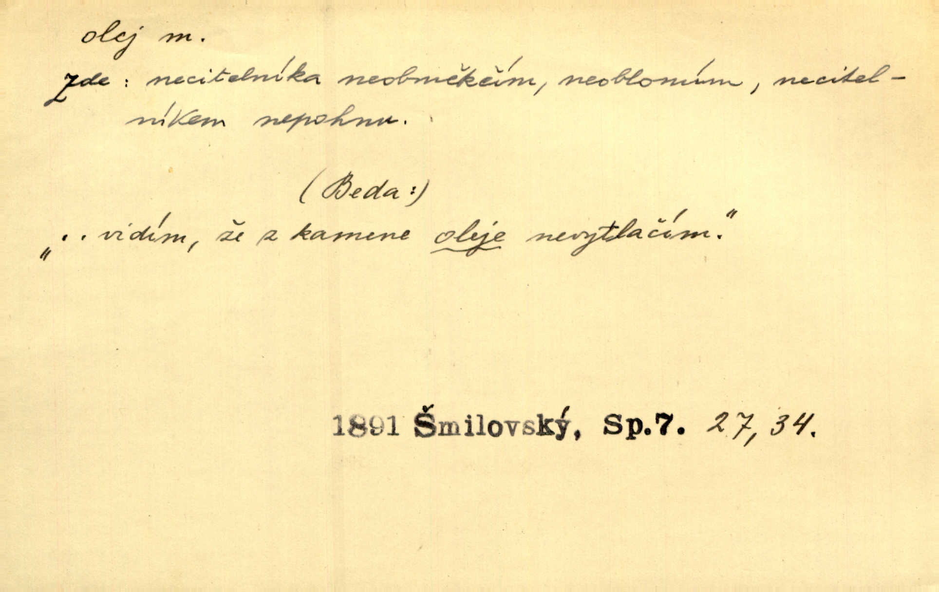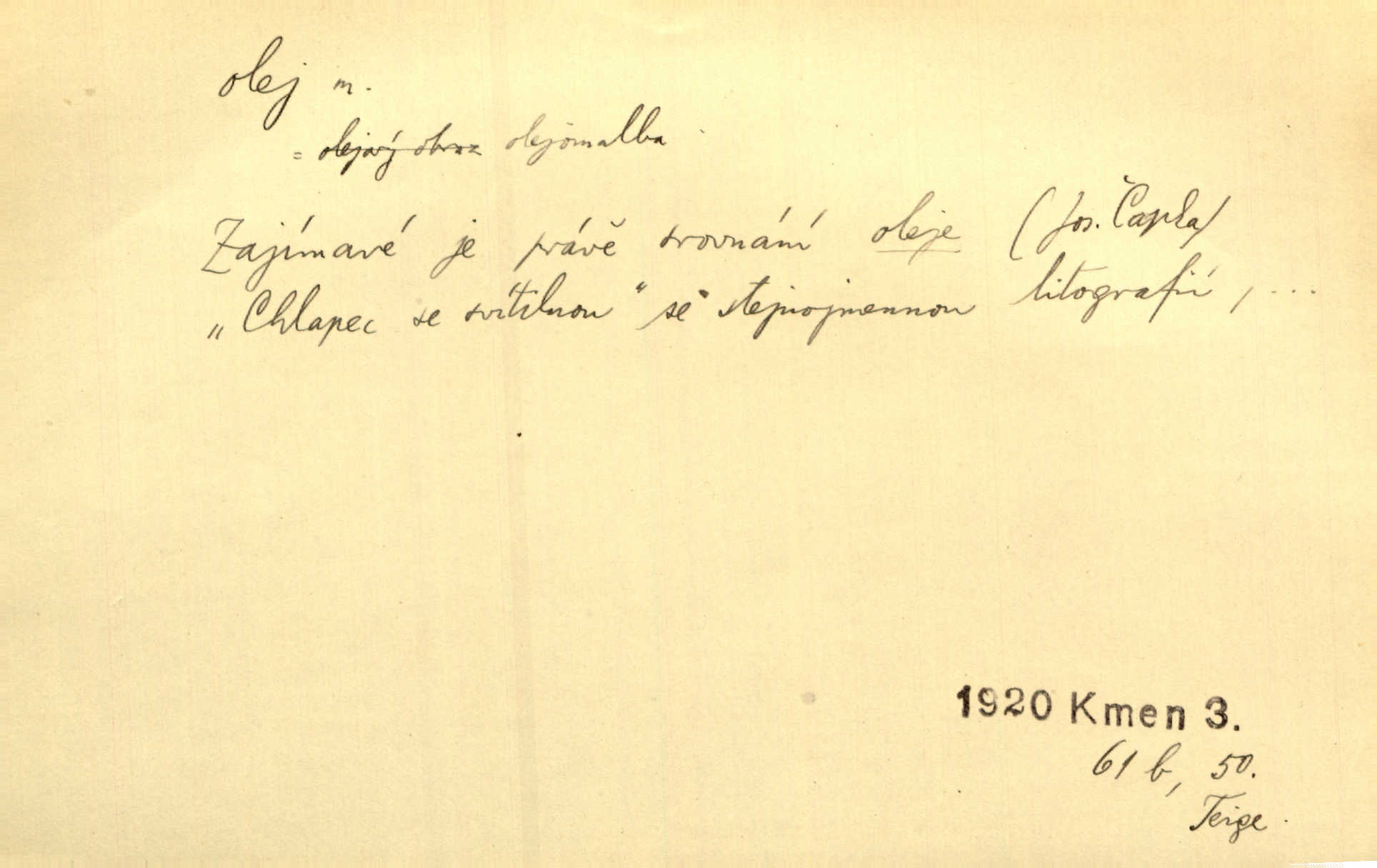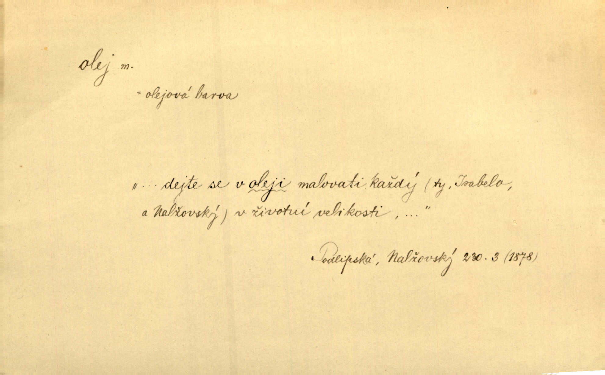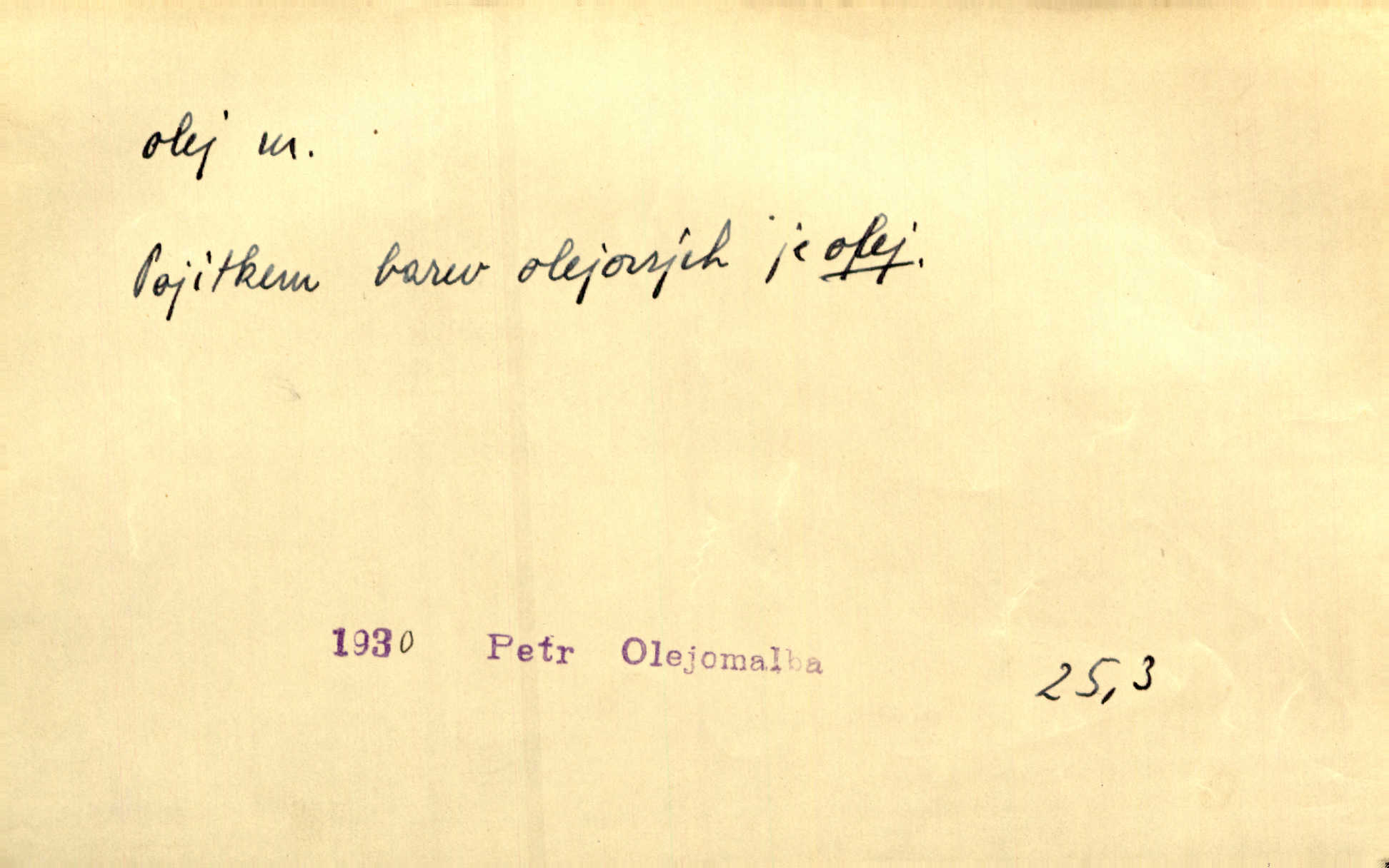 - olej, -e m. vazká látka mastné povahy, kapalná za obyčejné teploty a mazlavá. To si zas pochutnáme, to je káva, jako olej s dobrou smetanou. Svob. Ustál. sp. Kdykoliv básník nebo umělec začne provozovat takovéto svéráznictví, je patrné, že mu došel olej nastal u něho úpadek. Šal. Chlácholil sedláky, domkáře a podruhy, aby se do sebe nedali, ale tím lil olej do ohně a ještě víc je podráždil. Prav. Byl rozvážný a připomenul si, že by jediné nepravé, neopatrné slovo bylo olejem do plamene. Jir. Po čtyřnedělním vyslýchání vyšla pravda na světlo jak olej na vodu. Herb. Vidím, že z kamene oleje nevytlačím neoblomím necitelného. Šmil. Nebude škodno, když mu již napřed na zostření dobré paměti dřevěným olejem záda namažete napráskáte. Ondrák. Dejte se v oleji malovati každý v životní velikosti olejomalbou. Podl. To bude má první práce v oleji pro svět v olejových barvách. Jir. Na stěně visela olejem malovaná podobizna babičky. R. Svob. D olejomalba. Zajímavé je srovnání oleje [Jos. Čapka] „Chlapec se svítilnou“ se stejnojmennou litografií. K. Teige.