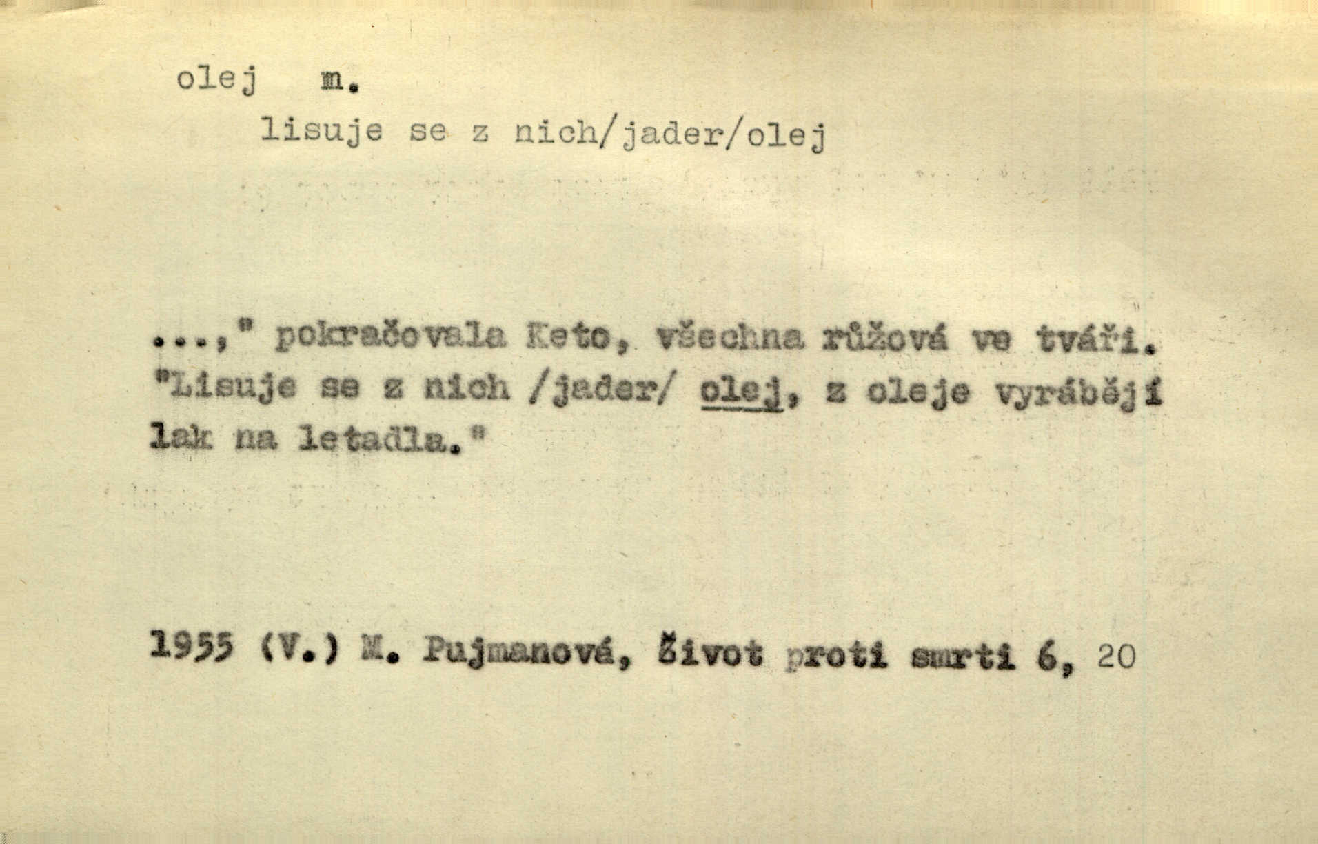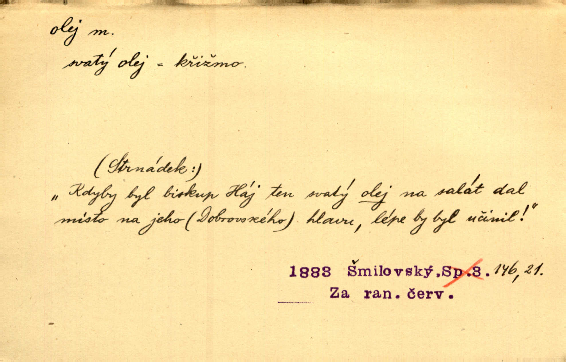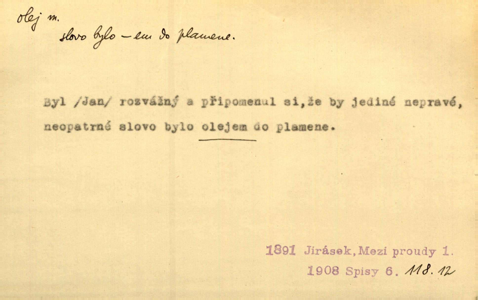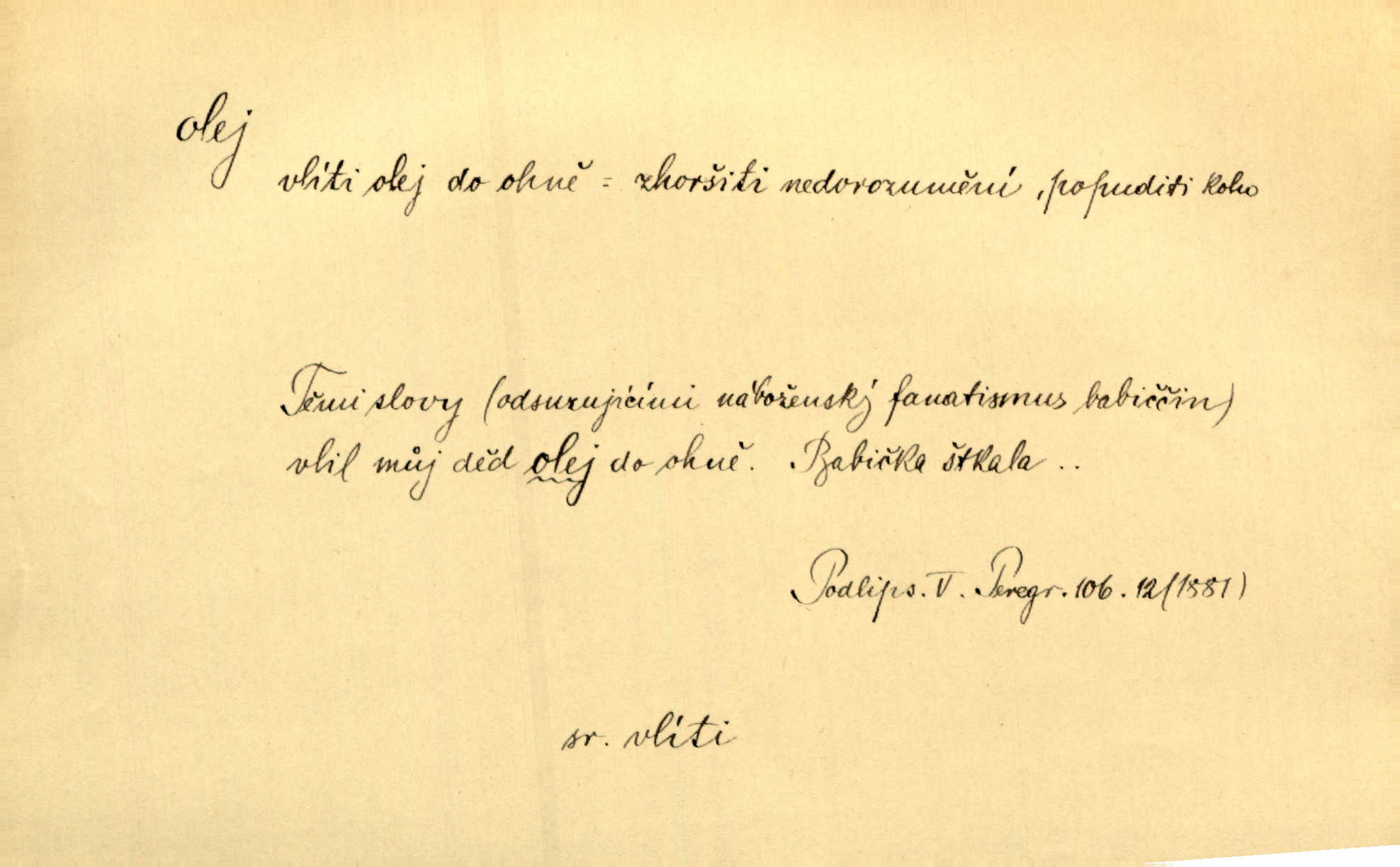 - olej, -e m. vazká látka mastné povahy, kapalná za obyčejné teploty a mazlavá. To si zas pochutnáme, to je káva, jako olej s dobrou smetanou. Svob. Ustál. sp. Kdykoliv básník nebo umělec začne provozovat takovéto svéráznictví, je patrné, že mu došel olej nastal u něho úpadek. Šal. Chlácholil sedláky, domkáře a podruhy, aby se do sebe nedali, ale tím lil olej do ohně a ještě víc je podráždil. Prav. Byl rozvážný a připomenul si, že by jediné nepravé, neopatrné slovo bylo olejem do plamene. Jir. Po čtyřnedělním vyslýchání vyšla pravda na světlo jak olej na vodu. Herb. Vidím, že z kamene oleje nevytlačím neoblomím necitelného. Šmil. Nebude škodno, když mu již napřed na zostření dobré paměti dřevěným olejem záda namažete napráskáte. Ondrák. Dejte se v oleji malovati každý v životní velikosti olejomalbou. Podl. To bude má první práce v oleji pro svět v olejových barvách. Jir. Na stěně visela olejem malovaná podobizna babičky. R. Svob. D olejomalba. Zajímavé je srovnání oleje [Jos. Čapka] „Chlapec se svítilnou“ se stejnojmennou litografií. K. Teige.