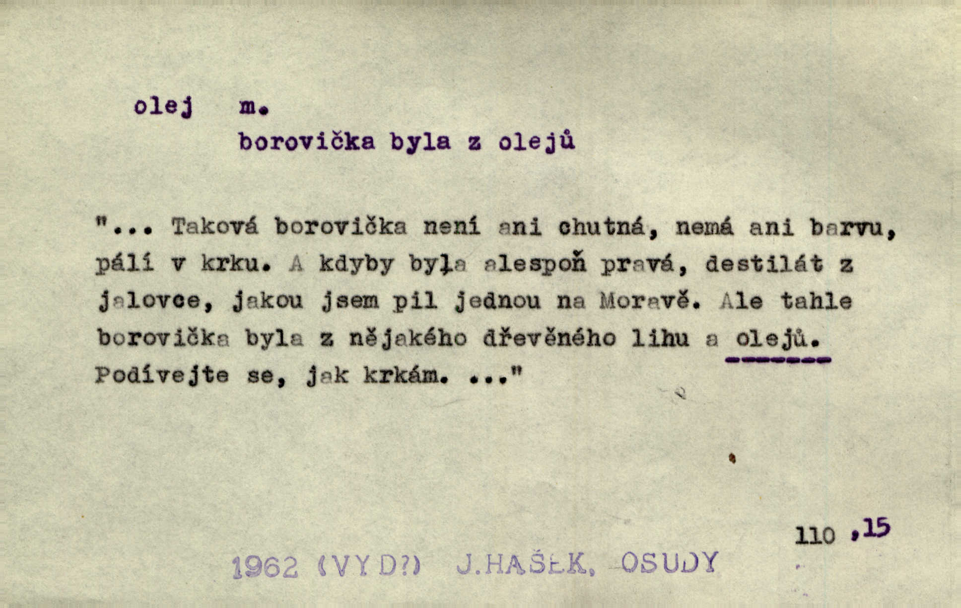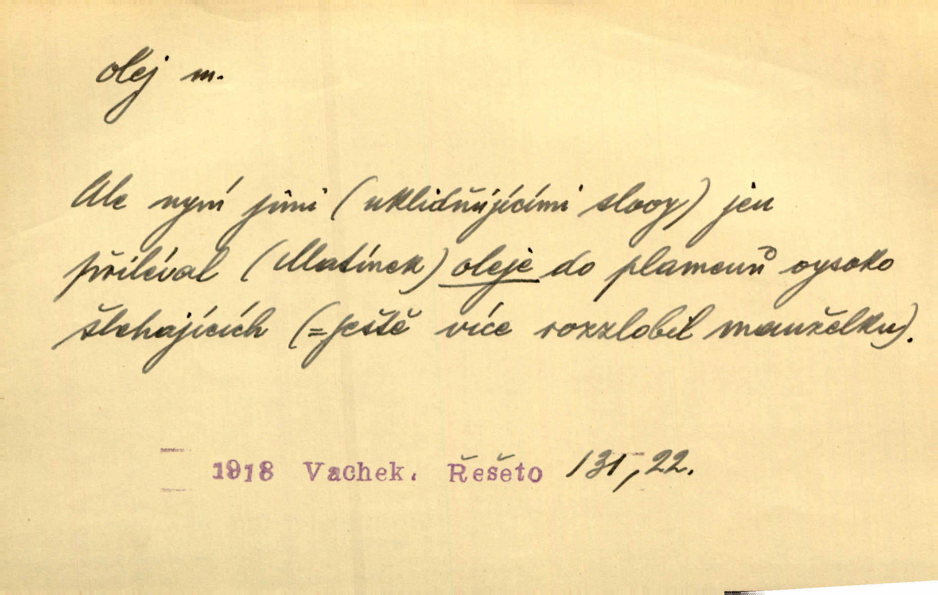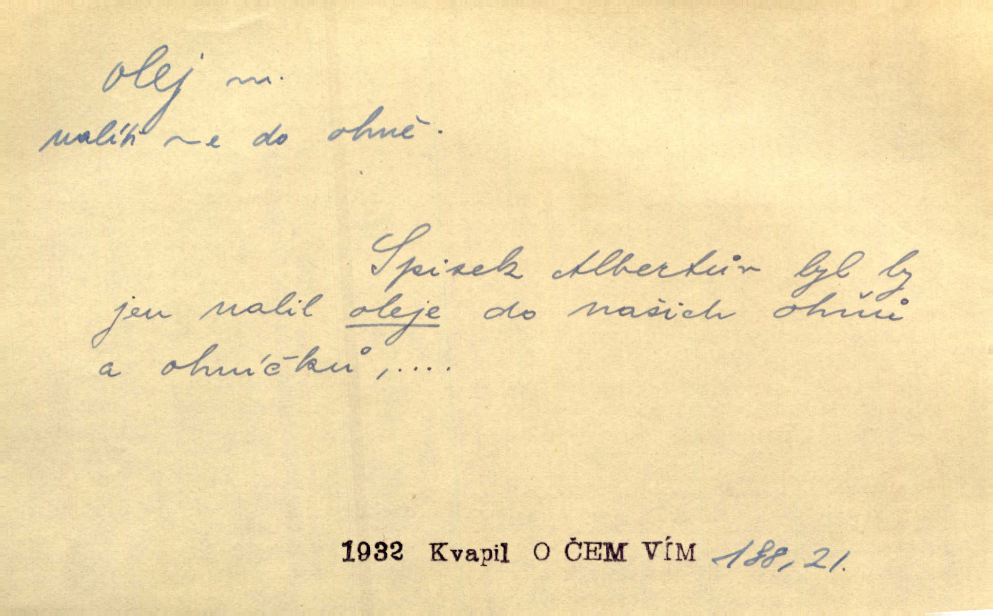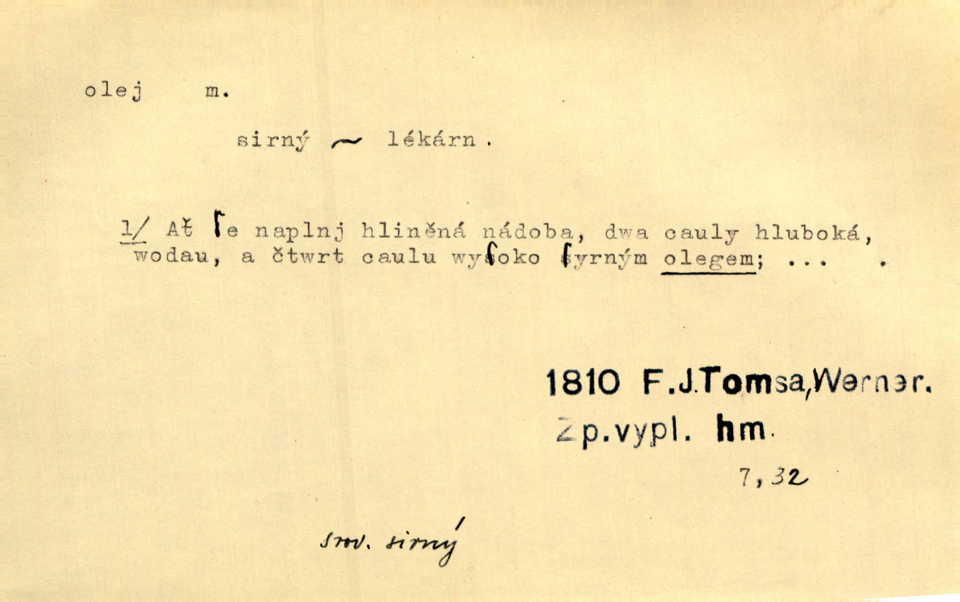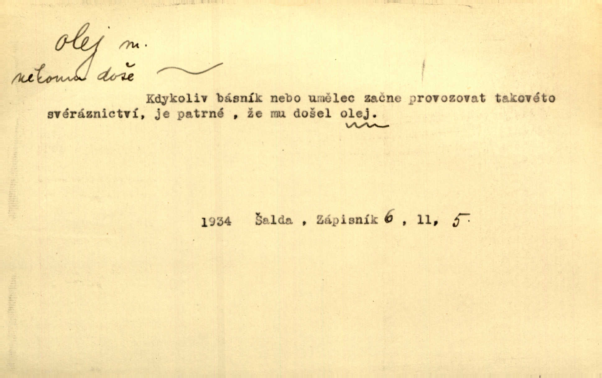 - olej, -e m. vazká látka mastné povahy, kapalná za obyčejné teploty a mazlavá. To si zas pochutnáme, to je káva, jako olej s dobrou smetanou. Svob. Ustál. sp. Kdykoliv básník nebo umělec začne provozovat takovéto svéráznictví, je patrné, že mu došel olej nastal u něho úpadek. Šal. Chlácholil sedláky, domkáře a podruhy, aby se do sebe nedali, ale tím lil olej do ohně a ještě víc je podráždil. Prav. Byl rozvážný a připomenul si, že by jediné nepravé, neopatrné slovo bylo olejem do plamene. Jir. Po čtyřnedělním vyslýchání vyšla pravda na světlo jak olej na vodu. Herb. Vidím, že z kamene oleje nevytlačím neoblomím necitelného. Šmil. Nebude škodno, když mu již napřed na zostření dobré paměti dřevěným olejem záda namažete napráskáte. Ondrák. Dejte se v oleji malovati každý v životní velikosti olejomalbou. Podl. To bude má první práce v oleji pro svět v olejových barvách. Jir. Na stěně visela olejem malovaná podobizna babičky. R. Svob. D olejomalba. Zajímavé je srovnání oleje [Jos. Čapka] „Chlapec se svítilnou“ se stejnojmennou litografií. K. Teige.