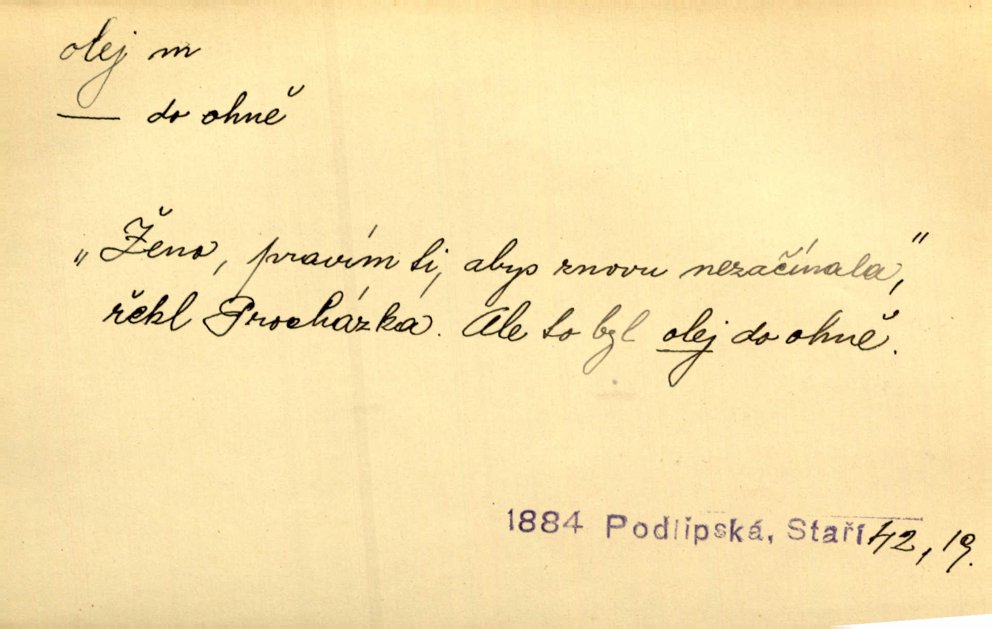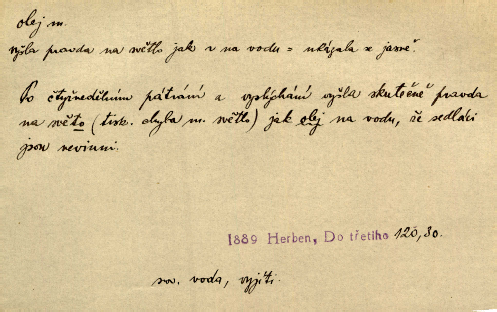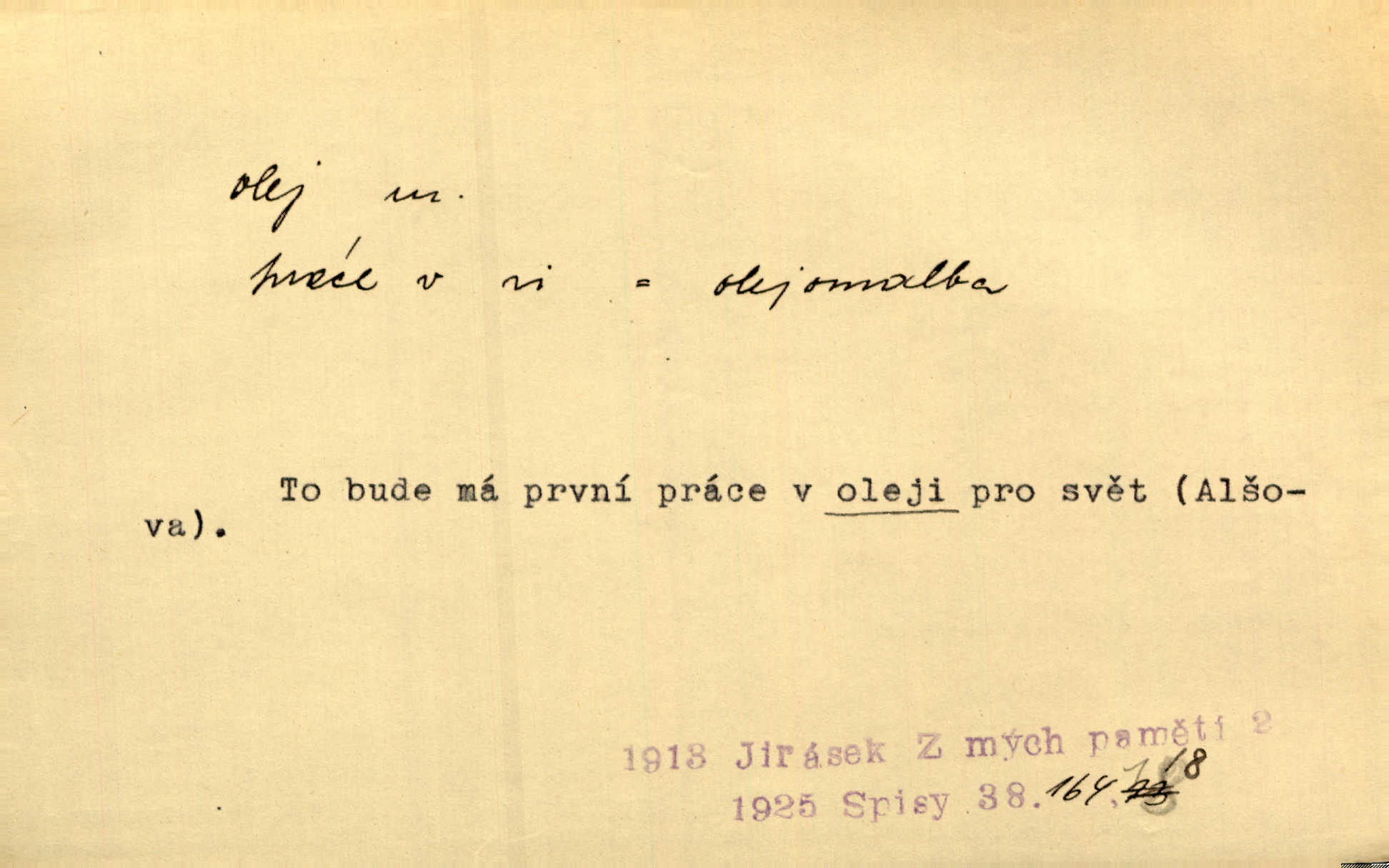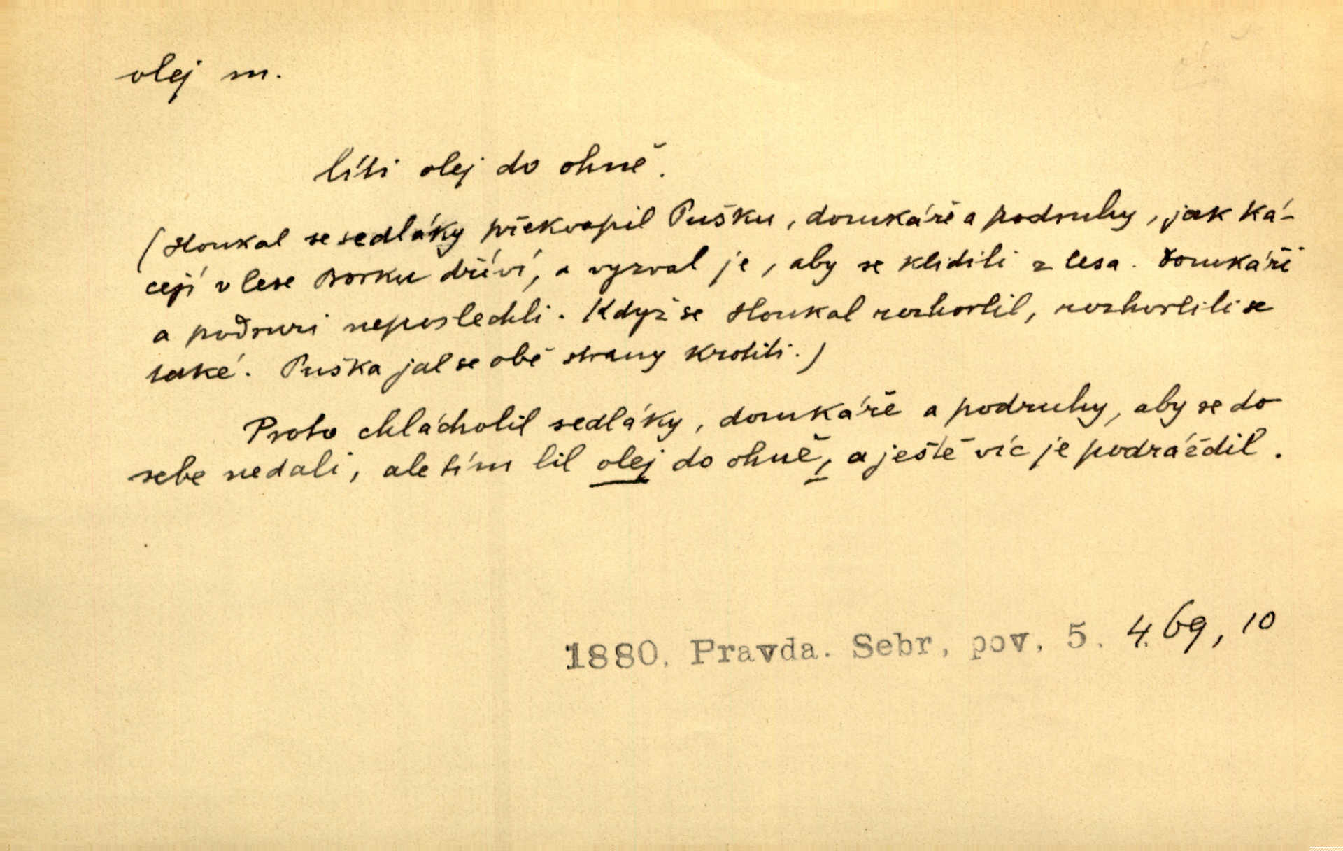 - olej, -e m. vazká látka mastné povahy, kapalná za obyčejné teploty a mazlavá. To si zas pochutnáme, to je káva, jako olej s dobrou smetanou. Svob. Ustál. sp. Kdykoliv básník nebo umělec začne provozovat takovéto svéráznictví, je patrné, že mu došel olej nastal u něho úpadek. Šal. Chlácholil sedláky, domkáře a podruhy, aby se do sebe nedali, ale tím lil olej do ohně a ještě víc je podráždil. Prav. Byl rozvážný a připomenul si, že by jediné nepravé, neopatrné slovo bylo olejem do plamene. Jir. Po čtyřnedělním vyslýchání vyšla pravda na světlo jak olej na vodu. Herb. Vidím, že z kamene oleje nevytlačím neoblomím necitelného. Šmil. Nebude škodno, když mu již napřed na zostření dobré paměti dřevěným olejem záda namažete napráskáte. Ondrák. Dejte se v oleji malovati každý v životní velikosti olejomalbou. Podl. To bude má první práce v oleji pro svět v olejových barvách. Jir. Na stěně visela olejem malovaná podobizna babičky. R. Svob. D olejomalba. Zajímavé je srovnání oleje [Jos. Čapka] „Chlapec se svítilnou“ se stejnojmennou litografií. K. Teige.