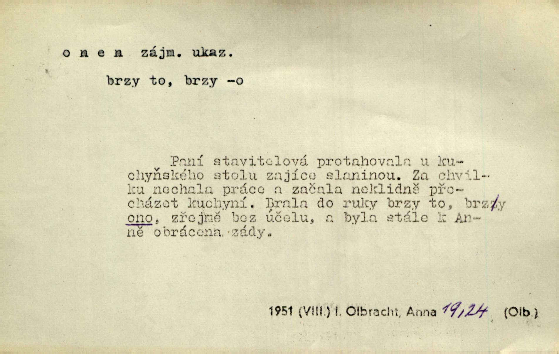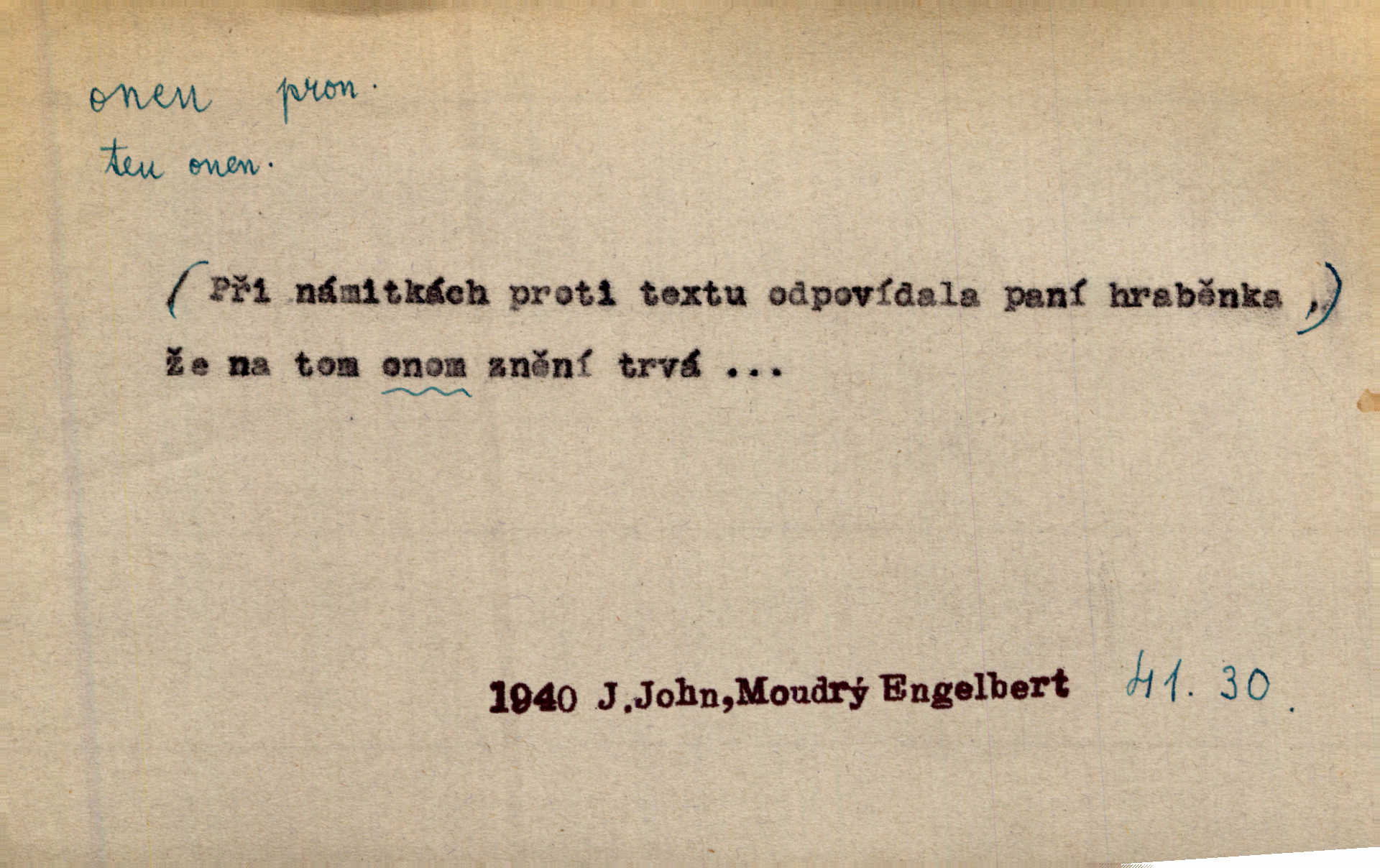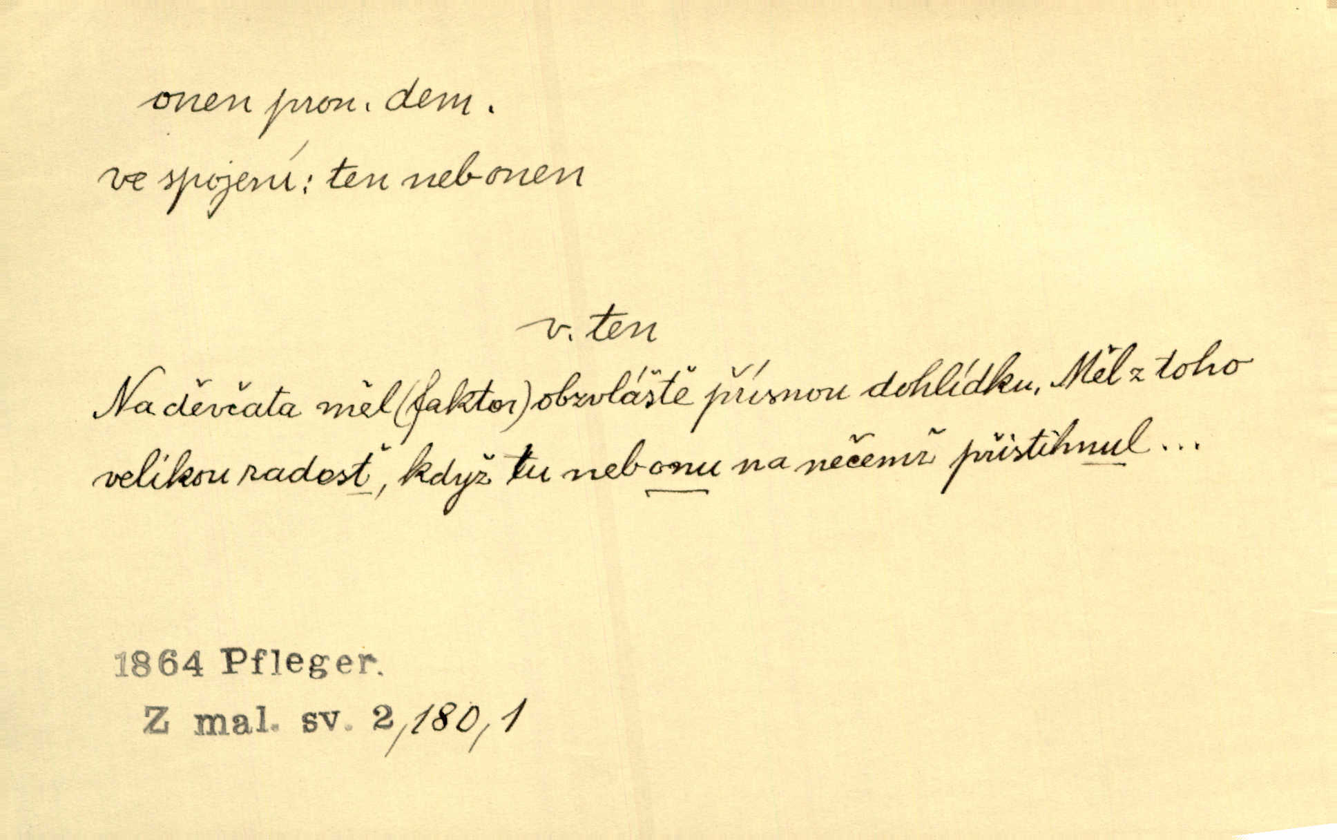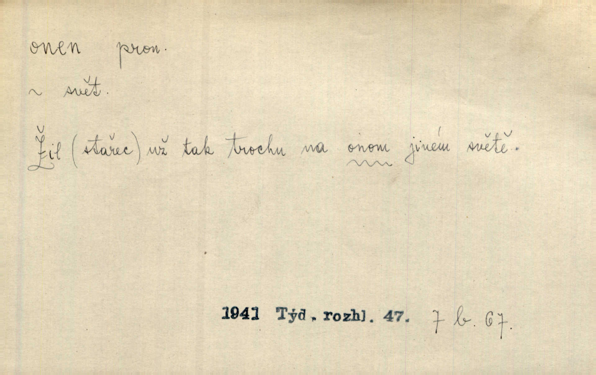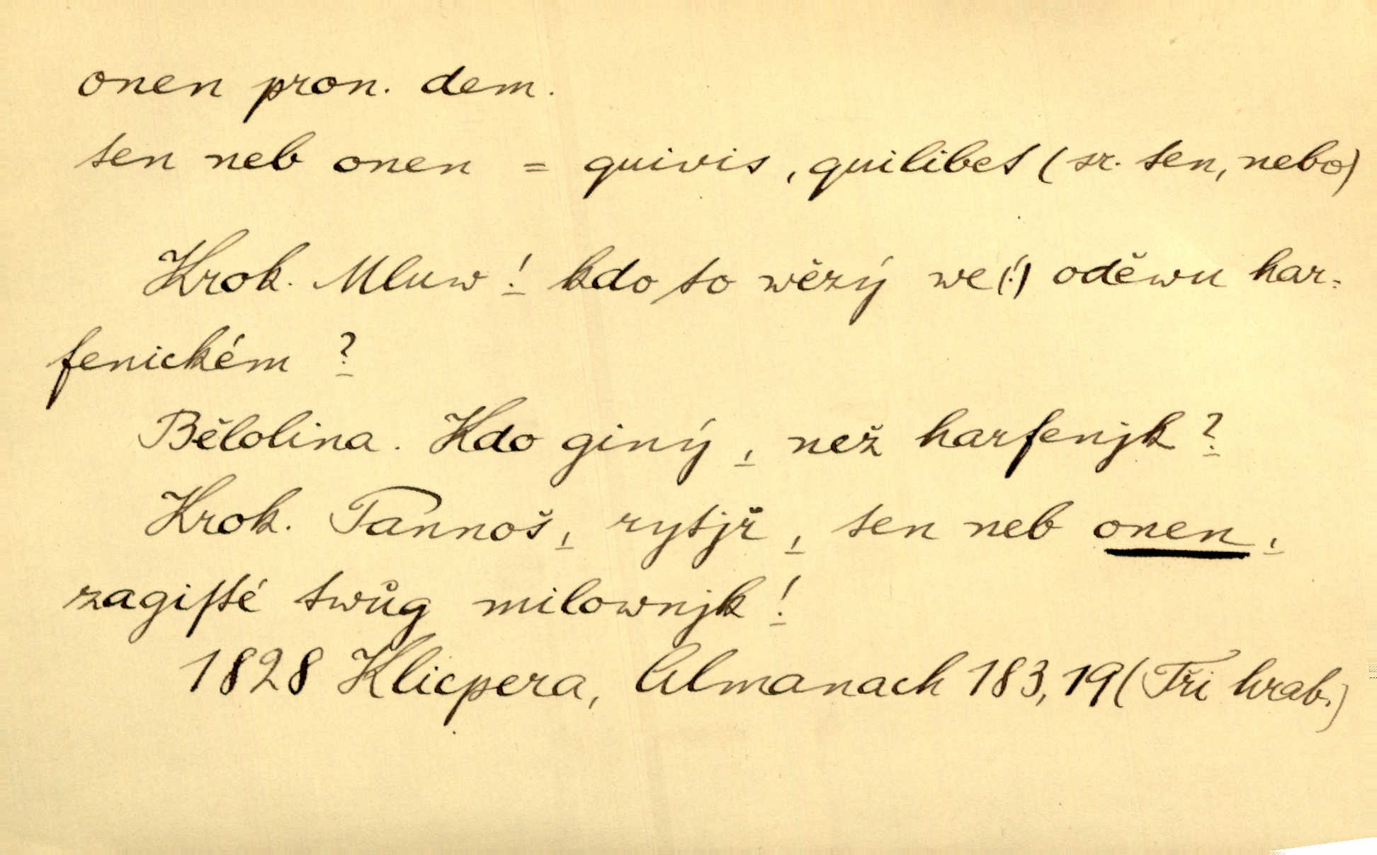 - onen, ona, ono (zast. onenno, onano, onono) zájm. ukaz., jež ukazuje na vzdálenější ze dvou osob n. věcí. Část lomenice pod tímto příčným prknem byla prostě obílena, ona však nad ním všecka omalována. Jir. Ve hrůze očekával jsem, které dvéře se nyní otevrou, zda veliké, vedoucí bezpochyby do nádvoří, aneb ony menší, patrně ke schodům služebnictva. Čap. Ch. Onano zoufale nešťastná [láska Vondrejcova] nebyla k smrti, kdežto tahle [láska Annina]‚ jež nezůstavila žádného přání nesplněného, Bůhví že ano! Čap. Ch. Měl chvíle, kdy se cítil už více na onom než na tomto světě mrtev. Zey. Odešel na onen svět zemřel. Jir. D ukazuje na druhou ze dvou osob n. věcí ve výrazech vyjadřujících střídání ve spojení ten-onen, tento-onen jeden-druhý. Mnozí křesťané tak se v chrámě chovají, jakoby chrám byl hospoda. Tato sem přichází, aby se ukázala; onen, aby viděl. Puchm. [Paní] všímala si kde jaké maličkosti, časem ukazujíc synovi rukou hned v tu hned v onu stranu. Herb. City jeho houpaly se posud jako na váze brzy v tu, brzy v onu stranu. Šmil. Truhlice byla brzo u toho, brzo u onoho rychtáře v úkrytu. Jir. Mlčky postál s otcem, prohlížel to i ono, poklepal sem tam hůlečkou. Herb. Mluvili o tom i onom o všeličems. Šmil. D ten onen sem tam někdo, leckdo. Ten onen, ta ona na ně i pokřikli. Jir. Načíná [chemik] laboratorní pokusy s tím oním předpokládaným sloučením hmot, ale pokusy se nedaří. K. Čap. Každou chvíli se trefovalo, že mne ten onen potřeboval. Kos. D ukazuje na osobu n. věc, o které byla již řeč, která je známá n. časově vzdálená. Bude hůře osamocen než onino dva staří lidé, kteří vůbec dětí neměli. Klost. Portýr se uklonil s onou úsměvnou pokorou, na kterou se za zpropitné služebnictvo hostinců vždy sníží. Ner. Kolikrát vykonalo již ono staré kyvadlo svou jednotvárnou obchůzku. Čech. Vás posavad věrné potěšuji potěšením míru, kterýmž potěšil nás převěrný náš Pán oněmino svatými slovy svými. Jir. Kdes oné tmavé noci byl, a co za řízení tě volalo z domu? Klicp. Já, maje předstoupiti před soudnou stolici onoho nad hvězdami, nechci obtížiti duši svou podílem na krvi prolité. J. z Hv. Za onoho času byl hostinec „u zeleného stromu“ v Praze vyhlášený v tehdejší době. Sab. Za onoho času umíval jsem dudáka a černého Petra, ale teď bych snad ani to nesvedl kdysi dávno. Rais. Kořalky líznete leda za onoho času zřídka kdy. Rais. Rozmluva mezi Rojerem a Evelinou je jako váhavé, bezcílné tahání, styl z roku onoho. Vodák. Lid. Hezky jsme se s panímámou v onen týden smluvily v kostele minulý týden. Rais. D Zast. na slovo vzatý, slavný, proslulý. Konstituce jest jen provedení ve státu známé oné zásady vší spravedlnosti: čeho sobě nechceš, jinému nečiň. Pal. Povstal Nestor libomluvný, onen hlasitý z Pylonu řečník. J. Nej.
