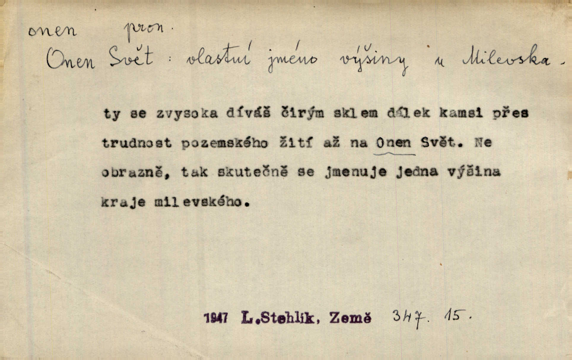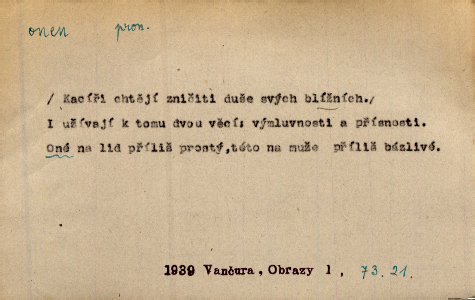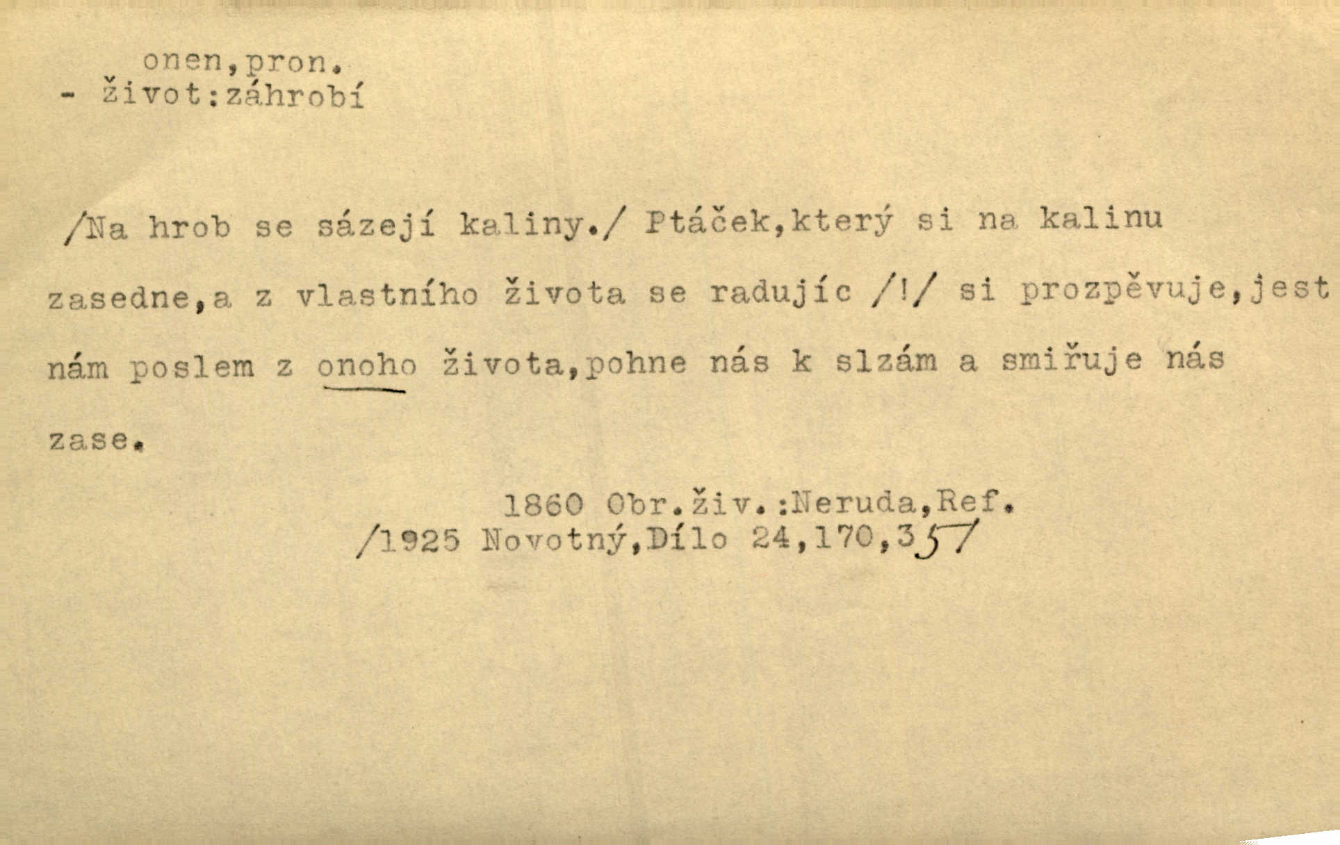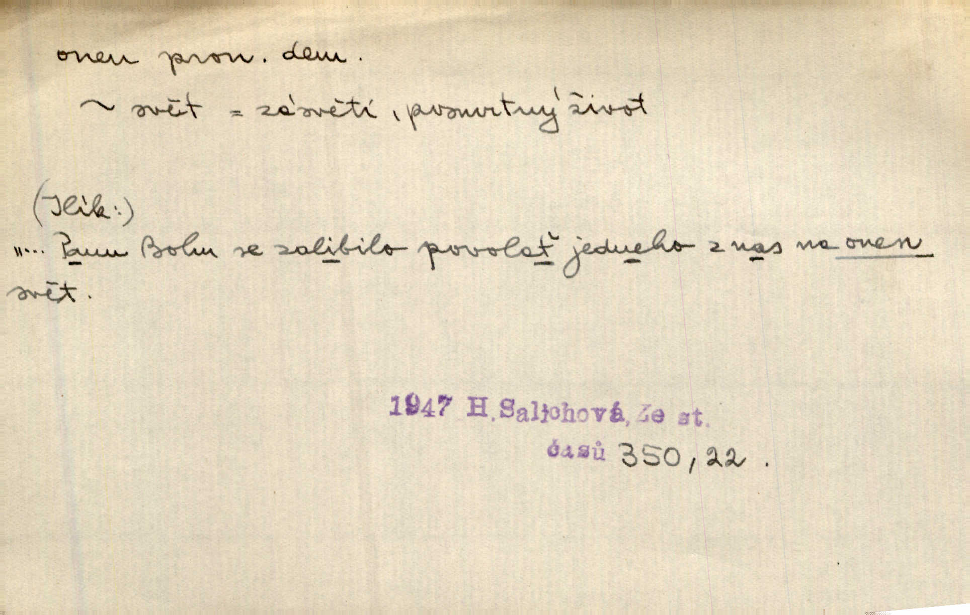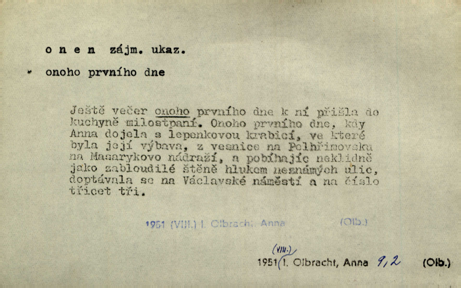 - onen, ona, ono (zast. onenno, onano, onono) zájm. ukaz., jež ukazuje na vzdálenější ze dvou osob n. věcí. Část lomenice pod tímto příčným prknem byla prostě obílena, ona však nad ním všecka omalována. Jir. Ve hrůze očekával jsem, které dvéře se nyní otevrou, zda veliké, vedoucí bezpochyby do nádvoří, aneb ony menší, patrně ke schodům služebnictva. Čap. Ch. Onano zoufale nešťastná [láska Vondrejcova] nebyla k smrti, kdežto tahle [láska Annina]‚ jež nezůstavila žádného přání nesplněného, Bůhví že ano! Čap. Ch. Měl chvíle, kdy se cítil už více na onom než na tomto světě mrtev. Zey. Odešel na onen svět zemřel. Jir. D ukazuje na druhou ze dvou osob n. věcí ve výrazech vyjadřujících střídání ve spojení ten-onen, tento-onen jeden-druhý. Mnozí křesťané tak se v chrámě chovají, jakoby chrám byl hospoda. Tato sem přichází, aby se ukázala; onen, aby viděl. Puchm. [Paní] všímala si kde jaké maličkosti, časem ukazujíc synovi rukou hned v tu hned v onu stranu. Herb. City jeho houpaly se posud jako na váze brzy v tu, brzy v onu stranu. Šmil. Truhlice byla brzo u toho, brzo u onoho rychtáře v úkrytu. Jir. Mlčky postál s otcem, prohlížel to i ono, poklepal sem tam hůlečkou. Herb. Mluvili o tom i onom o všeličems. Šmil. D ten onen sem tam někdo, leckdo. Ten onen, ta ona na ně i pokřikli. Jir. Načíná [chemik] laboratorní pokusy s tím oním předpokládaným sloučením hmot, ale pokusy se nedaří. K. Čap. Každou chvíli se trefovalo, že mne ten onen potřeboval. Kos. D ukazuje na osobu n. věc, o které byla již řeč, která je známá n. časově vzdálená. Bude hůře osamocen než onino dva staří lidé, kteří vůbec dětí neměli. Klost. Portýr se uklonil s onou úsměvnou pokorou, na kterou se za zpropitné služebnictvo hostinců vždy sníží. Ner. Kolikrát vykonalo již ono staré kyvadlo svou jednotvárnou obchůzku. Čech. Vás posavad věrné potěšuji potěšením míru, kterýmž potěšil nás převěrný náš Pán oněmino svatými slovy svými. Jir. Kdes oné tmavé noci byl, a co za řízení tě volalo z domu? Klicp. Já, maje předstoupiti před soudnou stolici onoho nad hvězdami, nechci obtížiti duši svou podílem na krvi prolité. J. z Hv. Za onoho času byl hostinec „u zeleného stromu“ v Praze vyhlášený v tehdejší době. Sab. Za onoho času umíval jsem dudáka a černého Petra, ale teď bych snad ani to nesvedl kdysi dávno. Rais. Kořalky líznete leda za onoho času zřídka kdy. Rais. Rozmluva mezi Rojerem a Evelinou je jako váhavé, bezcílné tahání, styl z roku onoho. Vodák. Lid. Hezky jsme se s panímámou v onen týden smluvily v kostele minulý týden. Rais. D Zast. na slovo vzatý, slavný, proslulý. Konstituce jest jen provedení ve státu známé oné zásady vší spravedlnosti: čeho sobě nechceš, jinému nečiň. Pal. Povstal Nestor libomluvný, onen hlasitý z Pylonu řečník. J. Nej.