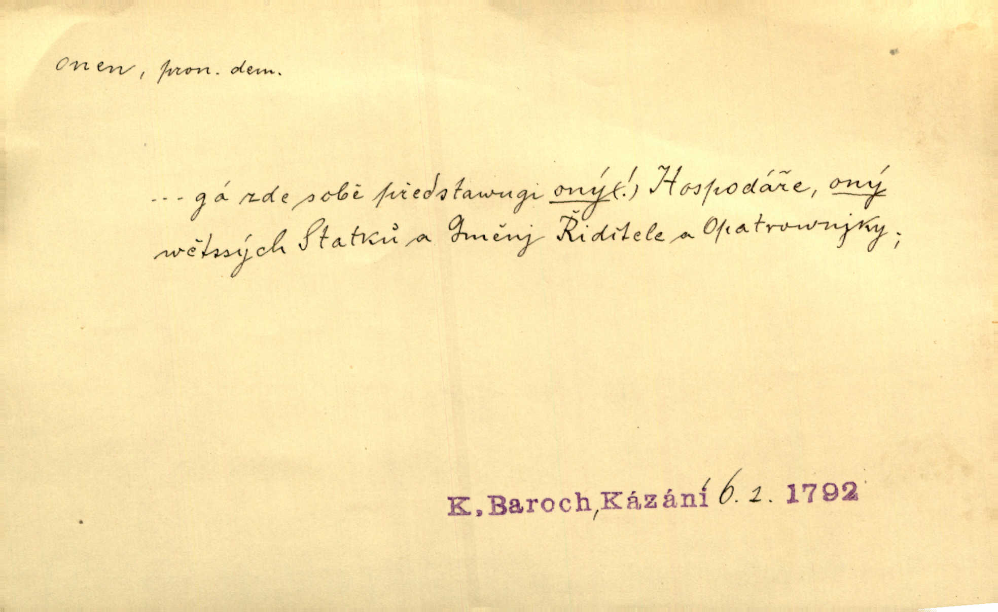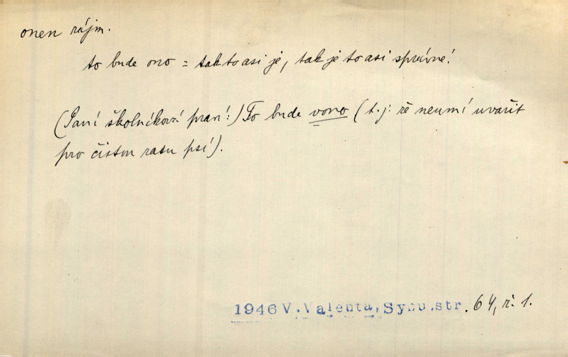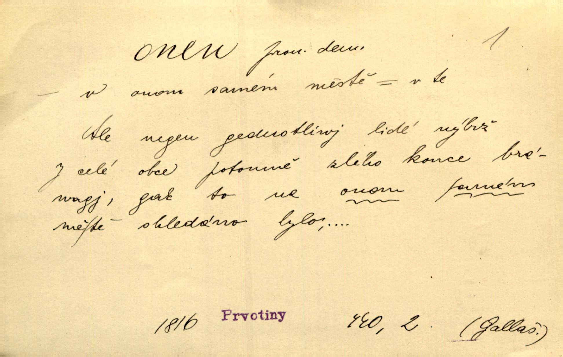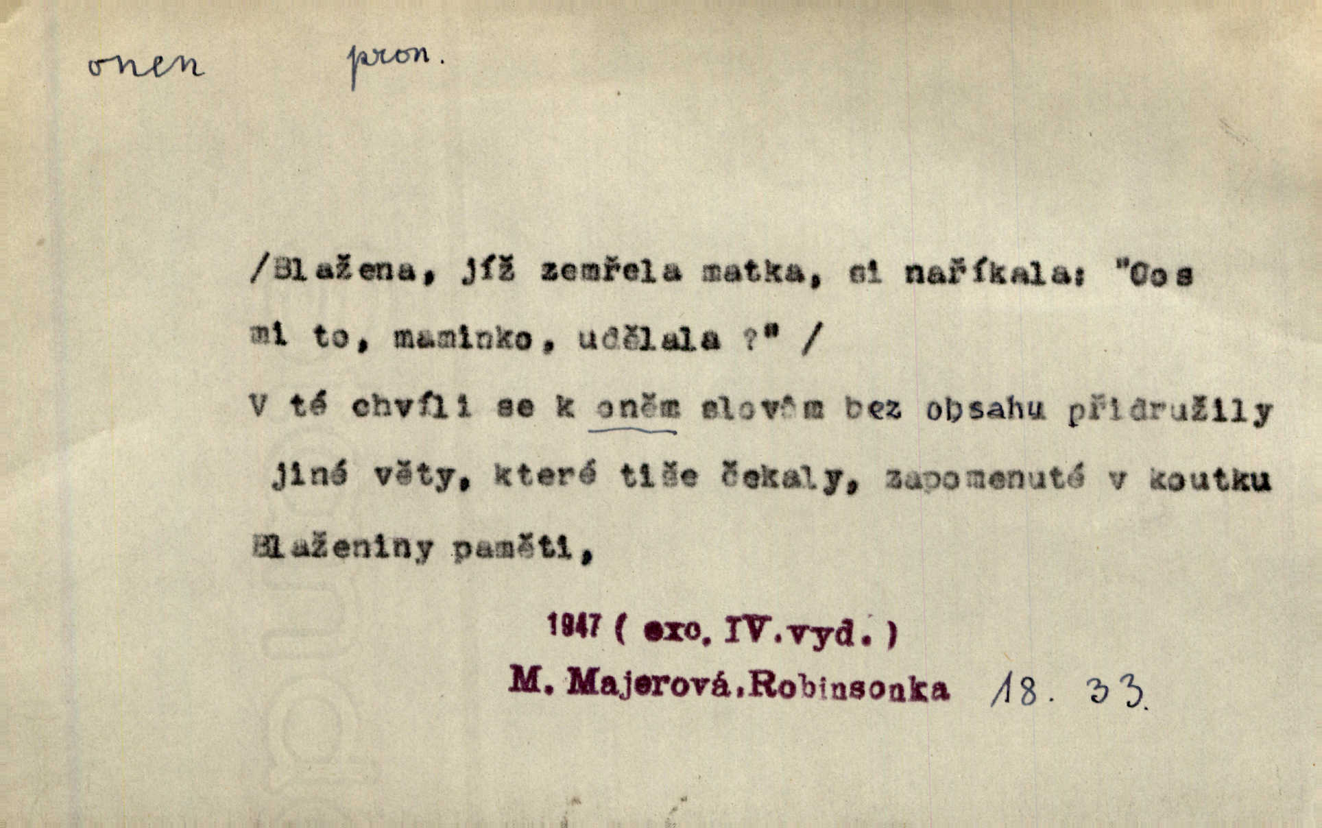 - onen, ona, ono (zast. onenno, onano, onono) zájm. ukaz., jež ukazuje na vzdálenější ze dvou osob n. věcí. Část lomenice pod tímto příčným prknem byla prostě obílena, ona však nad ním všecka omalována. Jir. Ve hrůze očekával jsem, které dvéře se nyní otevrou, zda veliké, vedoucí bezpochyby do nádvoří, aneb ony menší, patrně ke schodům služebnictva. Čap. Ch. Onano zoufale nešťastná [láska Vondrejcova] nebyla k smrti, kdežto tahle [láska Annina]‚ jež nezůstavila žádného přání nesplněného, Bůhví že ano! Čap. Ch. Měl chvíle, kdy se cítil už více na onom než na tomto světě mrtev. Zey. Odešel na onen svět zemřel. Jir. D ukazuje na druhou ze dvou osob n. věcí ve výrazech vyjadřujících střídání ve spojení ten-onen, tento-onen jeden-druhý. Mnozí křesťané tak se v chrámě chovají, jakoby chrám byl hospoda. Tato sem přichází, aby se ukázala; onen, aby viděl. Puchm. [Paní] všímala si kde jaké maličkosti, časem ukazujíc synovi rukou hned v tu hned v onu stranu. Herb. City jeho houpaly se posud jako na váze brzy v tu, brzy v onu stranu. Šmil. Truhlice byla brzo u toho, brzo u onoho rychtáře v úkrytu. Jir. Mlčky postál s otcem, prohlížel to i ono, poklepal sem tam hůlečkou. Herb. Mluvili o tom i onom o všeličems. Šmil. D ten onen sem tam někdo, leckdo. Ten onen, ta ona na ně i pokřikli. Jir. Načíná [chemik] laboratorní pokusy s tím oním předpokládaným sloučením hmot, ale pokusy se nedaří. K. Čap. Každou chvíli se trefovalo, že mne ten onen potřeboval. Kos. D ukazuje na osobu n. věc, o které byla již řeč, která je známá n. časově vzdálená. Bude hůře osamocen než onino dva staří lidé, kteří vůbec dětí neměli. Klost. Portýr se uklonil s onou úsměvnou pokorou, na kterou se za zpropitné služebnictvo hostinců vždy sníží. Ner. Kolikrát vykonalo již ono staré kyvadlo svou jednotvárnou obchůzku. Čech. Vás posavad věrné potěšuji potěšením míru, kterýmž potěšil nás převěrný náš Pán oněmino svatými slovy svými. Jir. Kdes oné tmavé noci byl, a co za řízení tě volalo z domu? Klicp. Já, maje předstoupiti před soudnou stolici onoho nad hvězdami, nechci obtížiti duši svou podílem na krvi prolité. J. z Hv. Za onoho času byl hostinec „u zeleného stromu“ v Praze vyhlášený v tehdejší době. Sab. Za onoho času umíval jsem dudáka a černého Petra, ale teď bych snad ani to nesvedl kdysi dávno. Rais. Kořalky líznete leda za onoho času zřídka kdy. Rais. Rozmluva mezi Rojerem a Evelinou je jako váhavé, bezcílné tahání, styl z roku onoho. Vodák. Lid. Hezky jsme se s panímámou v onen týden smluvily v kostele minulý týden. Rais. D Zast. na slovo vzatý, slavný, proslulý. Konstituce jest jen provedení ve státu známé oné zásady vší spravedlnosti: čeho sobě nechceš, jinému nečiň. Pal. Povstal Nestor libomluvný, onen hlasitý z Pylonu řečník. J. Nej.