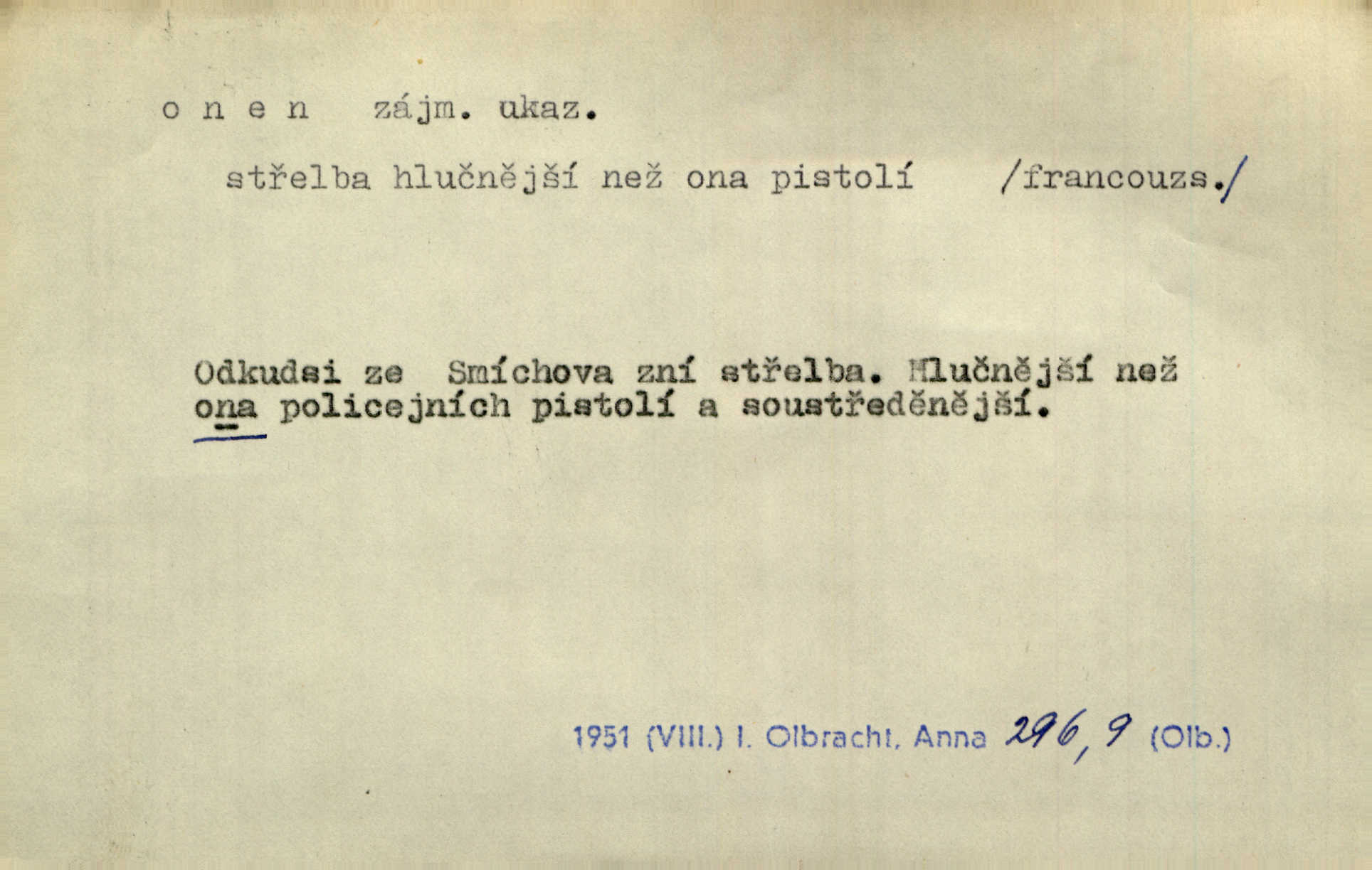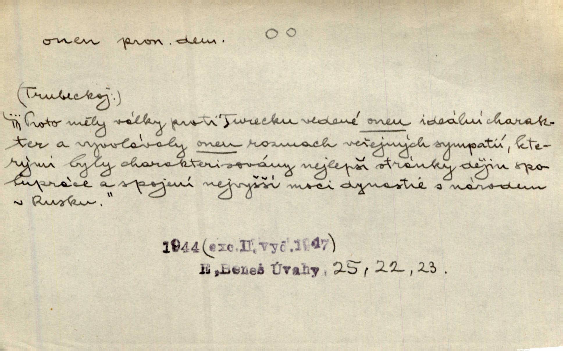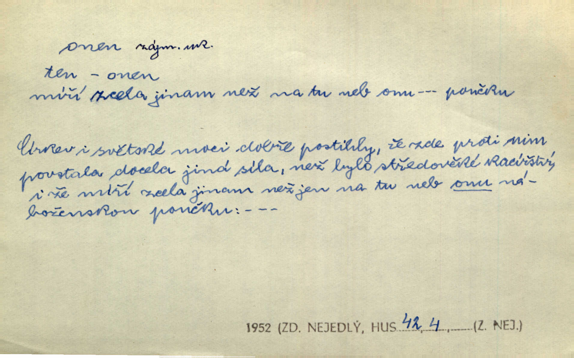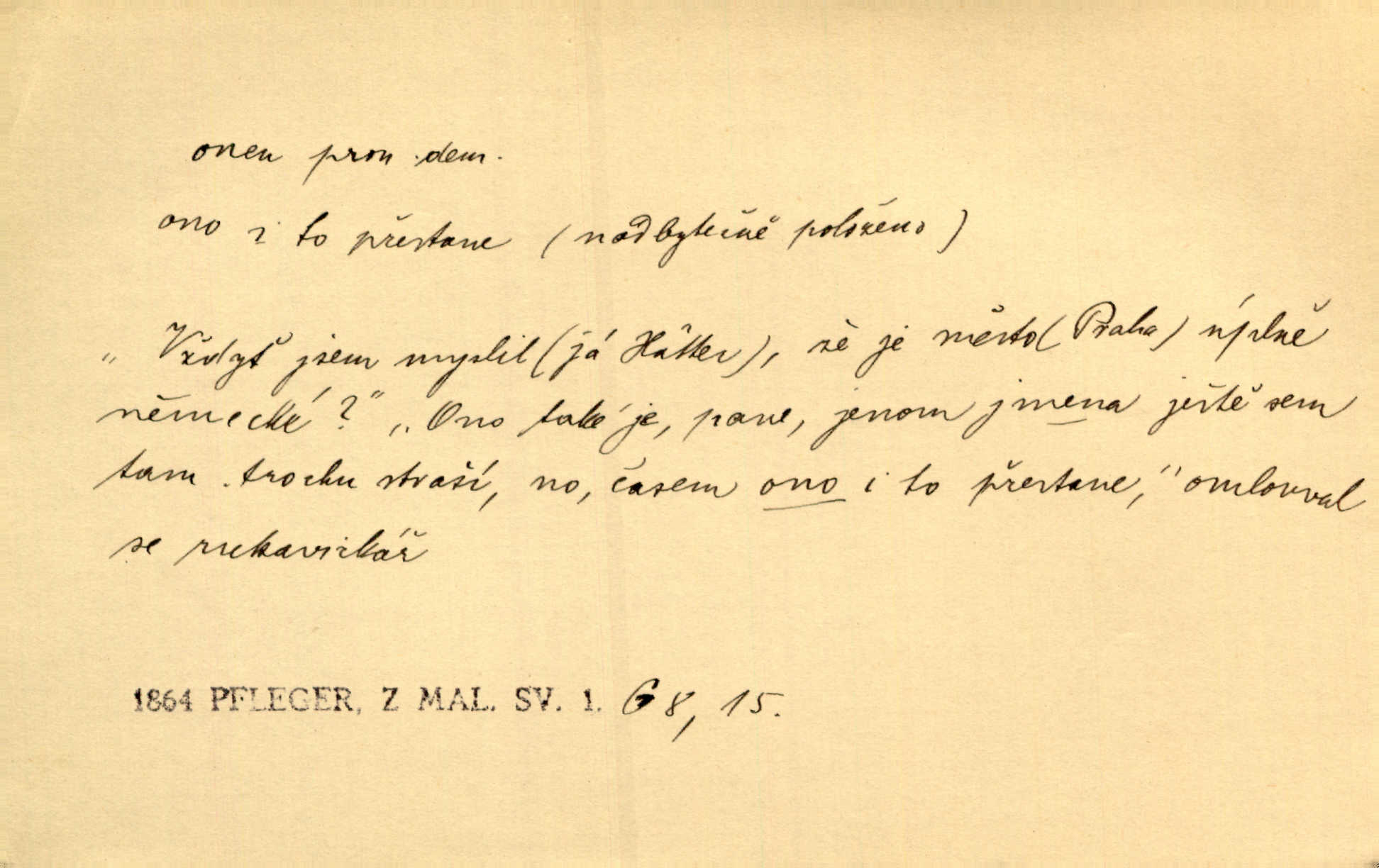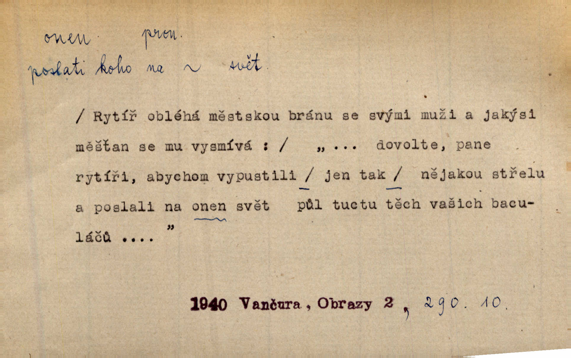 - onen, ona, ono (zast. onenno, onano, onono) zájm. ukaz., jež ukazuje na vzdálenější ze dvou osob n. věcí. Část lomenice pod tímto příčným prknem byla prostě obílena, ona však nad ním všecka omalována. Jir. Ve hrůze očekával jsem, které dvéře se nyní otevrou, zda veliké, vedoucí bezpochyby do nádvoří, aneb ony menší, patrně ke schodům služebnictva. Čap. Ch. Onano zoufale nešťastná [láska Vondrejcova] nebyla k smrti, kdežto tahle [láska Annina]‚ jež nezůstavila žádného přání nesplněného, Bůhví že ano! Čap. Ch. Měl chvíle, kdy se cítil už více na onom než na tomto světě mrtev. Zey. Odešel na onen svět zemřel. Jir. D ukazuje na druhou ze dvou osob n. věcí ve výrazech vyjadřujících střídání ve spojení ten-onen, tento-onen jeden-druhý. Mnozí křesťané tak se v chrámě chovají, jakoby chrám byl hospoda. Tato sem přichází, aby se ukázala; onen, aby viděl. Puchm. [Paní] všímala si kde jaké maličkosti, časem ukazujíc synovi rukou hned v tu hned v onu stranu. Herb. City jeho houpaly se posud jako na váze brzy v tu, brzy v onu stranu. Šmil. Truhlice byla brzo u toho, brzo u onoho rychtáře v úkrytu. Jir. Mlčky postál s otcem, prohlížel to i ono, poklepal sem tam hůlečkou. Herb. Mluvili o tom i onom o všeličems. Šmil. D ten onen sem tam někdo, leckdo. Ten onen, ta ona na ně i pokřikli. Jir. Načíná [chemik] laboratorní pokusy s tím oním předpokládaným sloučením hmot, ale pokusy se nedaří. K. Čap. Každou chvíli se trefovalo, že mne ten onen potřeboval. Kos. D ukazuje na osobu n. věc, o které byla již řeč, která je známá n. časově vzdálená. Bude hůře osamocen než onino dva staří lidé, kteří vůbec dětí neměli. Klost. Portýr se uklonil s onou úsměvnou pokorou, na kterou se za zpropitné služebnictvo hostinců vždy sníží. Ner. Kolikrát vykonalo již ono staré kyvadlo svou jednotvárnou obchůzku. Čech. Vás posavad věrné potěšuji potěšením míru, kterýmž potěšil nás převěrný náš Pán oněmino svatými slovy svými. Jir. Kdes oné tmavé noci byl, a co za řízení tě volalo z domu? Klicp. Já, maje předstoupiti před soudnou stolici onoho nad hvězdami, nechci obtížiti duši svou podílem na krvi prolité. J. z Hv. Za onoho času byl hostinec „u zeleného stromu“ v Praze vyhlášený v tehdejší době. Sab. Za onoho času umíval jsem dudáka a černého Petra, ale teď bych snad ani to nesvedl kdysi dávno. Rais. Kořalky líznete leda za onoho času zřídka kdy. Rais. Rozmluva mezi Rojerem a Evelinou je jako váhavé, bezcílné tahání, styl z roku onoho. Vodák. Lid. Hezky jsme se s panímámou v onen týden smluvily v kostele minulý týden. Rais. D Zast. na slovo vzatý, slavný, proslulý. Konstituce jest jen provedení ve státu známé oné zásady vší spravedlnosti: čeho sobě nechceš, jinému nečiň. Pal. Povstal Nestor libomluvný, onen hlasitý z Pylonu řečník. J. Nej.