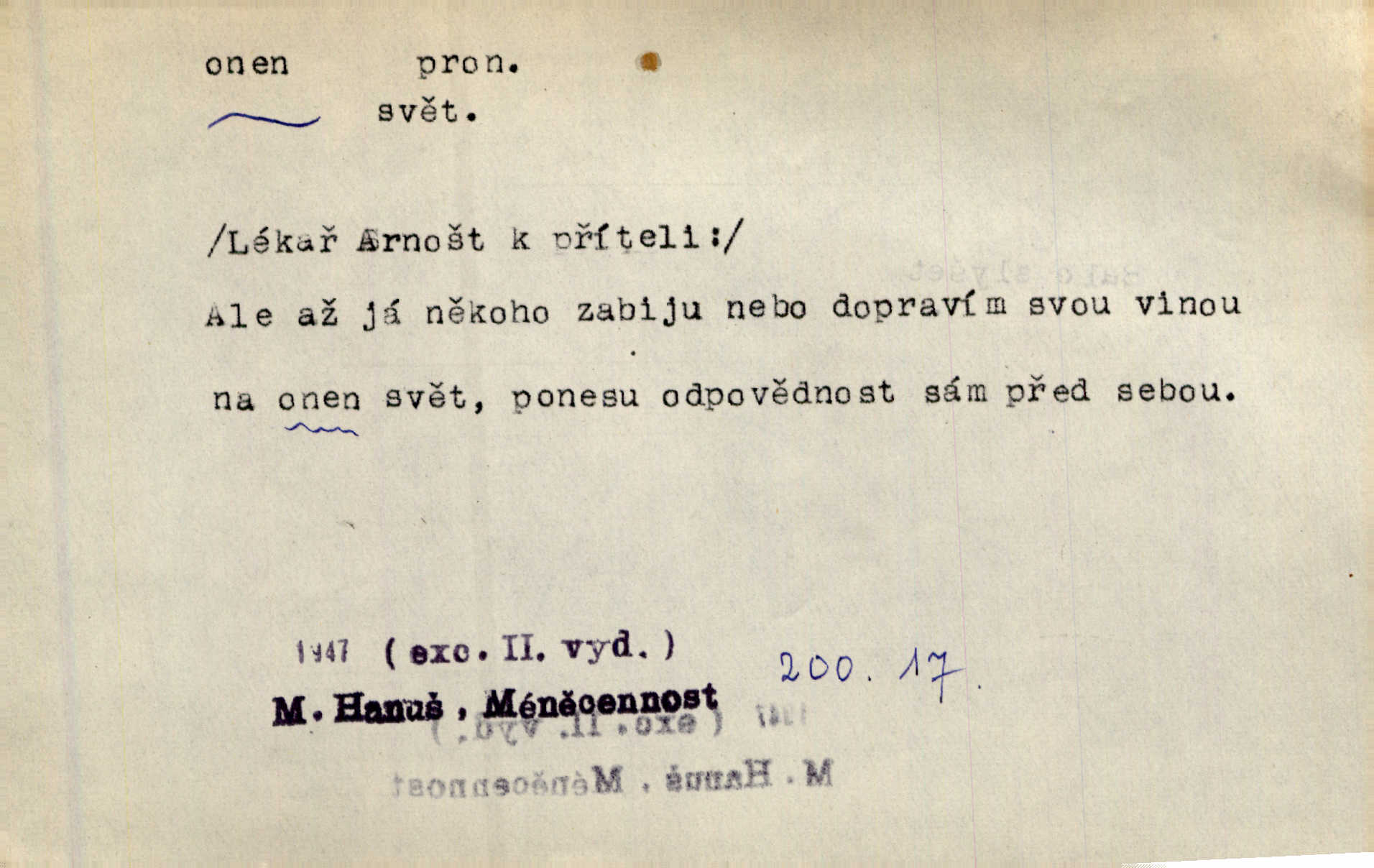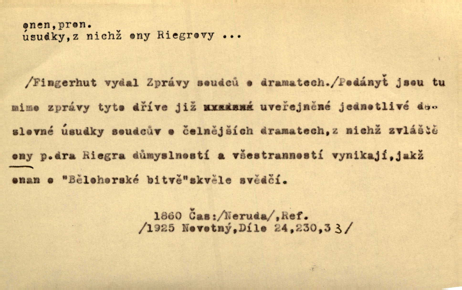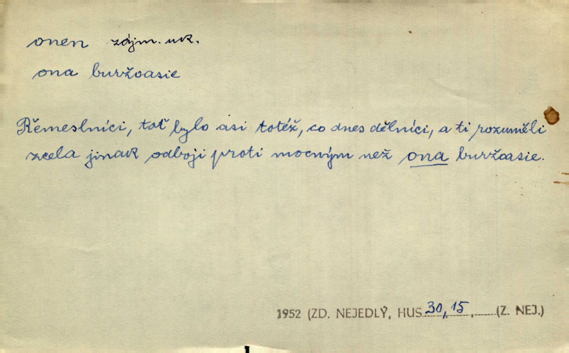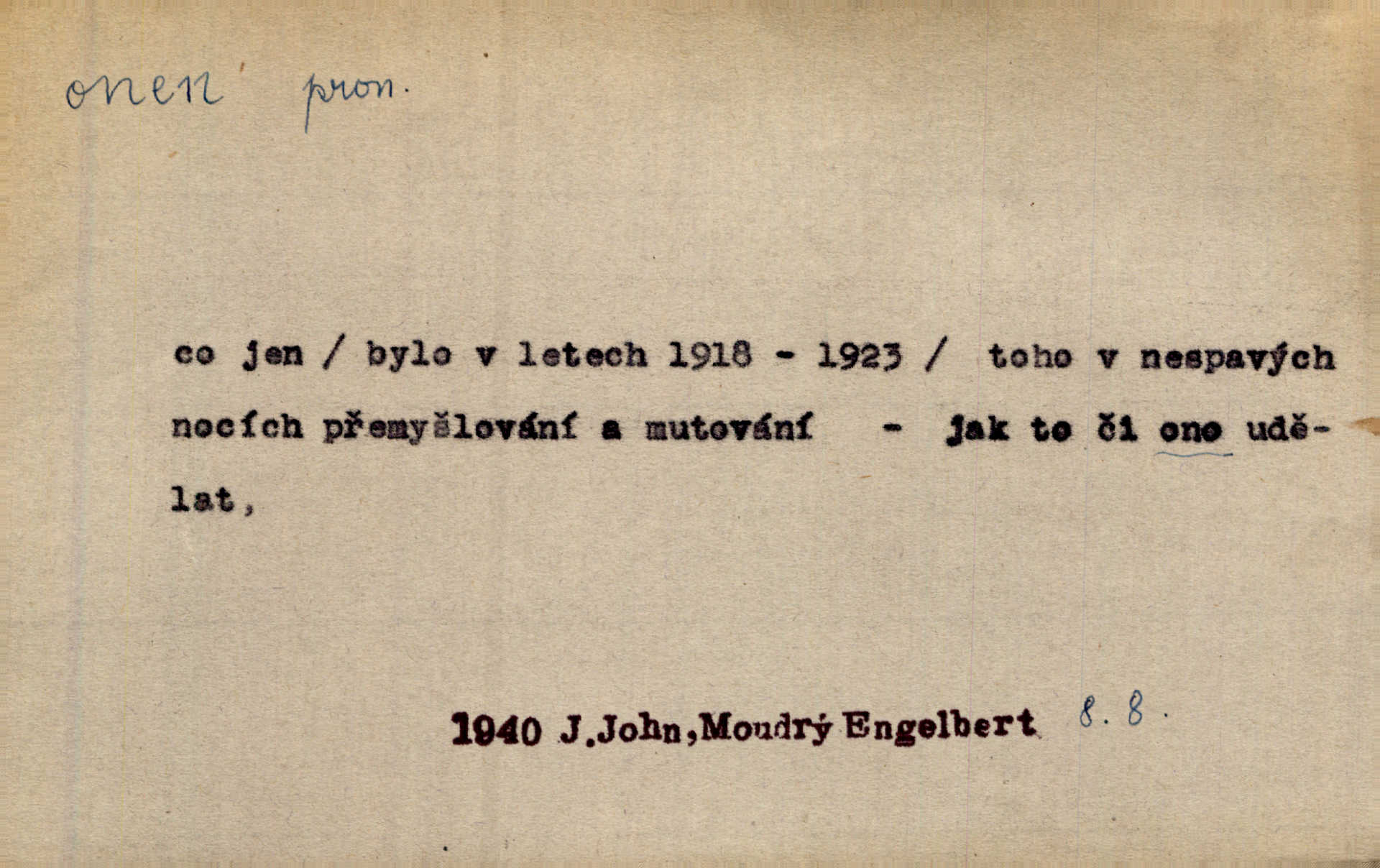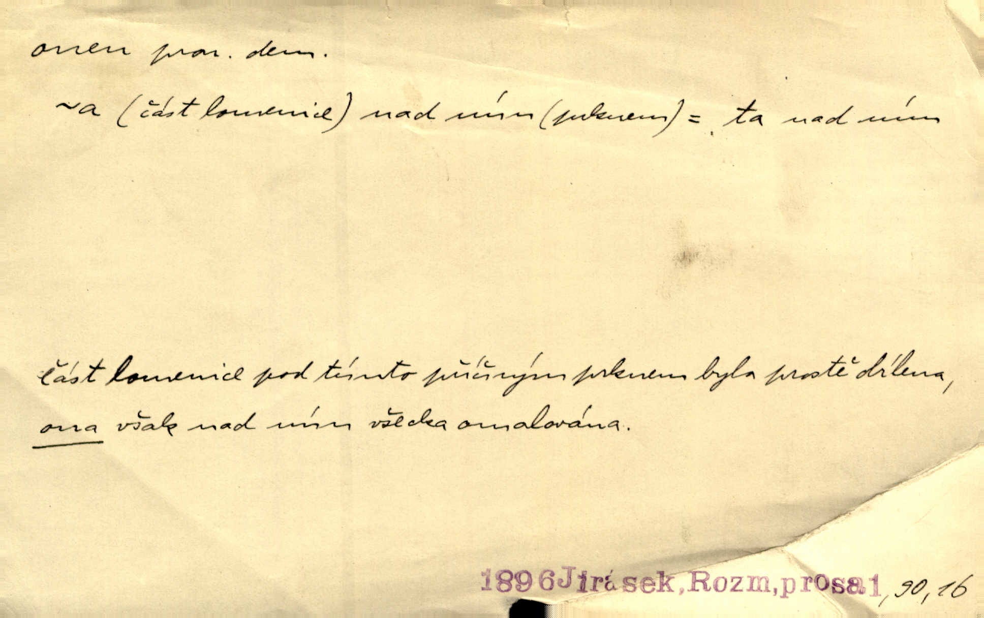 - onen, ona, ono (zast. onenno, onano, onono) zájm. ukaz., jež ukazuje na vzdálenější ze dvou osob n. věcí. Část lomenice pod tímto příčným prknem byla prostě obílena, ona však nad ním všecka omalována. Jir. Ve hrůze očekával jsem, které dvéře se nyní otevrou, zda veliké, vedoucí bezpochyby do nádvoří, aneb ony menší, patrně ke schodům služebnictva. Čap. Ch. Onano zoufale nešťastná [láska Vondrejcova] nebyla k smrti, kdežto tahle [láska Annina]‚ jež nezůstavila žádného přání nesplněného, Bůhví že ano! Čap. Ch. Měl chvíle, kdy se cítil už více na onom než na tomto světě mrtev. Zey. Odešel na onen svět zemřel. Jir. D ukazuje na druhou ze dvou osob n. věcí ve výrazech vyjadřujících střídání ve spojení ten-onen, tento-onen jeden-druhý. Mnozí křesťané tak se v chrámě chovají, jakoby chrám byl hospoda. Tato sem přichází, aby se ukázala; onen, aby viděl. Puchm. [Paní] všímala si kde jaké maličkosti, časem ukazujíc synovi rukou hned v tu hned v onu stranu. Herb. City jeho houpaly se posud jako na váze brzy v tu, brzy v onu stranu. Šmil. Truhlice byla brzo u toho, brzo u onoho rychtáře v úkrytu. Jir. Mlčky postál s otcem, prohlížel to i ono, poklepal sem tam hůlečkou. Herb. Mluvili o tom i onom o všeličems. Šmil. D ten onen sem tam někdo, leckdo. Ten onen, ta ona na ně i pokřikli. Jir. Načíná [chemik] laboratorní pokusy s tím oním předpokládaným sloučením hmot, ale pokusy se nedaří. K. Čap. Každou chvíli se trefovalo, že mne ten onen potřeboval. Kos. D ukazuje na osobu n. věc, o které byla již řeč, která je známá n. časově vzdálená. Bude hůře osamocen než onino dva staří lidé, kteří vůbec dětí neměli. Klost. Portýr se uklonil s onou úsměvnou pokorou, na kterou se za zpropitné služebnictvo hostinců vždy sníží. Ner. Kolikrát vykonalo již ono staré kyvadlo svou jednotvárnou obchůzku. Čech. Vás posavad věrné potěšuji potěšením míru, kterýmž potěšil nás převěrný náš Pán oněmino svatými slovy svými. Jir. Kdes oné tmavé noci byl, a co za řízení tě volalo z domu? Klicp. Já, maje předstoupiti před soudnou stolici onoho nad hvězdami, nechci obtížiti duši svou podílem na krvi prolité. J. z Hv. Za onoho času byl hostinec „u zeleného stromu“ v Praze vyhlášený v tehdejší době. Sab. Za onoho času umíval jsem dudáka a černého Petra, ale teď bych snad ani to nesvedl kdysi dávno. Rais. Kořalky líznete leda za onoho času zřídka kdy. Rais. Rozmluva mezi Rojerem a Evelinou je jako váhavé, bezcílné tahání, styl z roku onoho. Vodák. Lid. Hezky jsme se s panímámou v onen týden smluvily v kostele minulý týden. Rais. D Zast. na slovo vzatý, slavný, proslulý. Konstituce jest jen provedení ve státu známé oné zásady vší spravedlnosti: čeho sobě nechceš, jinému nečiň. Pal. Povstal Nestor libomluvný, onen hlasitý z Pylonu řečník. J. Nej.