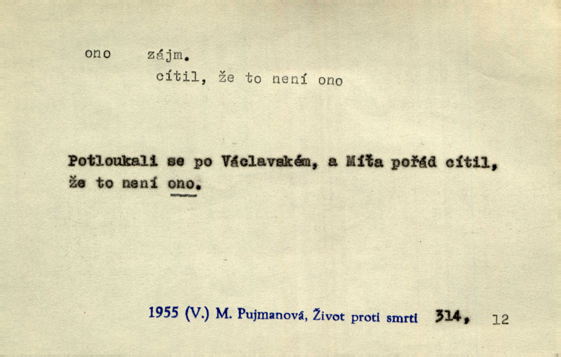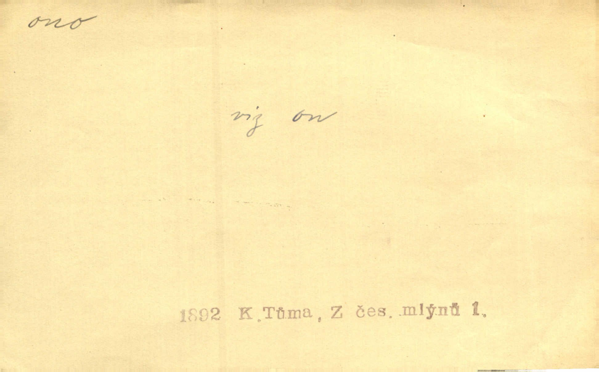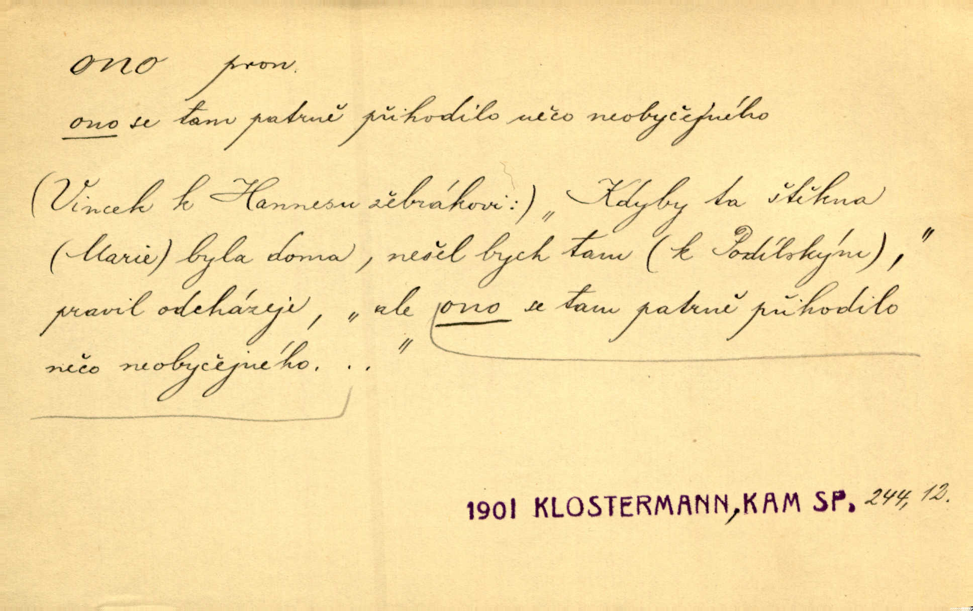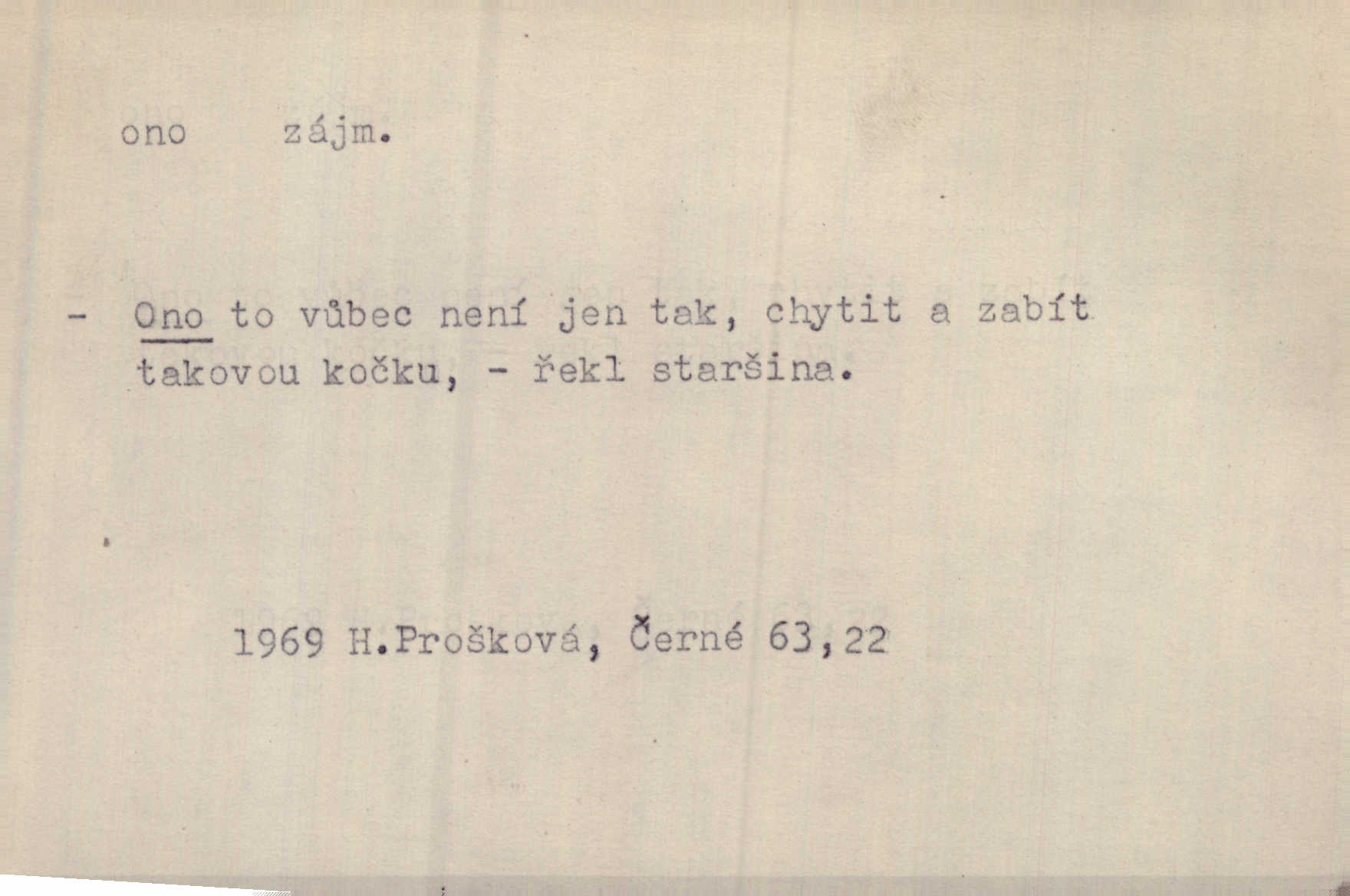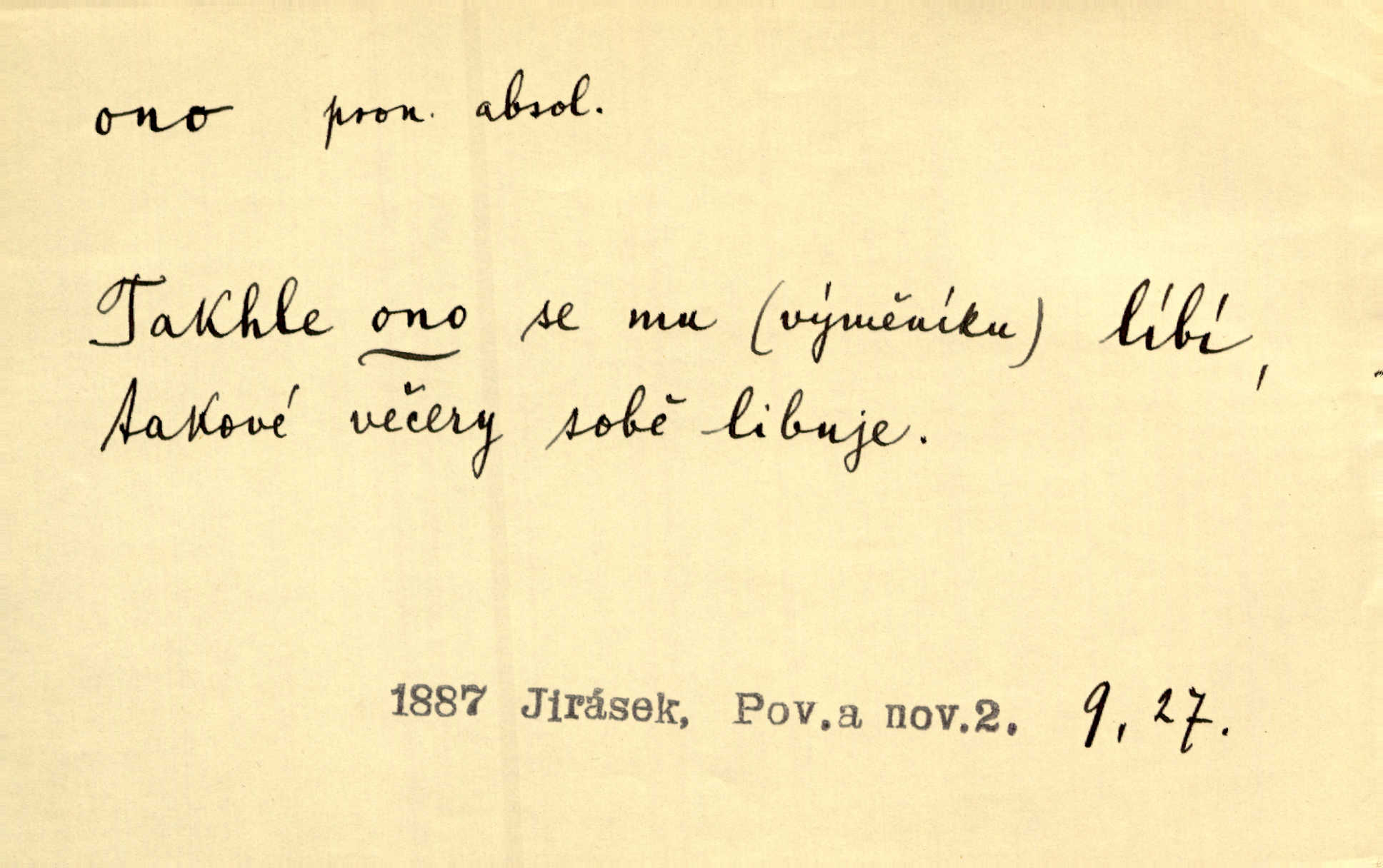 - onen, ona, ono (zast. onenno, onano, onono) zájm. ukaz., jež ukazuje na vzdálenější ze dvou osob n. věcí. Část lomenice pod tímto příčným prknem byla prostě obílena, ona však nad ním všecka omalována. Jir. Ve hrůze očekával jsem, které dvéře se nyní otevrou, zda veliké, vedoucí bezpochyby do nádvoří, aneb ony menší, patrně ke schodům služebnictva. Čap. Ch. Onano zoufale nešťastná [láska Vondrejcova] nebyla k smrti, kdežto tahle [láska Annina]‚ jež nezůstavila žádného přání nesplněného, Bůhví že ano! Čap. Ch. Měl chvíle, kdy se cítil už více na onom než na tomto světě mrtev. Zey. Odešel na onen svět zemřel. Jir. D ukazuje na druhou ze dvou osob n. věcí ve výrazech vyjadřujících střídání ve spojení ten-onen, tento-onen jeden-druhý. Mnozí křesťané tak se v chrámě chovají, jakoby chrám byl hospoda. Tato sem přichází, aby se ukázala; onen, aby viděl. Puchm. [Paní] všímala si kde jaké maličkosti, časem ukazujíc synovi rukou hned v tu hned v onu stranu. Herb. City jeho houpaly se posud jako na váze brzy v tu, brzy v onu stranu. Šmil. Truhlice byla brzo u toho, brzo u onoho rychtáře v úkrytu. Jir. Mlčky postál s otcem, prohlížel to i ono, poklepal sem tam hůlečkou. Herb. Mluvili o tom i onom o všeličems. Šmil. D ten onen sem tam někdo, leckdo. Ten onen, ta ona na ně i pokřikli. Jir. Načíná [chemik] laboratorní pokusy s tím oním předpokládaným sloučením hmot, ale pokusy se nedaří. K. Čap. Každou chvíli se trefovalo, že mne ten onen potřeboval. Kos. D ukazuje na osobu n. věc, o které byla již řeč, která je známá n. časově vzdálená. Bude hůře osamocen než onino dva staří lidé, kteří vůbec dětí neměli. Klost. Portýr se uklonil s onou úsměvnou pokorou, na kterou se za zpropitné služebnictvo hostinců vždy sníží. Ner. Kolikrát vykonalo již ono staré kyvadlo svou jednotvárnou obchůzku. Čech. Vás posavad věrné potěšuji potěšením míru, kterýmž potěšil nás převěrný náš Pán oněmino svatými slovy svými. Jir. Kdes oné tmavé noci byl, a co za řízení tě volalo z domu? Klicp. Já, maje předstoupiti před soudnou stolici onoho nad hvězdami, nechci obtížiti duši svou podílem na krvi prolité. J. z Hv. Za onoho času byl hostinec „u zeleného stromu“ v Praze vyhlášený v tehdejší době. Sab. Za onoho času umíval jsem dudáka a černého Petra, ale teď bych snad ani to nesvedl kdysi dávno. Rais. Kořalky líznete leda za onoho času zřídka kdy. Rais. Rozmluva mezi Rojerem a Evelinou je jako váhavé, bezcílné tahání, styl z roku onoho. Vodák. Lid. Hezky jsme se s panímámou v onen týden smluvily v kostele minulý týden. Rais. D Zast. na slovo vzatý, slavný, proslulý. Konstituce jest jen provedení ve státu známé oné zásady vší spravedlnosti: čeho sobě nechceš, jinému nečiň. Pal. Povstal Nestor libomluvný, onen hlasitý z Pylonu řečník. J. Nej.