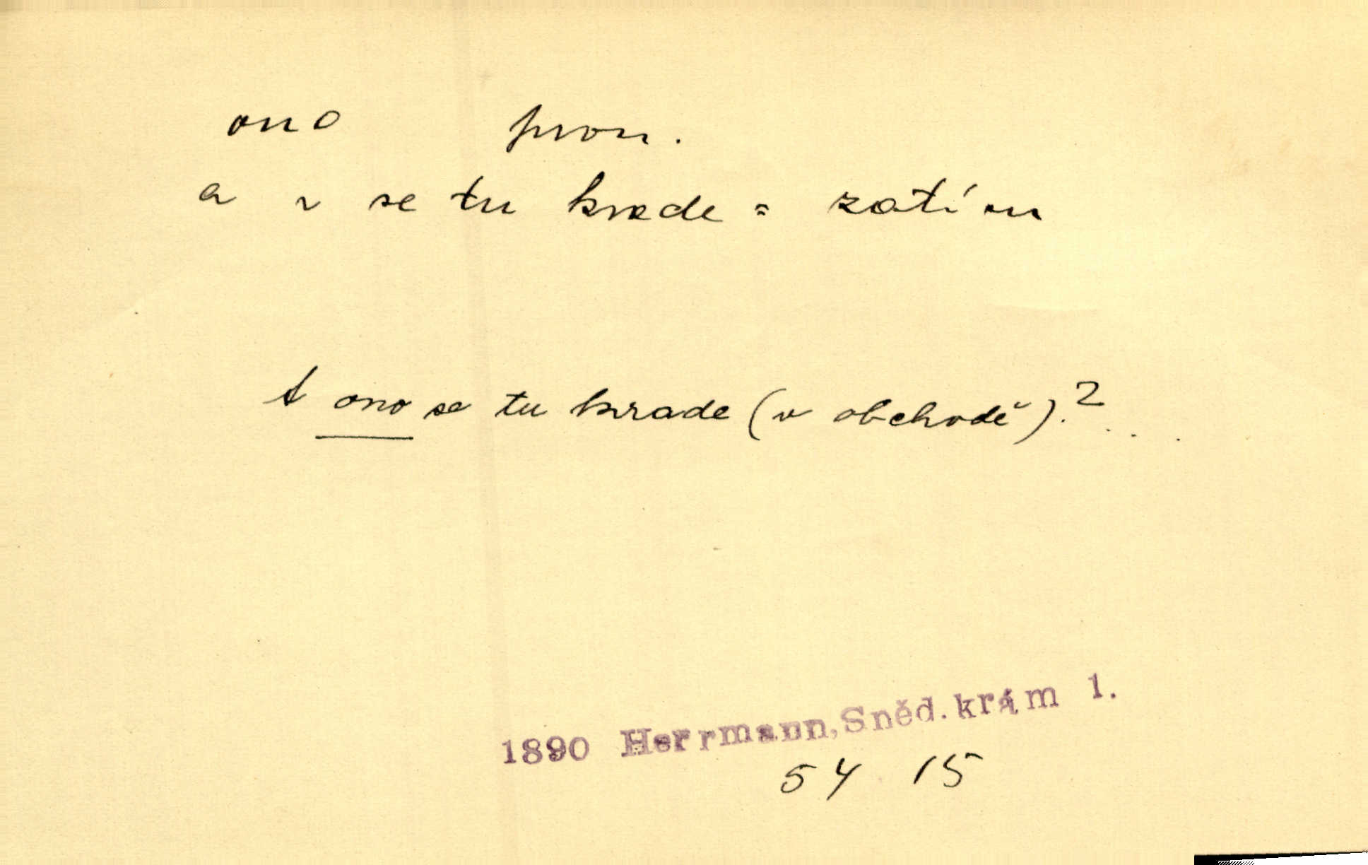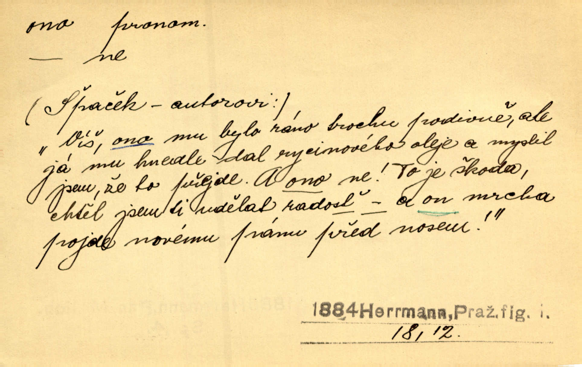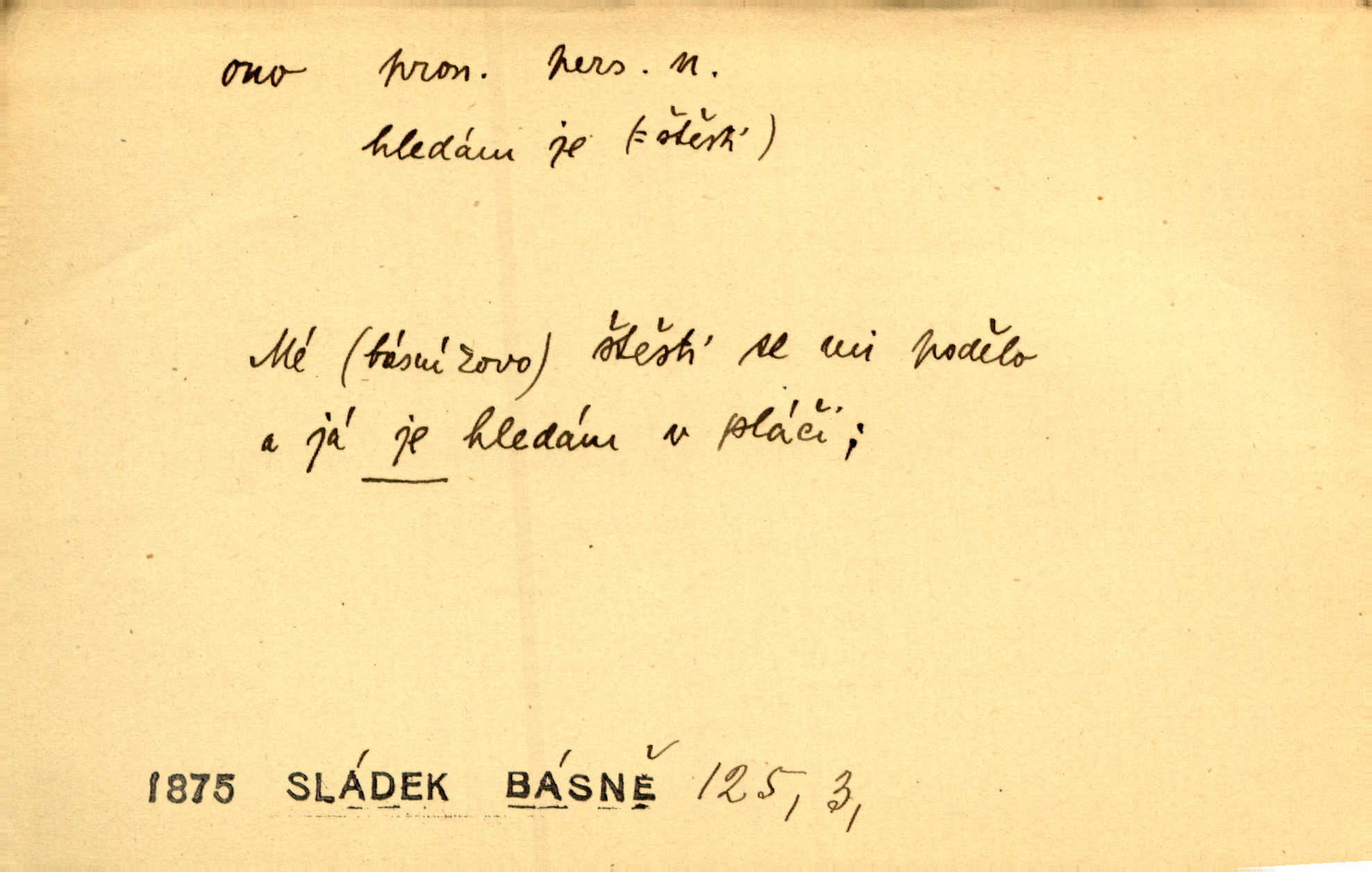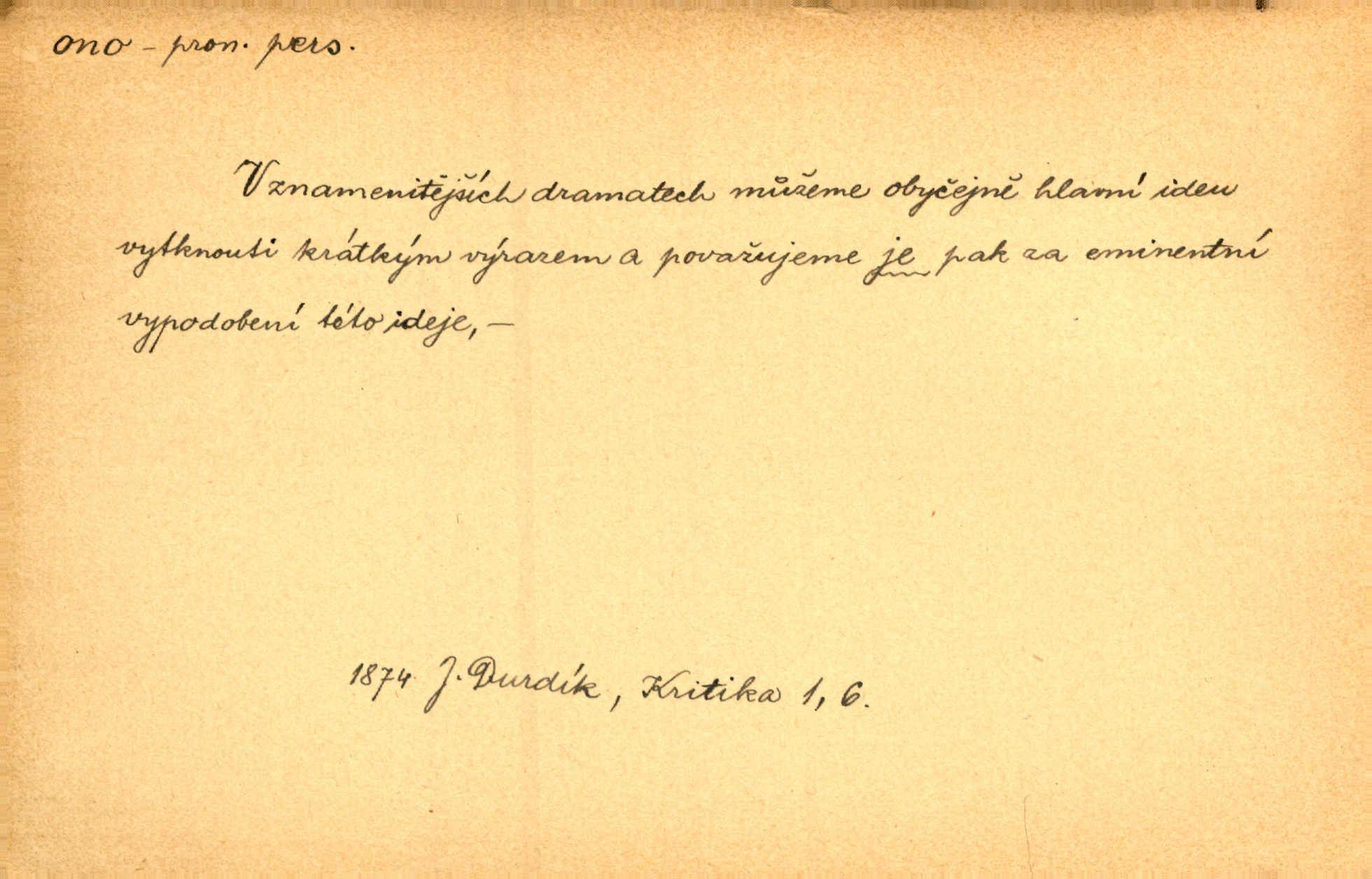 - onen, ona, ono (zast. onenno, onano, onono) zájm. ukaz., jež ukazuje na vzdálenější ze dvou osob n. věcí. Část lomenice pod tímto příčným prknem byla prostě obílena, ona však nad ním všecka omalována. Jir. Ve hrůze očekával jsem, které dvéře se nyní otevrou, zda veliké, vedoucí bezpochyby do nádvoří, aneb ony menší, patrně ke schodům služebnictva. Čap. Ch. Onano zoufale nešťastná [láska Vondrejcova] nebyla k smrti, kdežto tahle [láska Annina]‚ jež nezůstavila žádného přání nesplněného, Bůhví že ano! Čap. Ch. Měl chvíle, kdy se cítil už více na onom než na tomto světě mrtev. Zey. Odešel na onen svět zemřel. Jir. D ukazuje na druhou ze dvou osob n. věcí ve výrazech vyjadřujících střídání ve spojení ten-onen, tento-onen jeden-druhý. Mnozí křesťané tak se v chrámě chovají, jakoby chrám byl hospoda. Tato sem přichází, aby se ukázala; onen, aby viděl. Puchm. [Paní] všímala si kde jaké maličkosti, časem ukazujíc synovi rukou hned v tu hned v onu stranu. Herb. City jeho houpaly se posud jako na váze brzy v tu, brzy v onu stranu. Šmil. Truhlice byla brzo u toho, brzo u onoho rychtáře v úkrytu. Jir. Mlčky postál s otcem, prohlížel to i ono, poklepal sem tam hůlečkou. Herb. Mluvili o tom i onom o všeličems. Šmil. D ten onen sem tam někdo, leckdo. Ten onen, ta ona na ně i pokřikli. Jir. Načíná [chemik] laboratorní pokusy s tím oním předpokládaným sloučením hmot, ale pokusy se nedaří. K. Čap. Každou chvíli se trefovalo, že mne ten onen potřeboval. Kos. D ukazuje na osobu n. věc, o které byla již řeč, která je známá n. časově vzdálená. Bude hůře osamocen než onino dva staří lidé, kteří vůbec dětí neměli. Klost. Portýr se uklonil s onou úsměvnou pokorou, na kterou se za zpropitné služebnictvo hostinců vždy sníží. Ner. Kolikrát vykonalo již ono staré kyvadlo svou jednotvárnou obchůzku. Čech. Vás posavad věrné potěšuji potěšením míru, kterýmž potěšil nás převěrný náš Pán oněmino svatými slovy svými. Jir. Kdes oné tmavé noci byl, a co za řízení tě volalo z domu? Klicp. Já, maje předstoupiti před soudnou stolici onoho nad hvězdami, nechci obtížiti duši svou podílem na krvi prolité. J. z Hv. Za onoho času byl hostinec „u zeleného stromu“ v Praze vyhlášený v tehdejší době. Sab. Za onoho času umíval jsem dudáka a černého Petra, ale teď bych snad ani to nesvedl kdysi dávno. Rais. Kořalky líznete leda za onoho času zřídka kdy. Rais. Rozmluva mezi Rojerem a Evelinou je jako váhavé, bezcílné tahání, styl z roku onoho. Vodák. Lid. Hezky jsme se s panímámou v onen týden smluvily v kostele minulý týden. Rais. D Zast. na slovo vzatý, slavný, proslulý. Konstituce jest jen provedení ve státu známé oné zásady vší spravedlnosti: čeho sobě nechceš, jinému nečiň. Pal. Povstal Nestor libomluvný, onen hlasitý z Pylonu řečník. J. Nej.