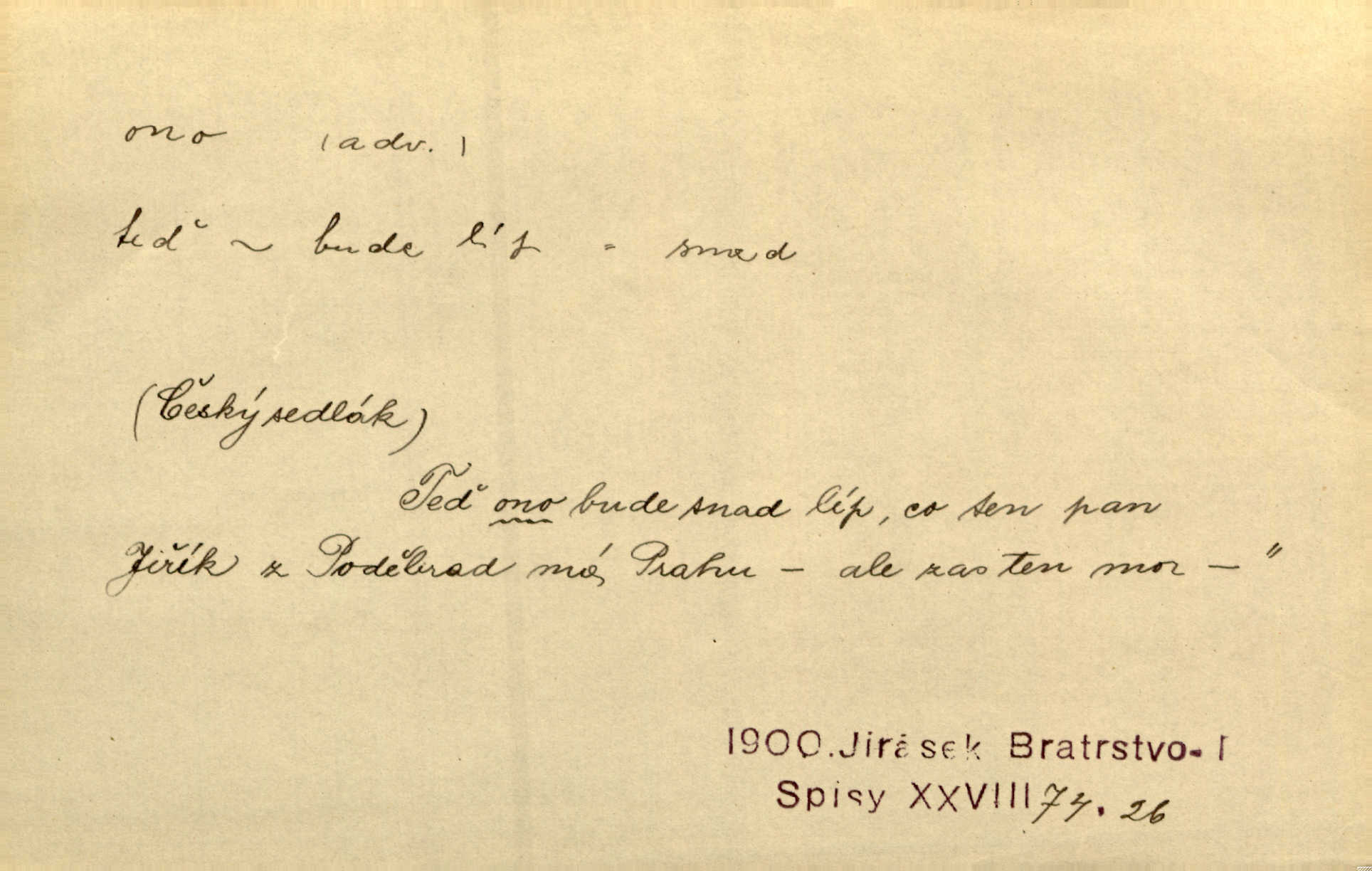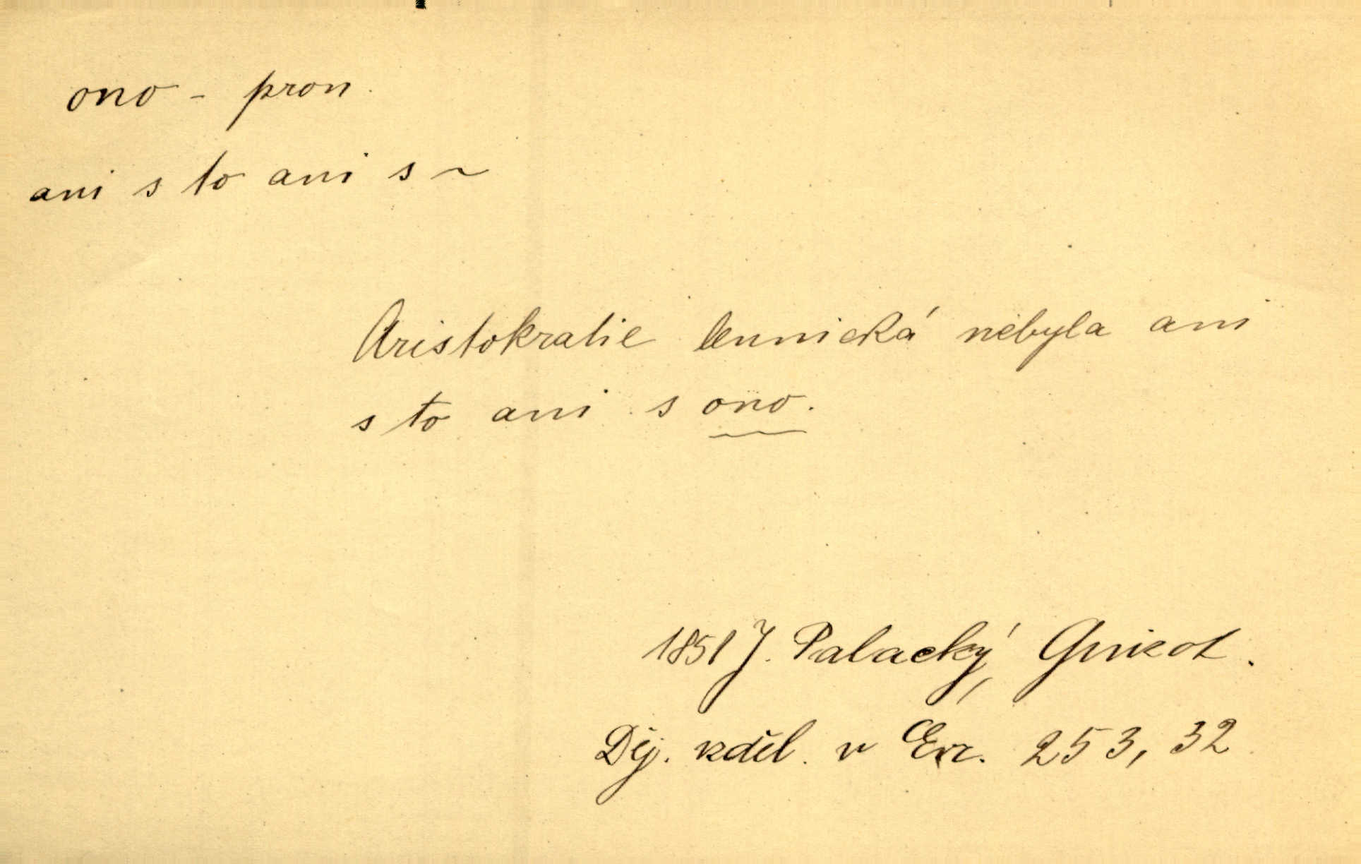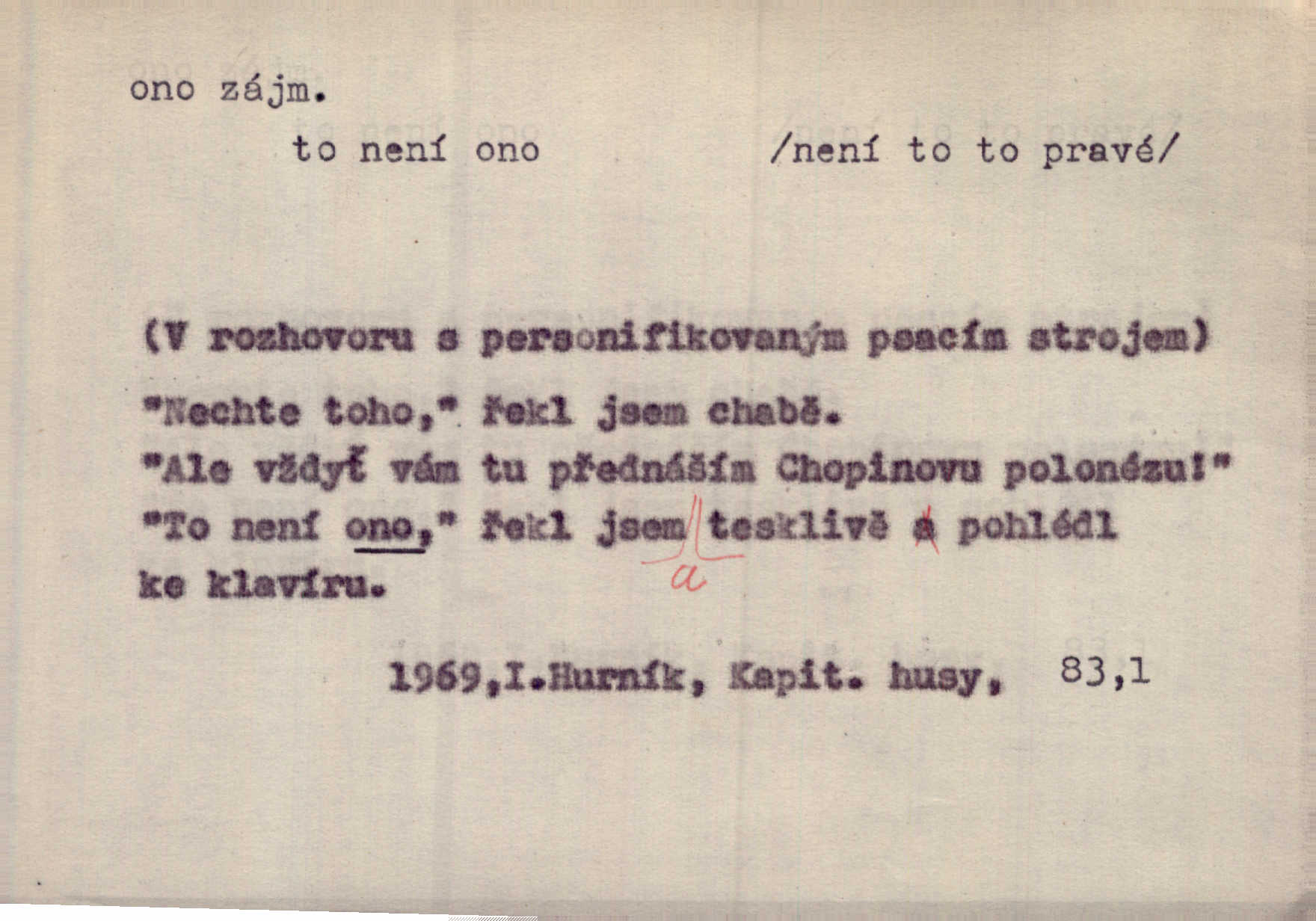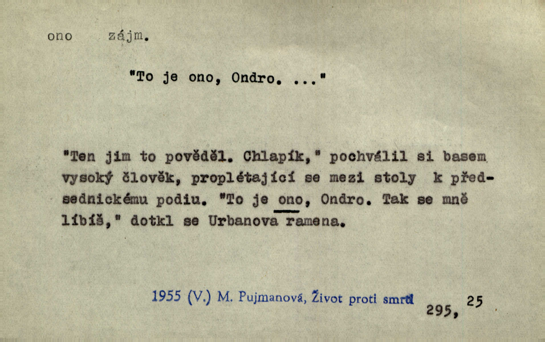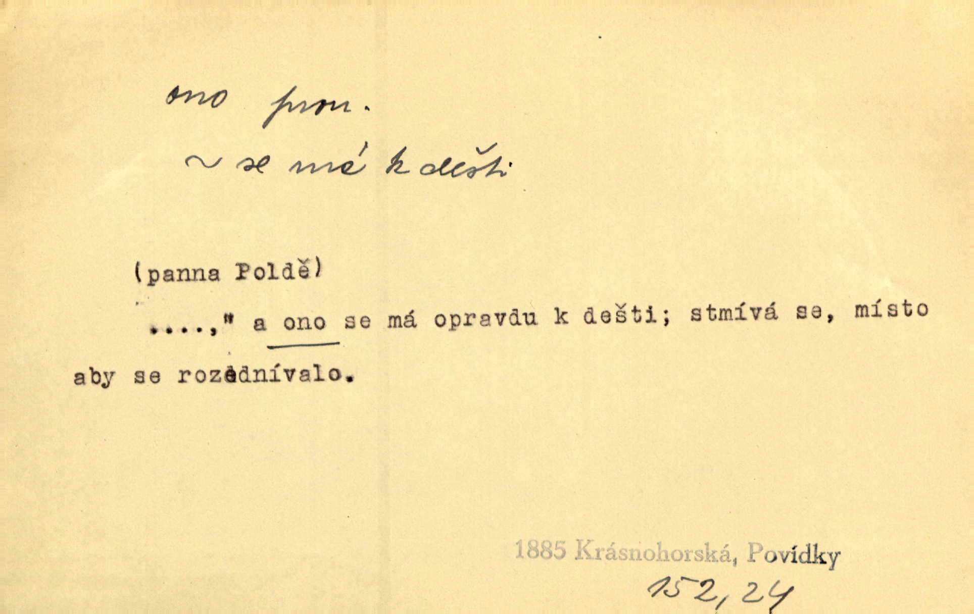 - onen, ona, ono (zast. onenno, onano, onono) zájm. ukaz., jež ukazuje na vzdálenější ze dvou osob n. věcí. Část lomenice pod tímto příčným prknem byla prostě obílena, ona však nad ním všecka omalována. Jir. Ve hrůze očekával jsem, které dvéře se nyní otevrou, zda veliké, vedoucí bezpochyby do nádvoří, aneb ony menší, patrně ke schodům služebnictva. Čap. Ch. Onano zoufale nešťastná [láska Vondrejcova] nebyla k smrti, kdežto tahle [láska Annina]‚ jež nezůstavila žádného přání nesplněného, Bůhví že ano! Čap. Ch. Měl chvíle, kdy se cítil už více na onom než na tomto světě mrtev. Zey. Odešel na onen svět zemřel. Jir. D ukazuje na druhou ze dvou osob n. věcí ve výrazech vyjadřujících střídání ve spojení ten-onen, tento-onen jeden-druhý. Mnozí křesťané tak se v chrámě chovají, jakoby chrám byl hospoda. Tato sem přichází, aby se ukázala; onen, aby viděl. Puchm. [Paní] všímala si kde jaké maličkosti, časem ukazujíc synovi rukou hned v tu hned v onu stranu. Herb. City jeho houpaly se posud jako na váze brzy v tu, brzy v onu stranu. Šmil. Truhlice byla brzo u toho, brzo u onoho rychtáře v úkrytu. Jir. Mlčky postál s otcem, prohlížel to i ono, poklepal sem tam hůlečkou. Herb. Mluvili o tom i onom o všeličems. Šmil. D ten onen sem tam někdo, leckdo. Ten onen, ta ona na ně i pokřikli. Jir. Načíná [chemik] laboratorní pokusy s tím oním předpokládaným sloučením hmot, ale pokusy se nedaří. K. Čap. Každou chvíli se trefovalo, že mne ten onen potřeboval. Kos. D ukazuje na osobu n. věc, o které byla již řeč, která je známá n. časově vzdálená. Bude hůře osamocen než onino dva staří lidé, kteří vůbec dětí neměli. Klost. Portýr se uklonil s onou úsměvnou pokorou, na kterou se za zpropitné služebnictvo hostinců vždy sníží. Ner. Kolikrát vykonalo již ono staré kyvadlo svou jednotvárnou obchůzku. Čech. Vás posavad věrné potěšuji potěšením míru, kterýmž potěšil nás převěrný náš Pán oněmino svatými slovy svými. Jir. Kdes oné tmavé noci byl, a co za řízení tě volalo z domu? Klicp. Já, maje předstoupiti před soudnou stolici onoho nad hvězdami, nechci obtížiti duši svou podílem na krvi prolité. J. z Hv. Za onoho času byl hostinec „u zeleného stromu“ v Praze vyhlášený v tehdejší době. Sab. Za onoho času umíval jsem dudáka a černého Petra, ale teď bych snad ani to nesvedl kdysi dávno. Rais. Kořalky líznete leda za onoho času zřídka kdy. Rais. Rozmluva mezi Rojerem a Evelinou je jako váhavé, bezcílné tahání, styl z roku onoho. Vodák. Lid. Hezky jsme se s panímámou v onen týden smluvily v kostele minulý týden. Rais. D Zast. na slovo vzatý, slavný, proslulý. Konstituce jest jen provedení ve státu známé oné zásady vší spravedlnosti: čeho sobě nechceš, jinému nečiň. Pal. Povstal Nestor libomluvný, onen hlasitý z Pylonu řečník. J. Nej.