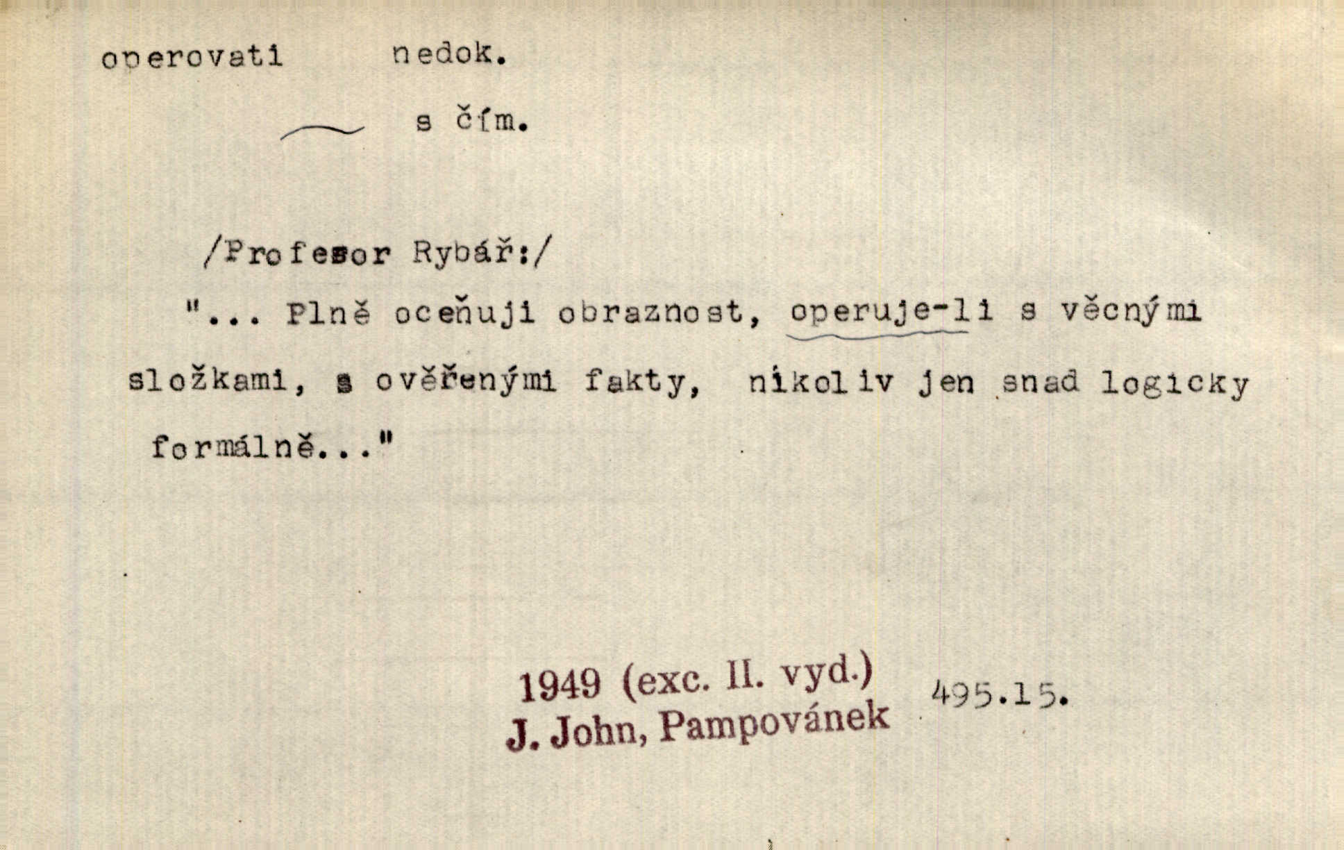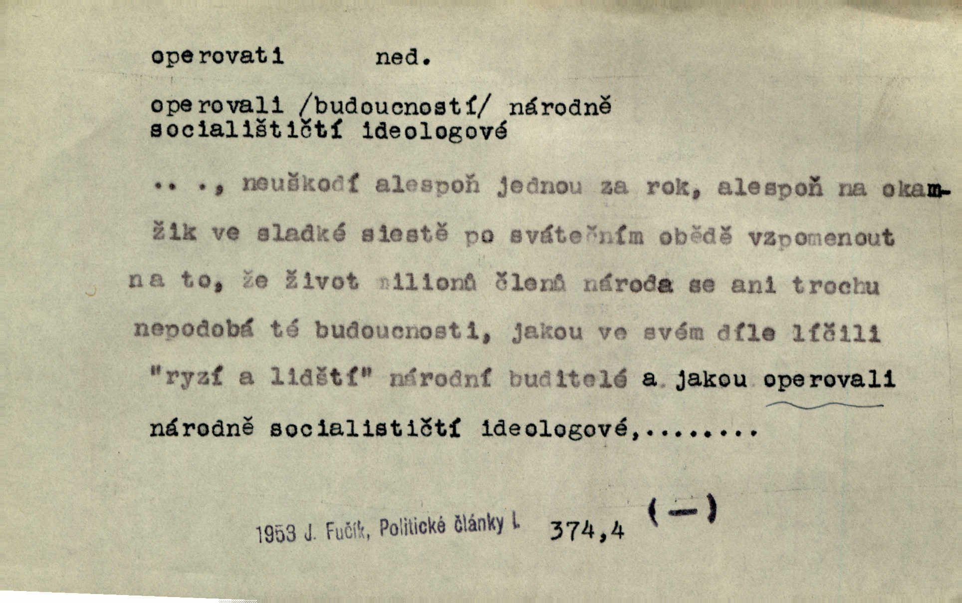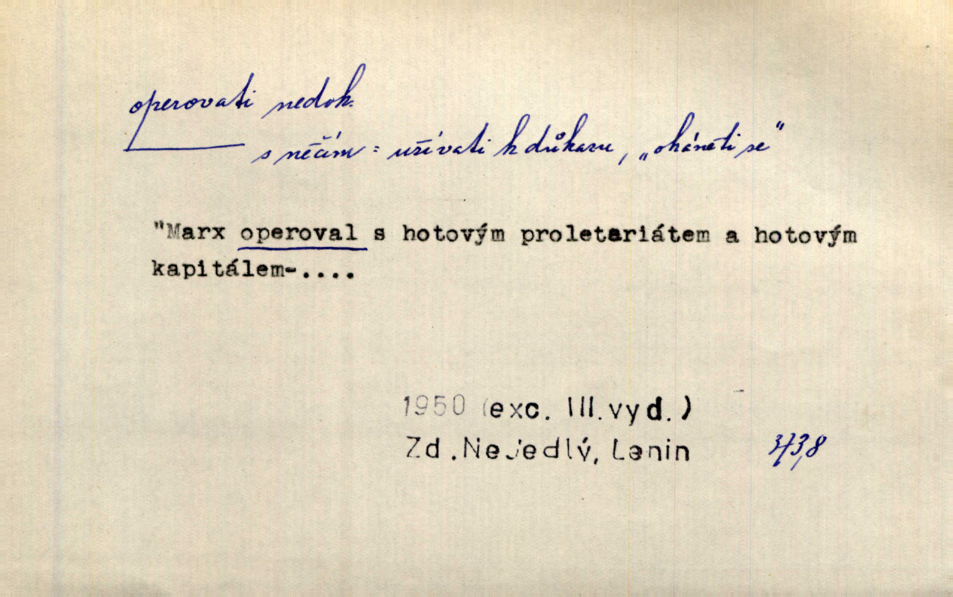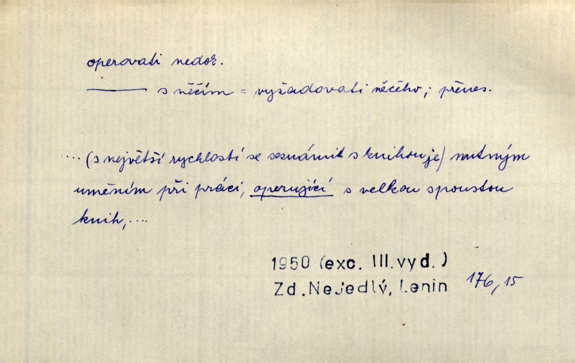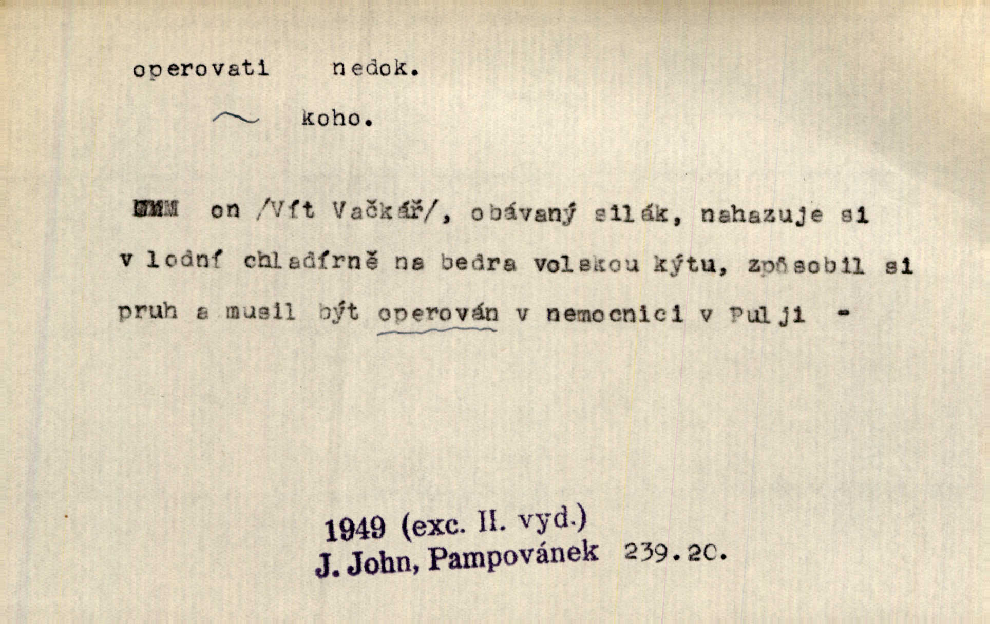 - operovati ned. (čím, s čím) soustavně pracovati s něčím, používati něčeho, působiti něčím. Jestliže v diskusi byla formulována námitka, že naše politické stranictví je už de fakto stavovské, pak se zde operovalo zase jen kulatým a nepřesným slovem. Přít. Zná [básník] chladně operovat kouzlem slohové zkratky. Sez. S tímto devaterem uměn operuje valná většina esthetiků idealistických. Hostin. Na novém jevišti operováno nyní taky „světelnými efekty“. Herrm. Skoro všechny ty projevy operují několika hesly. Z. Nej. Schönberg zná vedle konsonantních akordů z kvint a tercií také souzvuky zbudované z kvart na sebe navršených, s nimiž operuje zcela zřetelně jako s konsonantními. Smet. Četli jsme statistiku operující čísly podezřele ilusorními. Přít. Operuje se [u marxistů] politicky a massami co možná velkými. Mas. D prováděti operace (obchodní, vojenské a p.). Snad tedy vyhraju v kartách. Nebo budu operovati na burse. Kam. [Marradas] se spojil s hlavním vojskem, aby se brzy zase od něho oddělil a v jižních Čechách operoval. Mik. Fin. nakupovati. D (koho) lék. prováděti (na někom) operaci. Přen. Adujev operuje jej [synovce] ze všech těchto zbytečností, které podle jeho mínění znemožňují úředníku, aby to někam ve světě přivedl zbavuje. Šal.