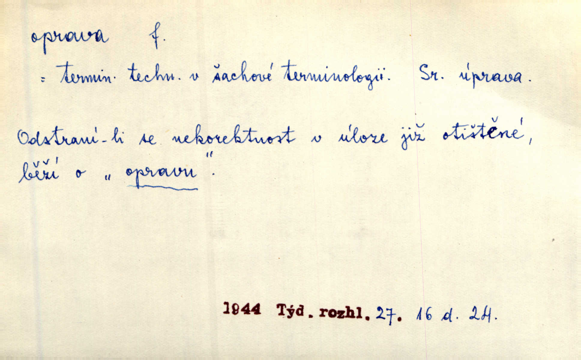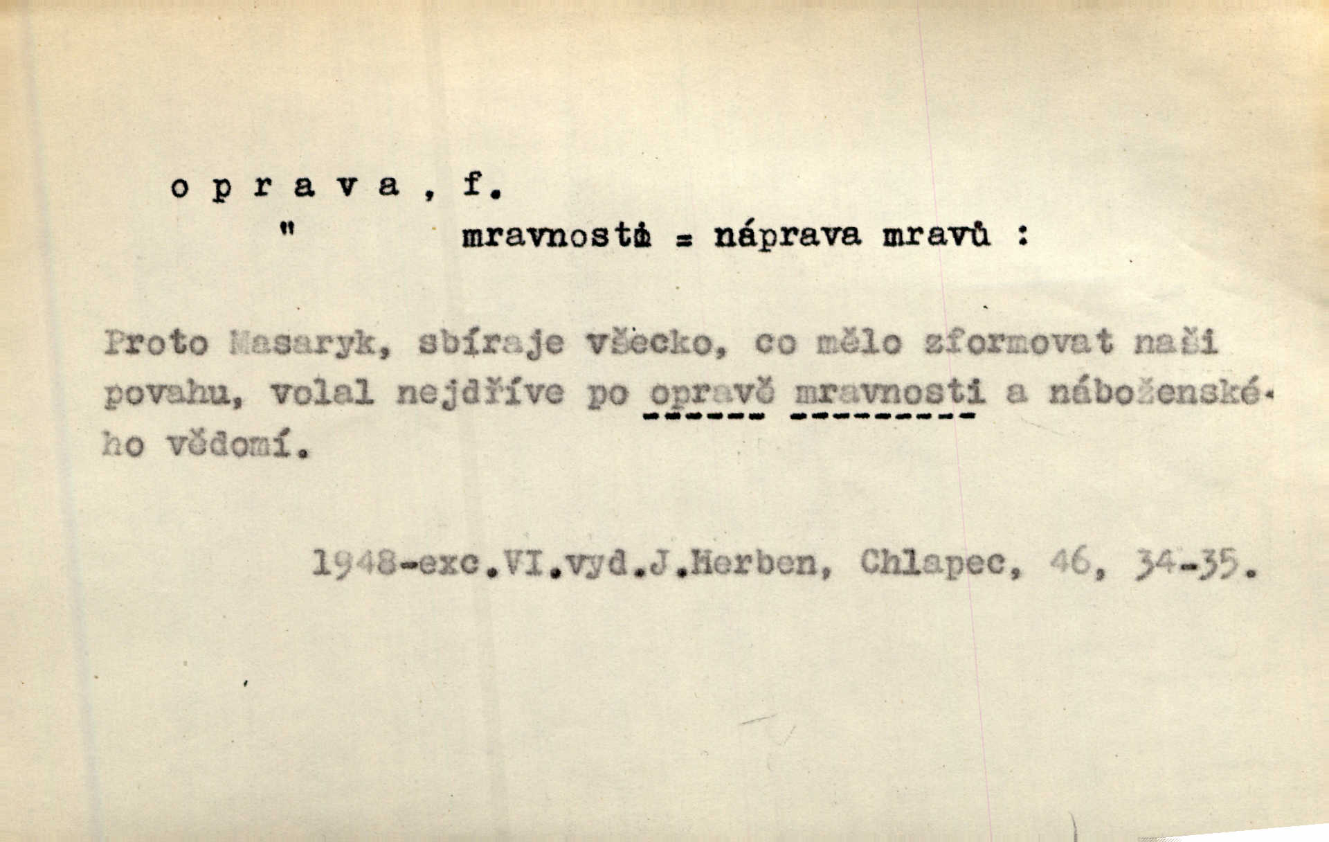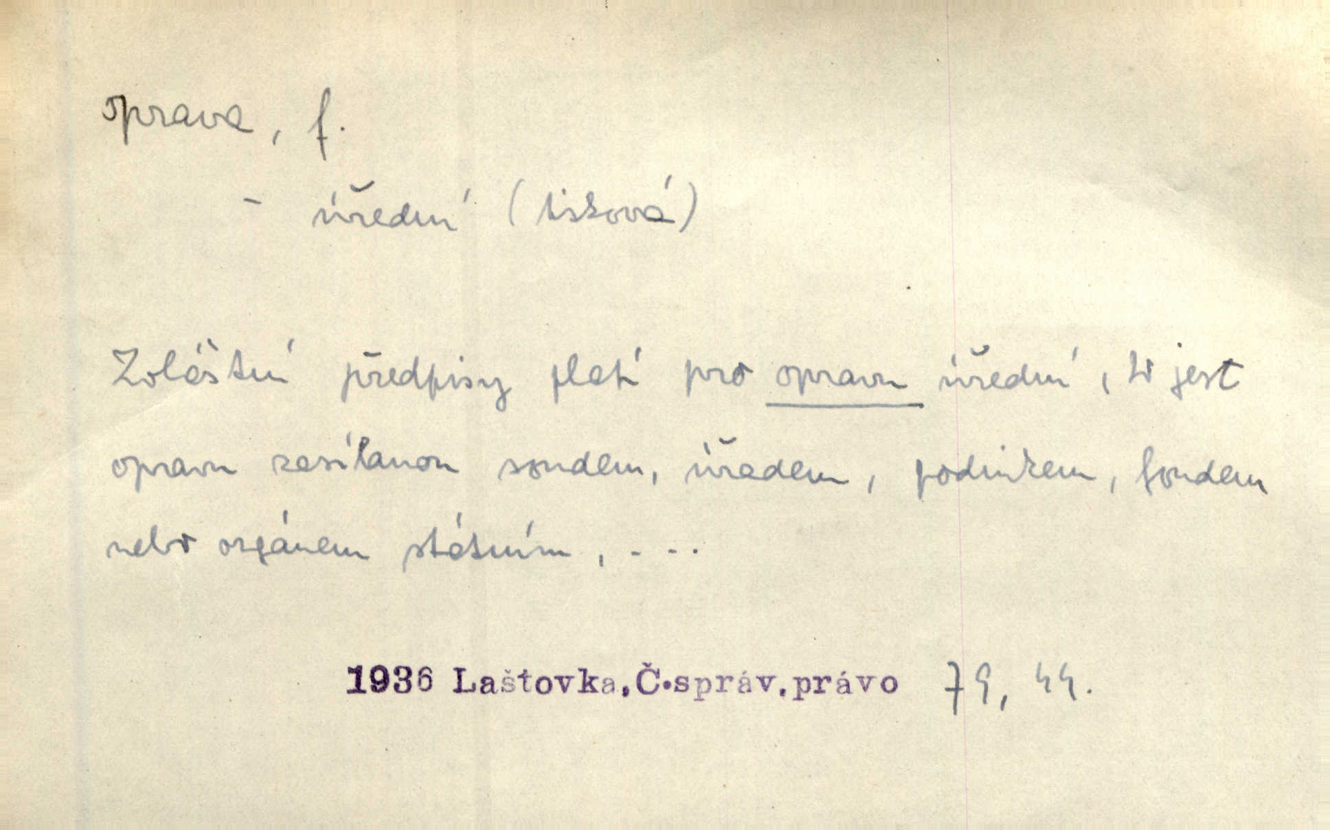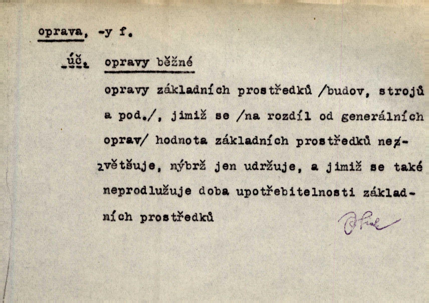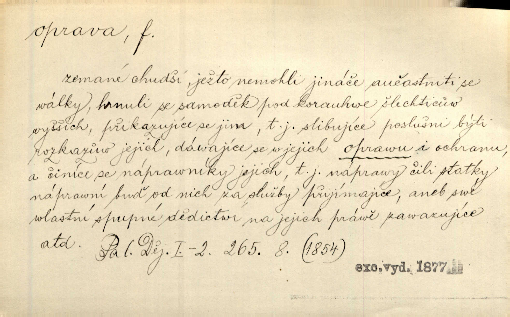 - oprava, -y f. napravování, napravení, odstraňování, odstranění chyb, vad něčeho. Vešel [do tiskárny] hoch s opravami „Věčného světla“, a položiv je na nejbližší stůl, odešel. Čap. Ch. Škol. opravná zkouška po prázdninách, reparát. Krátce před r. 1860 propadli jsme [s přítelem] ve škole eklatantně, že na tak zvanou „opravu“ po prázdninách nebylo možno ani pomysliti. Arb. Oprava úloh. Voj. (při střelbě z děl) povel k úpravě dřívějších palebných prvků; oprava směru letounu úhel, o který je nutno kurs letounu opravit vzhledem k větru, aby se pohyboval v zamýšlené dráze. Práv. tisková oprava uveřejnění správného znění nějaké skutečnosti, jejímž předchozím uveřejněním se cítil někdo dotčen. Mat. úprava výsledku při počítání s čísly neúplnými, aby byl co možná přesný. D uvedení něčeho poškozeného do bývalého stavu, obnovení. [Dům] je starý a oprava by více stála, než co by za něj dali. Jir. Se zednickým mistrem vyjednal pořádnou opravu [domu]. Střechu pobili nově, všude nakladli nových podlah. Rais. [Kostel] pozdějšími opravami byl hrubě poškozen. Jir. D změna, úprava mající něco zlepšiti, zdokonaliti. Nutnost opravy [své hry] mohl uznati sám při prvním provozování. Ner. Rysy toho náměstíčka se urovnaly rozličnými opravami. Čech. Tetička Urbanová měla svátečné černé šaty ze starého těžkého atlasu, které již po dvacet let různými opravami přizpůsobovala „duchu času“. Herrm. Bylo to právě na statcích Ostrovínských, kde se nejprvé mnohé opravy i nové zvyky zaváděti počaly. I. Klicp. D náprava, reforma (veřejných zřízení). Milič první jal se směle hlásati, jak je nutno opravy v církvi. Jir. Jednu chvíli existoval plán předložit moderní pronikavou volební opravu. Mach. D Hist. právo ochranné a obranné nad kláštery vznesené na zemské pány, zahrnující v sobě i pravomoc nad poddanými.