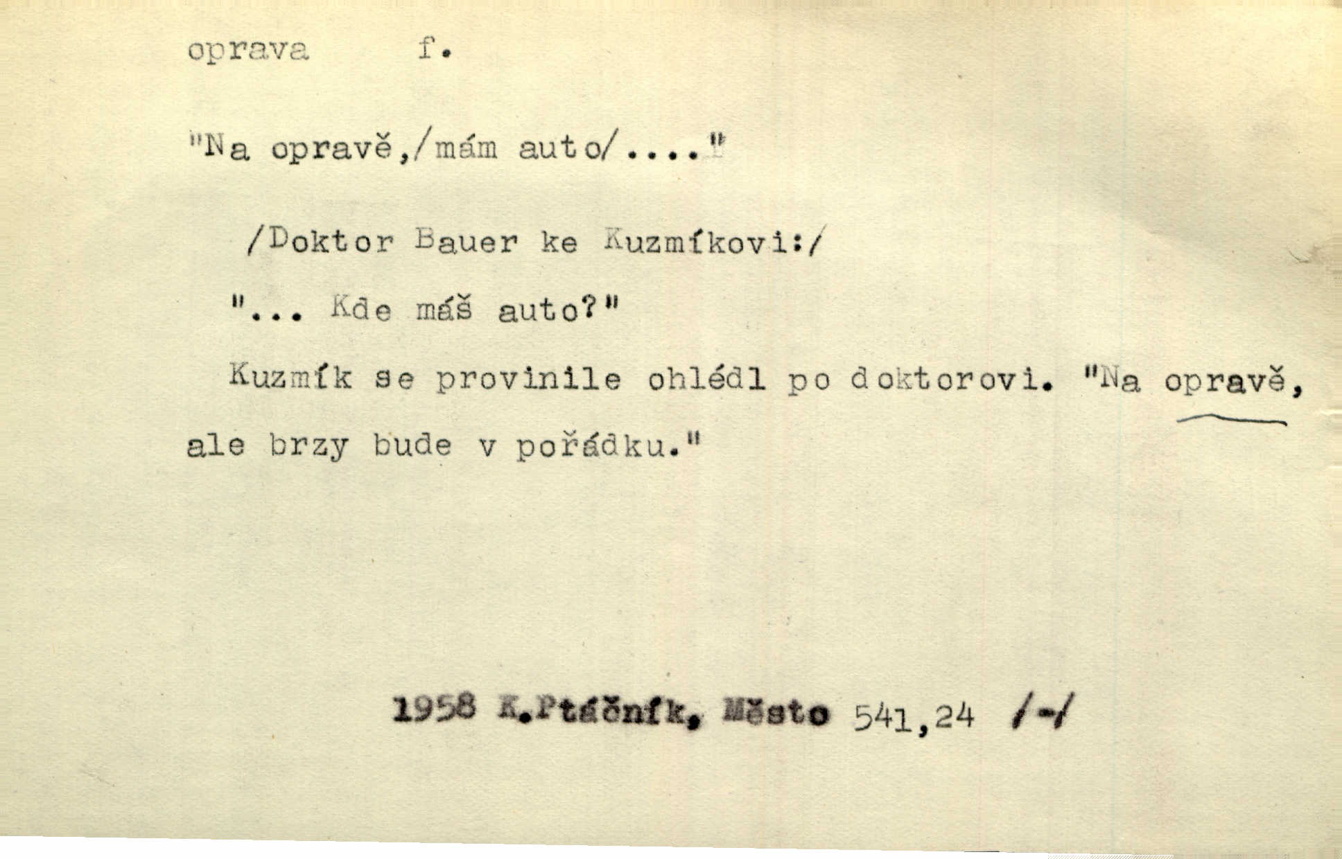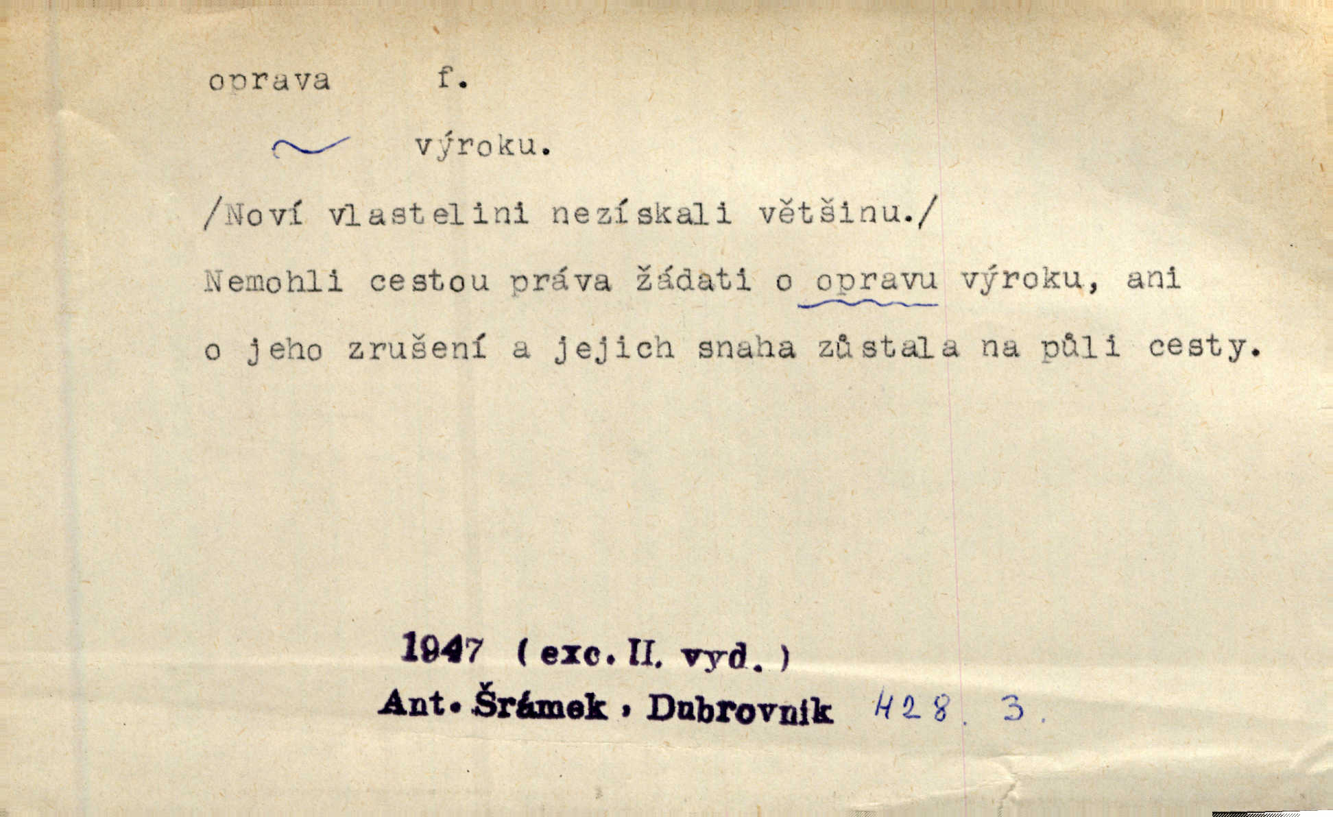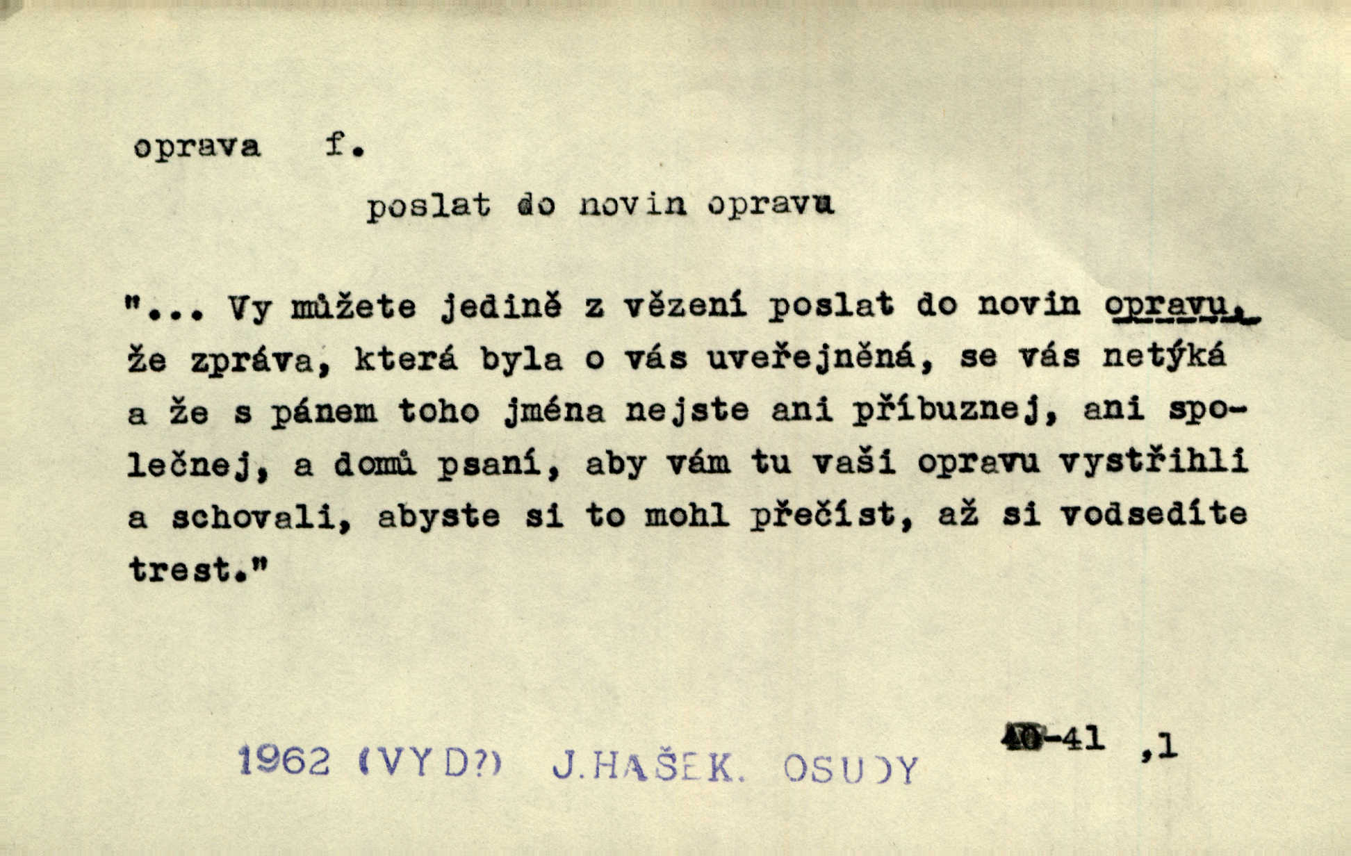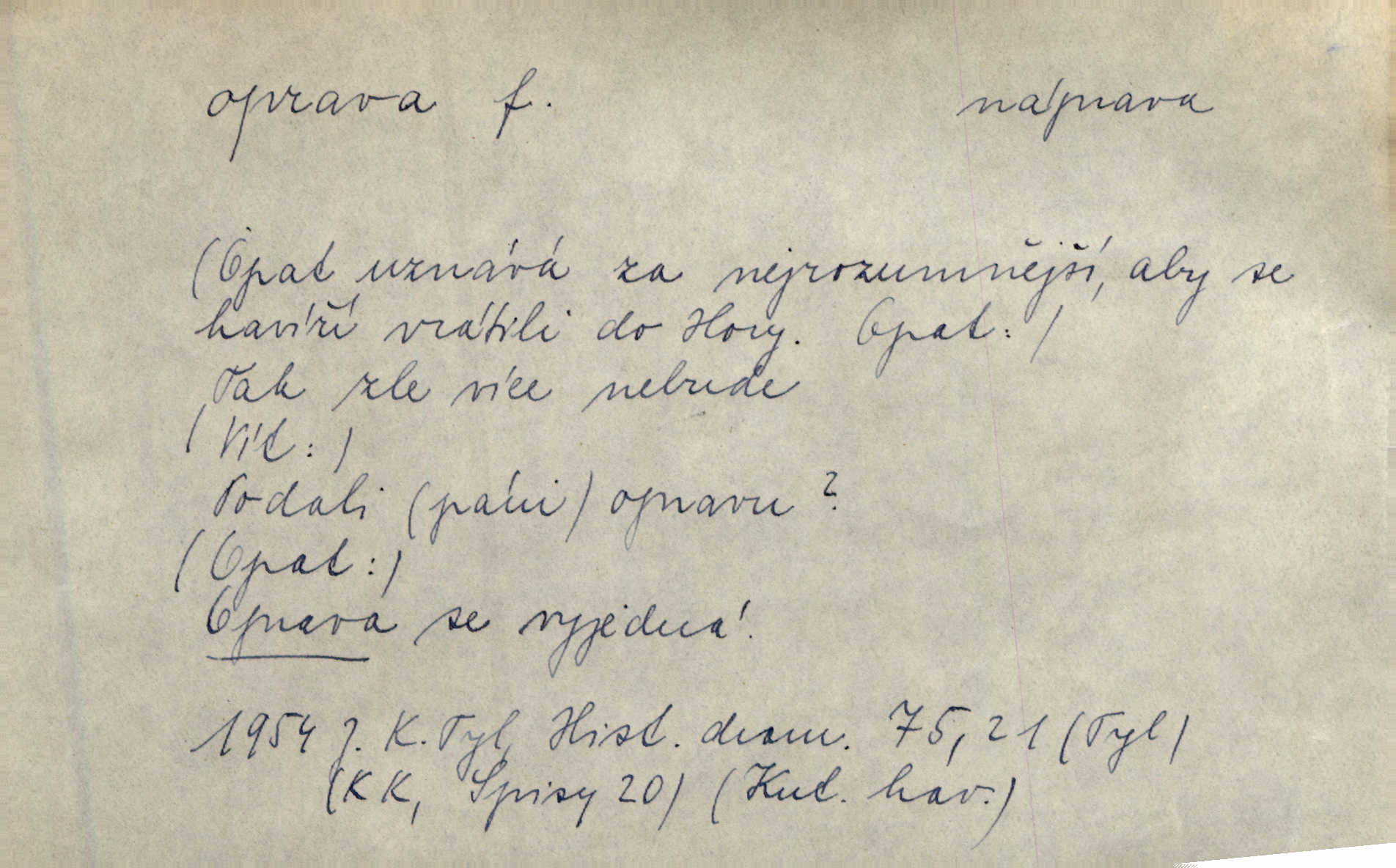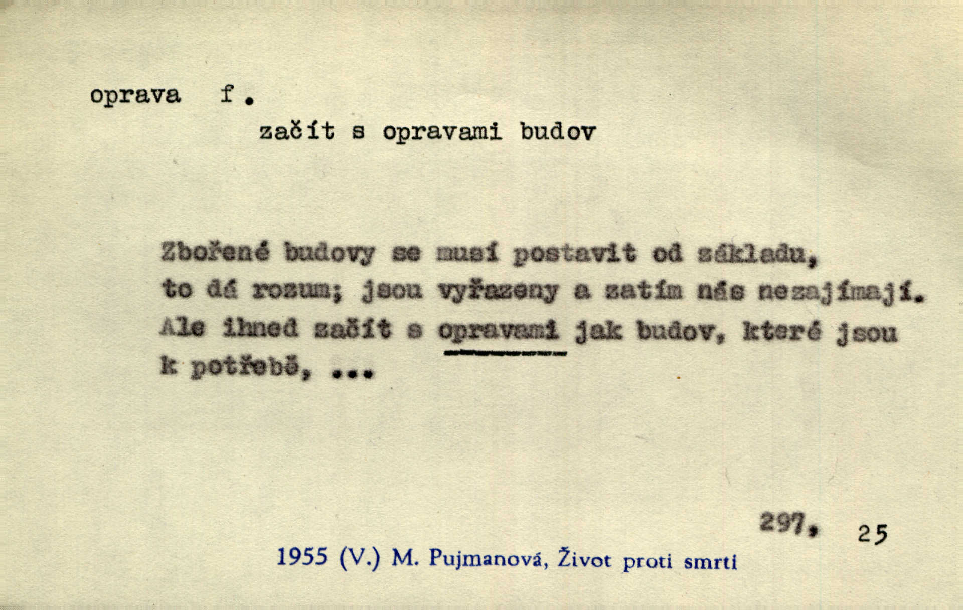 - oprava, -y f. napravování, napravení, odstraňování, odstranění chyb, vad něčeho. Vešel [do tiskárny] hoch s opravami „Věčného světla“, a položiv je na nejbližší stůl, odešel. Čap. Ch. Škol. opravná zkouška po prázdninách, reparát. Krátce před r. 1860 propadli jsme [s přítelem] ve škole eklatantně, že na tak zvanou „opravu“ po prázdninách nebylo možno ani pomysliti. Arb. Oprava úloh. Voj. (při střelbě z děl) povel k úpravě dřívějších palebných prvků; oprava směru letounu úhel, o který je nutno kurs letounu opravit vzhledem k větru, aby se pohyboval v zamýšlené dráze. Práv. tisková oprava uveřejnění správného znění nějaké skutečnosti, jejímž předchozím uveřejněním se cítil někdo dotčen. Mat. úprava výsledku při počítání s čísly neúplnými, aby byl co možná přesný. D uvedení něčeho poškozeného do bývalého stavu, obnovení. [Dům] je starý a oprava by více stála, než co by za něj dali. Jir. Se zednickým mistrem vyjednal pořádnou opravu [domu]. Střechu pobili nově, všude nakladli nových podlah. Rais. [Kostel] pozdějšími opravami byl hrubě poškozen. Jir. D změna, úprava mající něco zlepšiti, zdokonaliti. Nutnost opravy [své hry] mohl uznati sám při prvním provozování. Ner. Rysy toho náměstíčka se urovnaly rozličnými opravami. Čech. Tetička Urbanová měla svátečné černé šaty ze starého těžkého atlasu, které již po dvacet let různými opravami přizpůsobovala „duchu času“. Herrm. Bylo to právě na statcích Ostrovínských, kde se nejprvé mnohé opravy i nové zvyky zaváděti počaly. I. Klicp. D náprava, reforma (veřejných zřízení). Milič první jal se směle hlásati, jak je nutno opravy v církvi. Jir. Jednu chvíli existoval plán předložit moderní pronikavou volební opravu. Mach. D Hist. právo ochranné a obranné nad kláštery vznesené na zemské pány, zahrnující v sobě i pravomoc nad poddanými.
