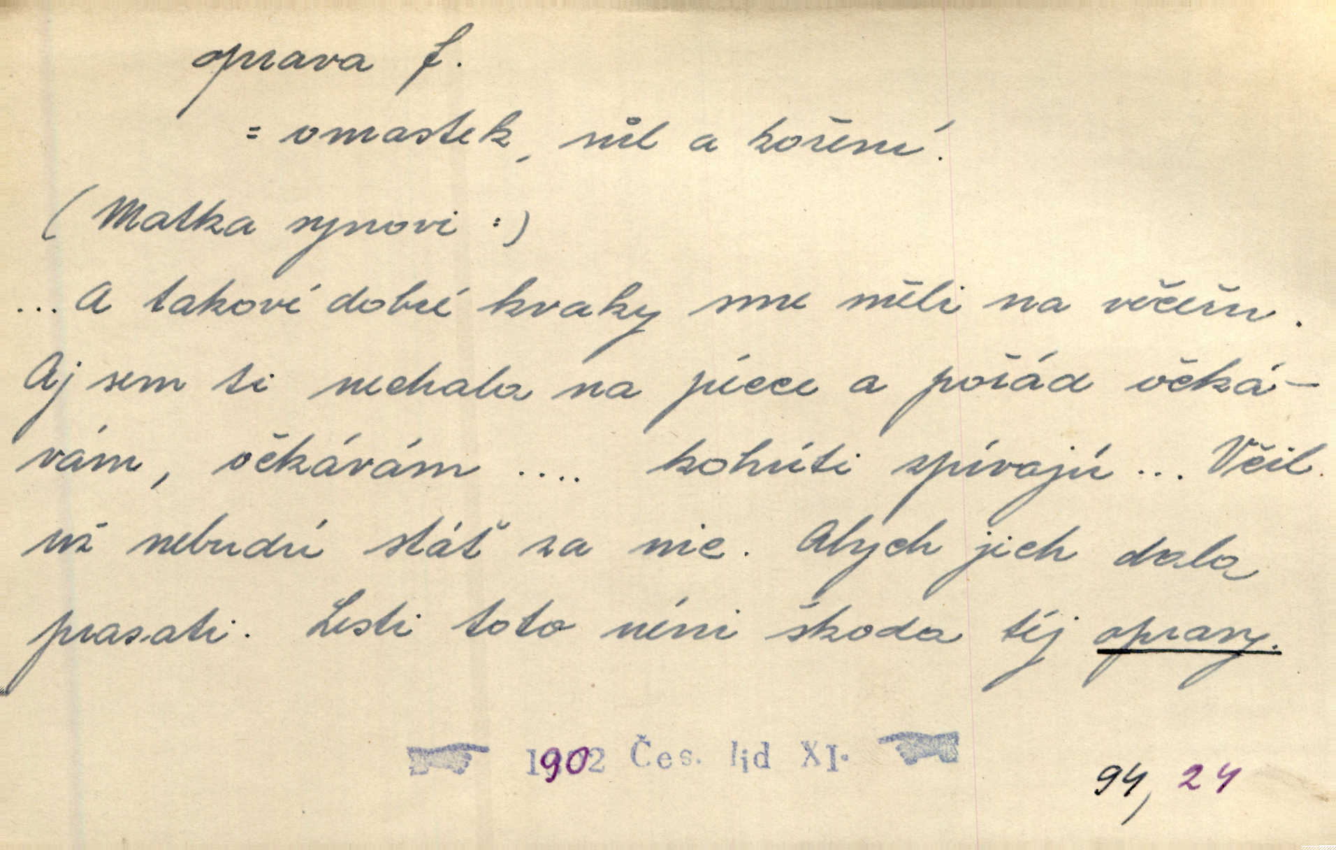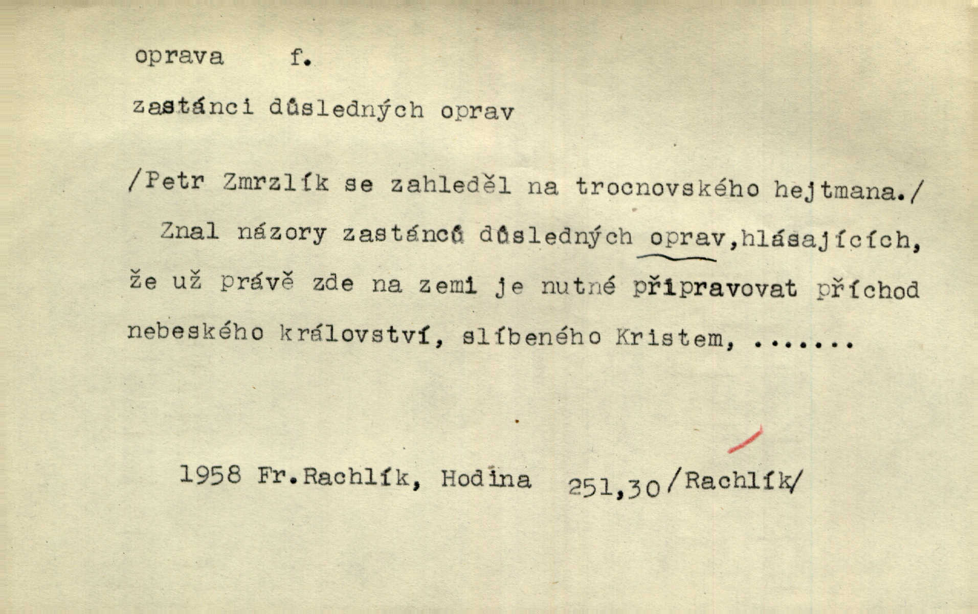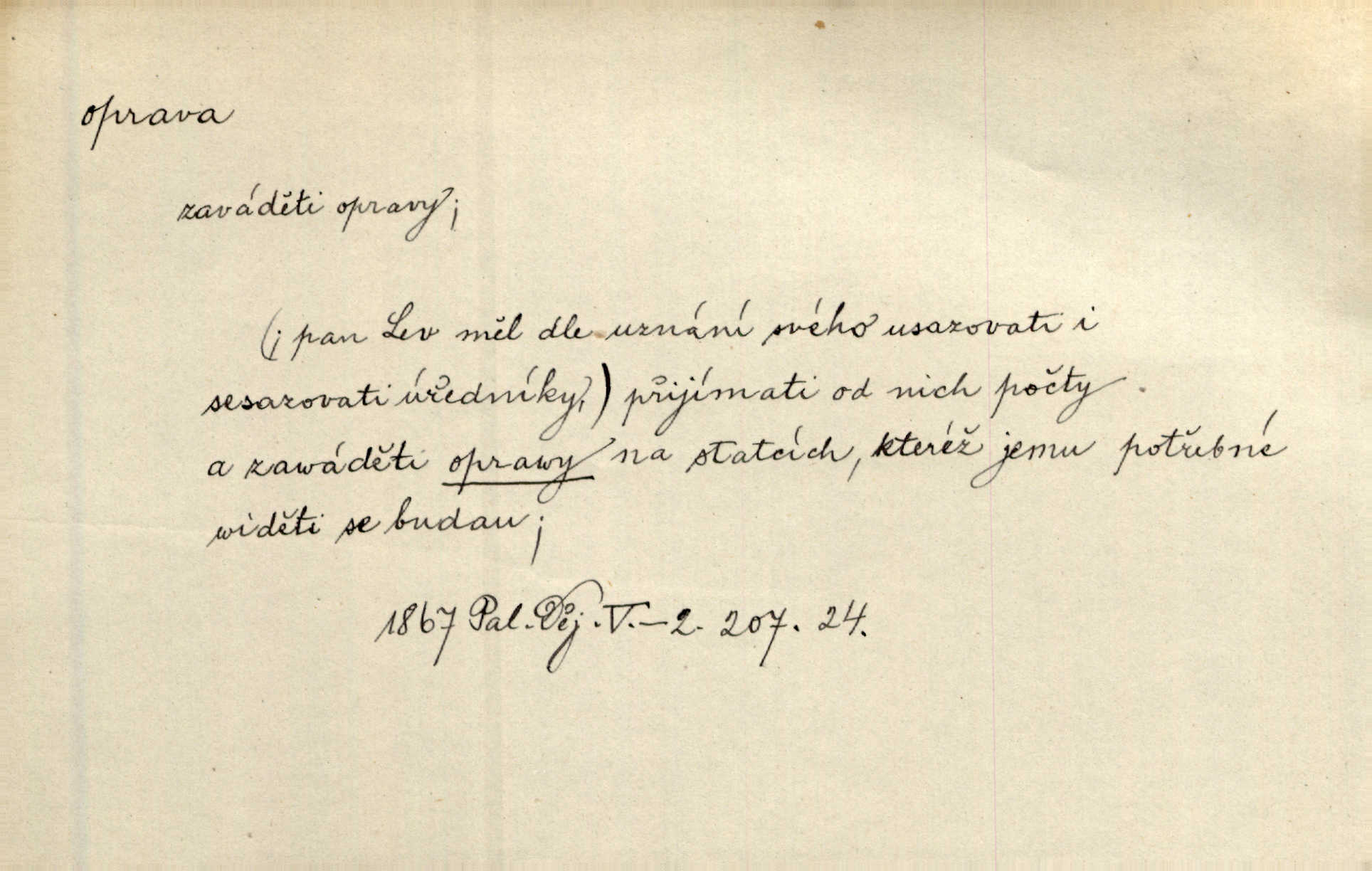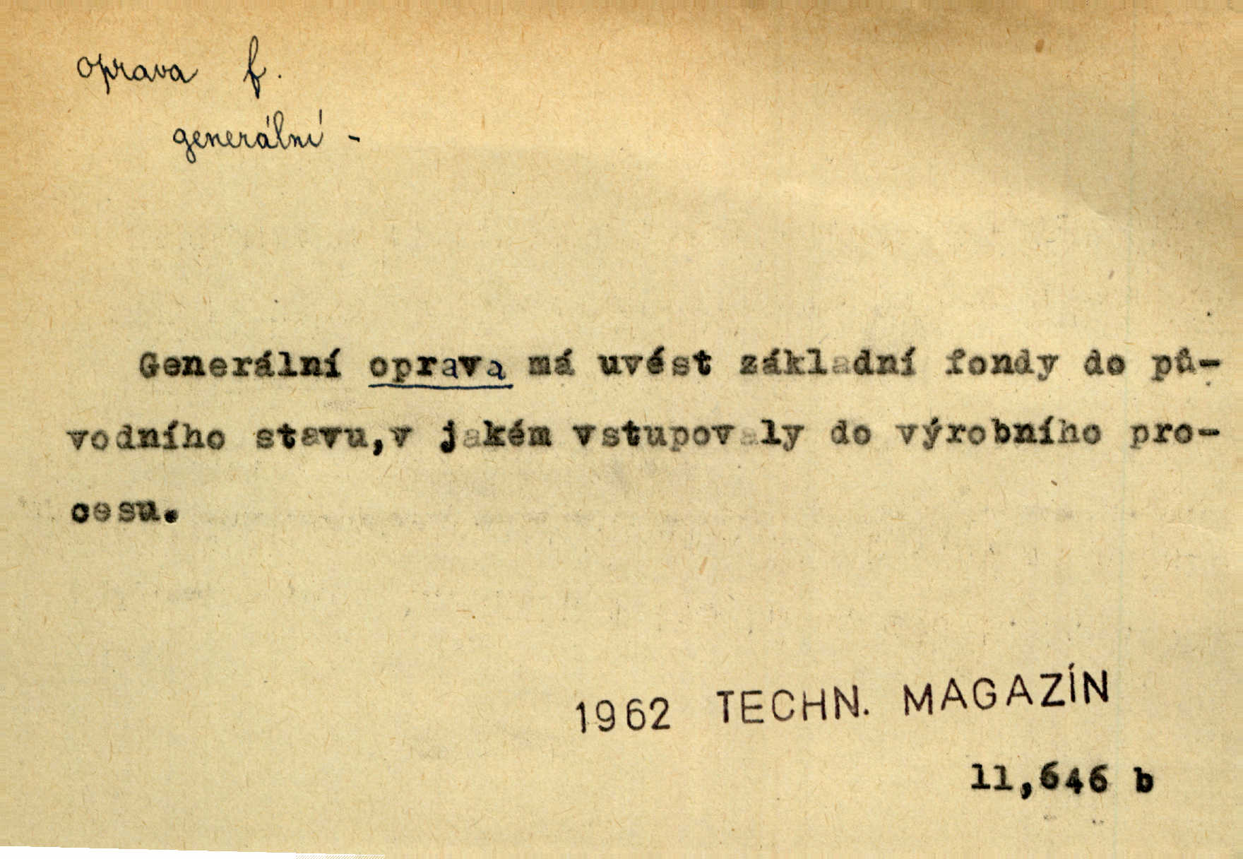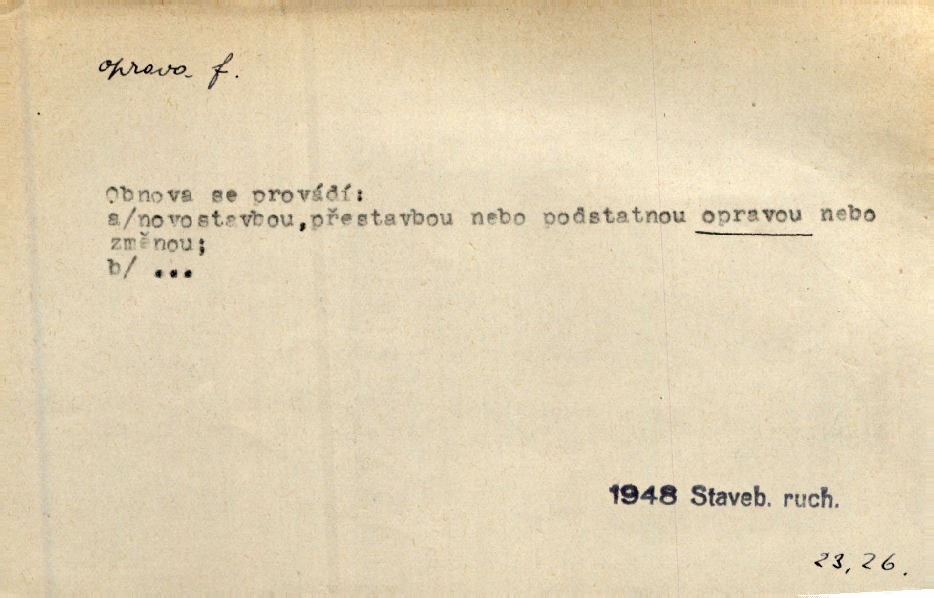 - oprava, -y f. napravování, napravení, odstraňování, odstranění chyb, vad něčeho. Vešel [do tiskárny] hoch s opravami „Věčného světla“, a položiv je na nejbližší stůl, odešel. Čap. Ch. Škol. opravná zkouška po prázdninách, reparát. Krátce před r. 1860 propadli jsme [s přítelem] ve škole eklatantně, že na tak zvanou „opravu“ po prázdninách nebylo možno ani pomysliti. Arb. Oprava úloh. Voj. (při střelbě z děl) povel k úpravě dřívějších palebných prvků; oprava směru letounu úhel, o který je nutno kurs letounu opravit vzhledem k větru, aby se pohyboval v zamýšlené dráze. Práv. tisková oprava uveřejnění správného znění nějaké skutečnosti, jejímž předchozím uveřejněním se cítil někdo dotčen. Mat. úprava výsledku při počítání s čísly neúplnými, aby byl co možná přesný. D uvedení něčeho poškozeného do bývalého stavu, obnovení. [Dům] je starý a oprava by více stála, než co by za něj dali. Jir. Se zednickým mistrem vyjednal pořádnou opravu [domu]. Střechu pobili nově, všude nakladli nových podlah. Rais. [Kostel] pozdějšími opravami byl hrubě poškozen. Jir. D změna, úprava mající něco zlepšiti, zdokonaliti. Nutnost opravy [své hry] mohl uznati sám při prvním provozování. Ner. Rysy toho náměstíčka se urovnaly rozličnými opravami. Čech. Tetička Urbanová měla svátečné černé šaty ze starého těžkého atlasu, které již po dvacet let různými opravami přizpůsobovala „duchu času“. Herrm. Bylo to právě na statcích Ostrovínských, kde se nejprvé mnohé opravy i nové zvyky zaváděti počaly. I. Klicp. D náprava, reforma (veřejných zřízení). Milič první jal se směle hlásati, jak je nutno opravy v církvi. Jir. Jednu chvíli existoval plán předložit moderní pronikavou volební opravu. Mach. D Hist. právo ochranné a obranné nad kláštery vznesené na zemské pány, zahrnující v sobě i pravomoc nad poddanými.