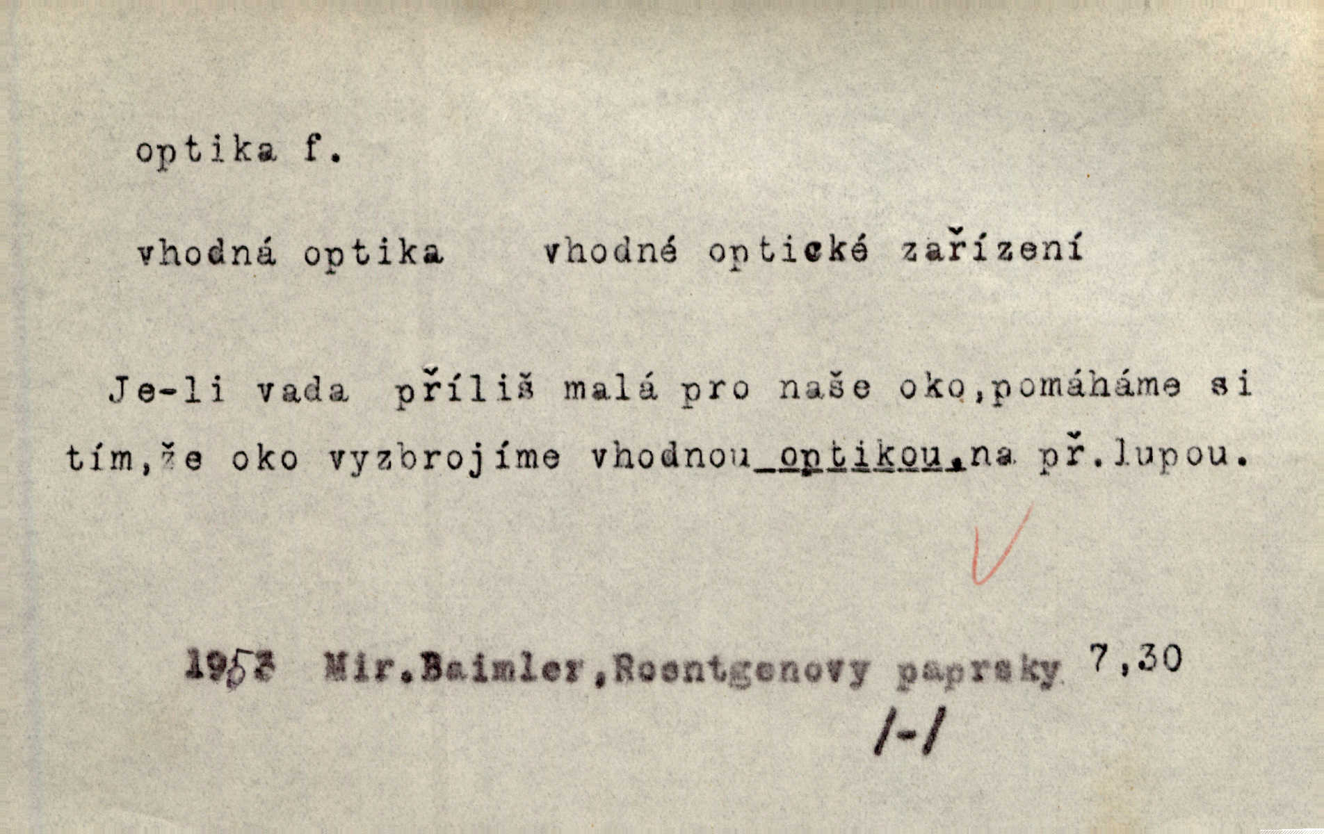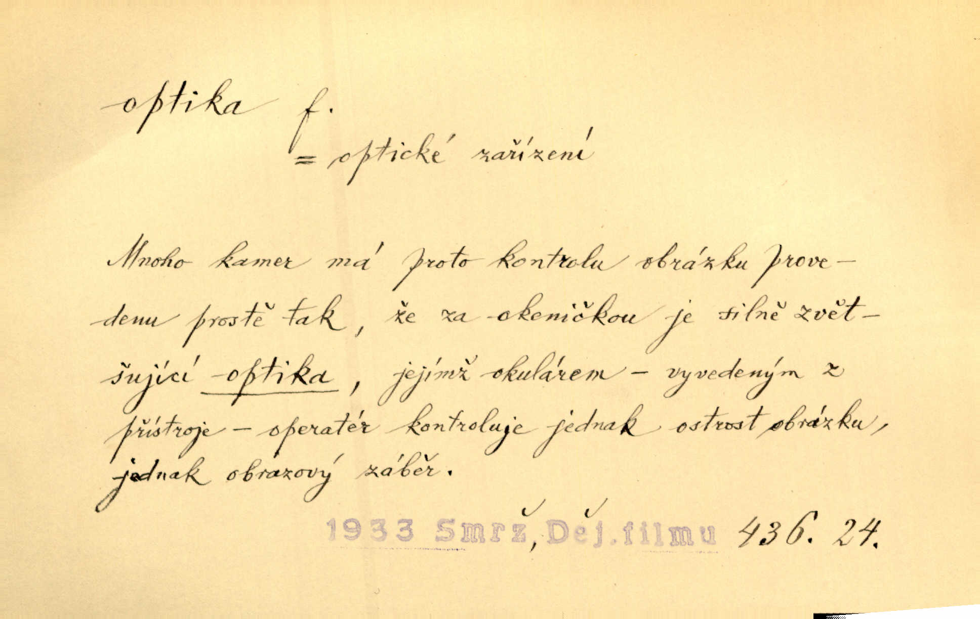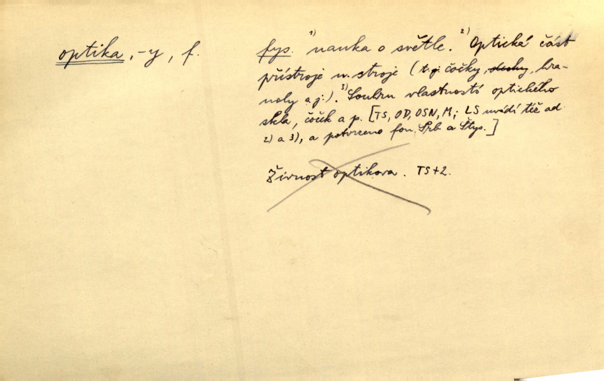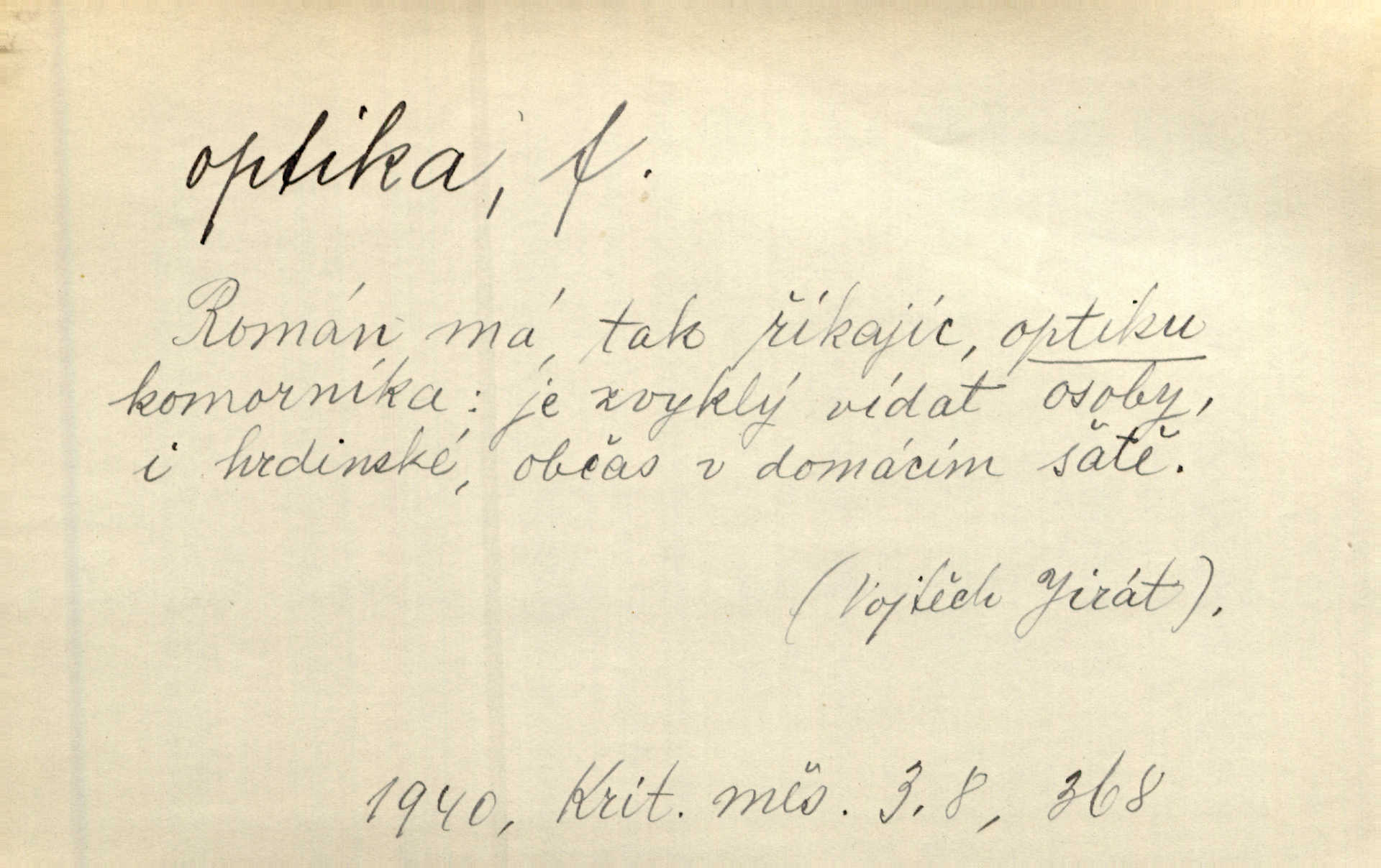 - optika, -y f. fys. nauka o světle; optická část přístroje n. stroje (čočky, hranoly a pod.); souhrn vlastností optického skla, čoček o pod. D schopnost nazírání, posuzování. Jeho [Nezvalova] optika je v této studii časné mladosti nesrovnatelně složitější než i nadprůměrný rozhled sebevyspělejšího dítěte. Sez. Každé umění se absolutností své optiky ocítá v nejtěsnější blízkosti náboženství. Panor. Jejich [nakladatelů] programová slabost je neuchránila před skreslenou optikou kamarádského pařížsko-pražského souručenství. Přít.