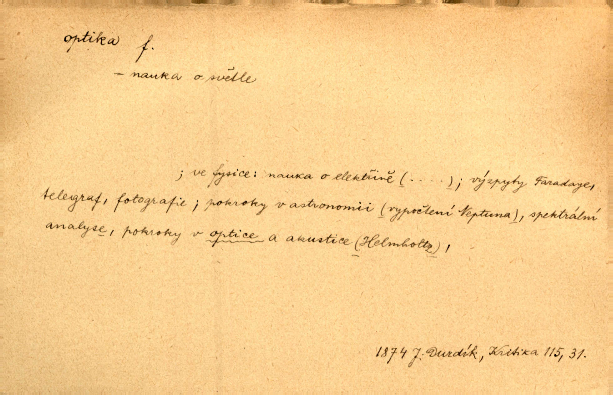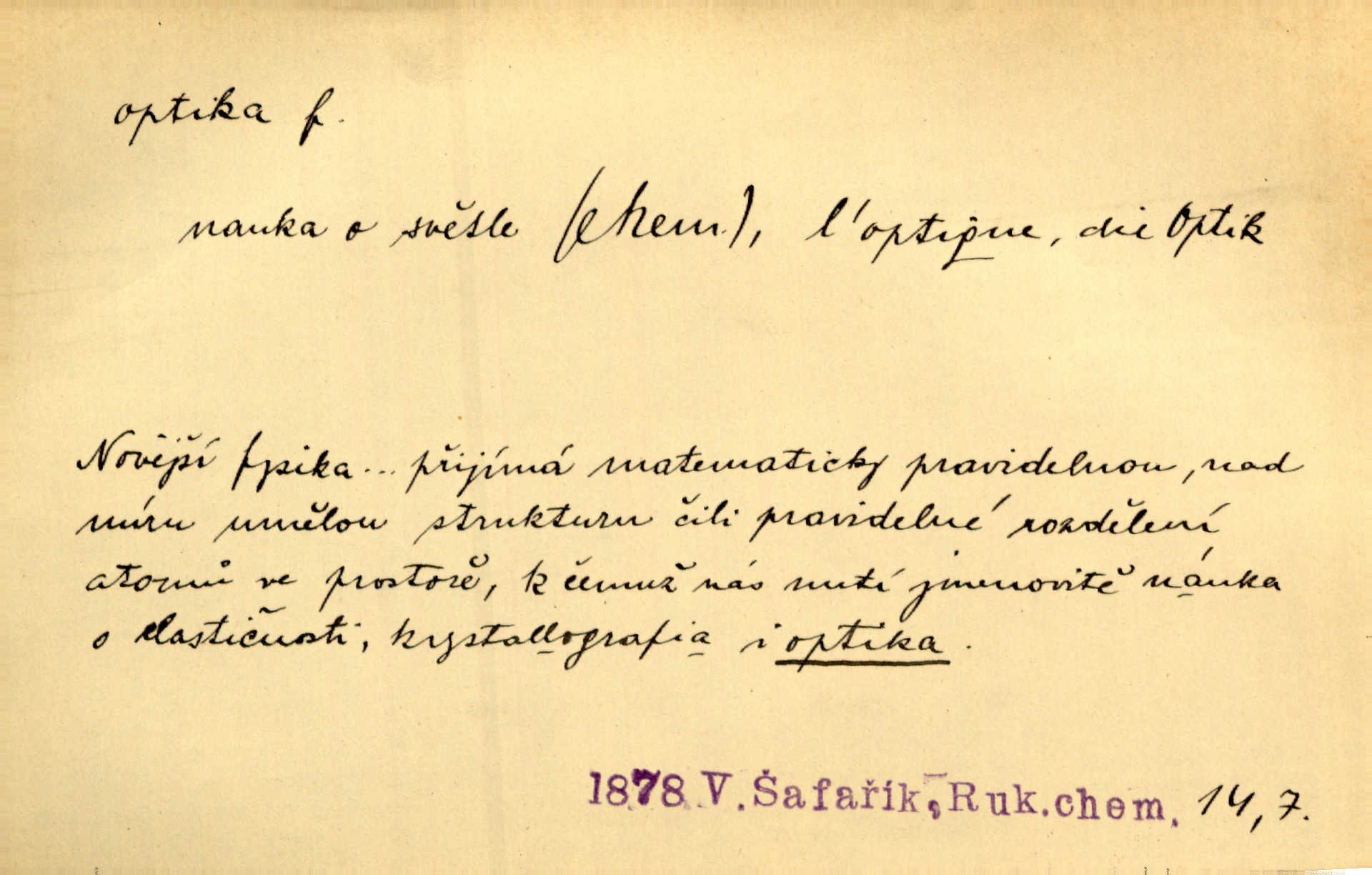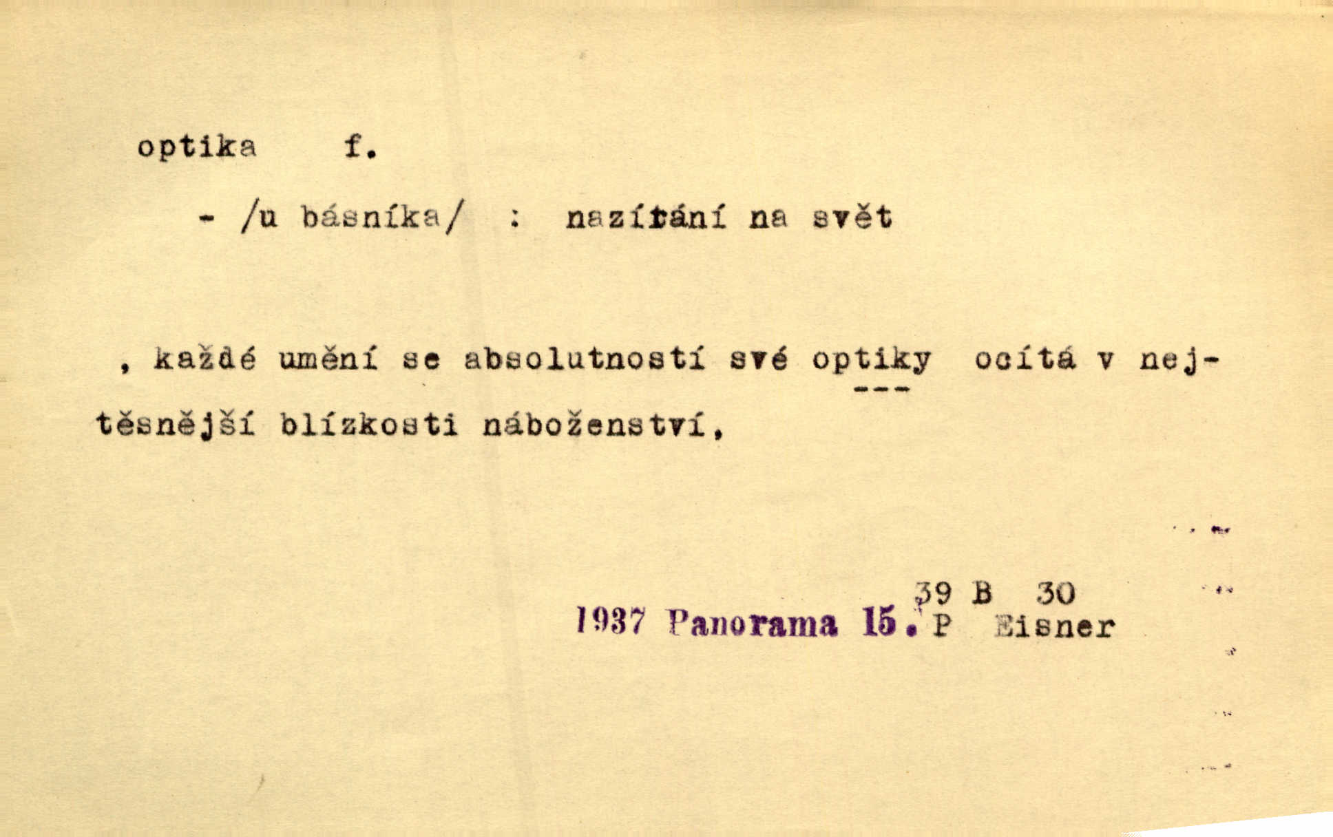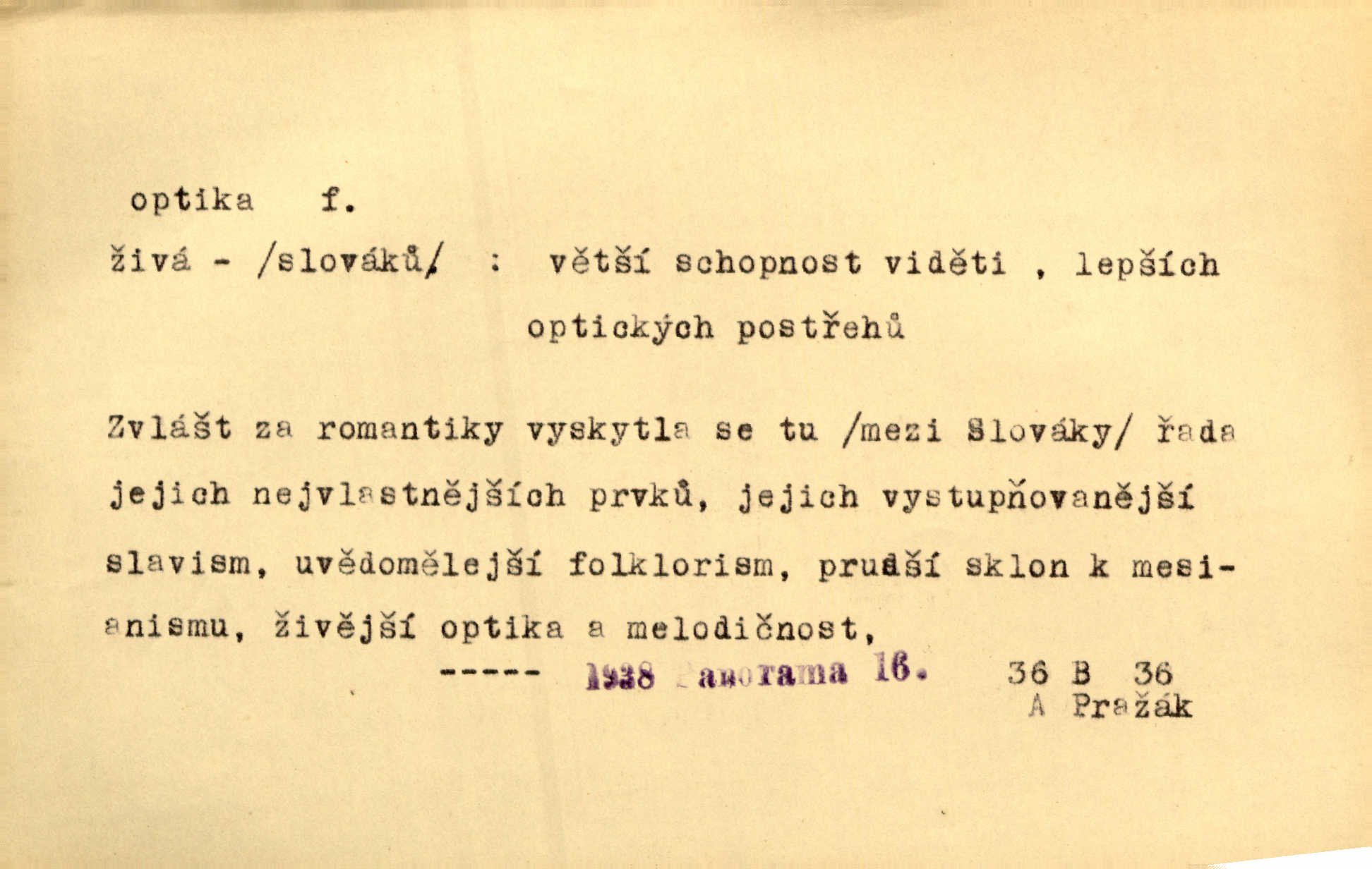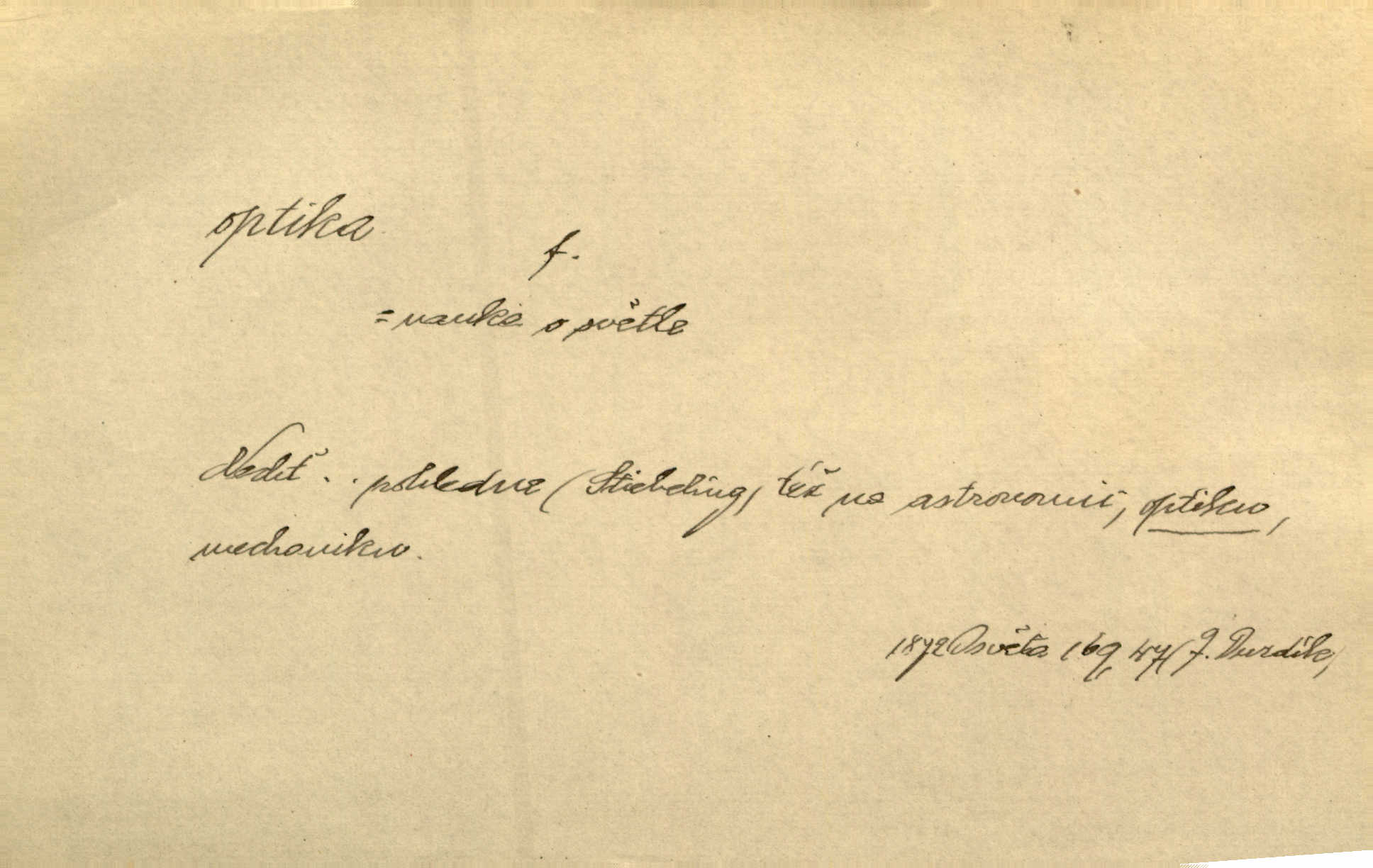 - optika, -y f. fys. nauka o světle; optická část přístroje n. stroje (čočky, hranoly a pod.); souhrn vlastností optického skla, čoček o pod. D schopnost nazírání, posuzování. Jeho [Nezvalova] optika je v této studii časné mladosti nesrovnatelně složitější než i nadprůměrný rozhled sebevyspělejšího dítěte. Sez. Každé umění se absolutností své optiky ocítá v nejtěsnější blízkosti náboženství. Panor. Jejich [nakladatelů] programová slabost je neuchránila před skreslenou optikou kamarádského pařížsko-pražského souručenství. Přít.