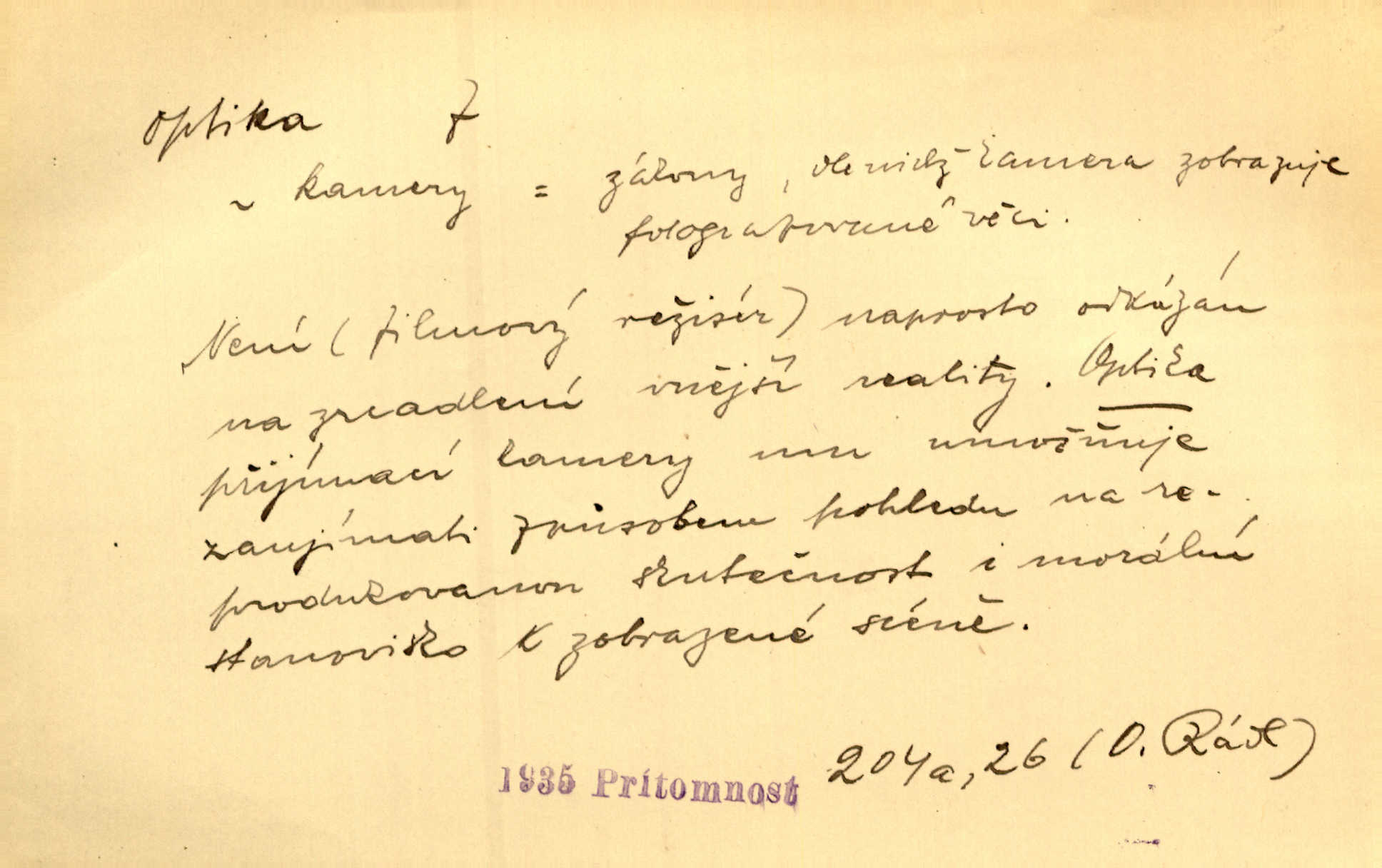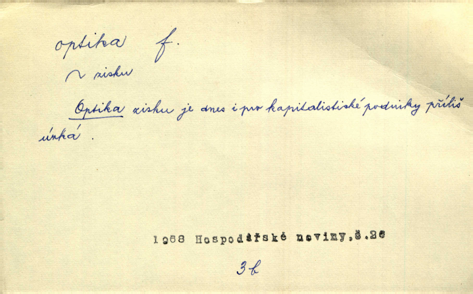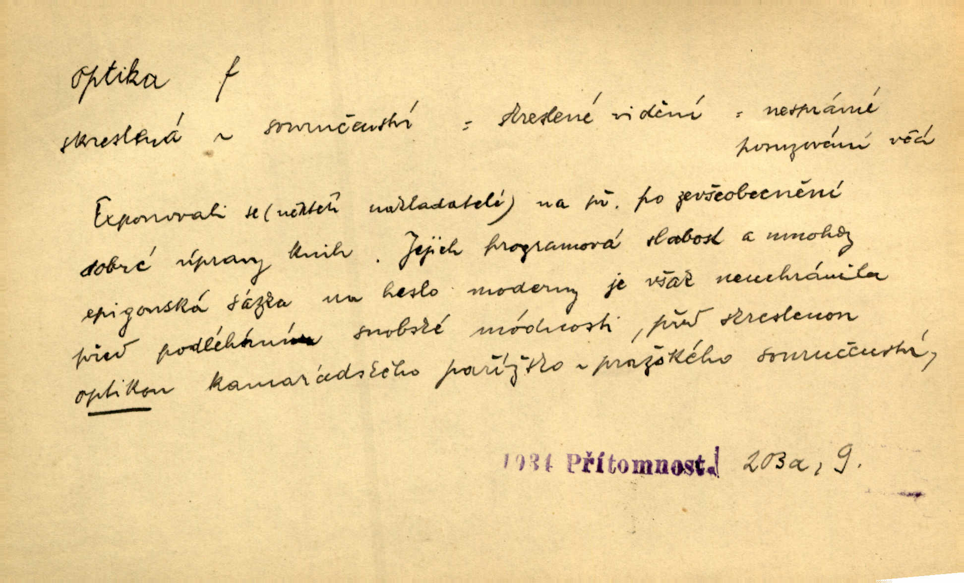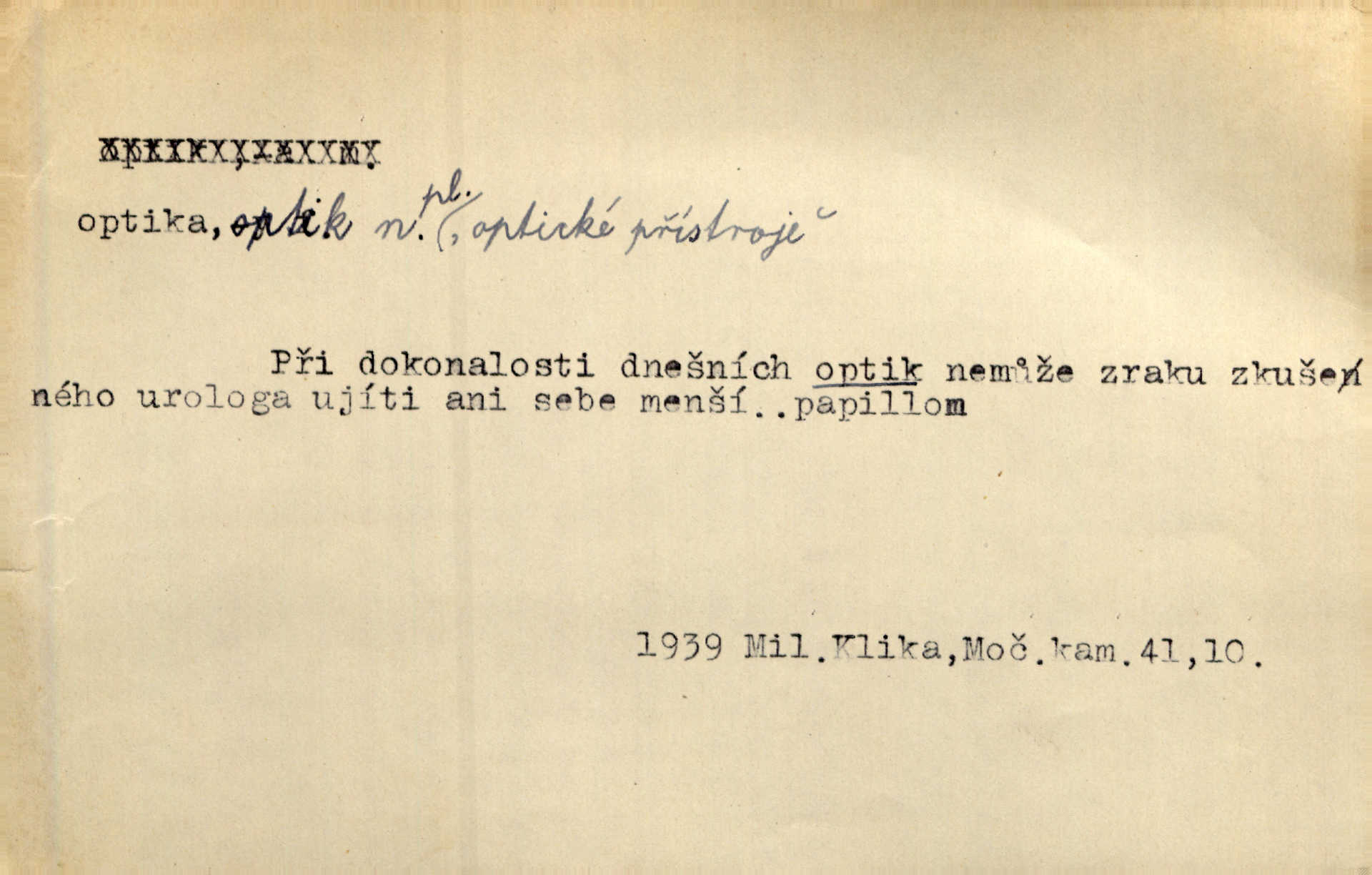 - optika, -y f. fys. nauka o světle; optická část přístroje n. stroje (čočky, hranoly a pod.); souhrn vlastností optického skla, čoček o pod. D schopnost nazírání, posuzování. Jeho [Nezvalova] optika je v této studii časné mladosti nesrovnatelně složitější než i nadprůměrný rozhled sebevyspělejšího dítěte. Sez. Každé umění se absolutností své optiky ocítá v nejtěsnější blízkosti náboženství. Panor. Jejich [nakladatelů] programová slabost je neuchránila před skreslenou optikou kamarádského pařížsko-pražského souručenství. Přít.
