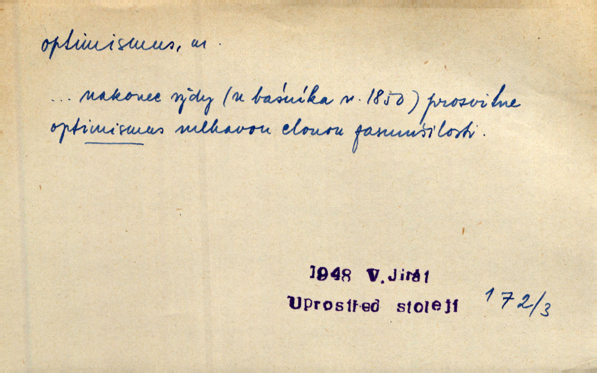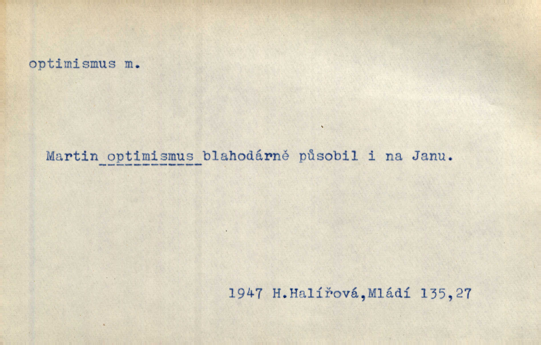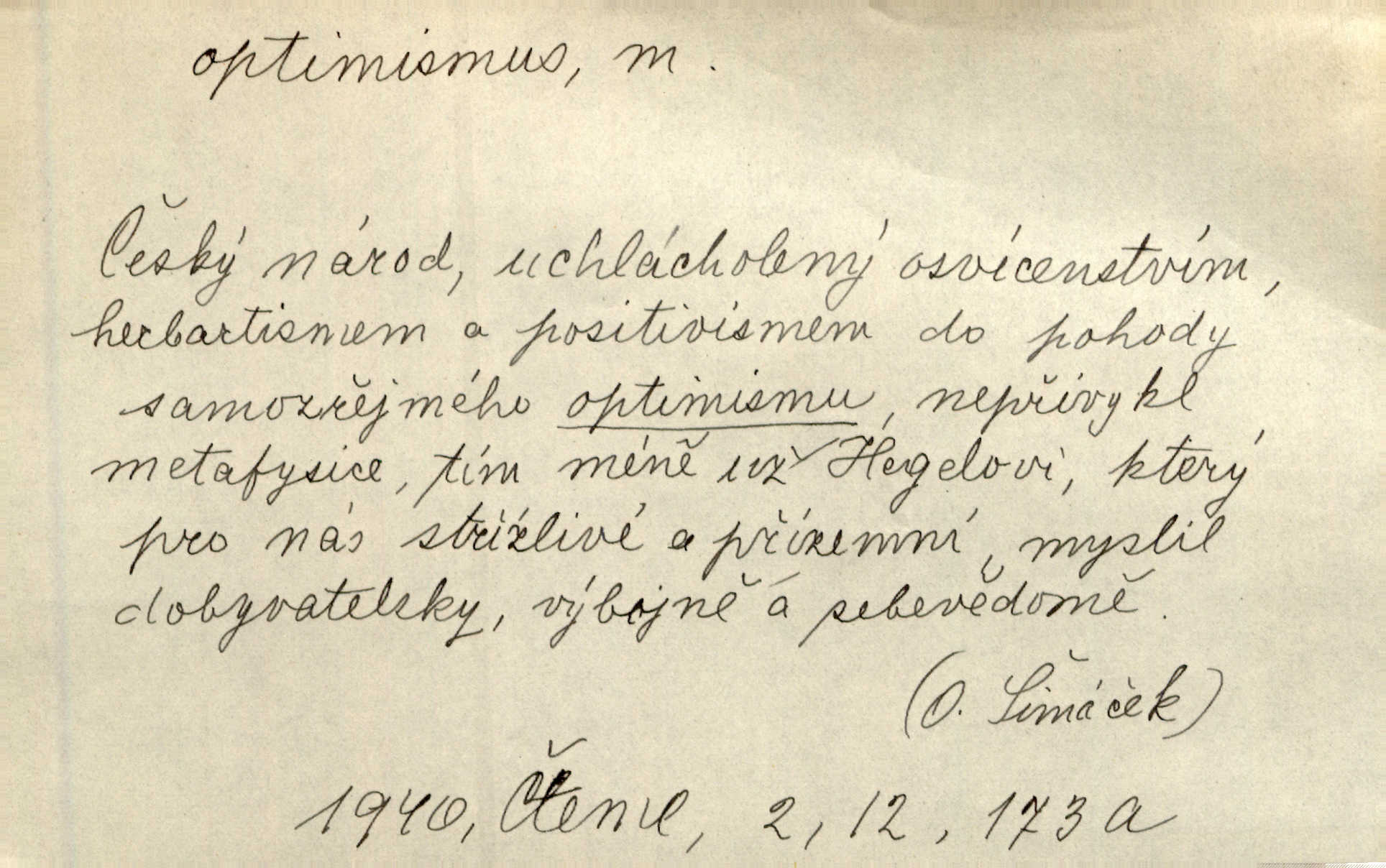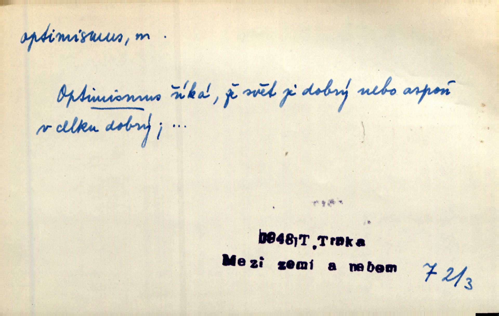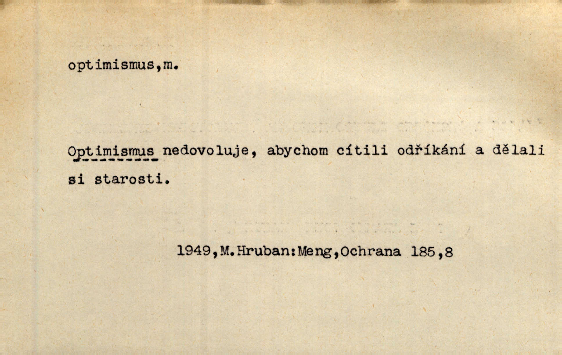 - optimismus (vysl. -ty-), optimism, -ismu m. zdůrazňování kladných stránek života; sklon považovati něco za lepší, výhodnější, než je ve skutečnosti (op. pesimismus). Onen klamný optimismus souchotinářů jest skutečně jedním z řídkých darů lakomé jinak přírody. Mach. [Schauer] nezná jiné námahy než konstruovati pro úkoj neuspokojeného nitra umělý optimismus. Kar. Měl [hostinec] něco, co mohlo se se značnou dávkou optimismu nazývat prvým poschodím. Dyk. Filos. nauka, že náš svět je nejlepší ze všech možných, poněvadž Bůh jej stvořil.