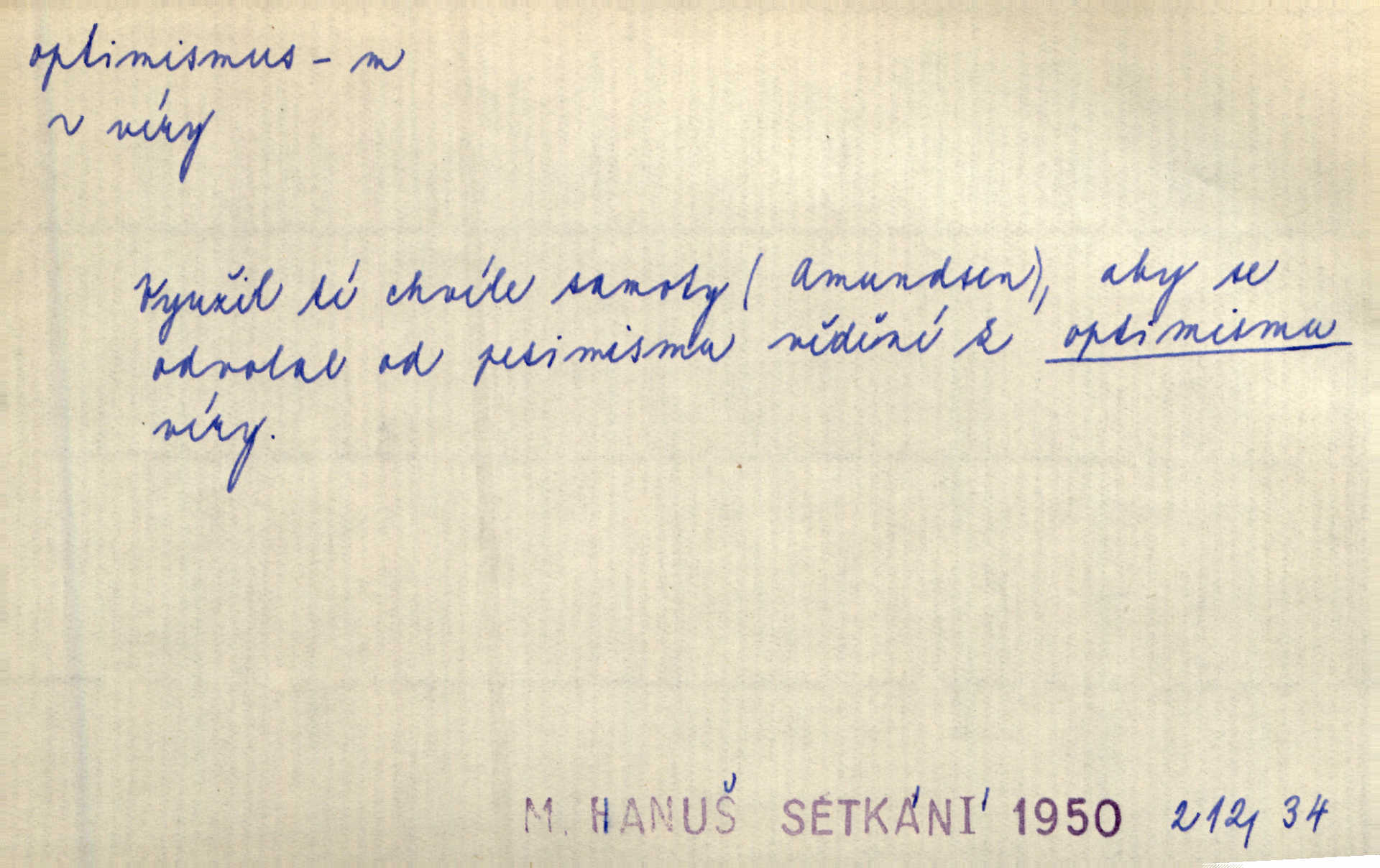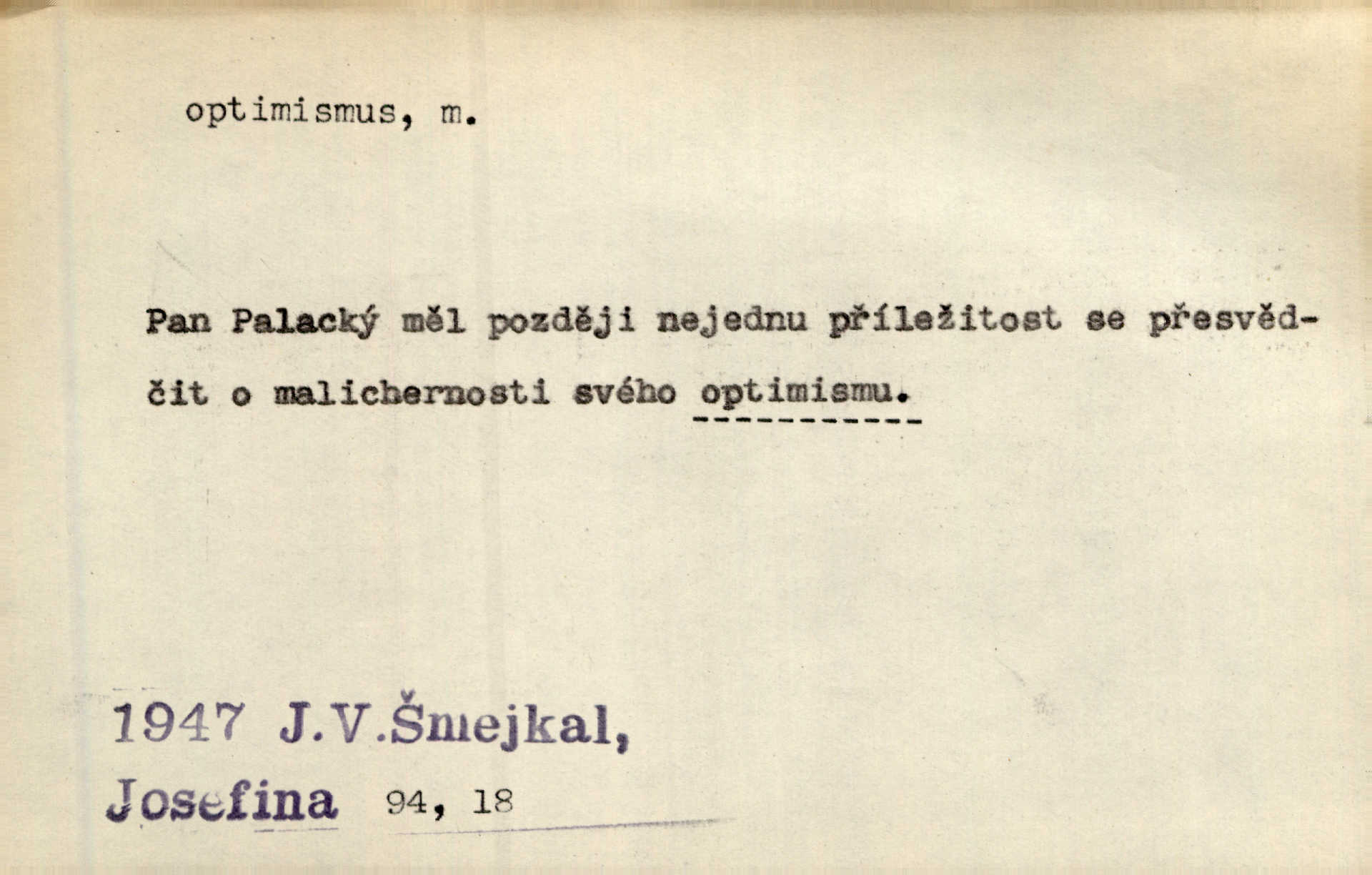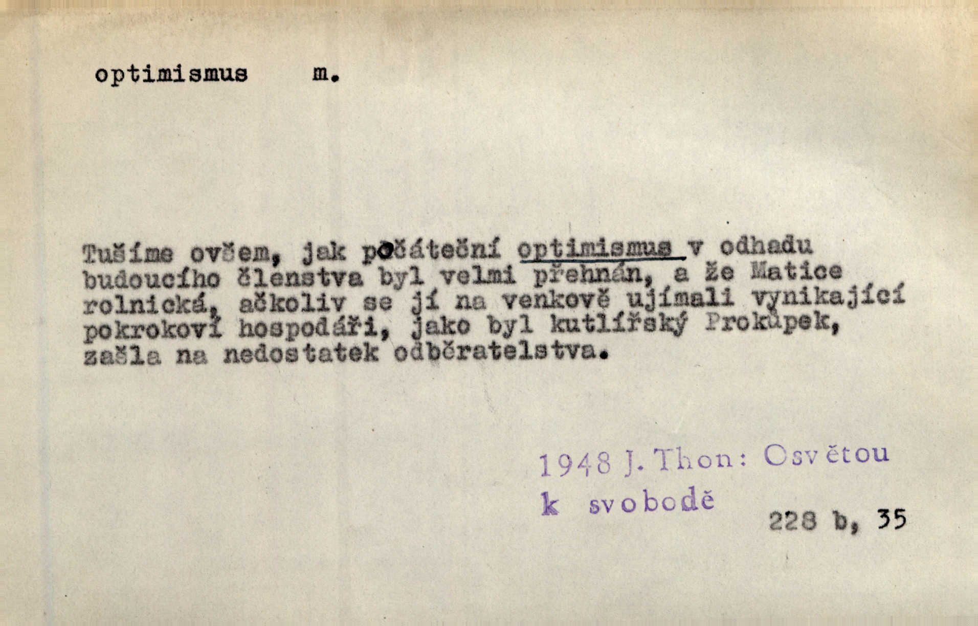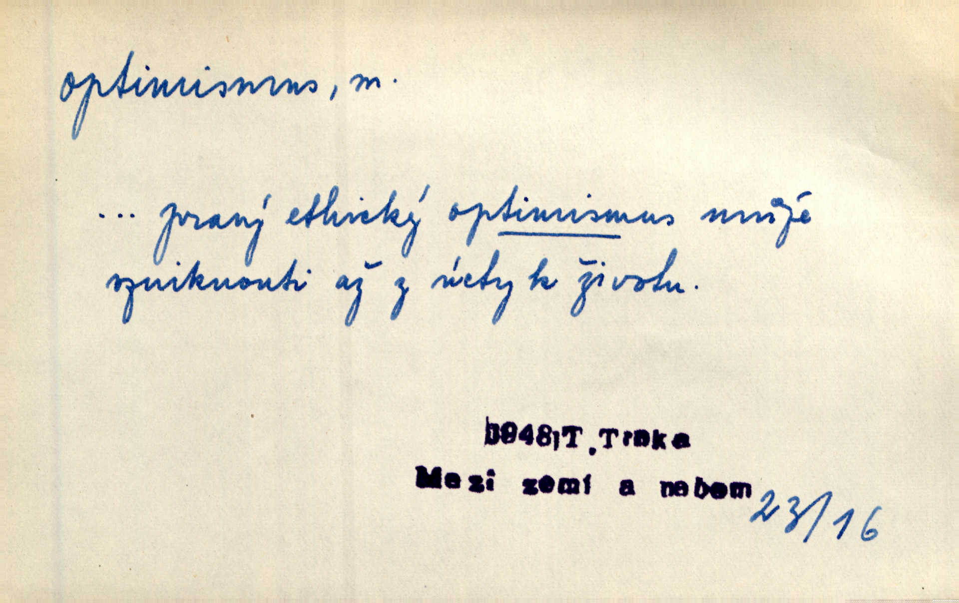 - optimismus (vysl. -ty-), optimism, -ismu m. zdůrazňování kladných stránek života; sklon považovati něco za lepší, výhodnější, než je ve skutečnosti (op. pesimismus). Onen klamný optimismus souchotinářů jest skutečně jedním z řídkých darů lakomé jinak přírody. Mach. [Schauer] nezná jiné námahy než konstruovati pro úkoj neuspokojeného nitra umělý optimismus. Kar. Měl [hostinec] něco, co mohlo se se značnou dávkou optimismu nazývat prvým poschodím. Dyk. Filos. nauka, že náš svět je nejlepší ze všech možných, poněvadž Bůh jej stvořil.