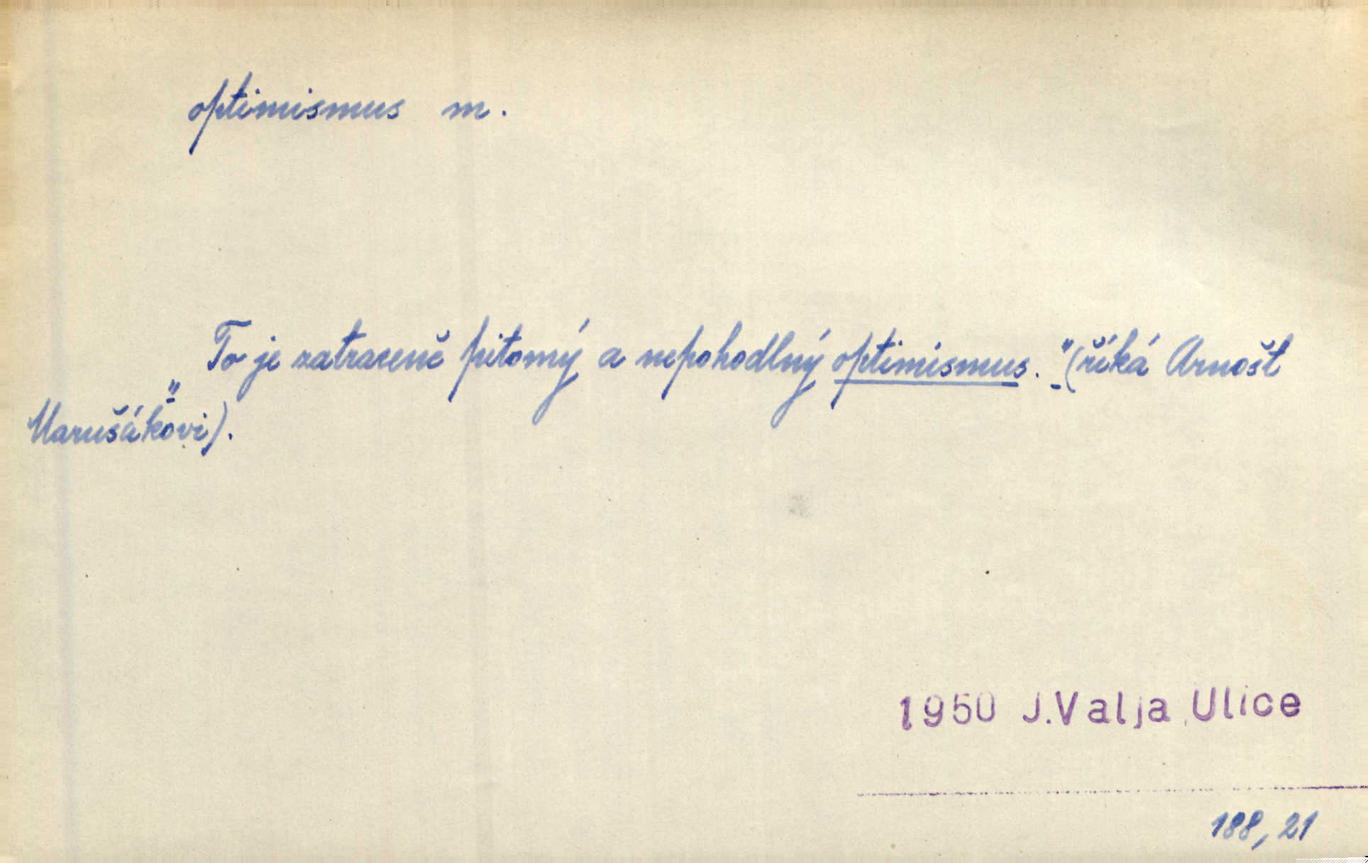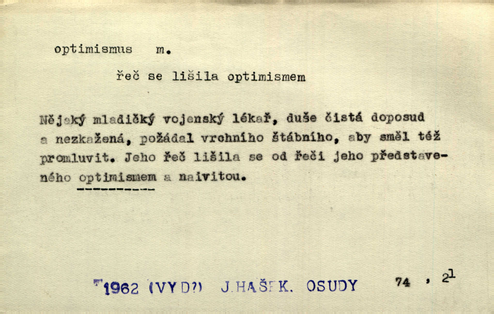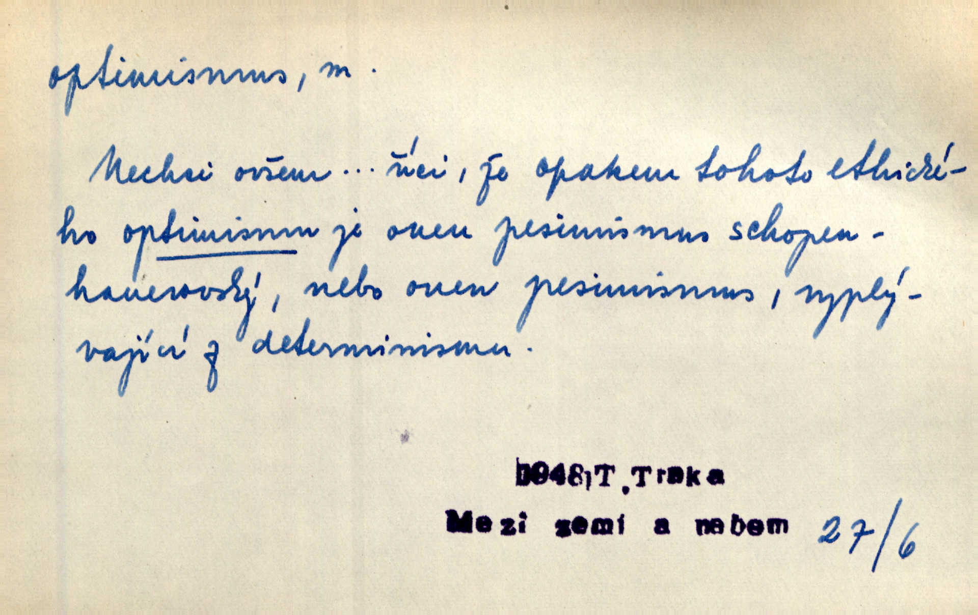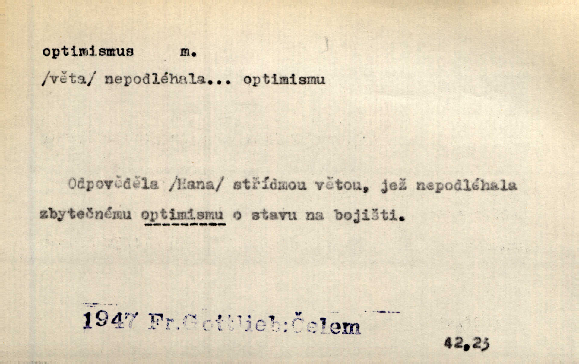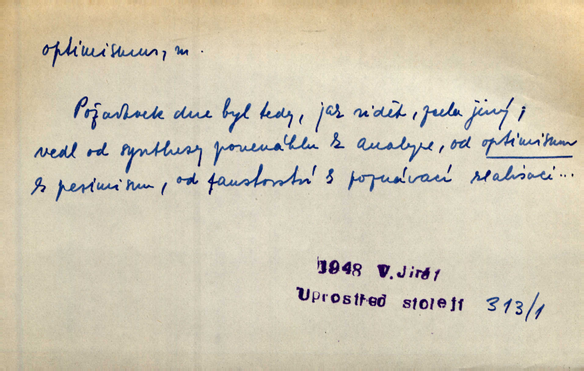 - optimismus (vysl. -ty-), optimism, -ismu m. zdůrazňování kladných stránek života; sklon považovati něco za lepší, výhodnější, než je ve skutečnosti (op. pesimismus). Onen klamný optimismus souchotinářů jest skutečně jedním z řídkých darů lakomé jinak přírody. Mach. [Schauer] nezná jiné námahy než konstruovati pro úkoj neuspokojeného nitra umělý optimismus. Kar. Měl [hostinec] něco, co mohlo se se značnou dávkou optimismu nazývat prvým poschodím. Dyk. Filos. nauka, že náš svět je nejlepší ze všech možných, poněvadž Bůh jej stvořil.