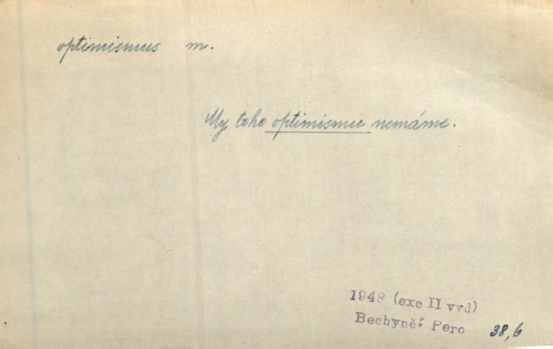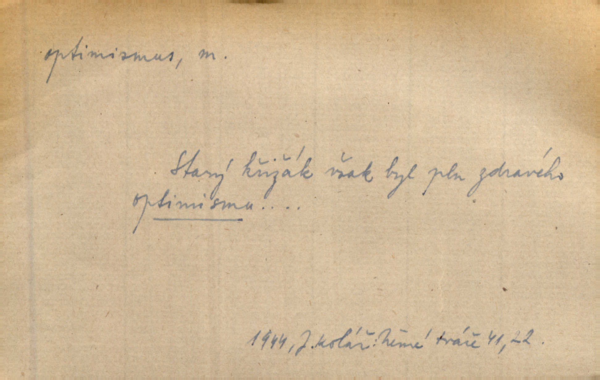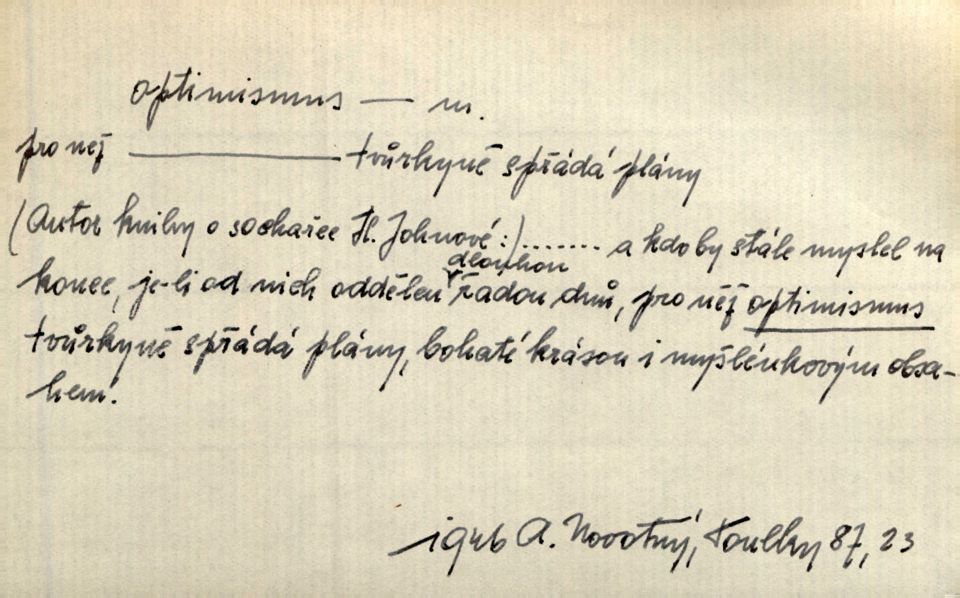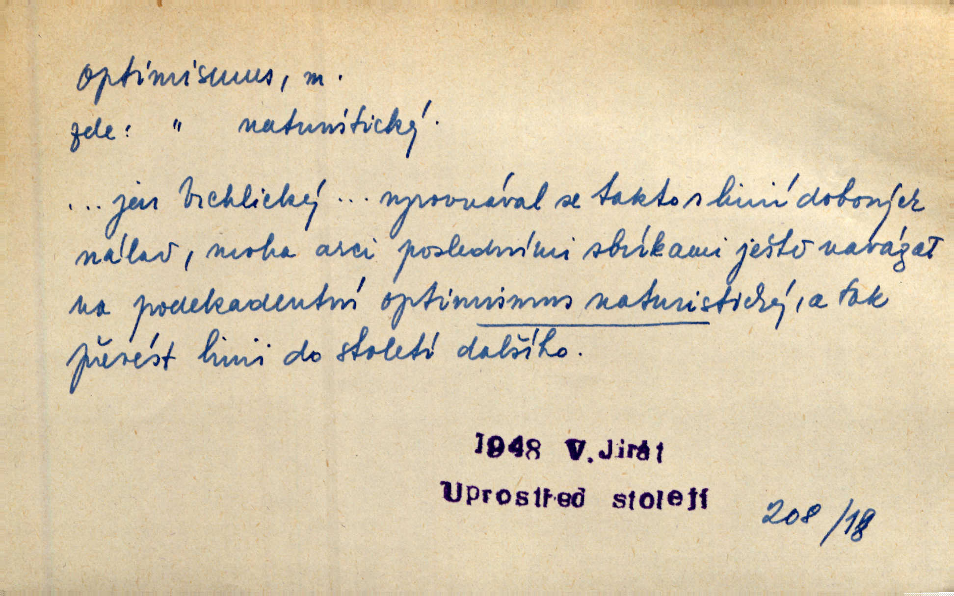 - optimismus (vysl. -ty-), optimism, -ismu m. zdůrazňování kladných stránek života; sklon považovati něco za lepší, výhodnější, než je ve skutečnosti (op. pesimismus). Onen klamný optimismus souchotinářů jest skutečně jedním z řídkých darů lakomé jinak přírody. Mach. [Schauer] nezná jiné námahy než konstruovati pro úkoj neuspokojeného nitra umělý optimismus. Kar. Měl [hostinec] něco, co mohlo se se značnou dávkou optimismu nazývat prvým poschodím. Dyk. Filos. nauka, že náš svět je nejlepší ze všech možných, poněvadž Bůh jej stvořil.