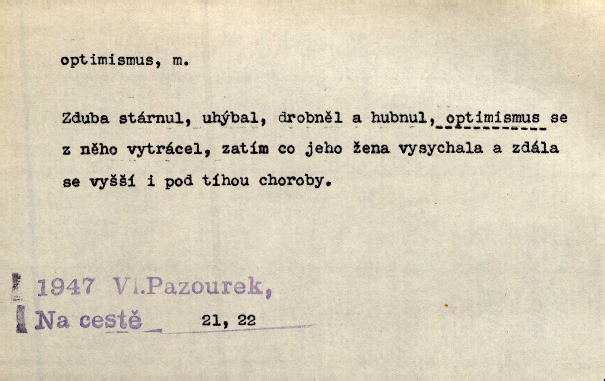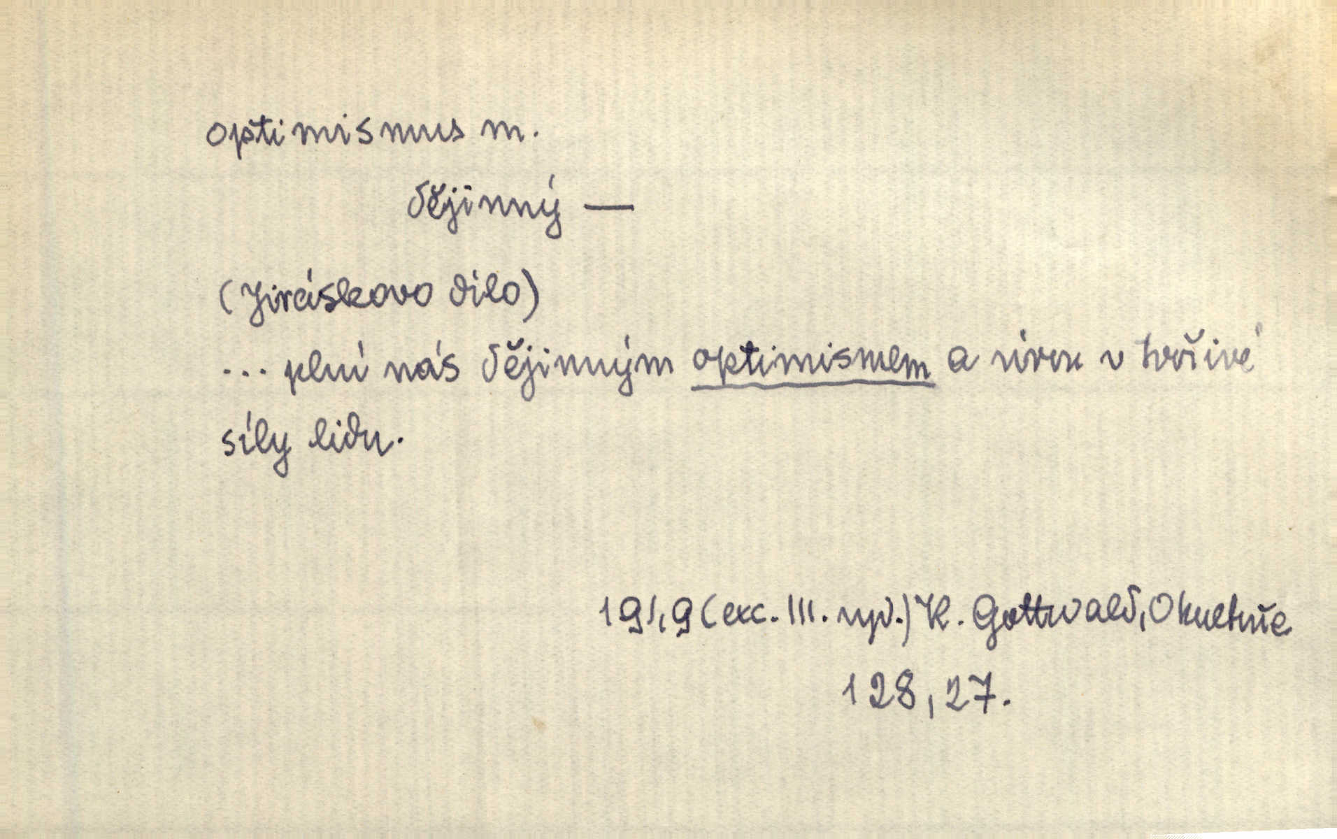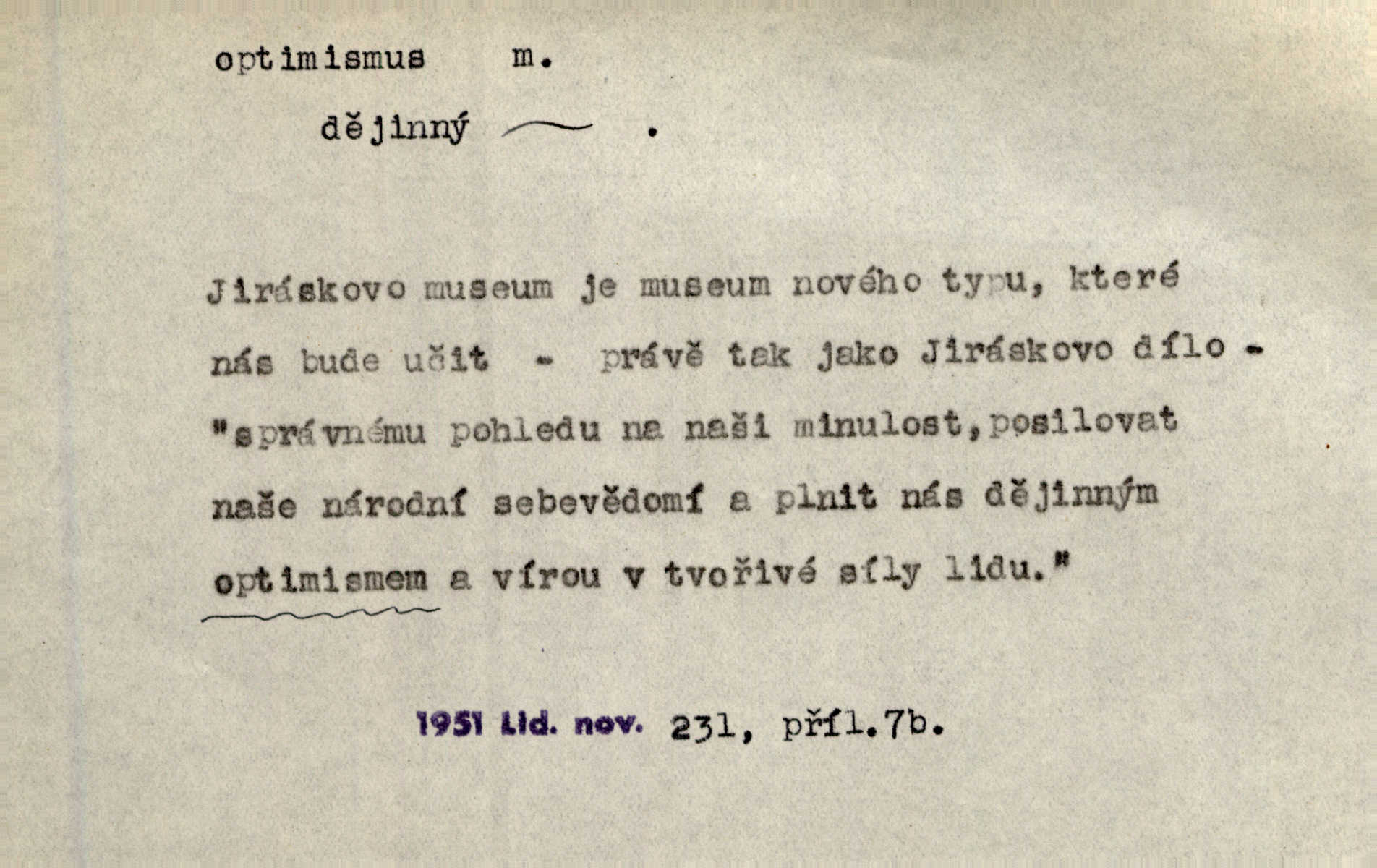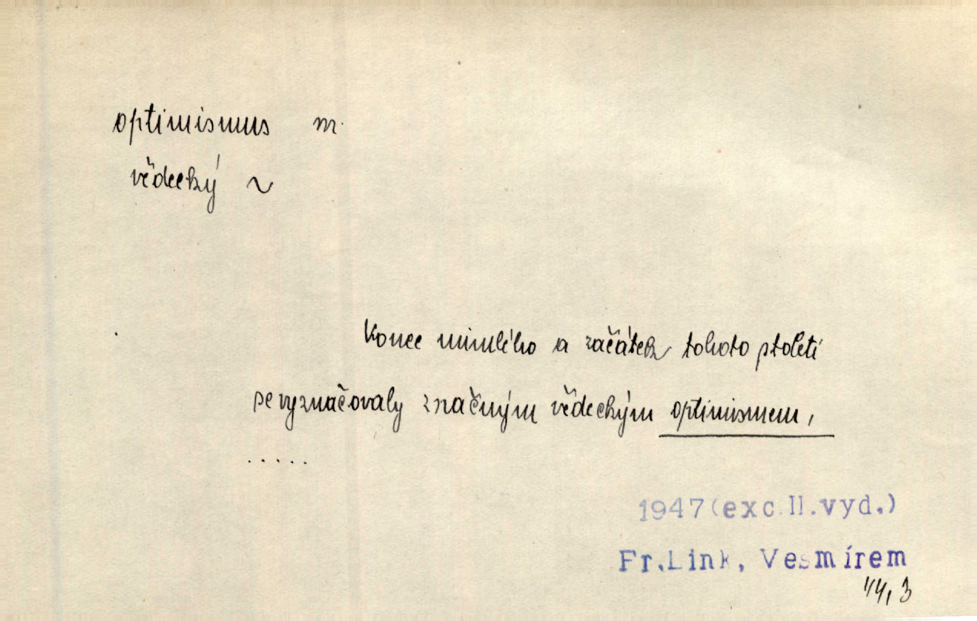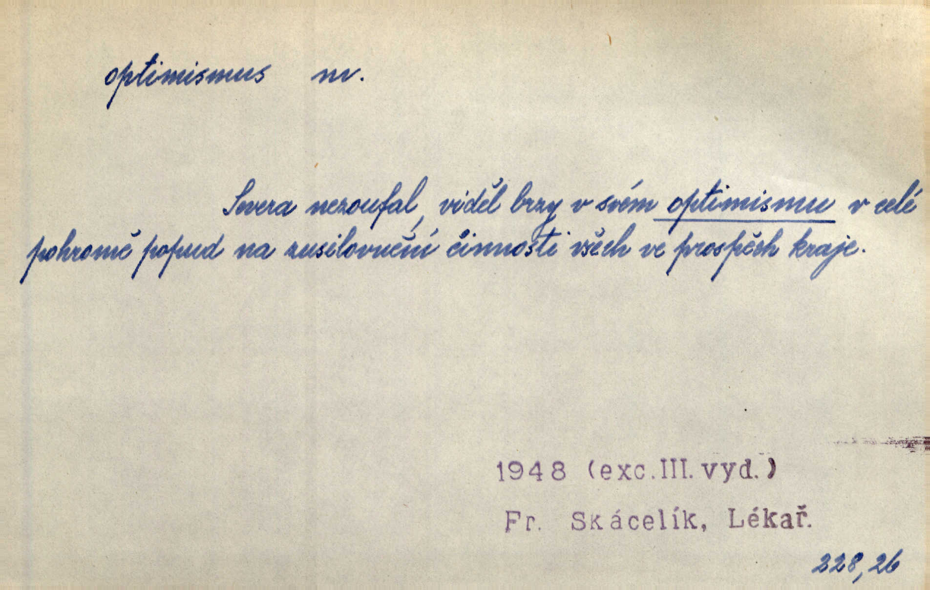 - optimismus (vysl. -ty-), optimism, -ismu m. zdůrazňování kladných stránek života; sklon považovati něco za lepší, výhodnější, než je ve skutečnosti (op. pesimismus). Onen klamný optimismus souchotinářů jest skutečně jedním z řídkých darů lakomé jinak přírody. Mach. [Schauer] nezná jiné námahy než konstruovati pro úkoj neuspokojeného nitra umělý optimismus. Kar. Měl [hostinec] něco, co mohlo se se značnou dávkou optimismu nazývat prvým poschodím. Dyk. Filos. nauka, že náš svět je nejlepší ze všech možných, poněvadž Bůh jej stvořil.