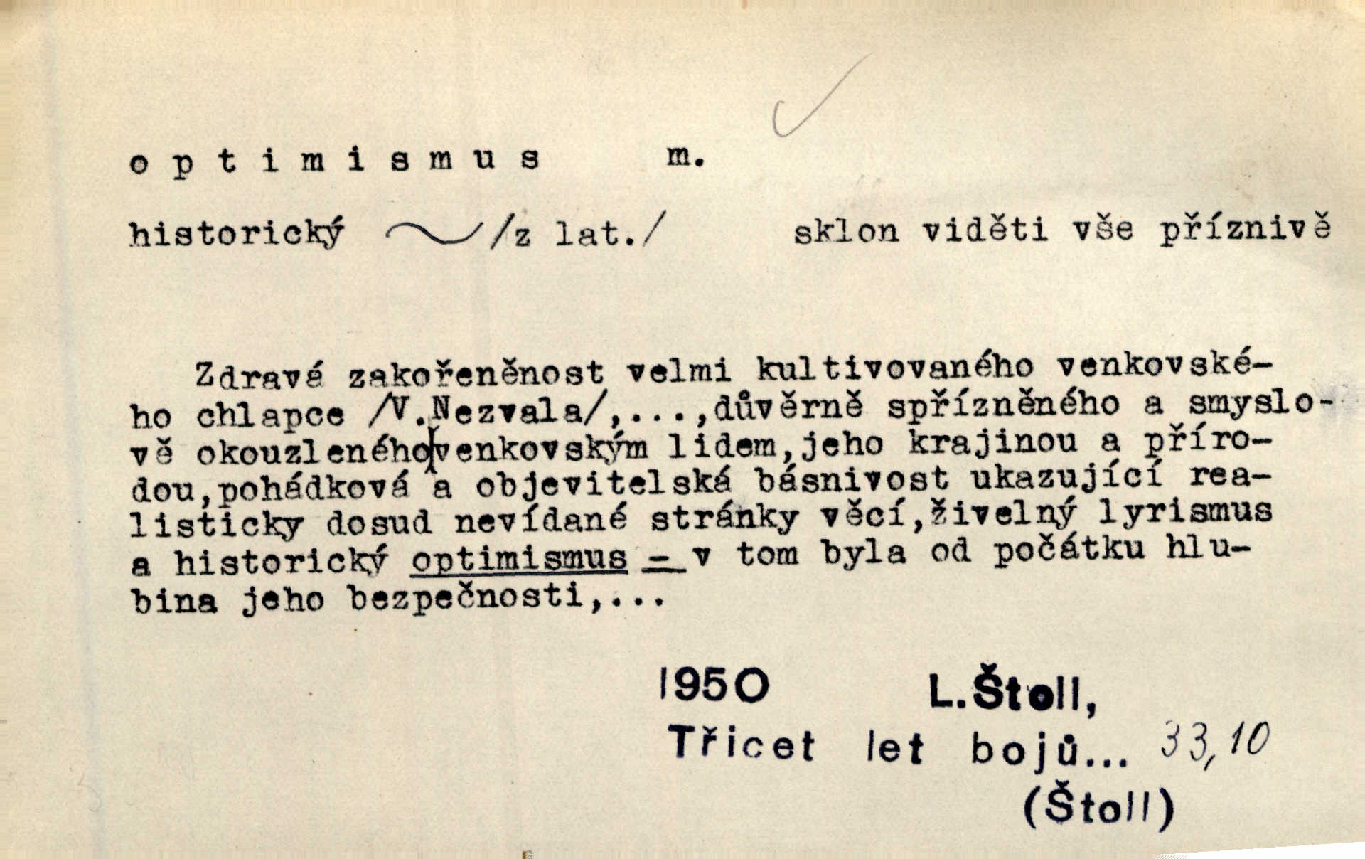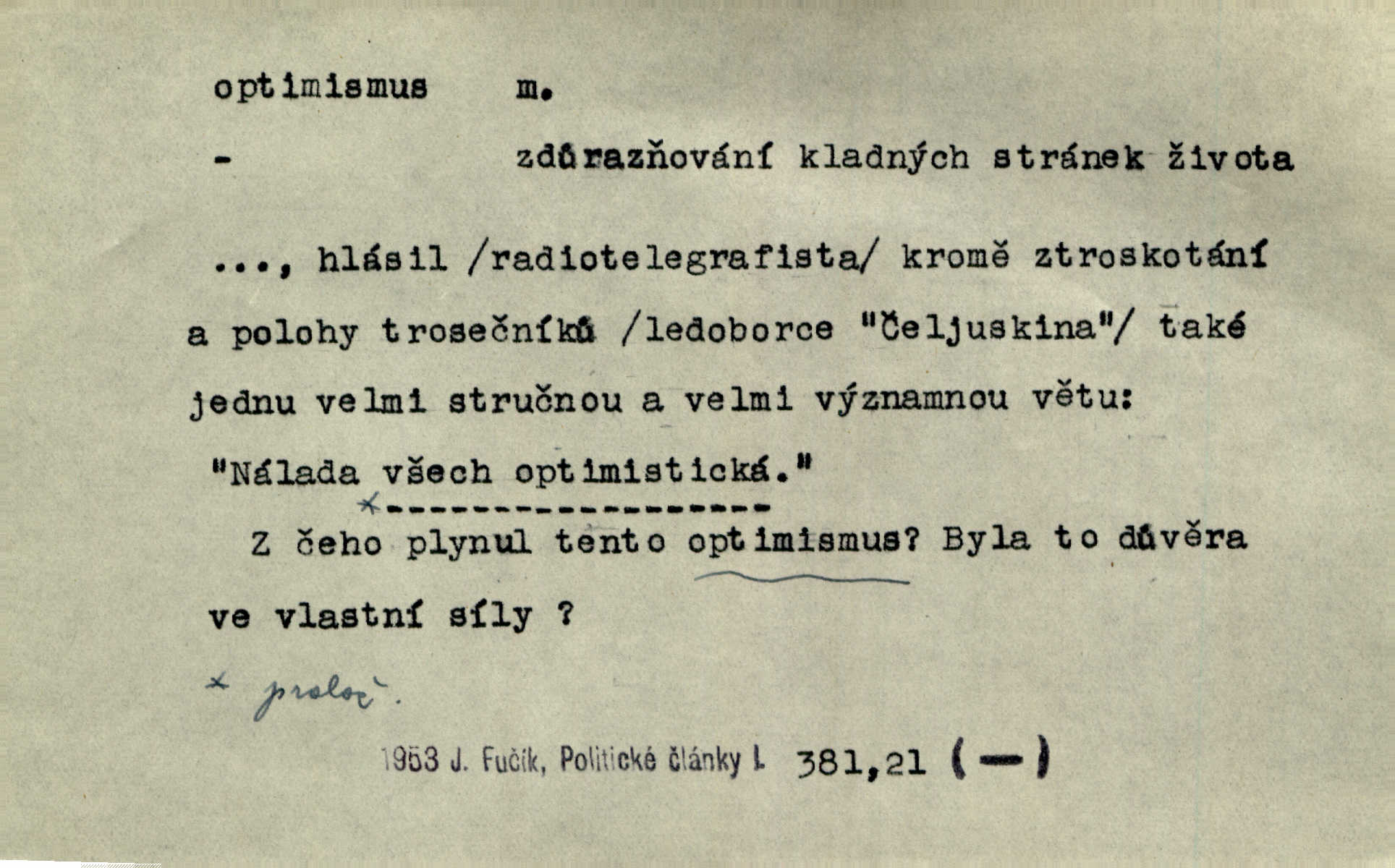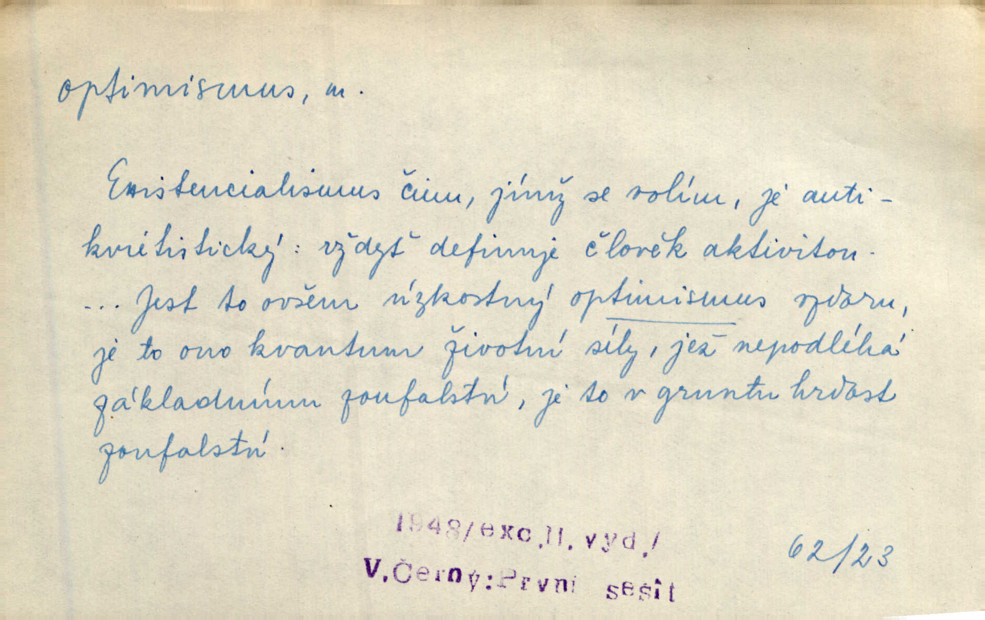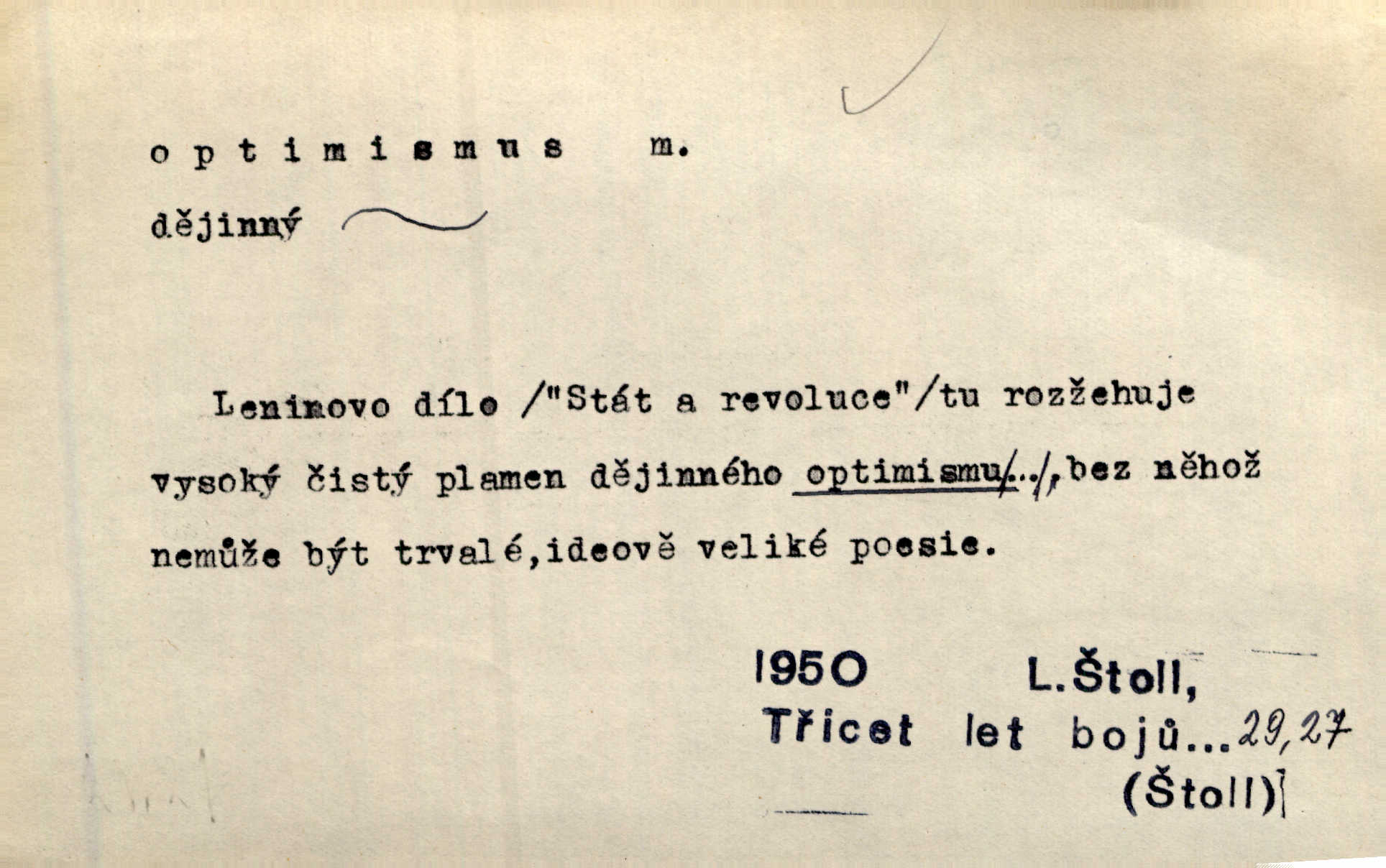 - optimismus (vysl. -ty-), optimism, -ismu m. zdůrazňování kladných stránek života; sklon považovati něco za lepší, výhodnější, než je ve skutečnosti (op. pesimismus). Onen klamný optimismus souchotinářů jest skutečně jedním z řídkých darů lakomé jinak přírody. Mach. [Schauer] nezná jiné námahy než konstruovati pro úkoj neuspokojeného nitra umělý optimismus. Kar. Měl [hostinec] něco, co mohlo se se značnou dávkou optimismu nazývat prvým poschodím. Dyk. Filos. nauka, že náš svět je nejlepší ze všech možných, poněvadž Bůh jej stvořil.