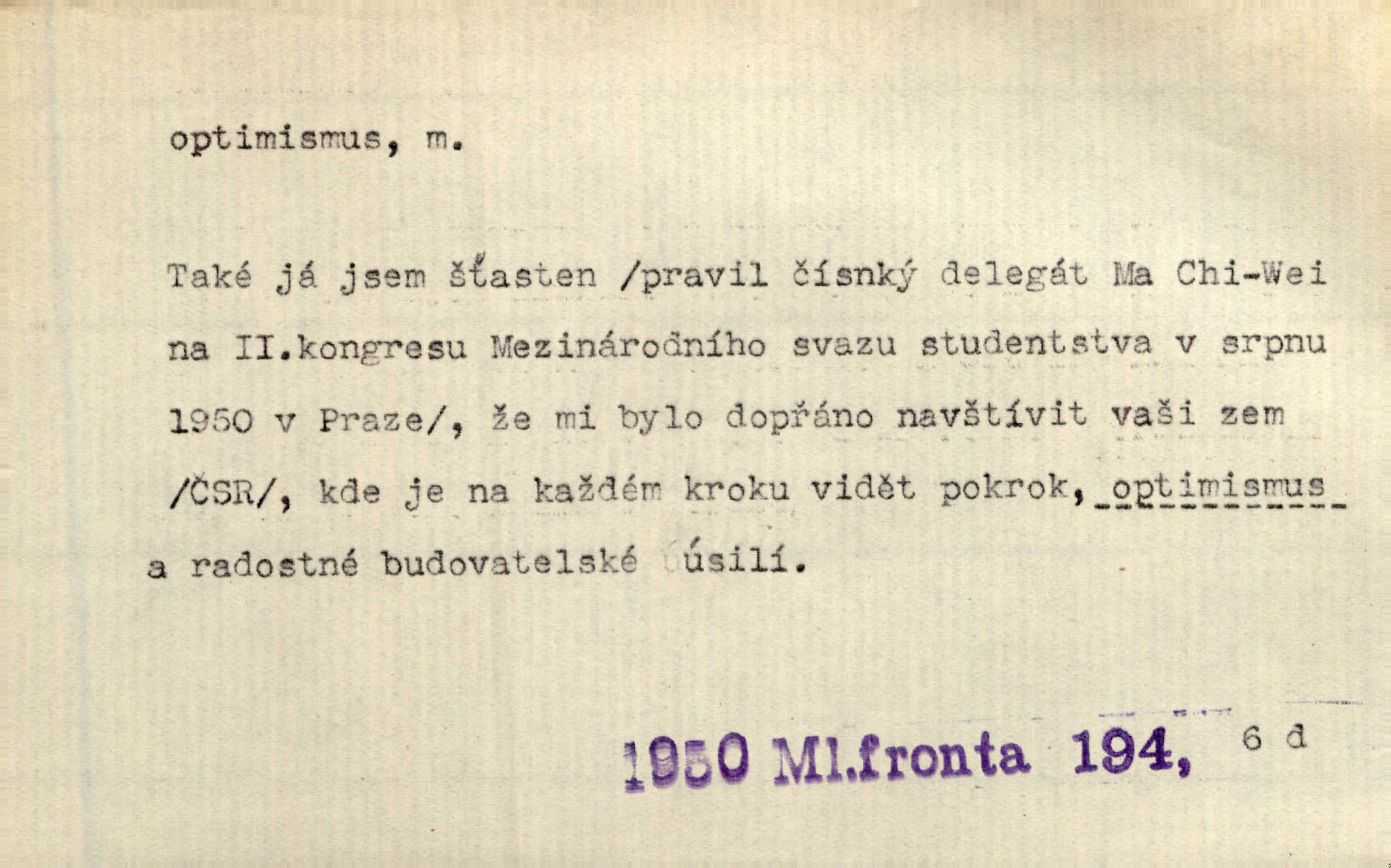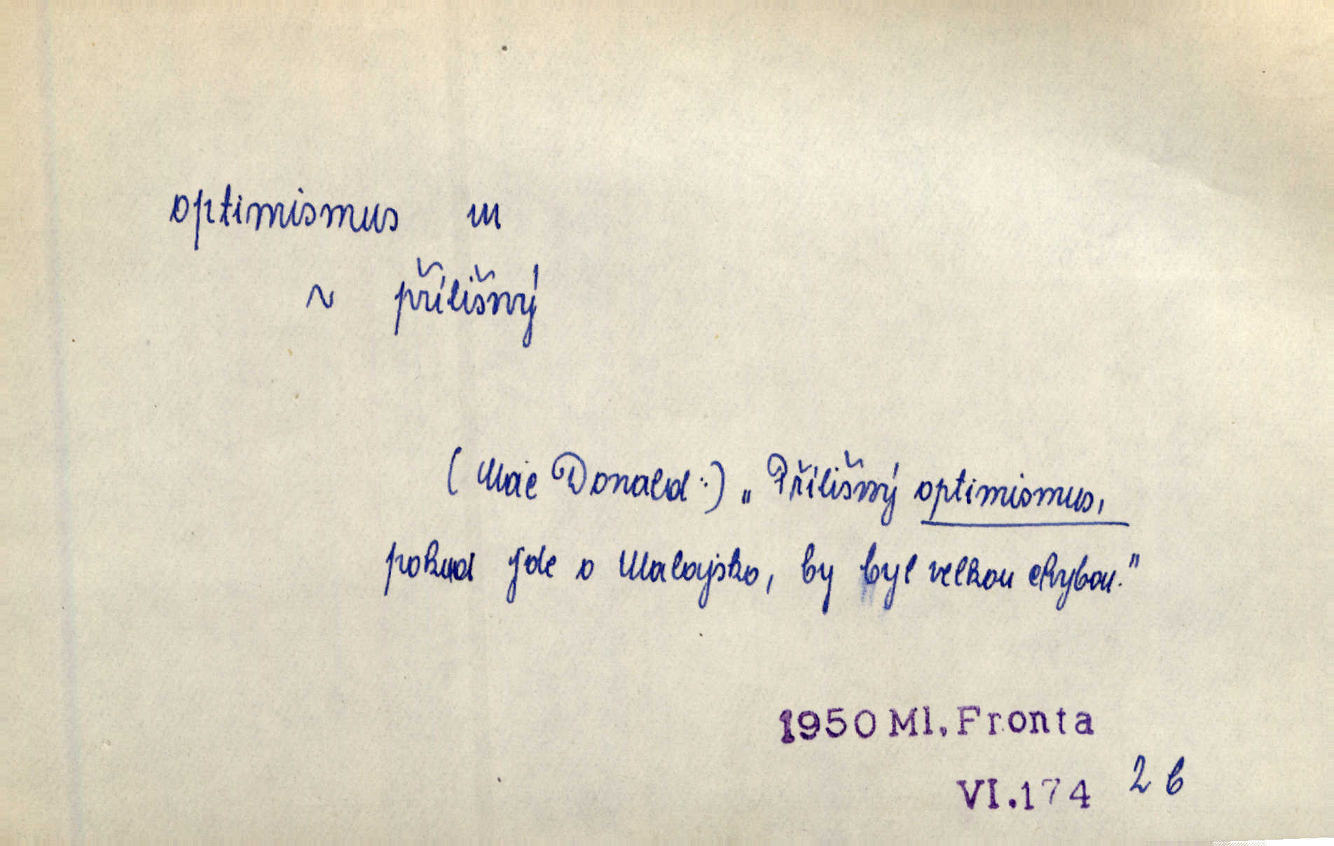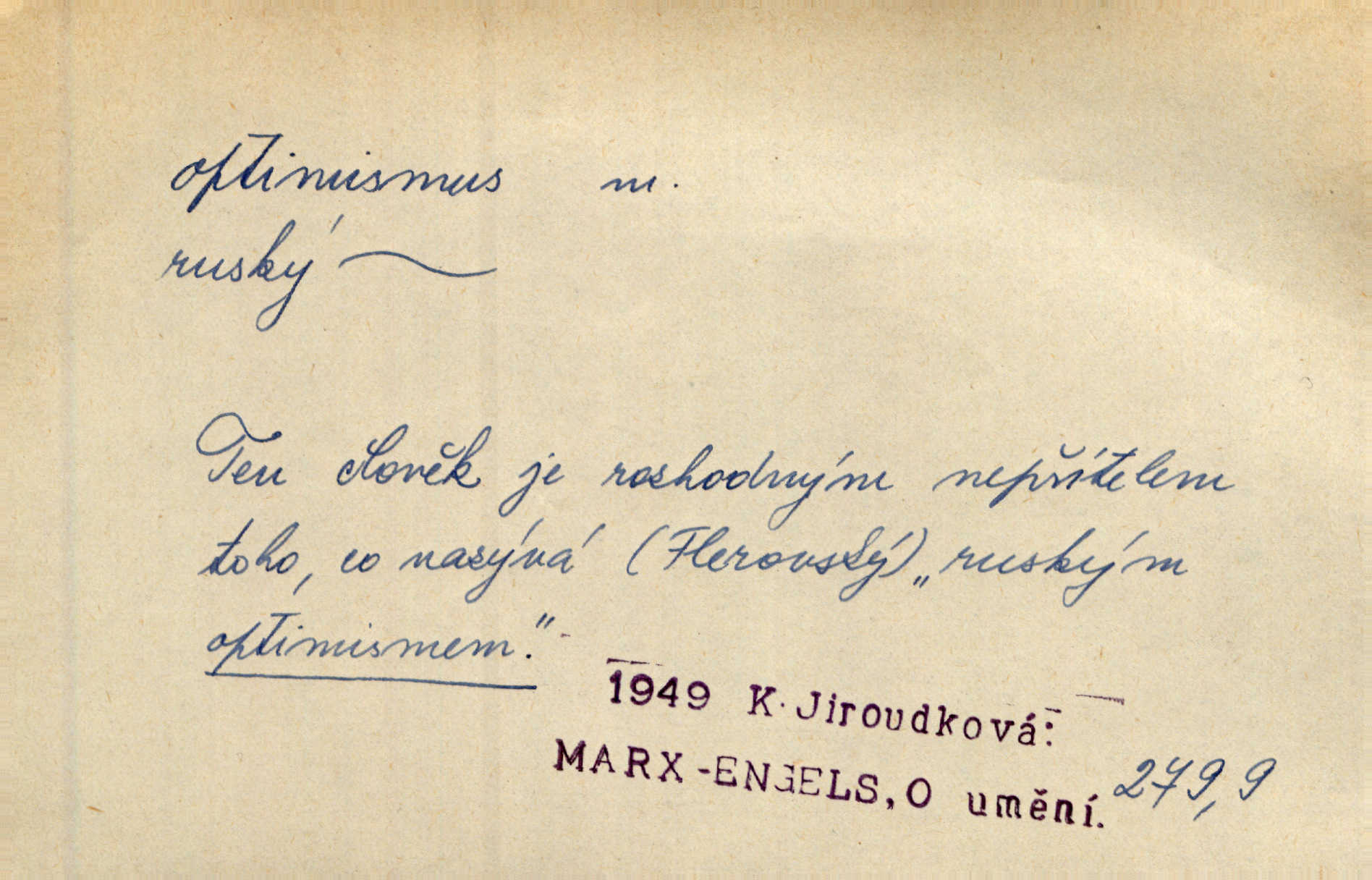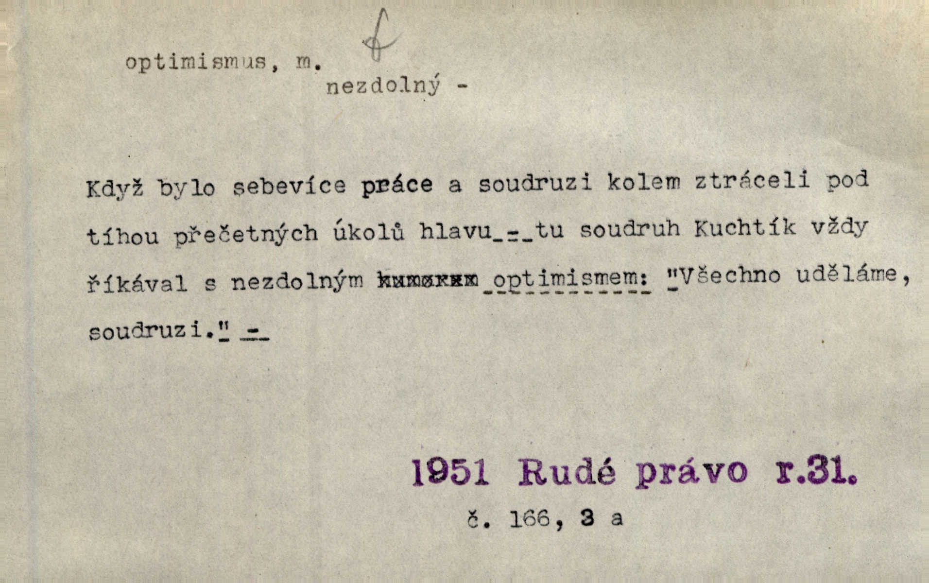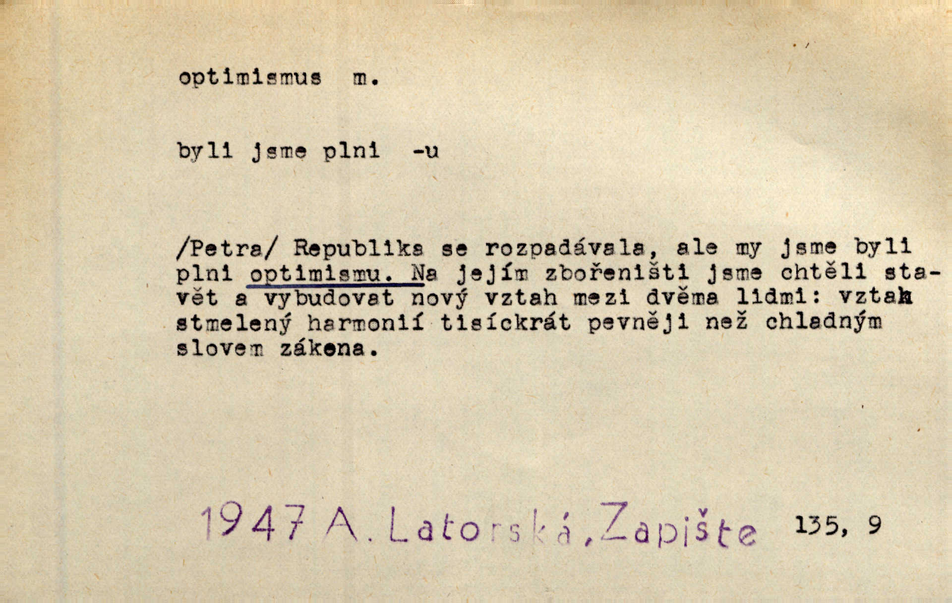 - optimismus (vysl. -ty-), optimism, -ismu m. zdůrazňování kladných stránek života; sklon považovati něco za lepší, výhodnější, než je ve skutečnosti (op. pesimismus). Onen klamný optimismus souchotinářů jest skutečně jedním z řídkých darů lakomé jinak přírody. Mach. [Schauer] nezná jiné námahy než konstruovati pro úkoj neuspokojeného nitra umělý optimismus. Kar. Měl [hostinec] něco, co mohlo se se značnou dávkou optimismu nazývat prvým poschodím. Dyk. Filos. nauka, že náš svět je nejlepší ze všech možných, poněvadž Bůh jej stvořil.
