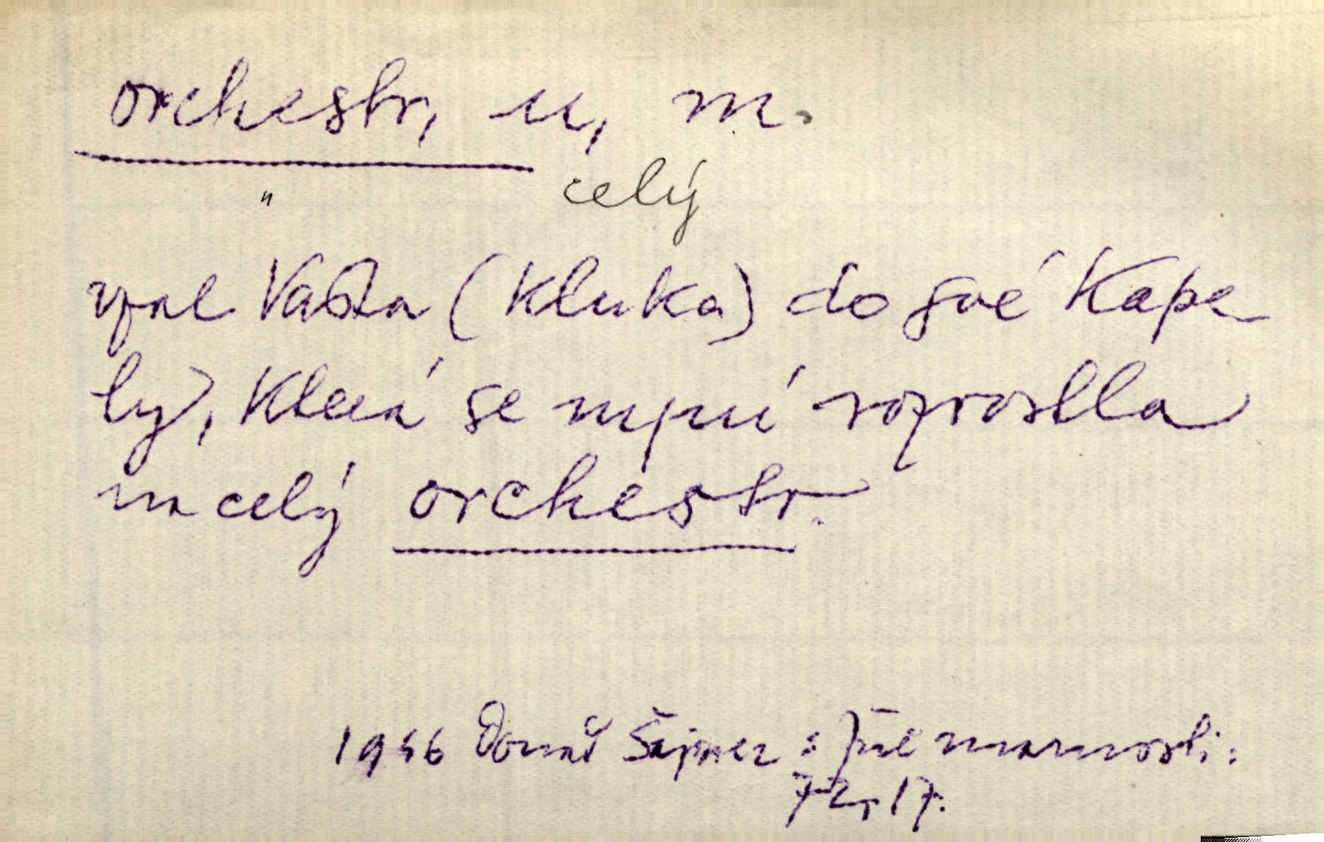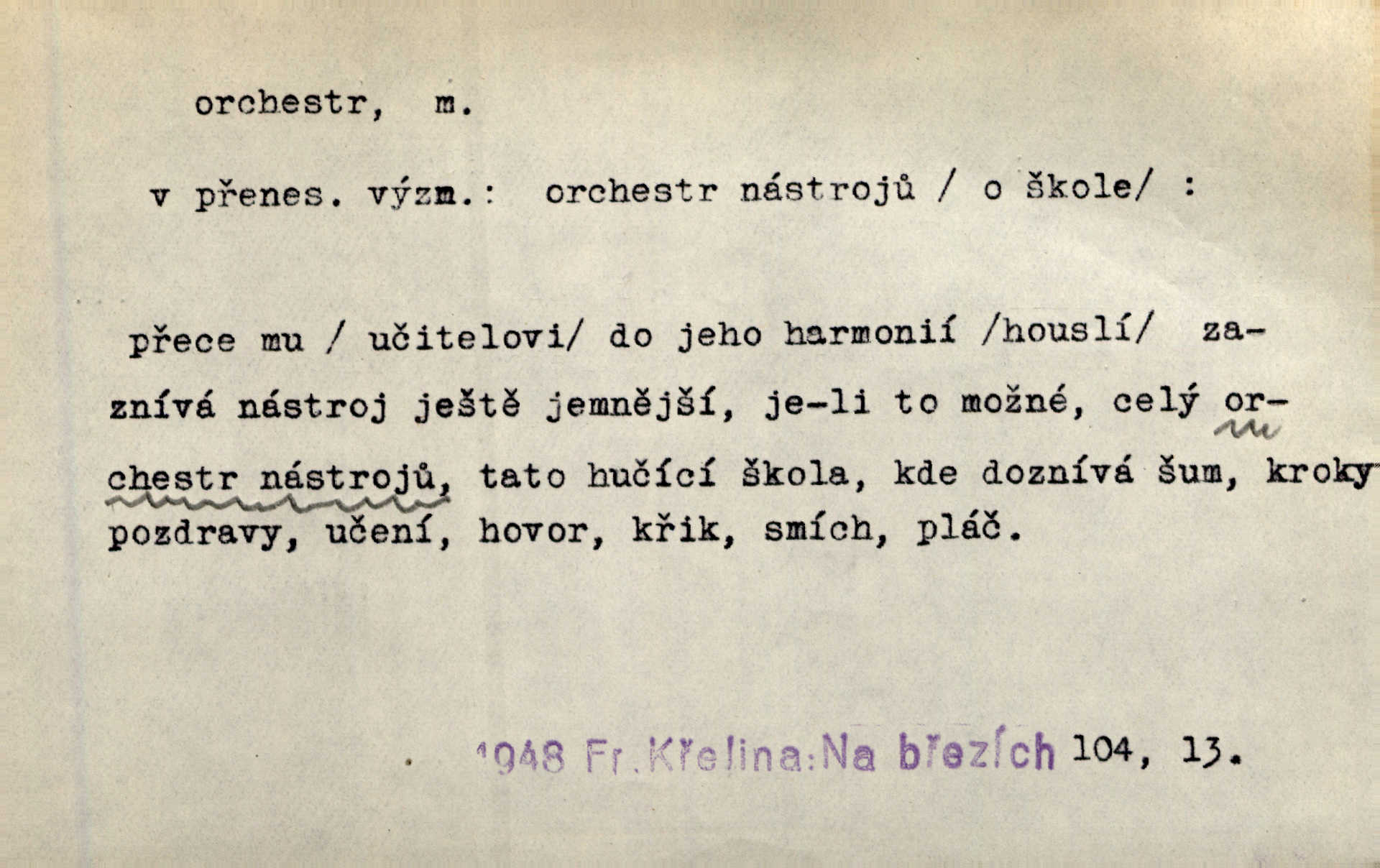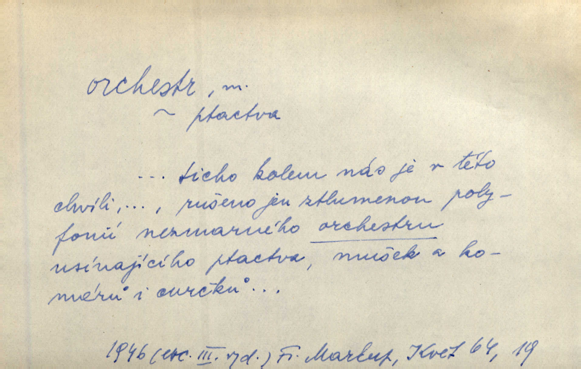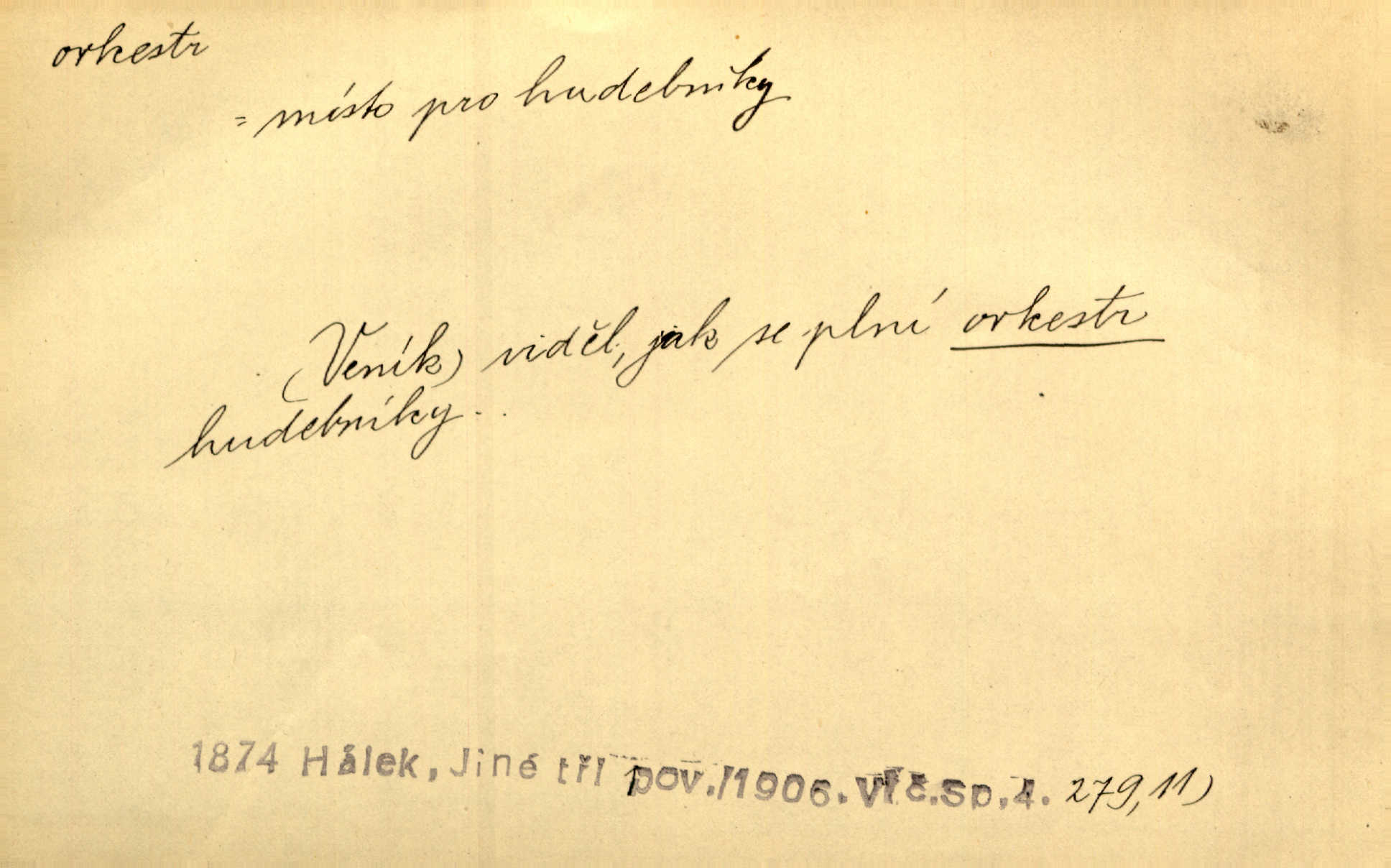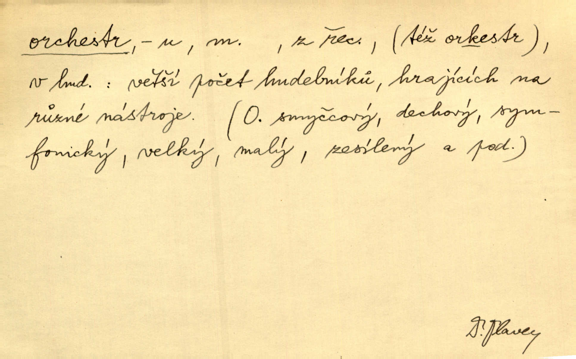 - orchestr, orkestr, -u m. hud. sbor hudebníků hrajících na různé nástroje. Orchestr symfonický, velký, malý, smyčcový, dechový a p. Přen. Orchestr hyenních a tigřích zvuků. Ner. Venku bručí, vrže, břinká větru bouřný orchestr. Krás. Redakční orchestr „Nár. Listů“ hrával velmi často bez dirigenta. Přít. Divoký orchestr italské fronty se spodní melodií dělové palby. Olb. Budu mluvit o sedmi barvách života. Ne, o celém orchestru barev. Šrám. Tam, kde mají jiní vyjádřený celý orkestr citový, v naší společnosti najdete jenom kolovrátek s klikou. R. Svob. D místo, kde jsou hudebníci při produkcích se svými nástroji umístěni. Na jevišti zkoušeli féerii. V orchestru hrála baletní hudba. R. Svob. Viděl, jak se plní orkestr hudebníky. Hál.