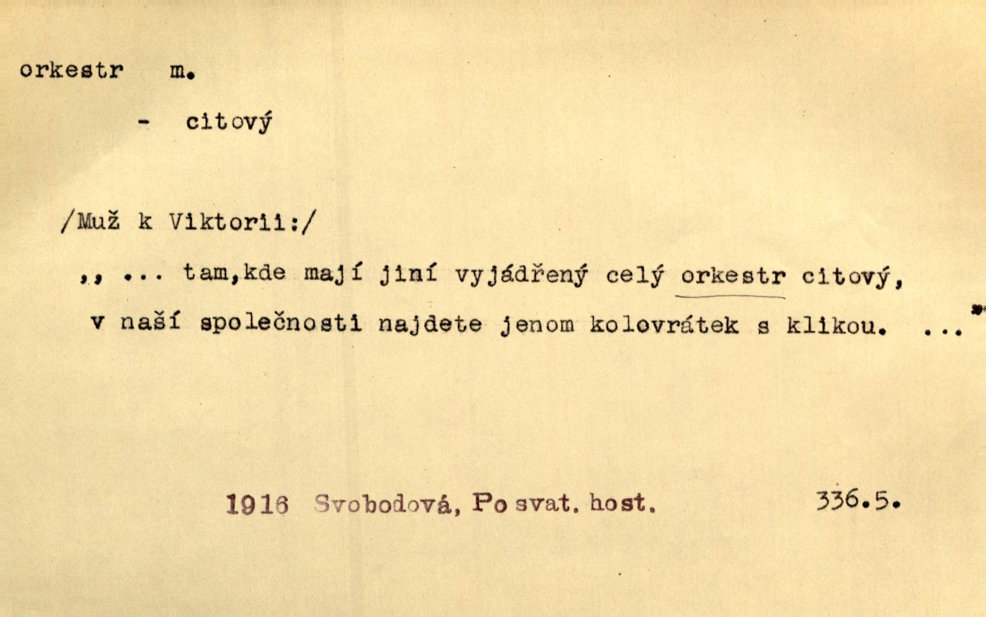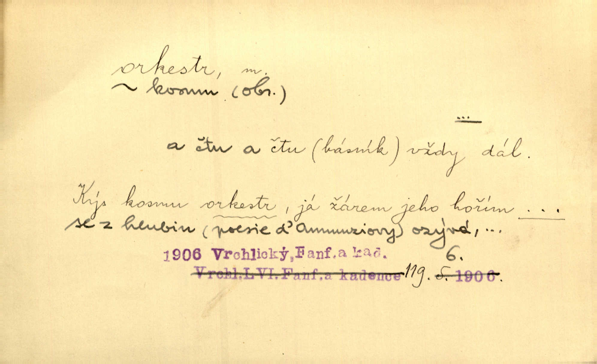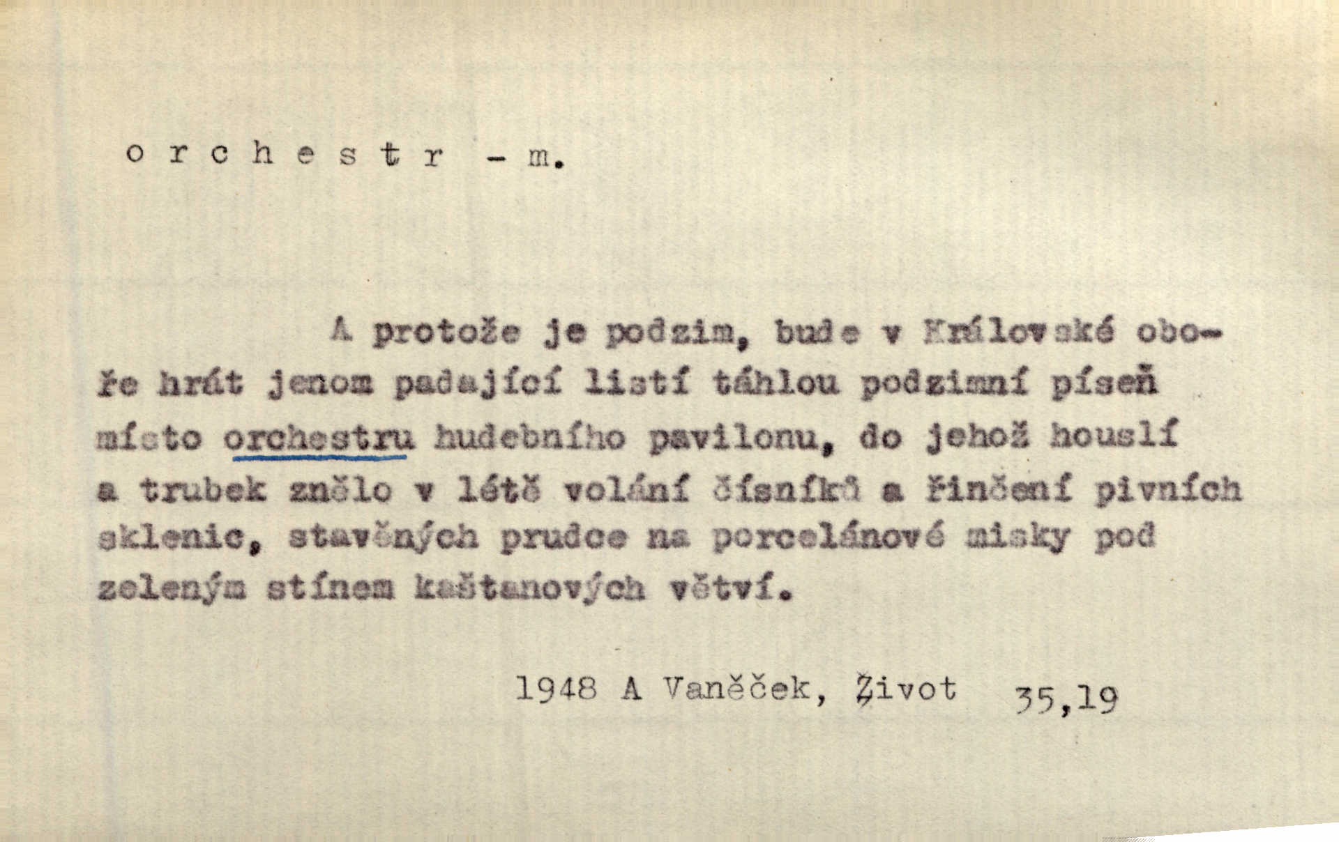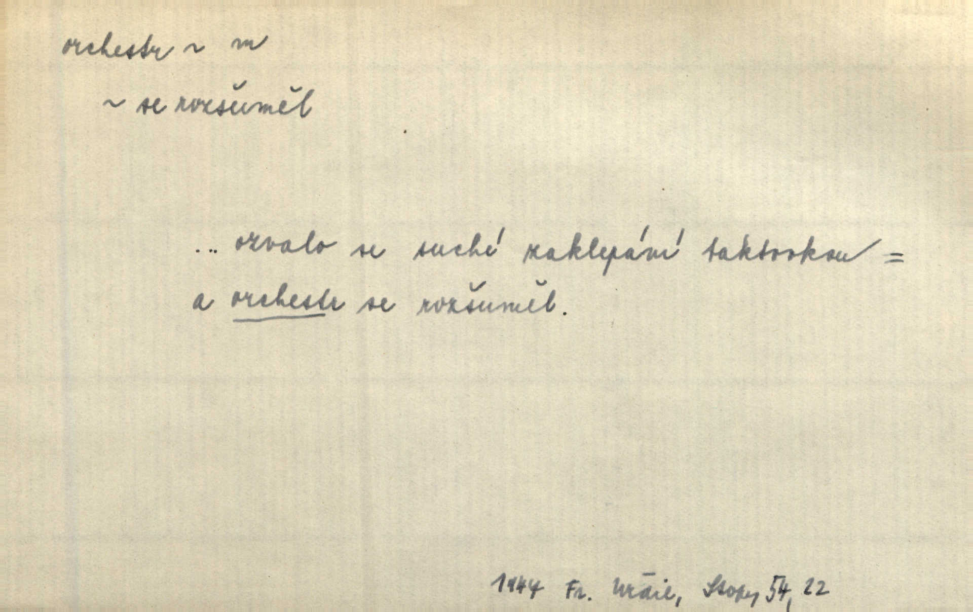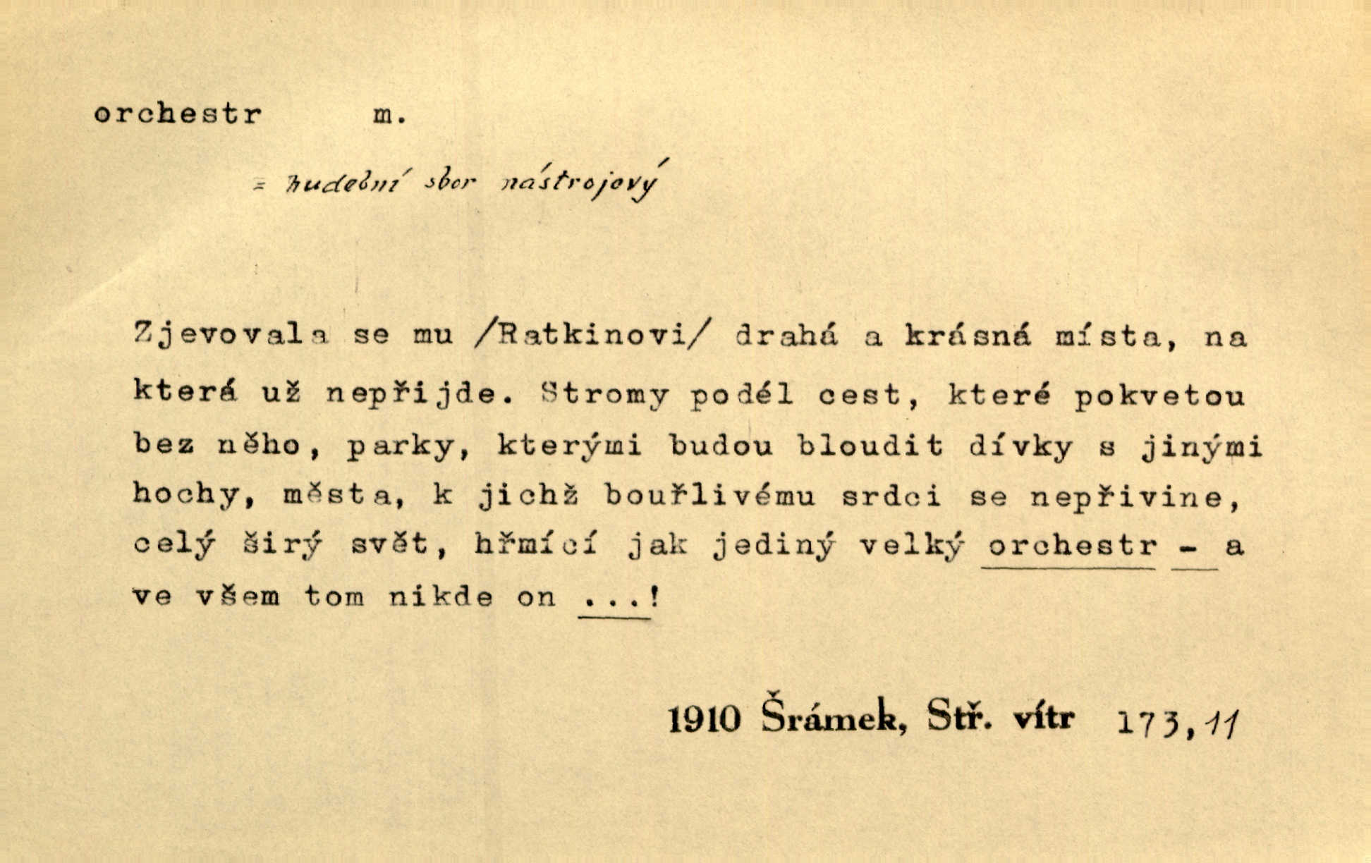 - orchestr, orkestr, -u m. hud. sbor hudebníků hrajících na různé nástroje. Orchestr symfonický, velký, malý, smyčcový, dechový a p. Přen. Orchestr hyenních a tigřích zvuků. Ner. Venku bručí, vrže, břinká větru bouřný orchestr. Krás. Redakční orchestr „Nár. Listů“ hrával velmi často bez dirigenta. Přít. Divoký orchestr italské fronty se spodní melodií dělové palby. Olb. Budu mluvit o sedmi barvách života. Ne, o celém orchestru barev. Šrám. Tam, kde mají jiní vyjádřený celý orkestr citový, v naší společnosti najdete jenom kolovrátek s klikou. R. Svob. D místo, kde jsou hudebníci při produkcích se svými nástroji umístěni. Na jevišti zkoušeli féerii. V orchestru hrála baletní hudba. R. Svob. Viděl, jak se plní orkestr hudebníky. Hál.