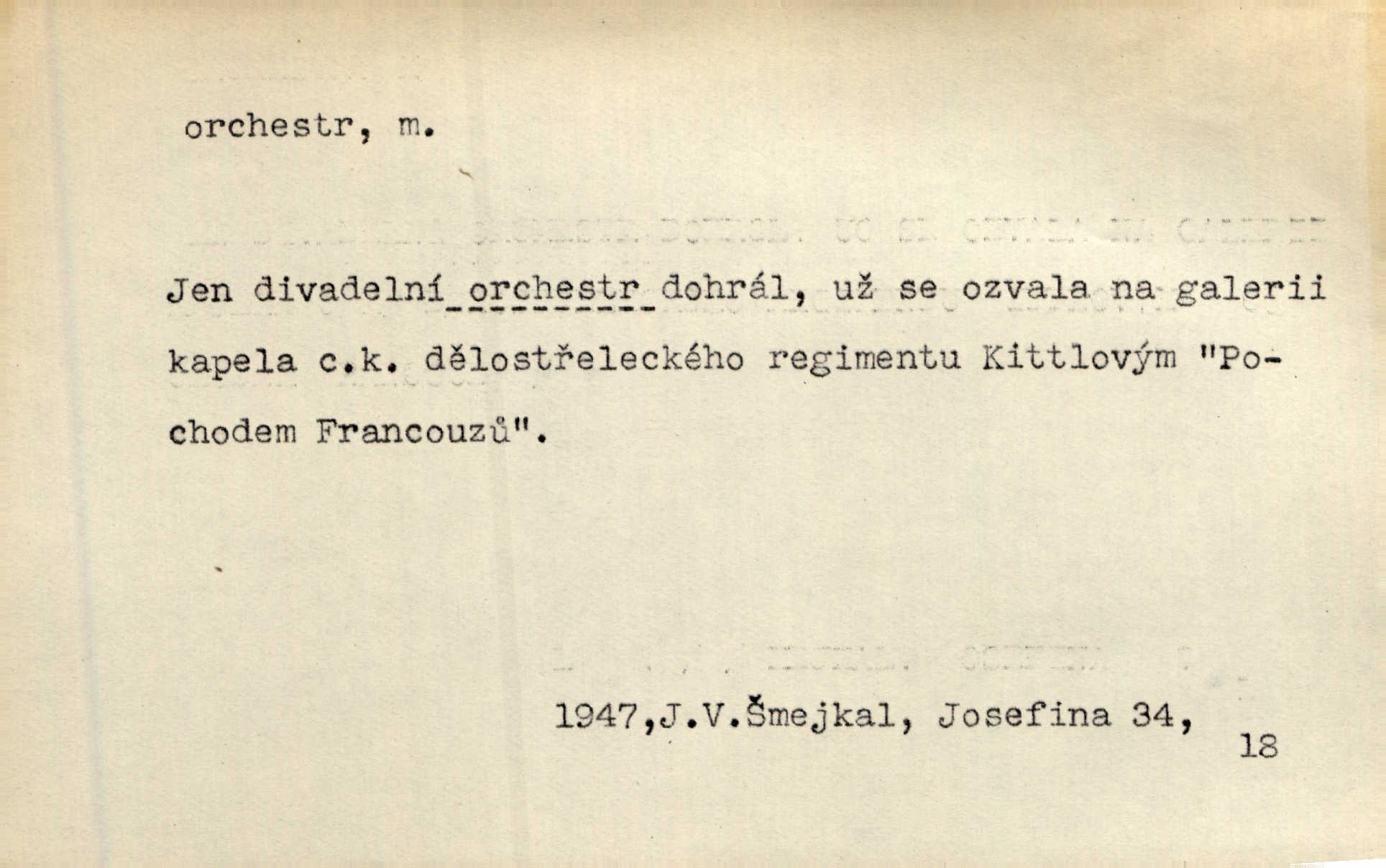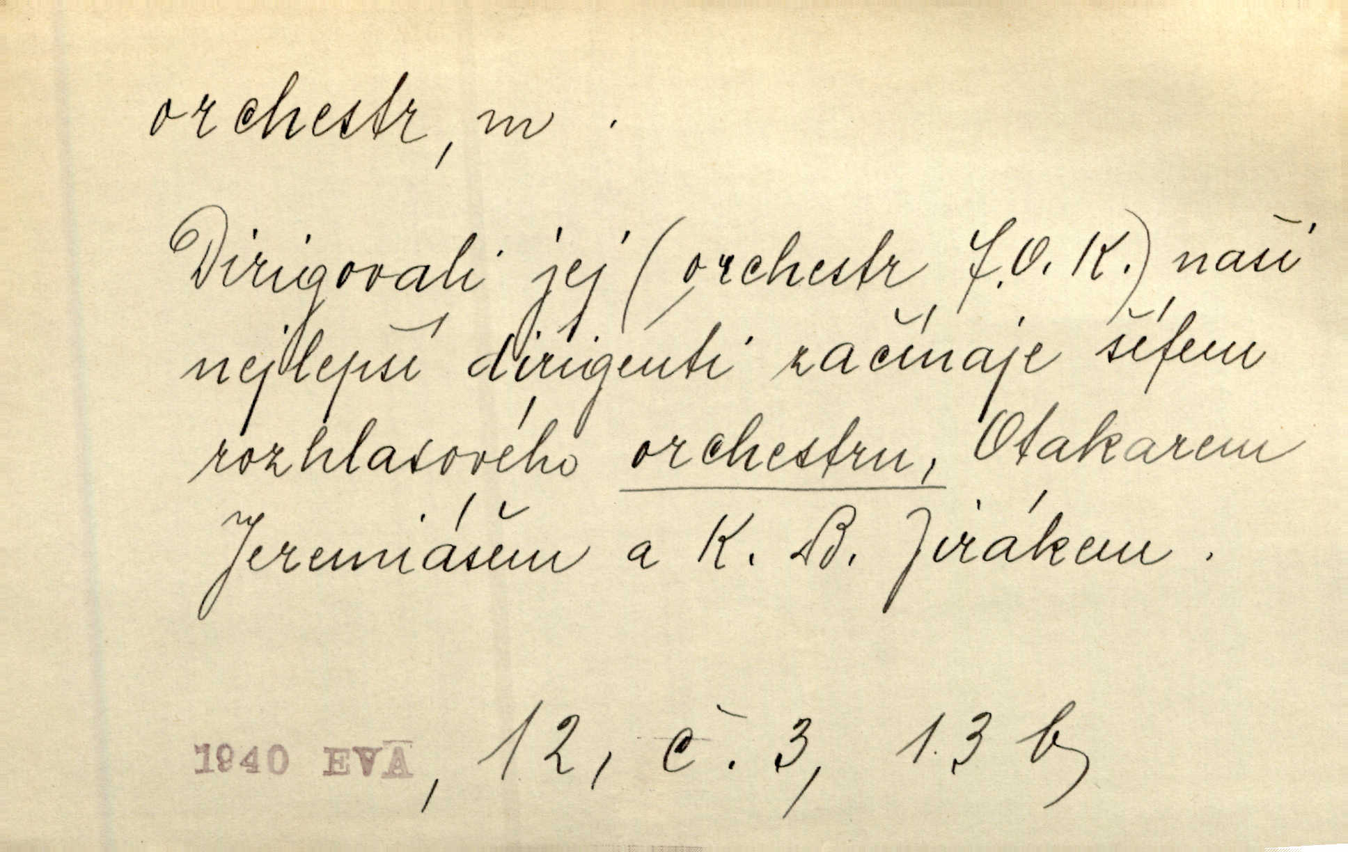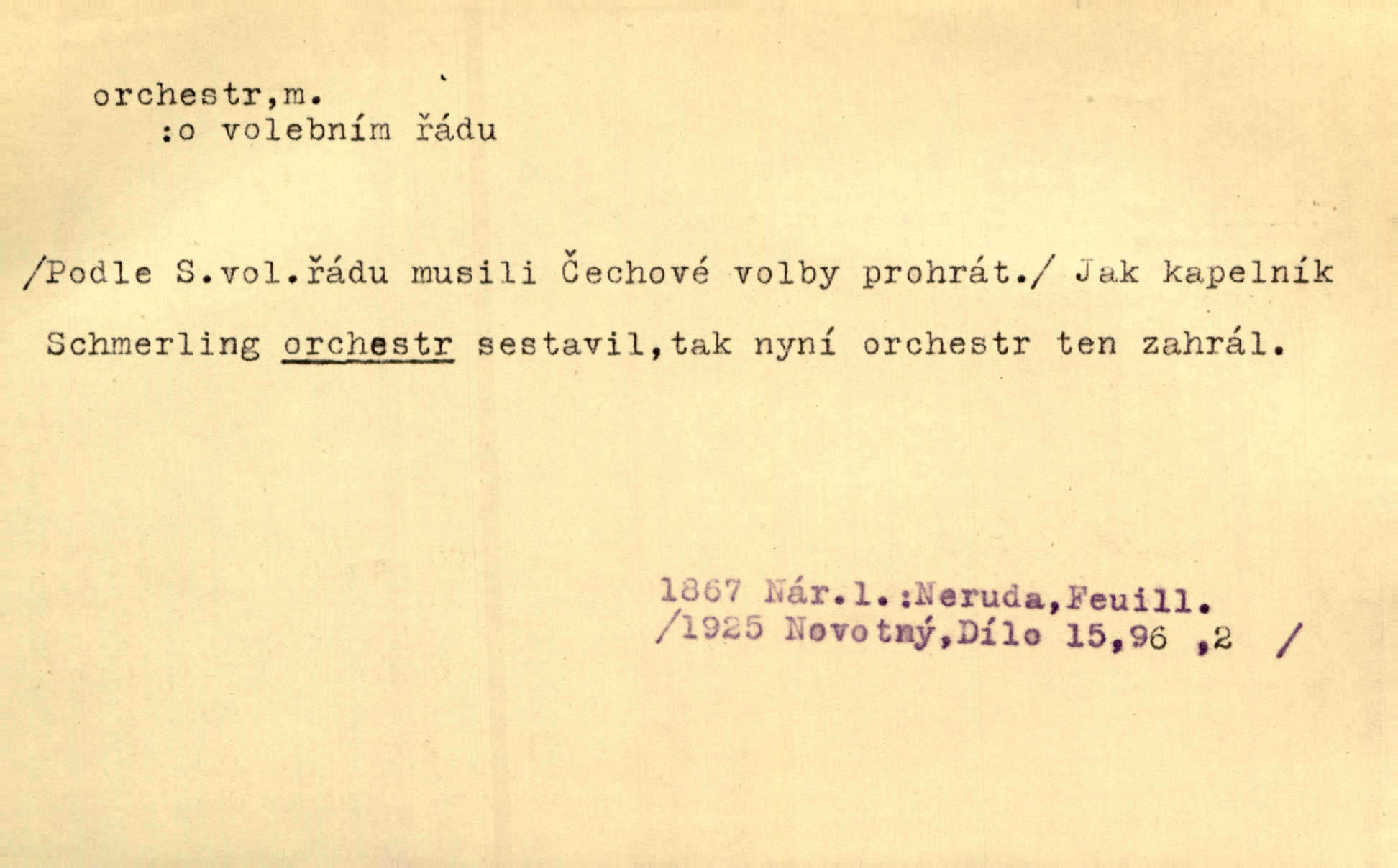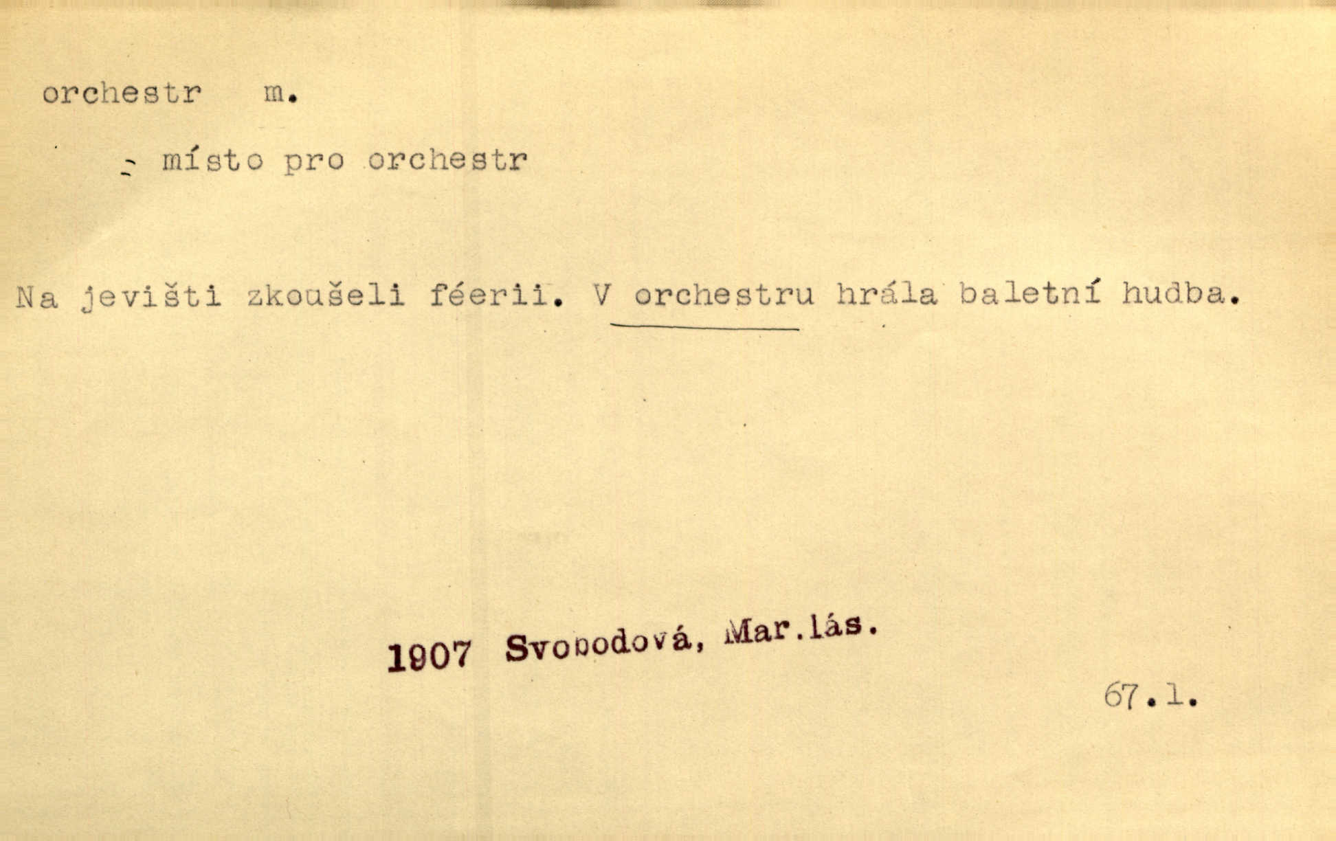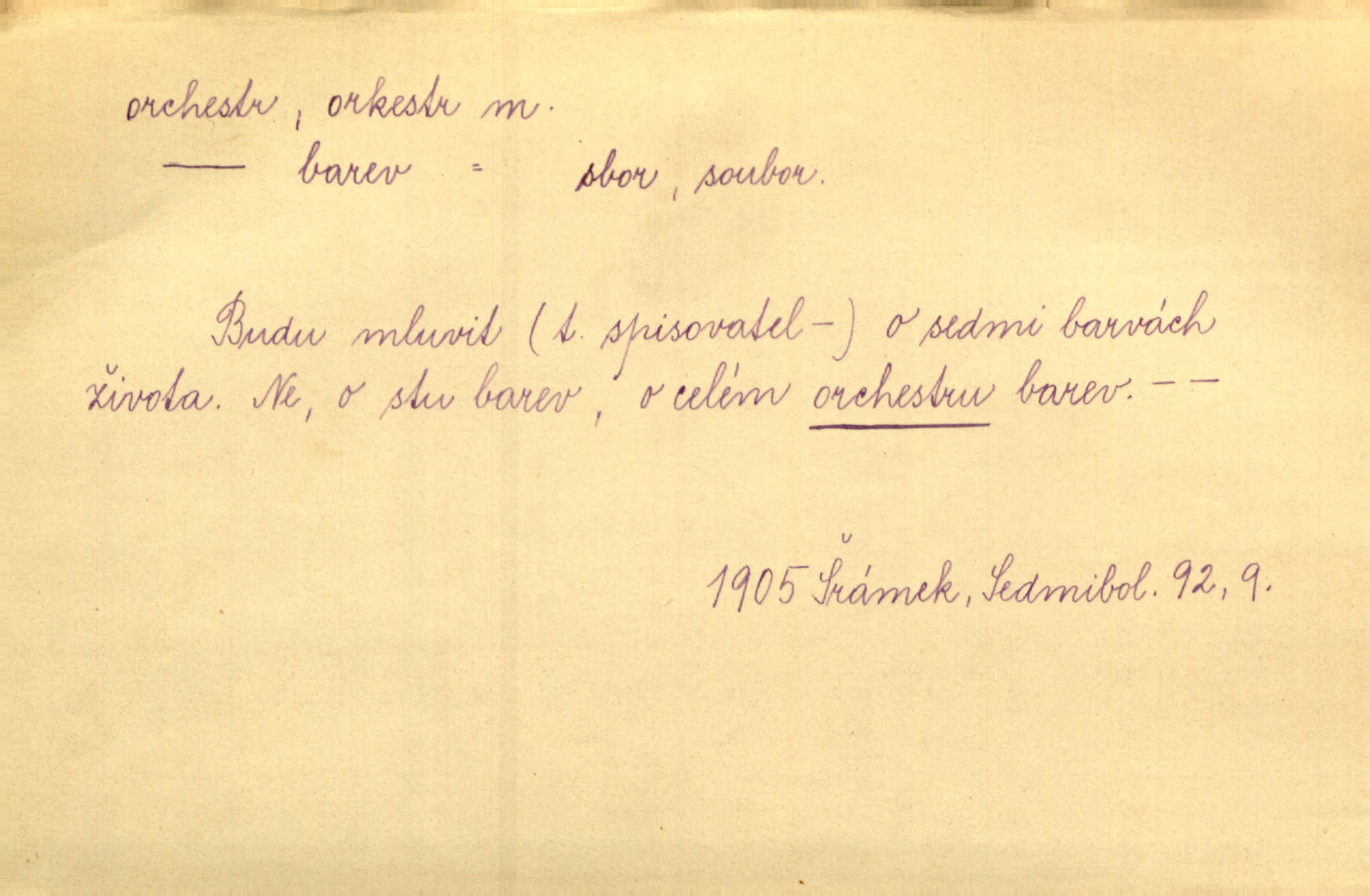 - orchestr, orkestr, -u m. hud. sbor hudebníků hrajících na různé nástroje. Orchestr symfonický, velký, malý, smyčcový, dechový a p. Přen. Orchestr hyenních a tigřích zvuků. Ner. Venku bručí, vrže, břinká větru bouřný orchestr. Krás. Redakční orchestr „Nár. Listů“ hrával velmi často bez dirigenta. Přít. Divoký orchestr italské fronty se spodní melodií dělové palby. Olb. Budu mluvit o sedmi barvách života. Ne, o celém orchestru barev. Šrám. Tam, kde mají jiní vyjádřený celý orkestr citový, v naší společnosti najdete jenom kolovrátek s klikou. R. Svob. D místo, kde jsou hudebníci při produkcích se svými nástroji umístěni. Na jevišti zkoušeli féerii. V orchestru hrála baletní hudba. R. Svob. Viděl, jak se plní orkestr hudebníky. Hál.