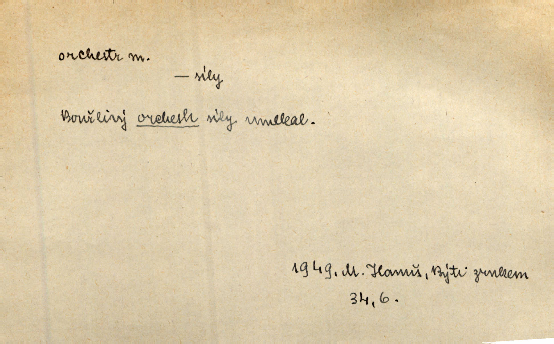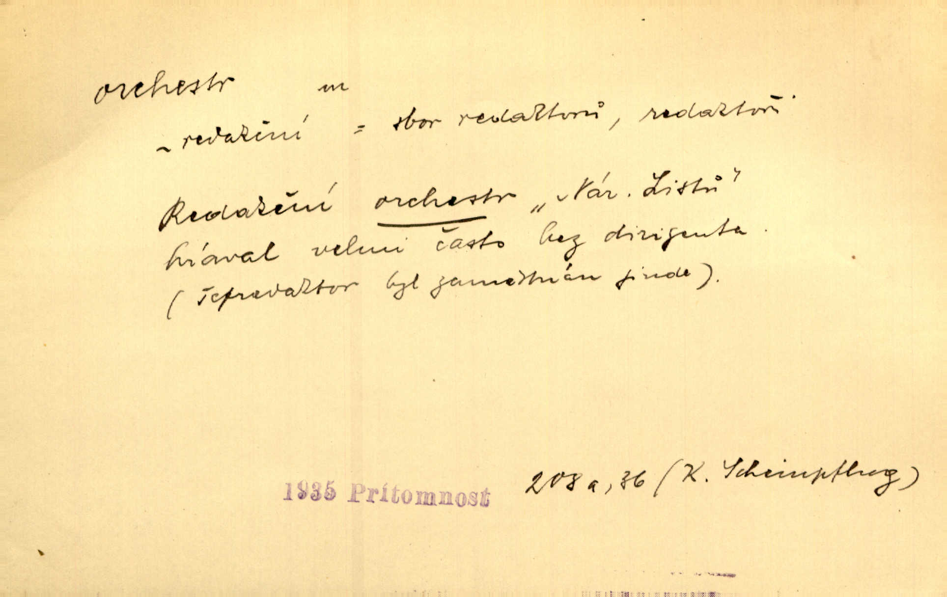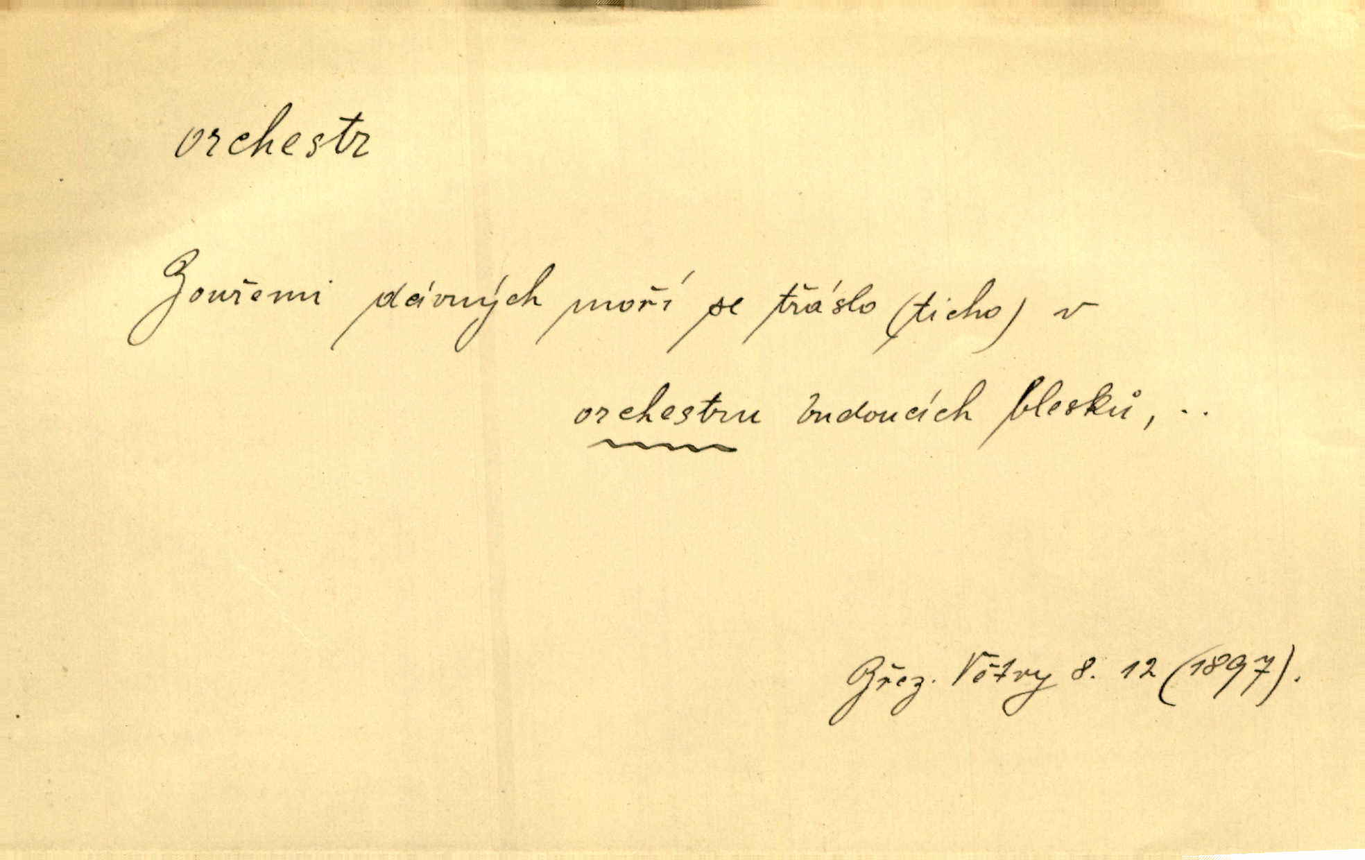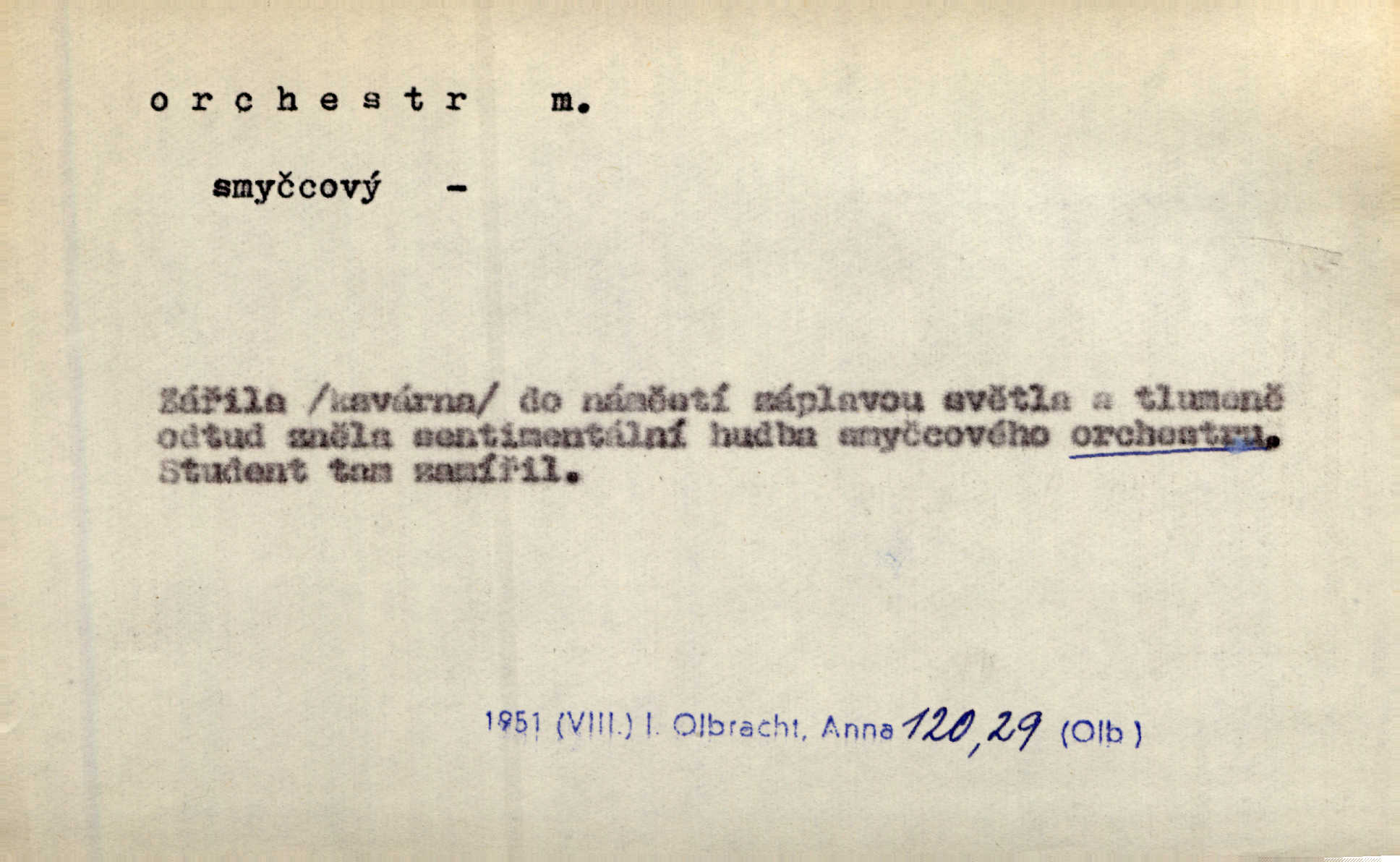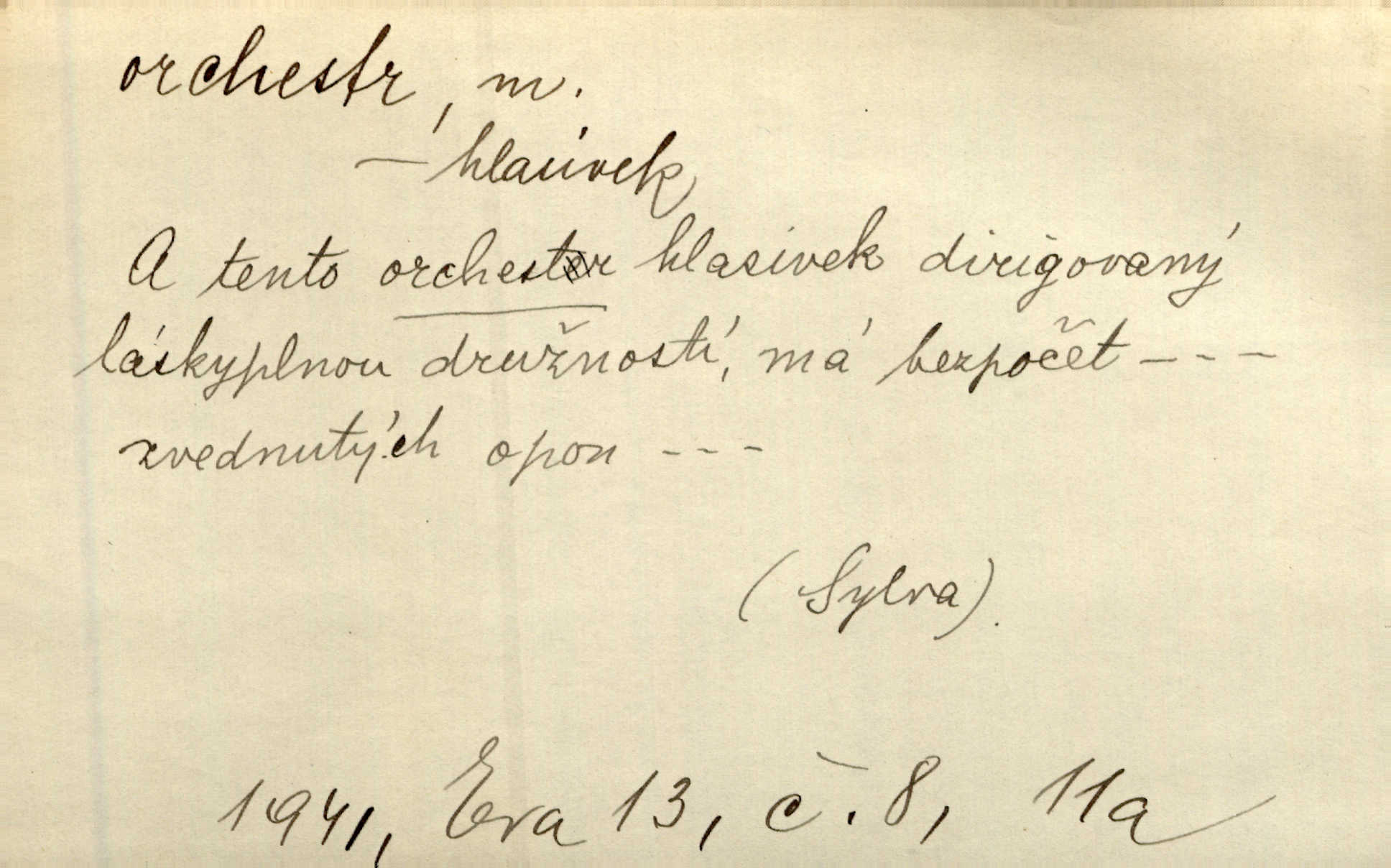 - orchestr, orkestr, -u m. hud. sbor hudebníků hrajících na různé nástroje. Orchestr symfonický, velký, malý, smyčcový, dechový a p. Přen. Orchestr hyenních a tigřích zvuků. Ner. Venku bručí, vrže, břinká větru bouřný orchestr. Krás. Redakční orchestr „Nár. Listů“ hrával velmi často bez dirigenta. Přít. Divoký orchestr italské fronty se spodní melodií dělové palby. Olb. Budu mluvit o sedmi barvách života. Ne, o celém orchestru barev. Šrám. Tam, kde mají jiní vyjádřený celý orkestr citový, v naší společnosti najdete jenom kolovrátek s klikou. R. Svob. D místo, kde jsou hudebníci při produkcích se svými nástroji umístěni. Na jevišti zkoušeli féerii. V orchestru hrála baletní hudba. R. Svob. Viděl, jak se plní orkestr hudebníky. Hál.