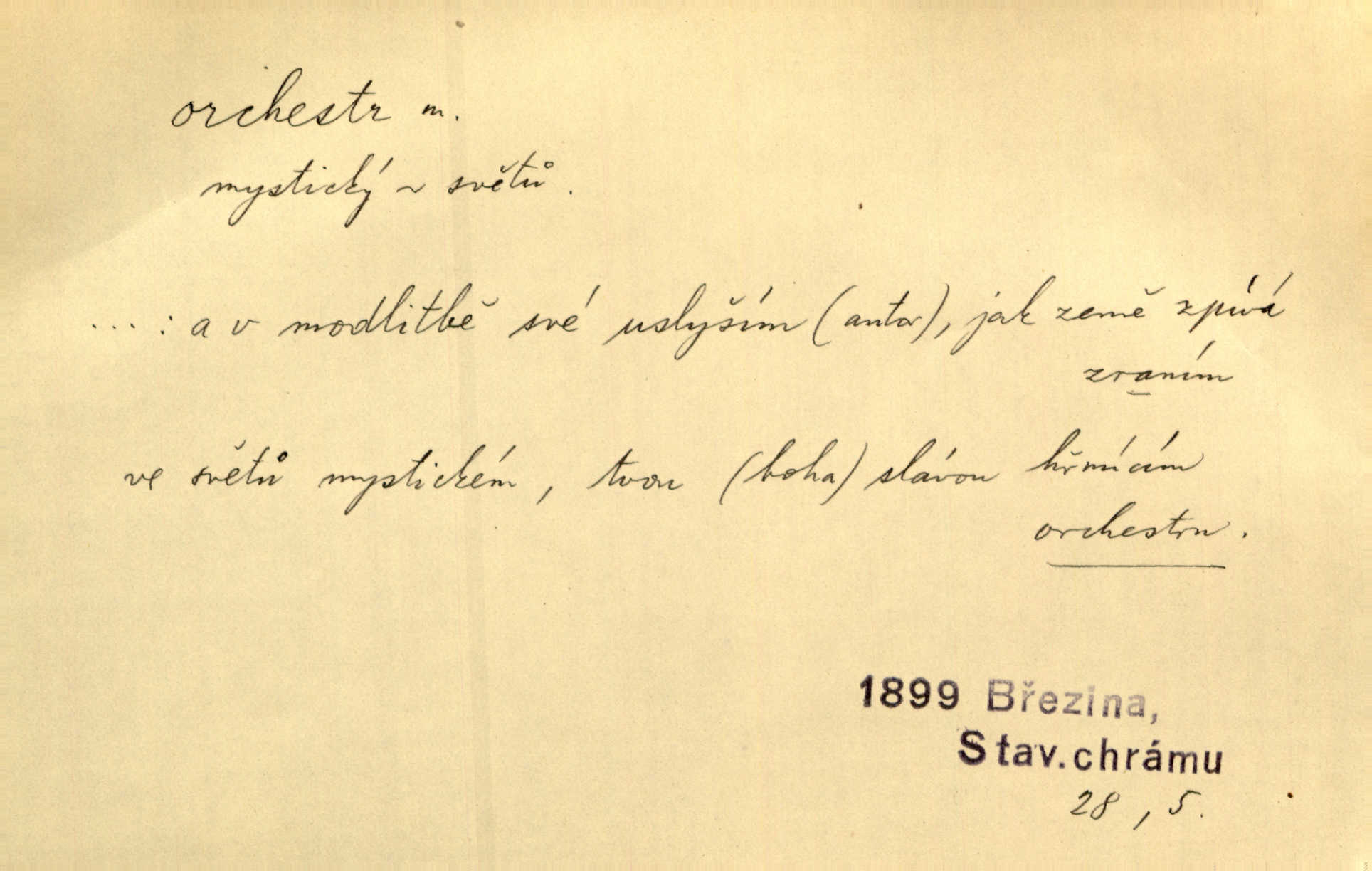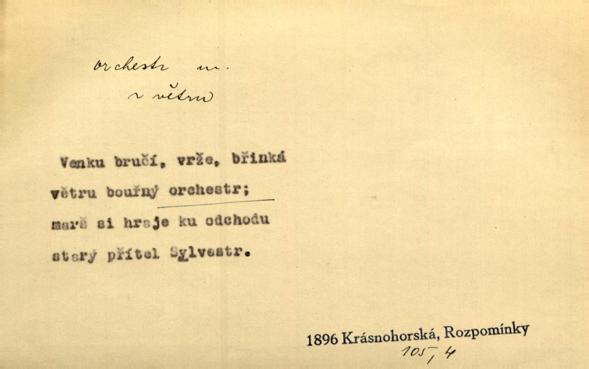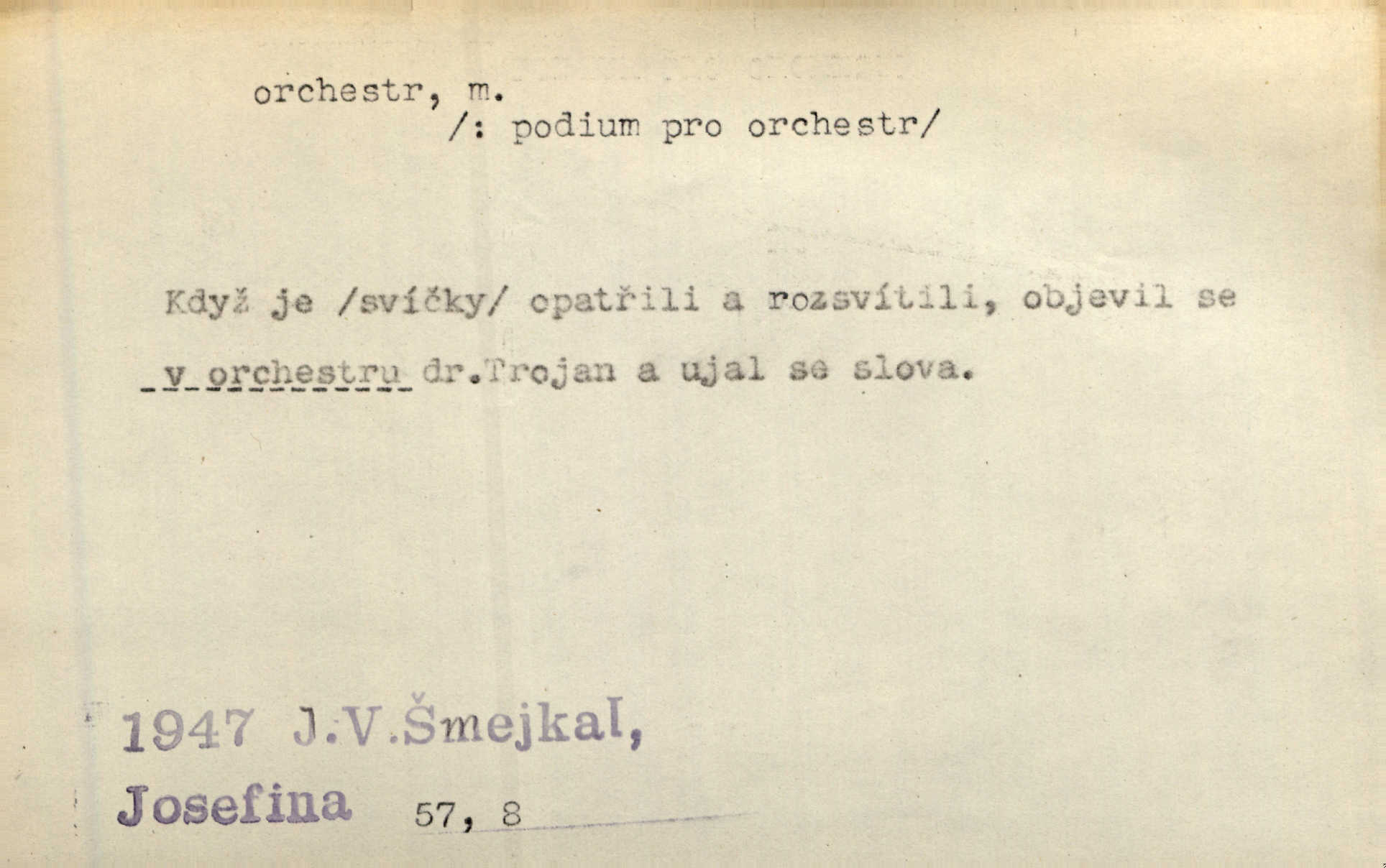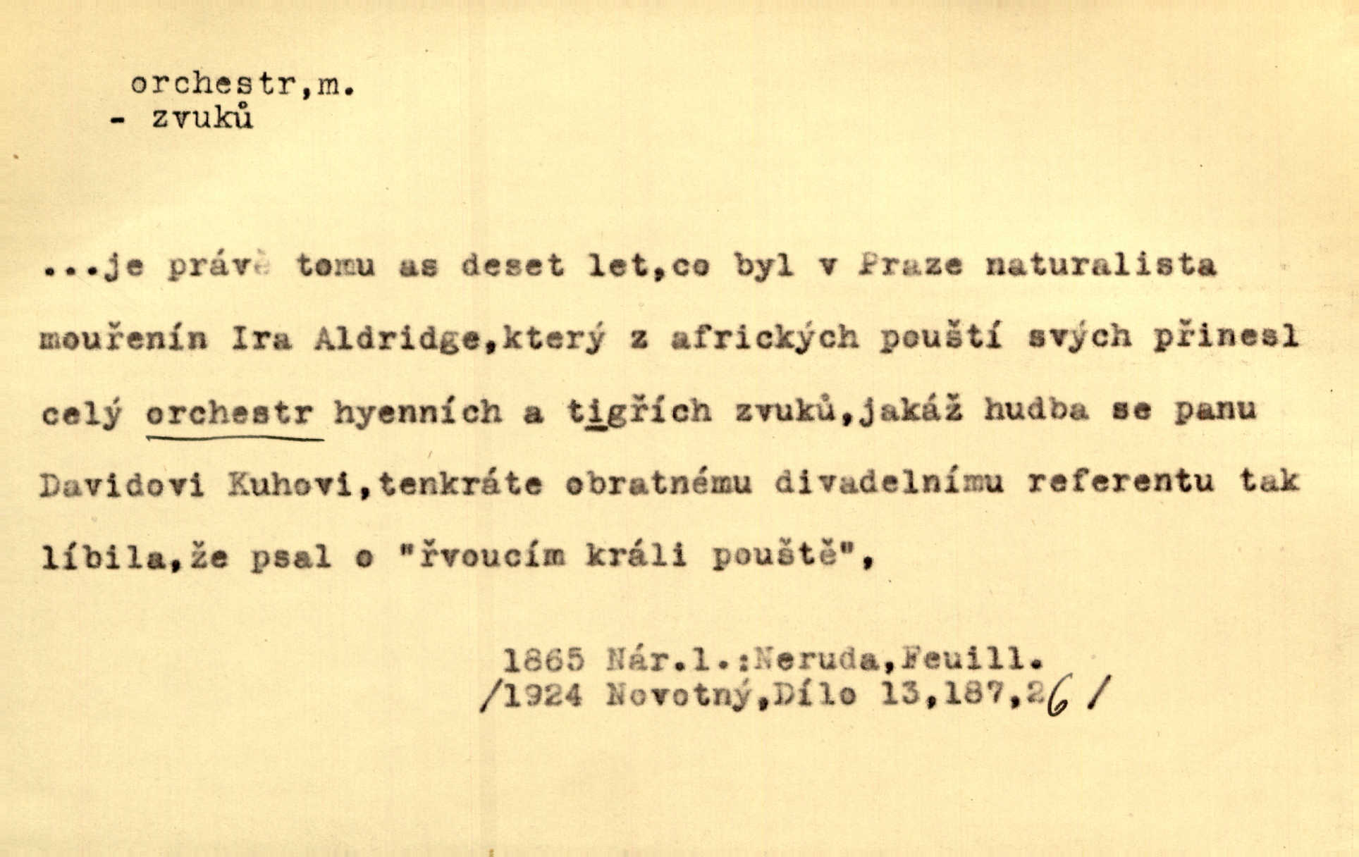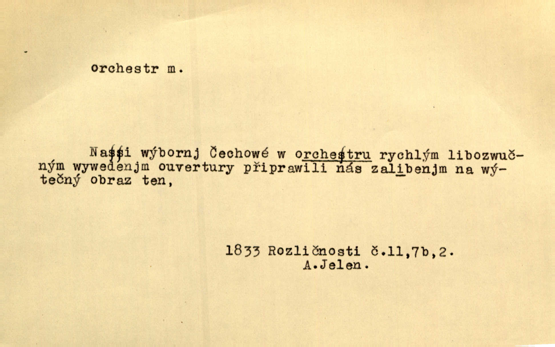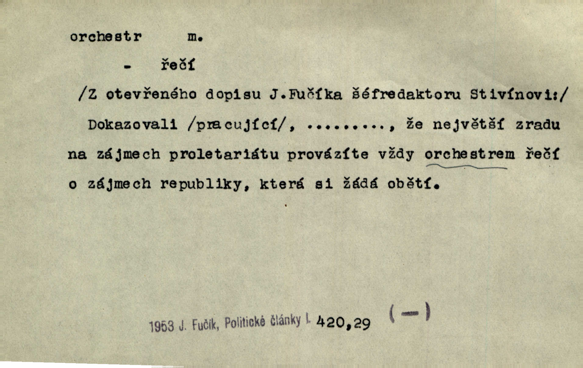 - orchestr, orkestr, -u m. hud. sbor hudebníků hrajících na různé nástroje. Orchestr symfonický, velký, malý, smyčcový, dechový a p. Přen. Orchestr hyenních a tigřích zvuků. Ner. Venku bručí, vrže, břinká větru bouřný orchestr. Krás. Redakční orchestr „Nár. Listů“ hrával velmi často bez dirigenta. Přít. Divoký orchestr italské fronty se spodní melodií dělové palby. Olb. Budu mluvit o sedmi barvách života. Ne, o celém orchestru barev. Šrám. Tam, kde mají jiní vyjádřený celý orkestr citový, v naší společnosti najdete jenom kolovrátek s klikou. R. Svob. D místo, kde jsou hudebníci při produkcích se svými nástroji umístěni. Na jevišti zkoušeli féerii. V orchestru hrála baletní hudba. R. Svob. Viděl, jak se plní orkestr hudebníky. Hál.
