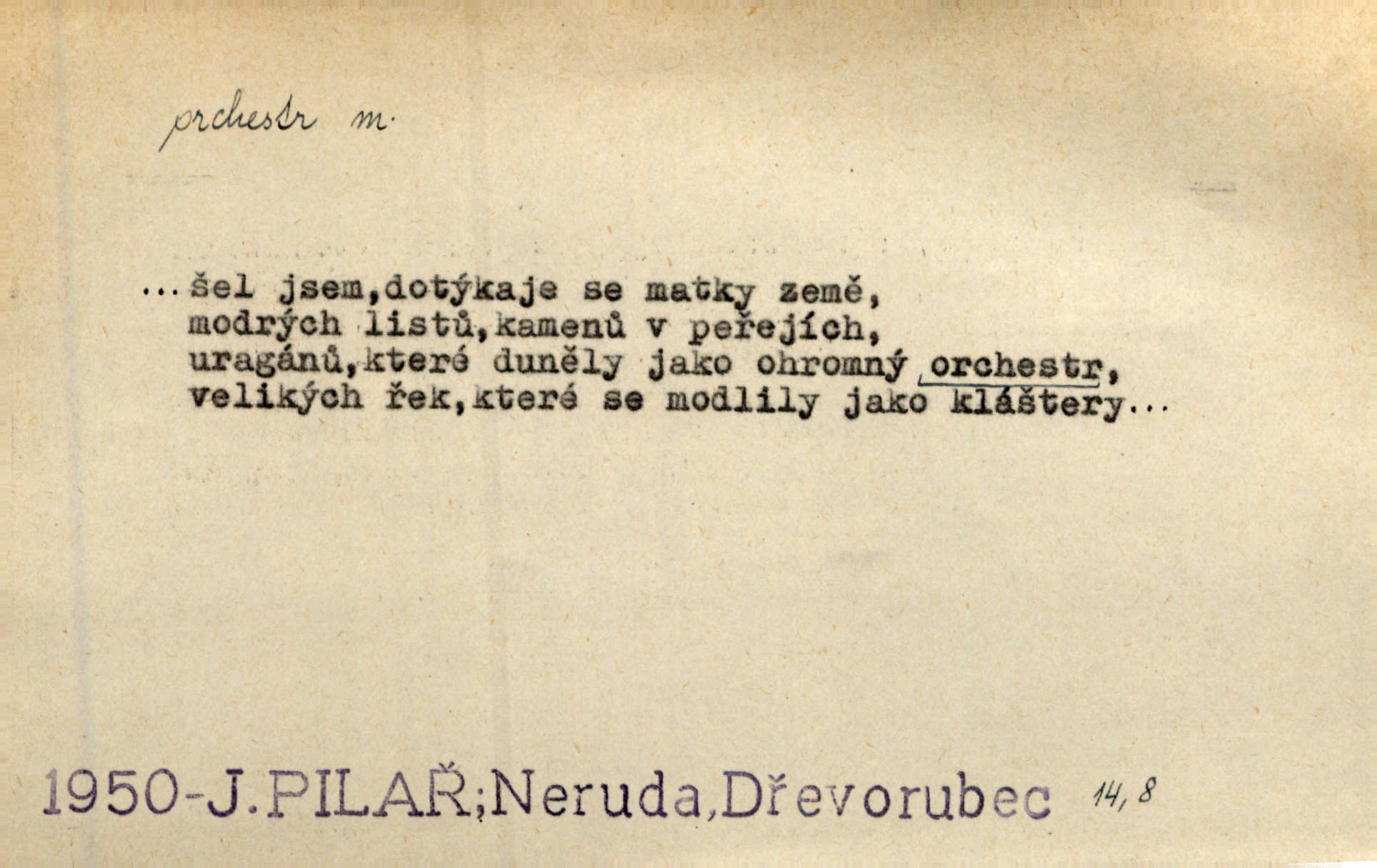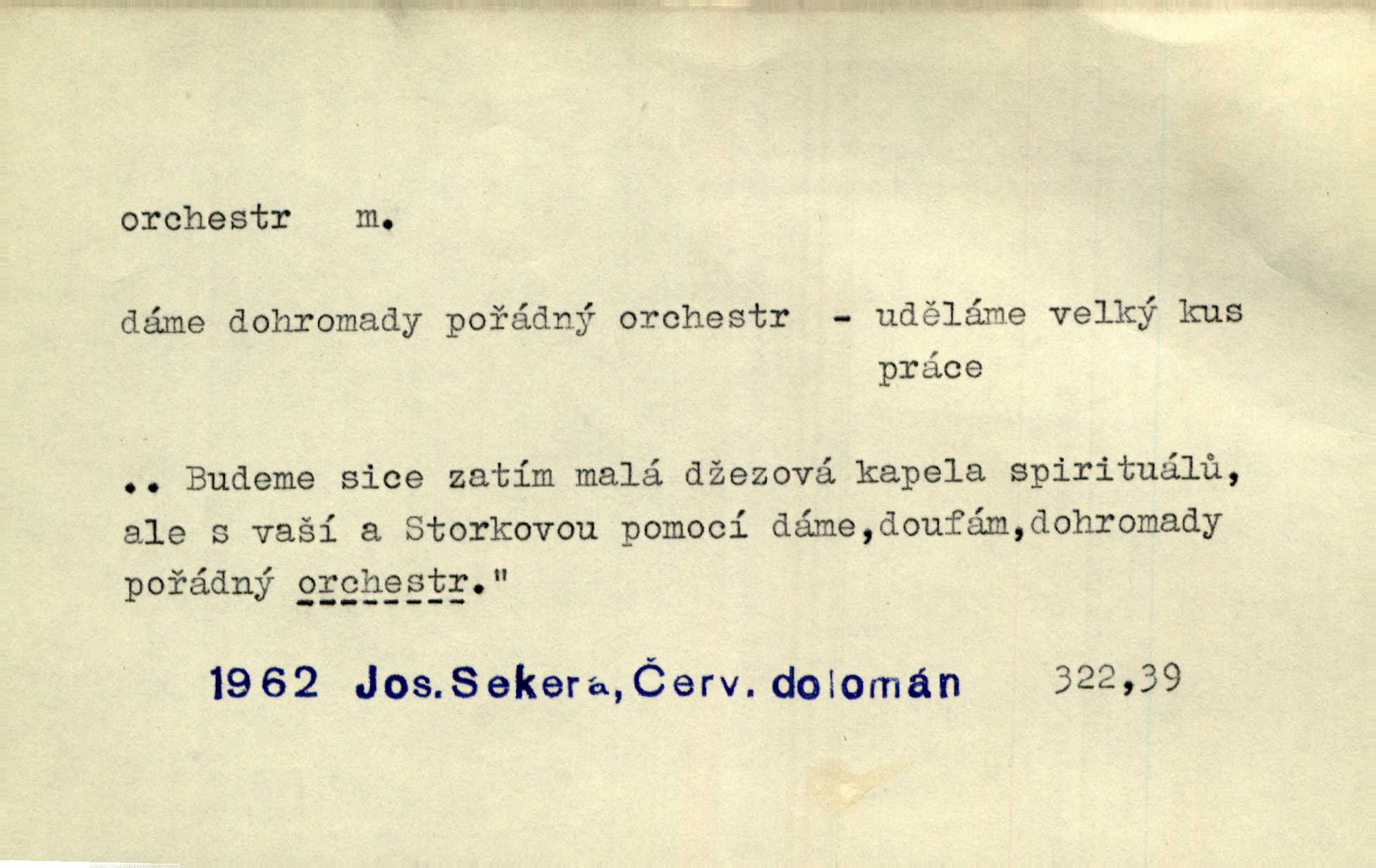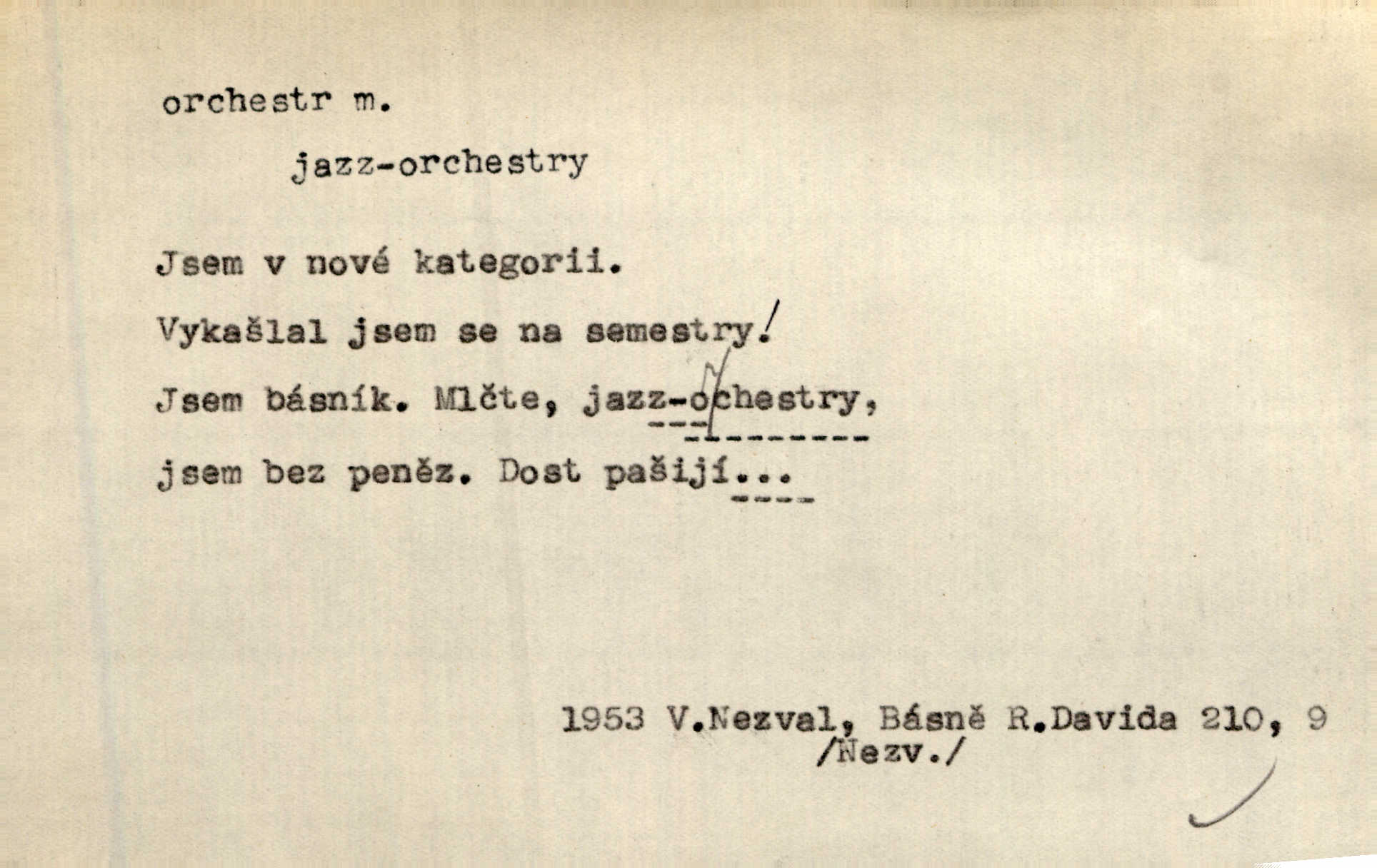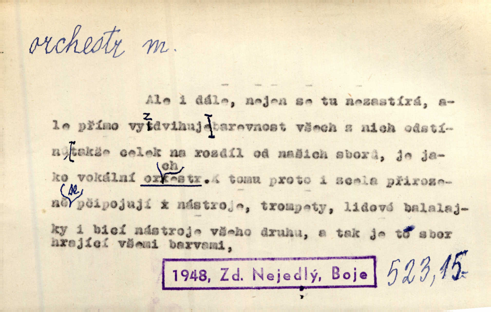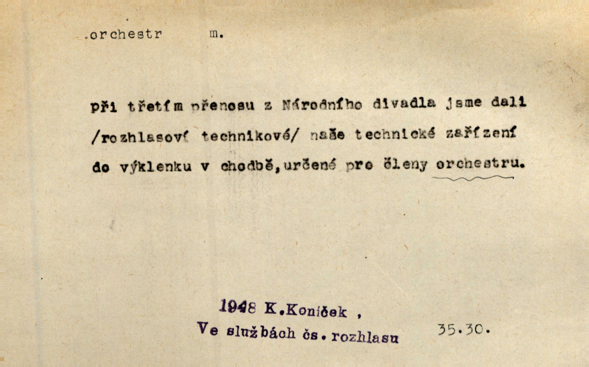 - orchestr, orkestr, -u m. hud. sbor hudebníků hrajících na různé nástroje. Orchestr symfonický, velký, malý, smyčcový, dechový a p. Přen. Orchestr hyenních a tigřích zvuků. Ner. Venku bručí, vrže, břinká větru bouřný orchestr. Krás. Redakční orchestr „Nár. Listů“ hrával velmi často bez dirigenta. Přít. Divoký orchestr italské fronty se spodní melodií dělové palby. Olb. Budu mluvit o sedmi barvách života. Ne, o celém orchestru barev. Šrám. Tam, kde mají jiní vyjádřený celý orkestr citový, v naší společnosti najdete jenom kolovrátek s klikou. R. Svob. D místo, kde jsou hudebníci při produkcích se svými nástroji umístěni. Na jevišti zkoušeli féerii. V orchestru hrála baletní hudba. R. Svob. Viděl, jak se plní orkestr hudebníky. Hál.