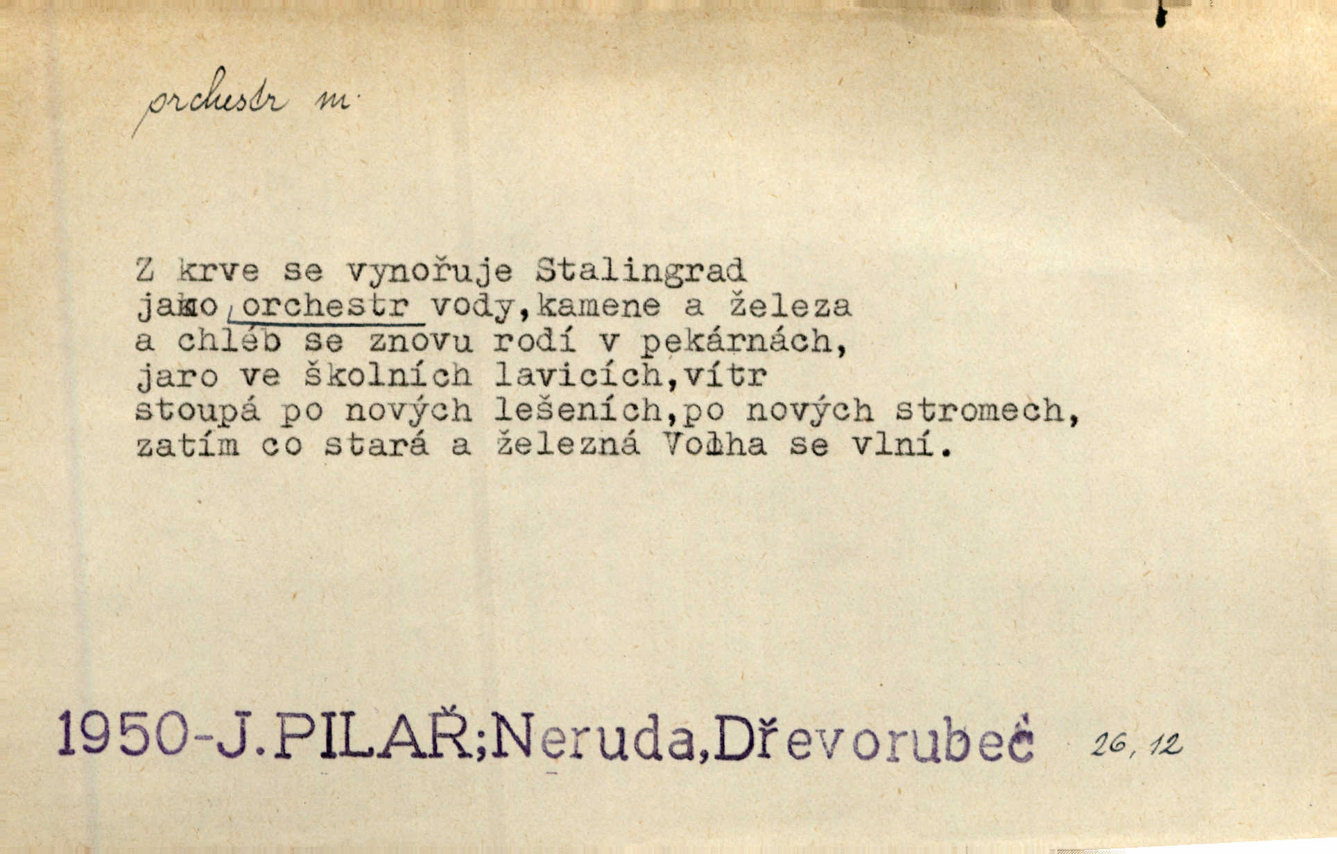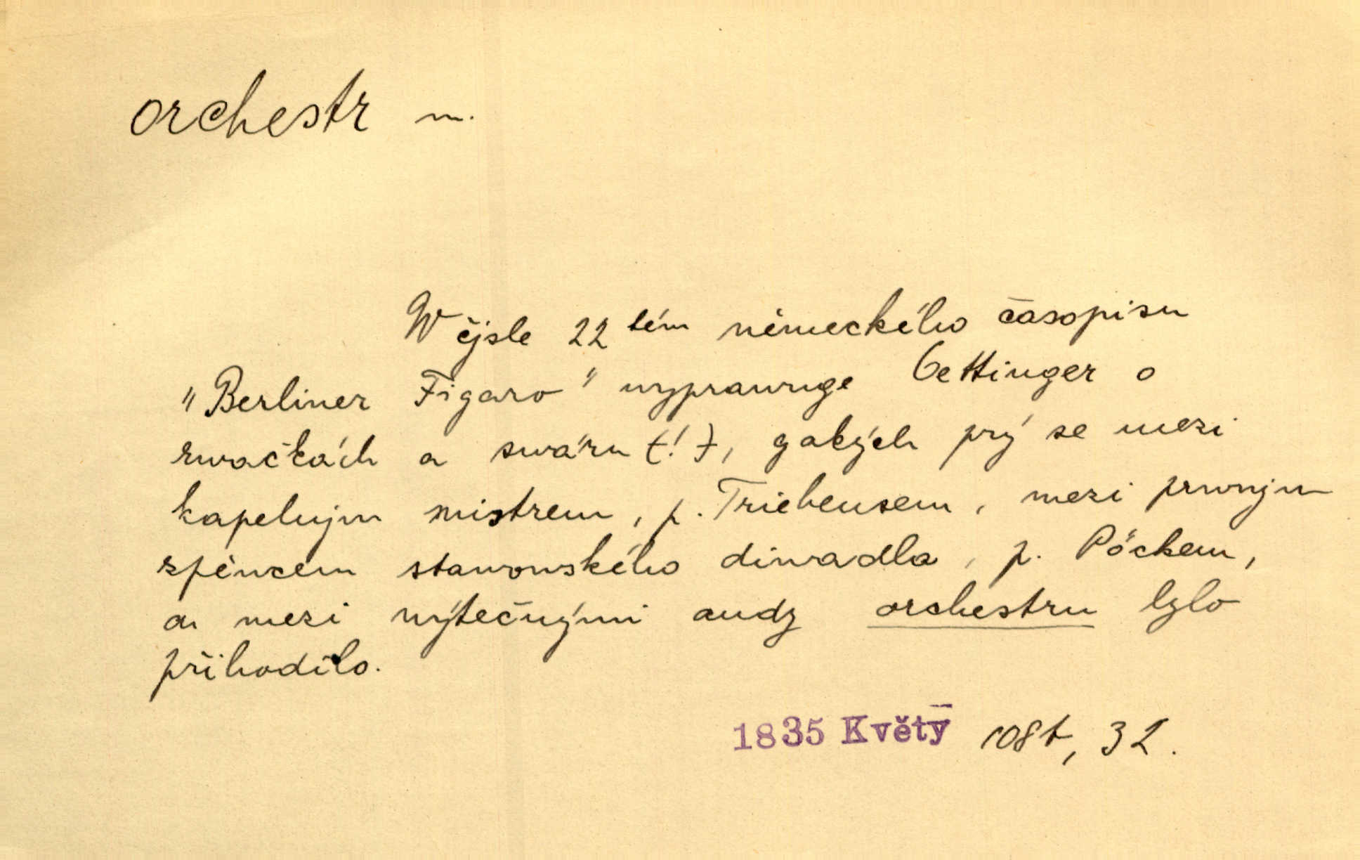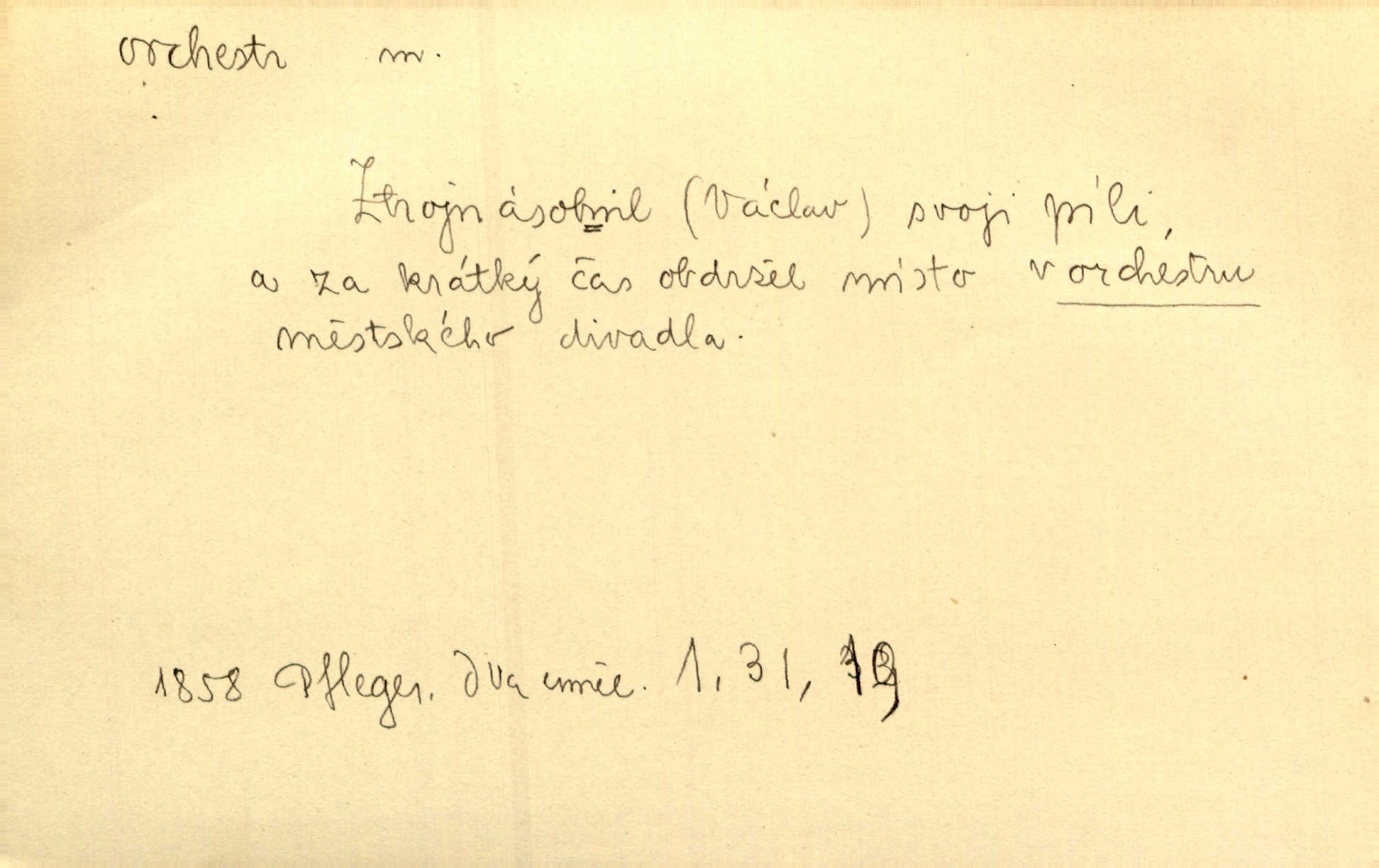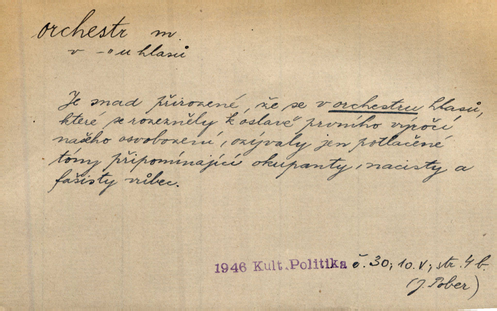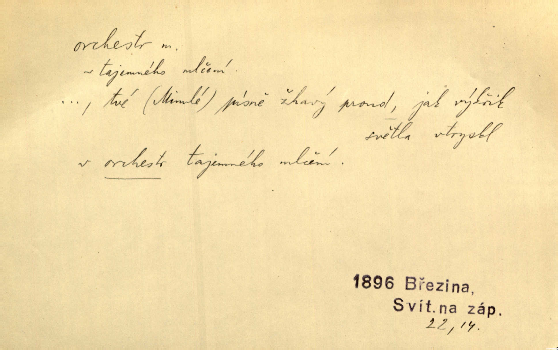 - orchestr, orkestr, -u m. hud. sbor hudebníků hrajících na různé nástroje. Orchestr symfonický, velký, malý, smyčcový, dechový a p. Přen. Orchestr hyenních a tigřích zvuků. Ner. Venku bručí, vrže, břinká větru bouřný orchestr. Krás. Redakční orchestr „Nár. Listů“ hrával velmi často bez dirigenta. Přít. Divoký orchestr italské fronty se spodní melodií dělové palby. Olb. Budu mluvit o sedmi barvách života. Ne, o celém orchestru barev. Šrám. Tam, kde mají jiní vyjádřený celý orkestr citový, v naší společnosti najdete jenom kolovrátek s klikou. R. Svob. D místo, kde jsou hudebníci při produkcích se svými nástroji umístěni. Na jevišti zkoušeli féerii. V orchestru hrála baletní hudba. R. Svob. Viděl, jak se plní orkestr hudebníky. Hál.