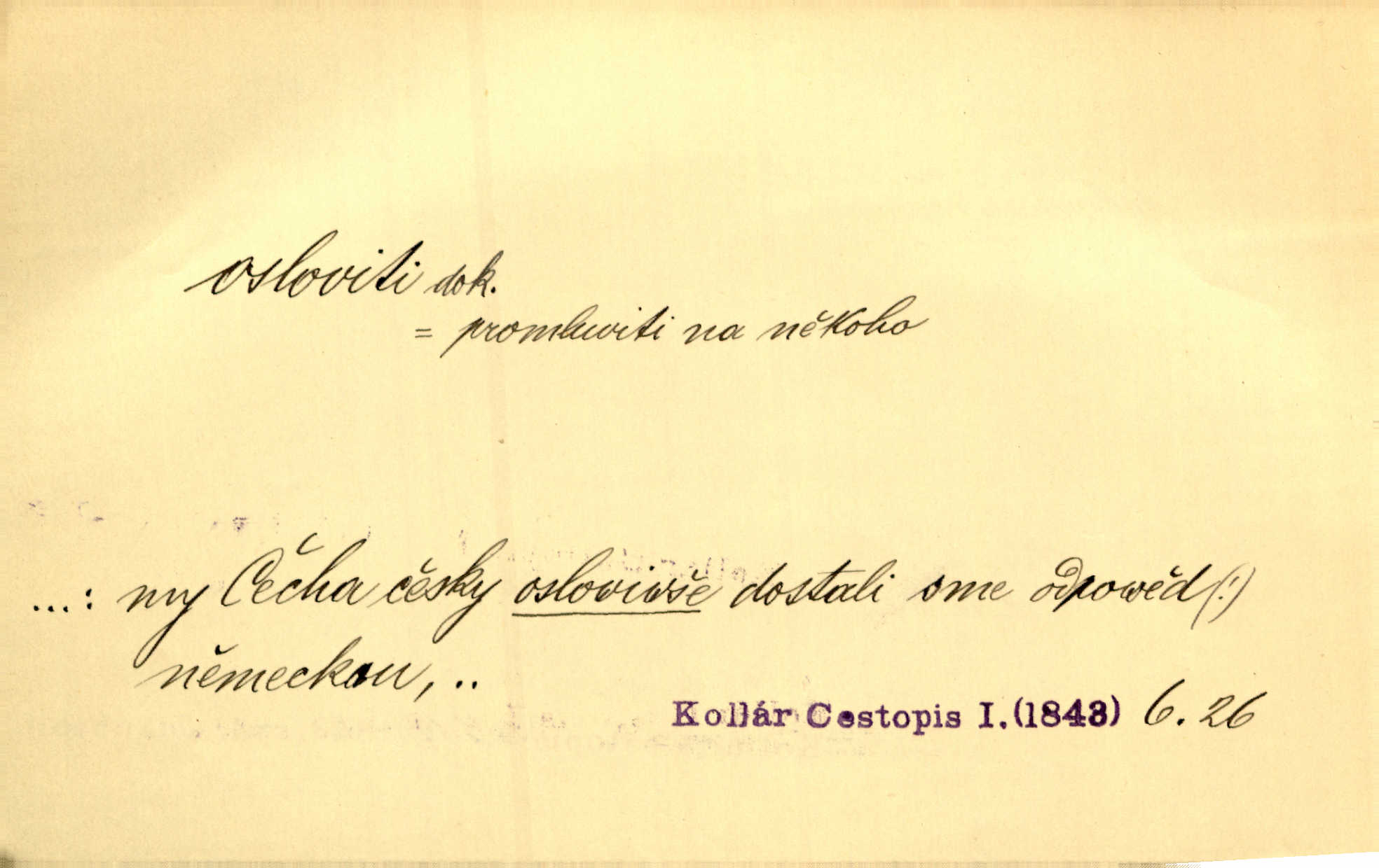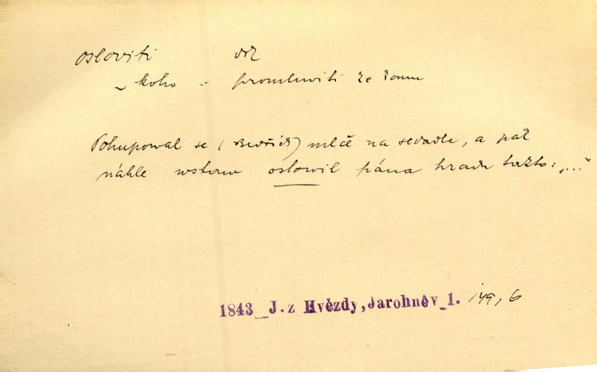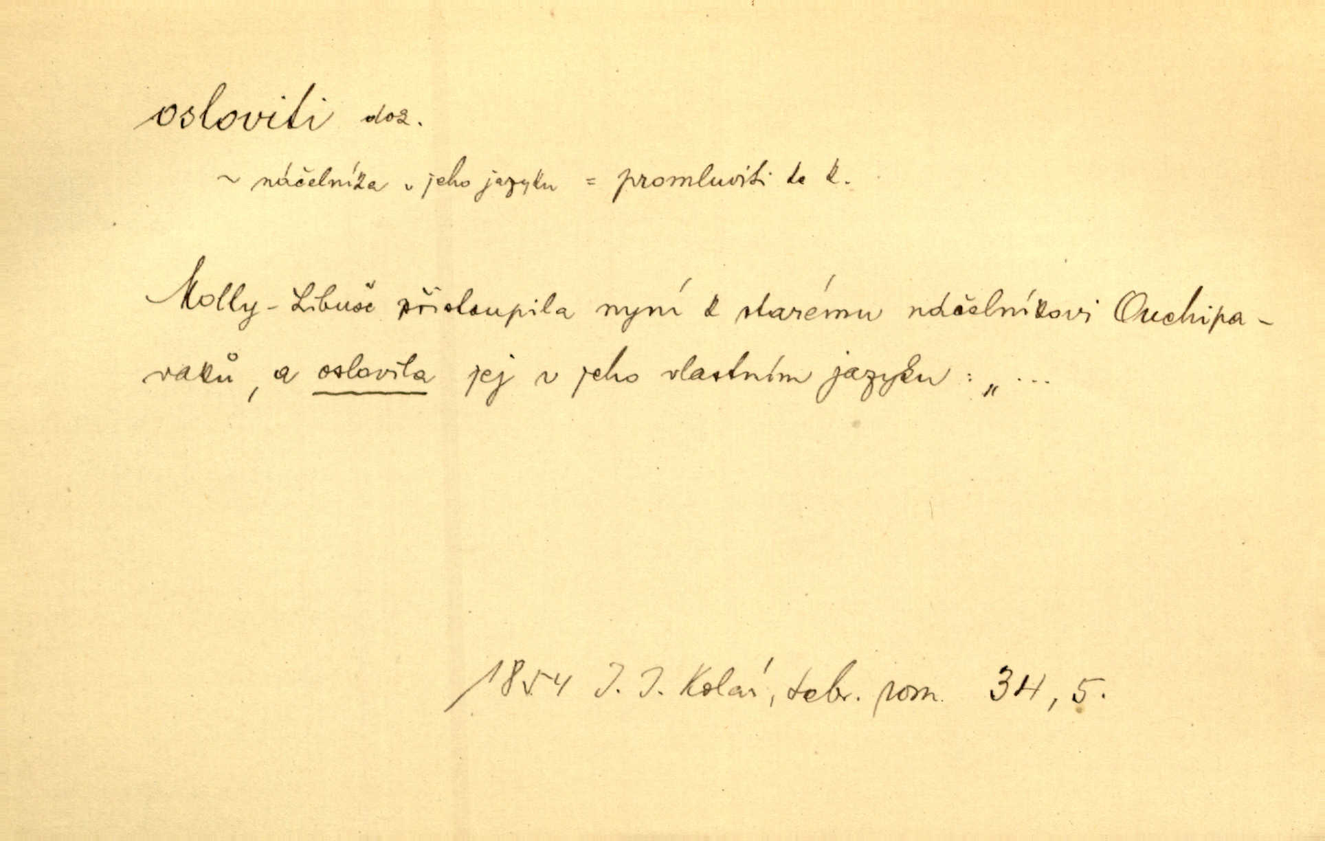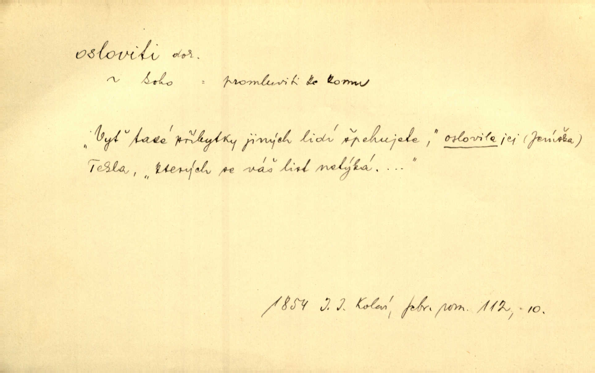 - osloviti dok. (koho) obrátiti se s řečí na někoho, začíti mluviti k někomu. Vztáhla ruku k němu, jak by jej osloviti chtěla otázkou. Zey. Oslovil ho [rytmistra] po česku. Jir. „Hosté již přijeli,“ oslovil Václav Olšovského. Pfleg. Na tribuně stál řečník a oslovil shromáždění. Baar. D pojmenovati titulem, jménem, titulovati. Proslýchalo se, kdož by chtěl k němu [k pánovi] promluviti, maje jakousi žádosť, že by jej musil osloviti „nejmocnější pane hrabě“. Svět. Chtěl zvolati: „Caterino!“ Nebyl jí posud nikdy jménem jejím oslovil. Zey. Modlitba Páně se skládá z oslovení a sedmi proseb. Podlaha.