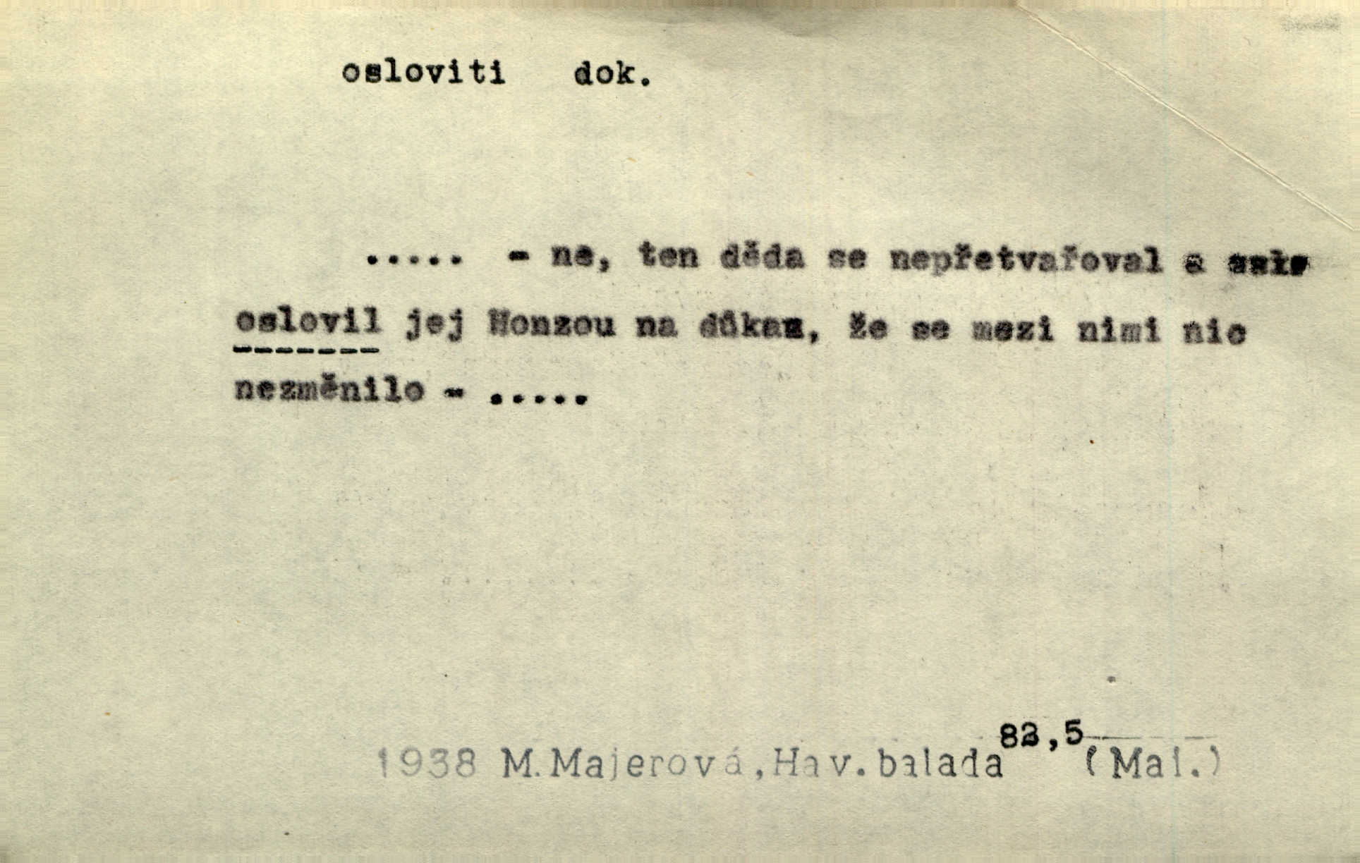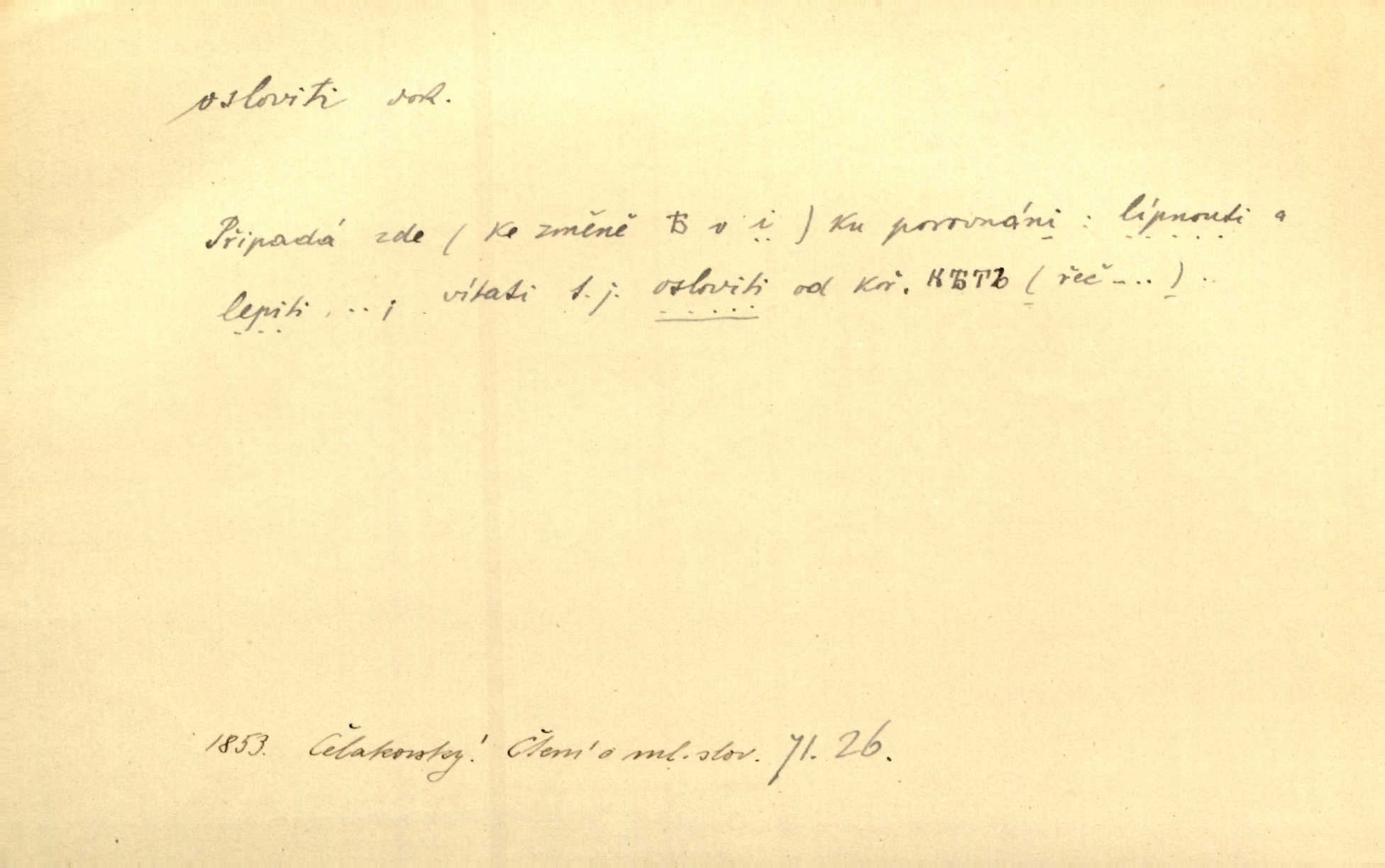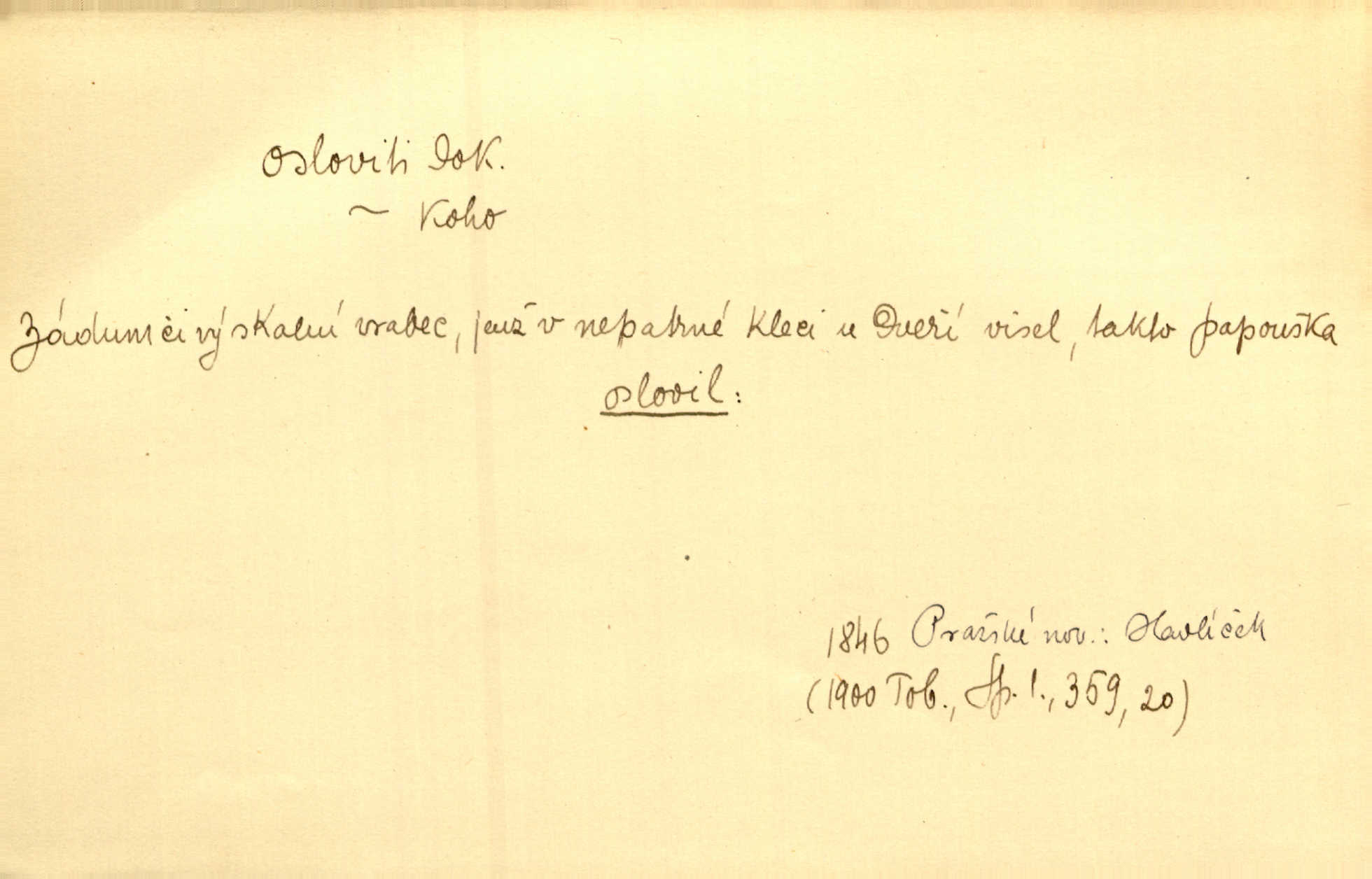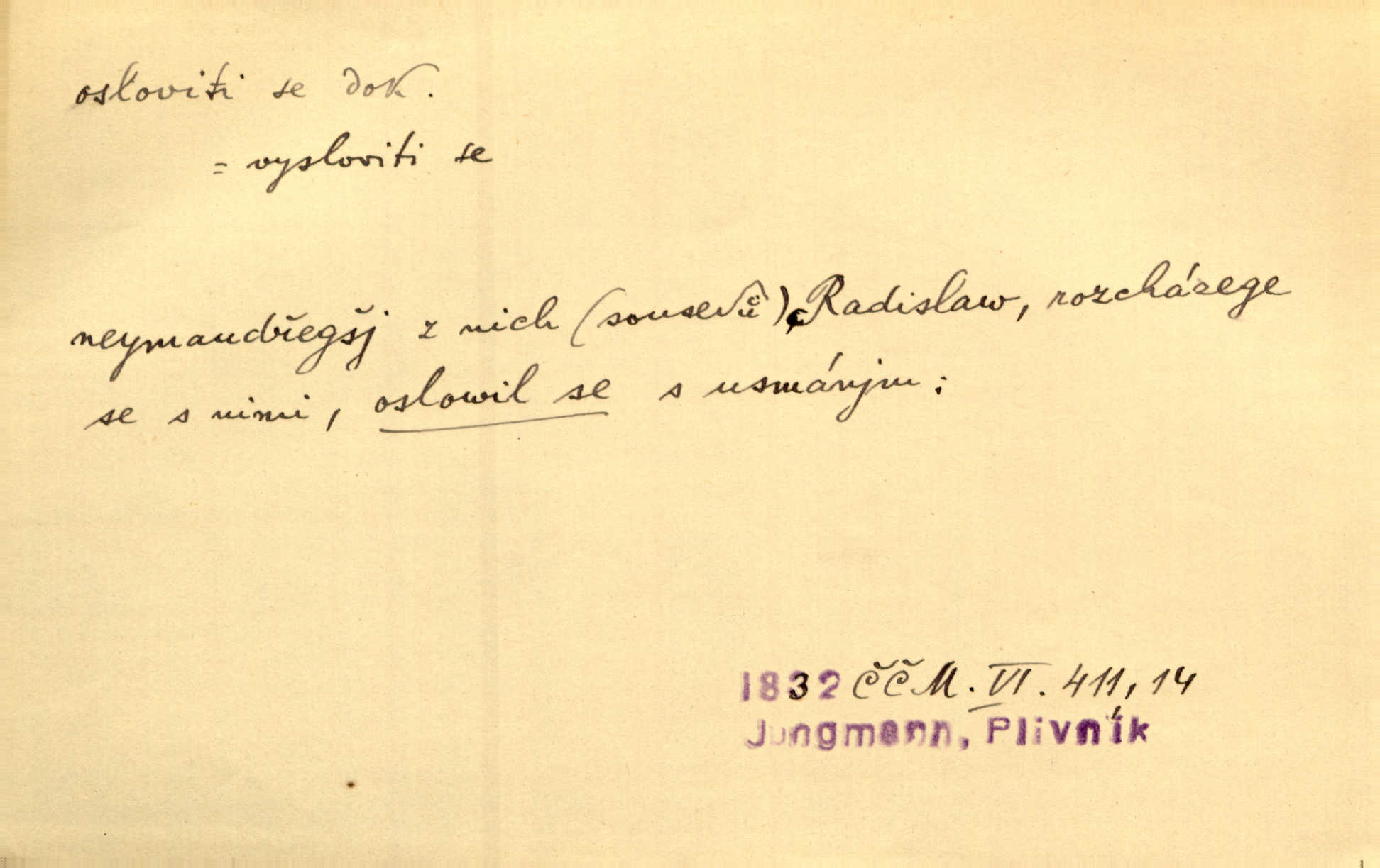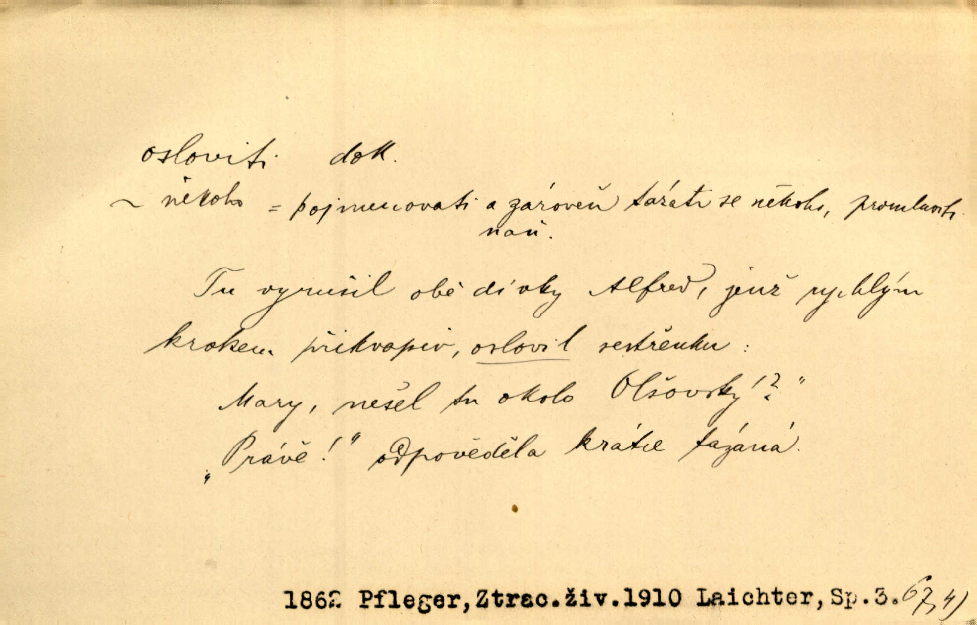 - osloviti dok. (koho) obrátiti se s řečí na někoho, začíti mluviti k někomu. Vztáhla ruku k němu, jak by jej osloviti chtěla otázkou. Zey. Oslovil ho [rytmistra] po česku. Jir. „Hosté již přijeli,“ oslovil Václav Olšovského. Pfleg. Na tribuně stál řečník a oslovil shromáždění. Baar. D pojmenovati titulem, jménem, titulovati. Proslýchalo se, kdož by chtěl k němu [k pánovi] promluviti, maje jakousi žádosť, že by jej musil osloviti „nejmocnější pane hrabě“. Svět. Chtěl zvolati: „Caterino!“ Nebyl jí posud nikdy jménem jejím oslovil. Zey. Modlitba Páně se skládá z oslovení a sedmi proseb. Podlaha.