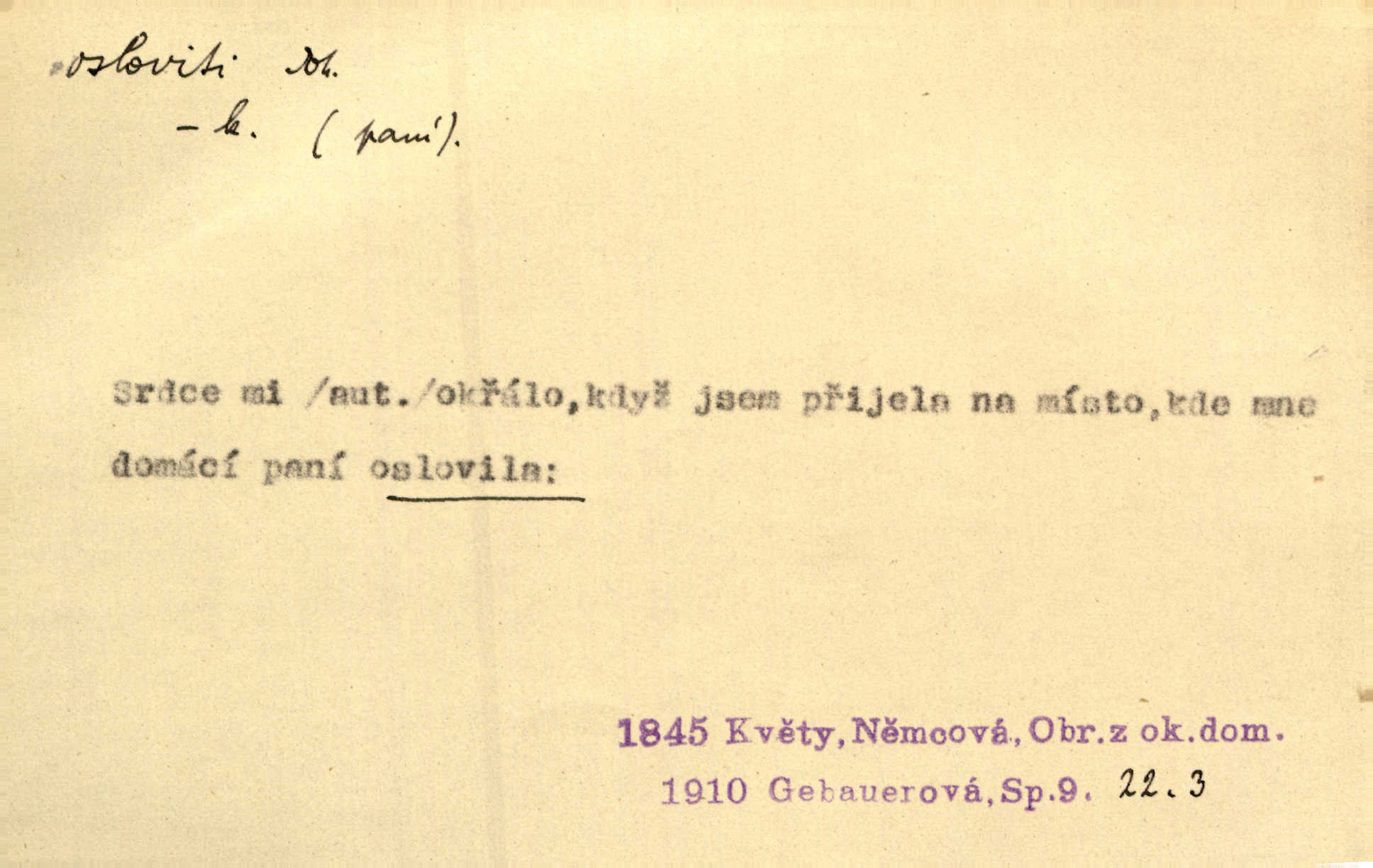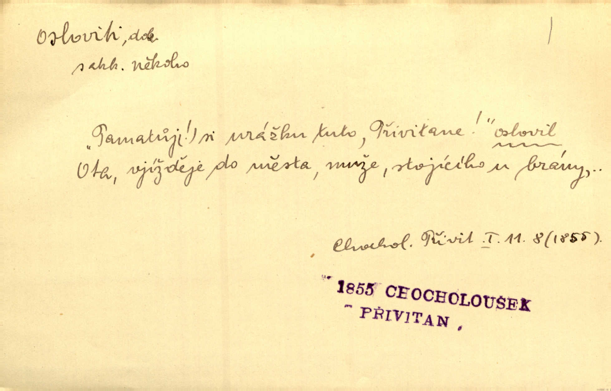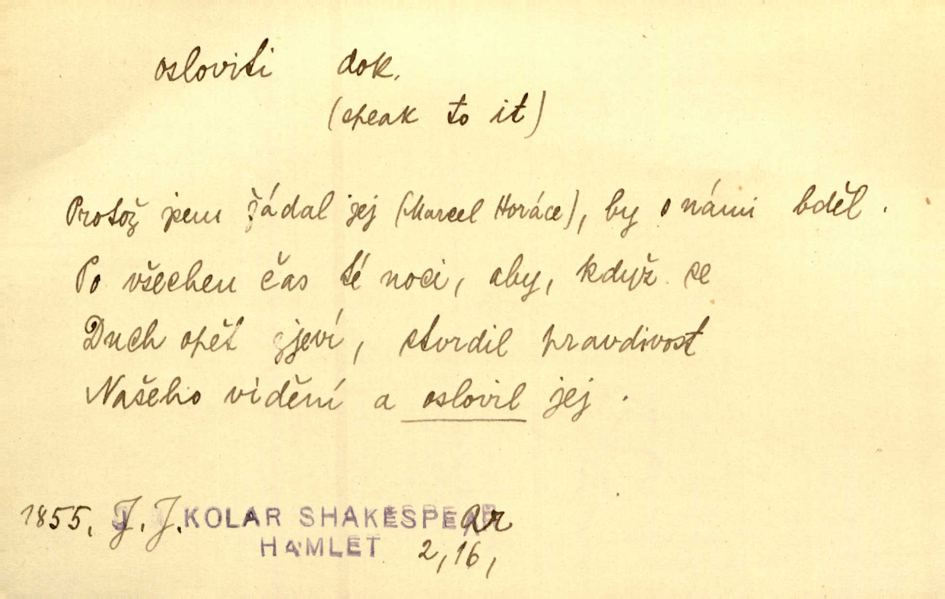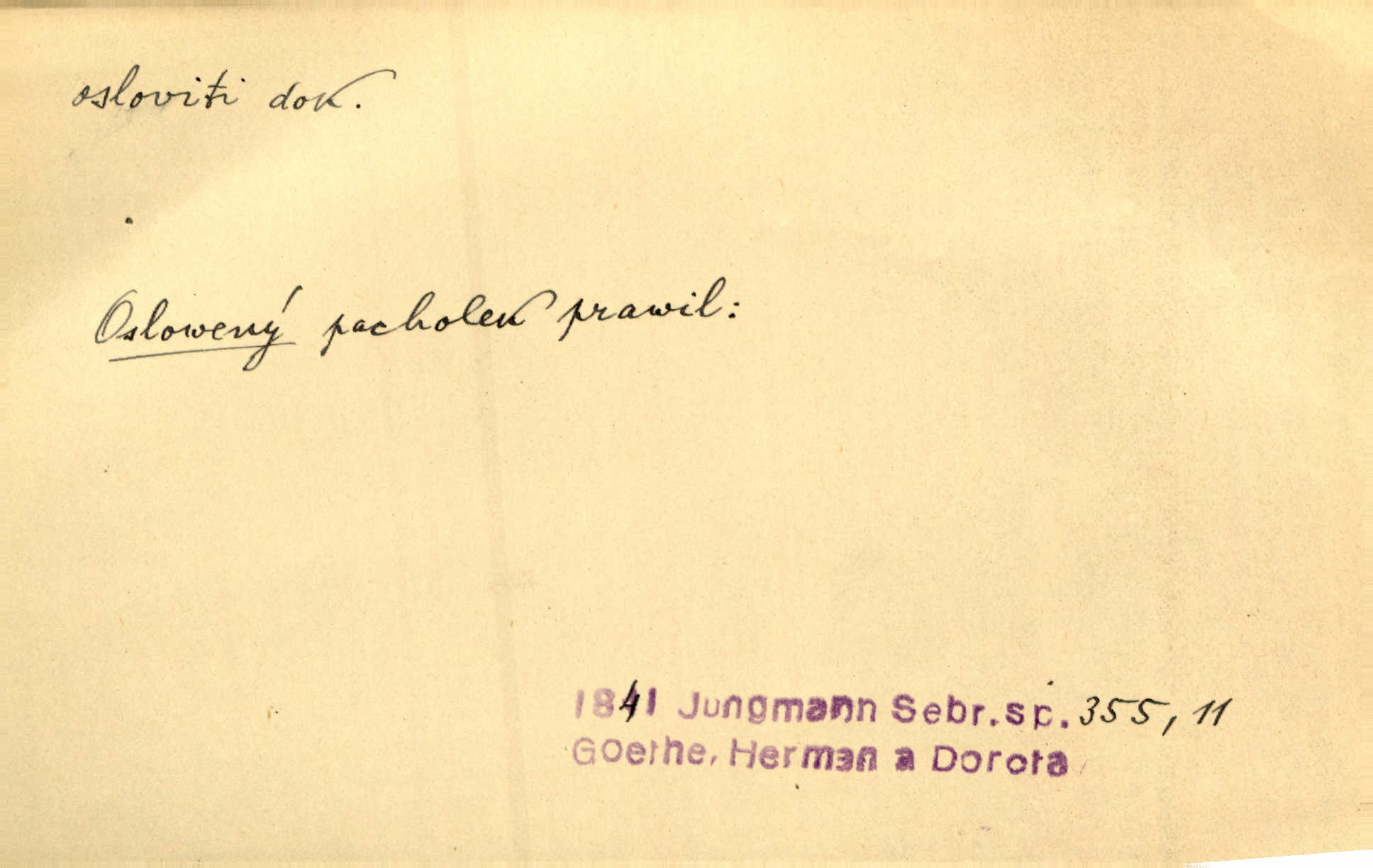 - osloviti dok. (koho) obrátiti se s řečí na někoho, začíti mluviti k někomu. Vztáhla ruku k němu, jak by jej osloviti chtěla otázkou. Zey. Oslovil ho [rytmistra] po česku. Jir. „Hosté již přijeli,“ oslovil Václav Olšovského. Pfleg. Na tribuně stál řečník a oslovil shromáždění. Baar. D pojmenovati titulem, jménem, titulovati. Proslýchalo se, kdož by chtěl k němu [k pánovi] promluviti, maje jakousi žádosť, že by jej musil osloviti „nejmocnější pane hrabě“. Svět. Chtěl zvolati: „Caterino!“ Nebyl jí posud nikdy jménem jejím oslovil. Zey. Modlitba Páně se skládá z oslovení a sedmi proseb. Podlaha.