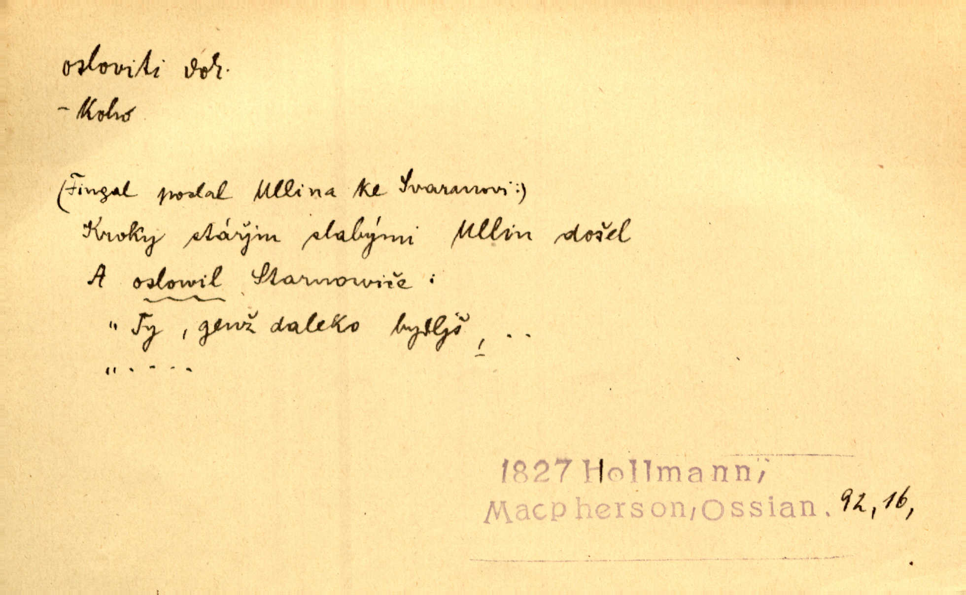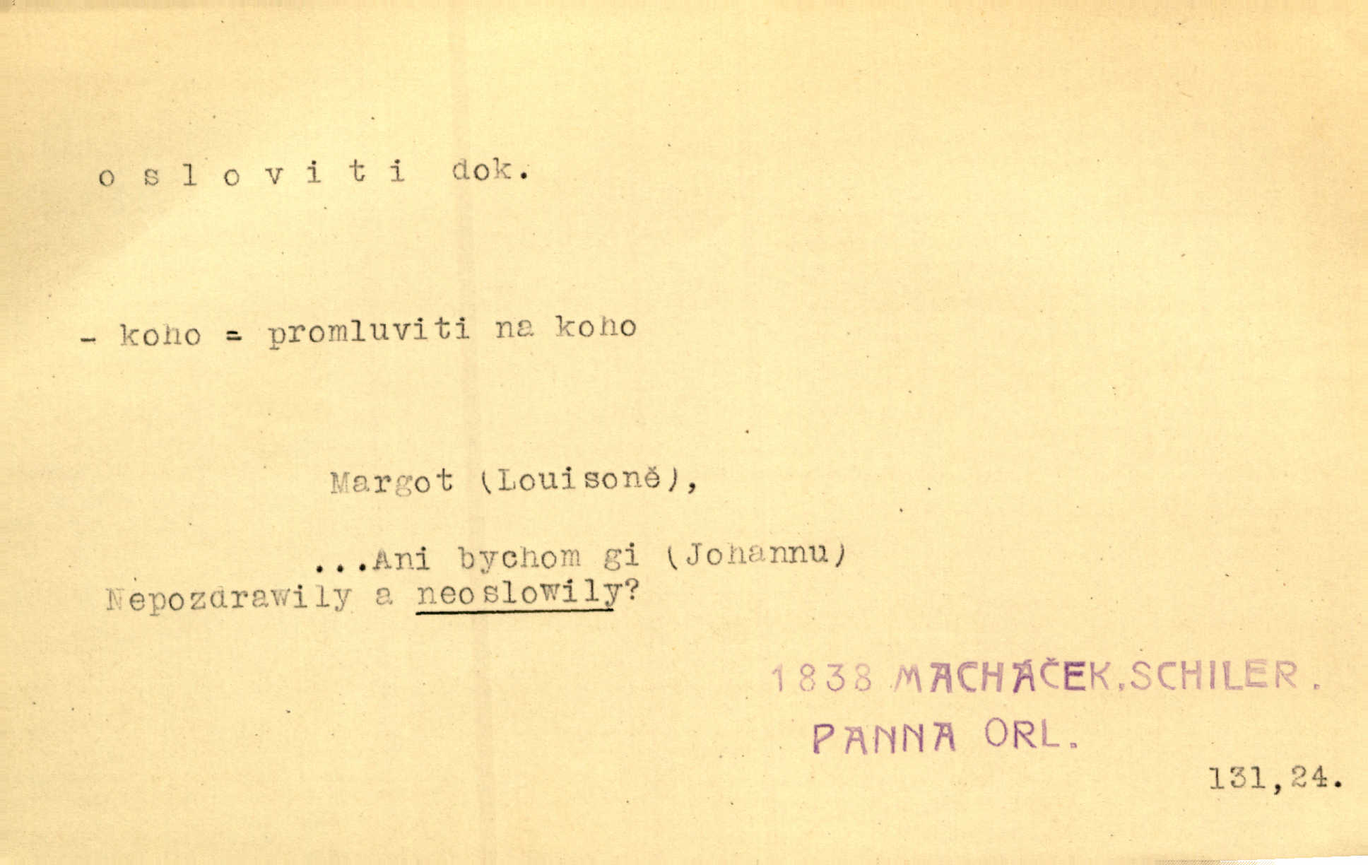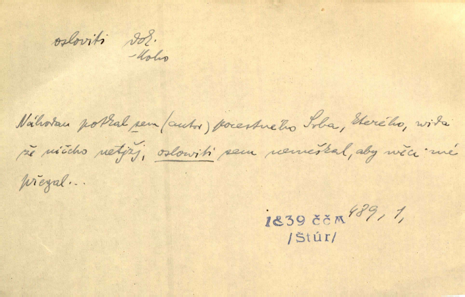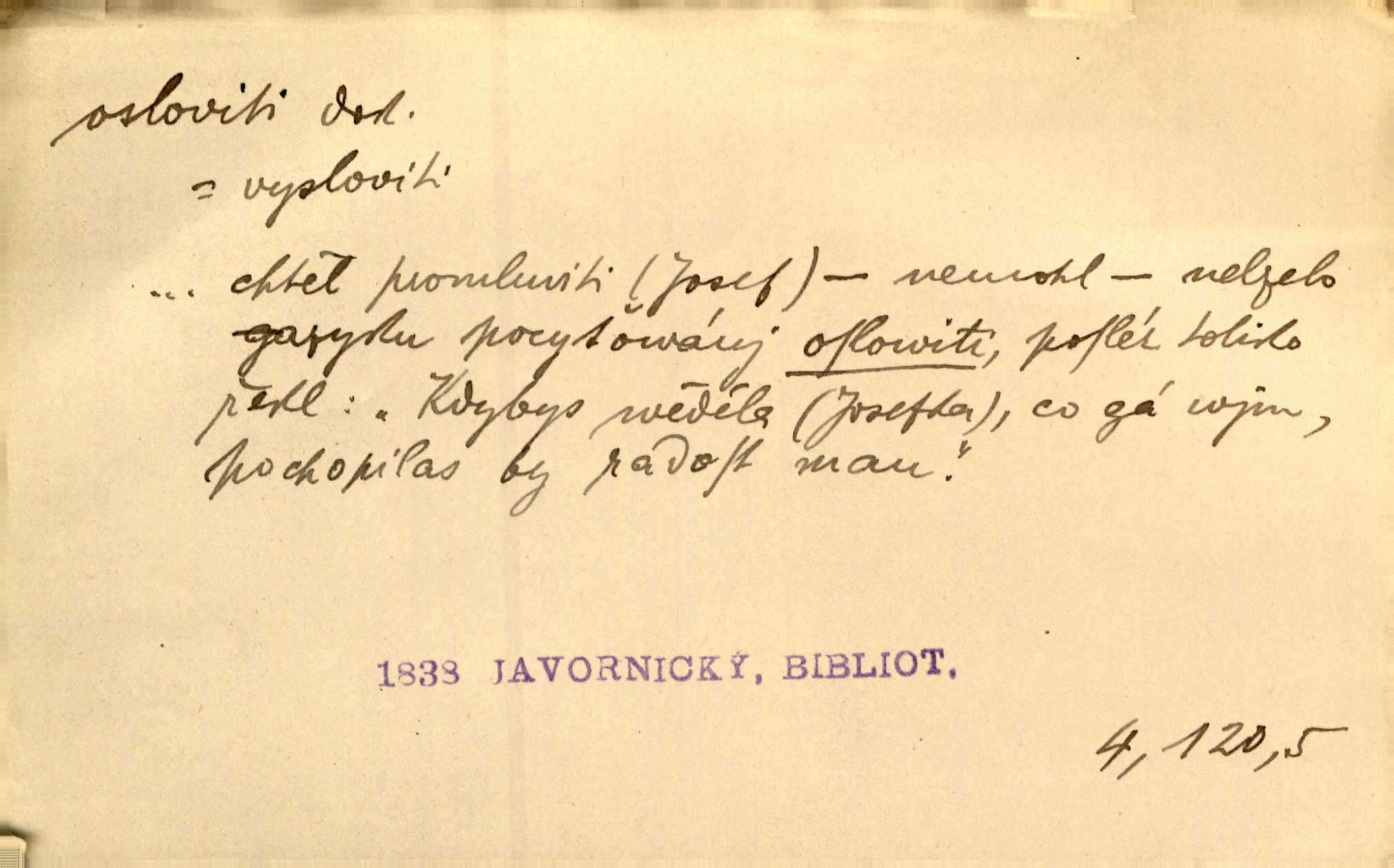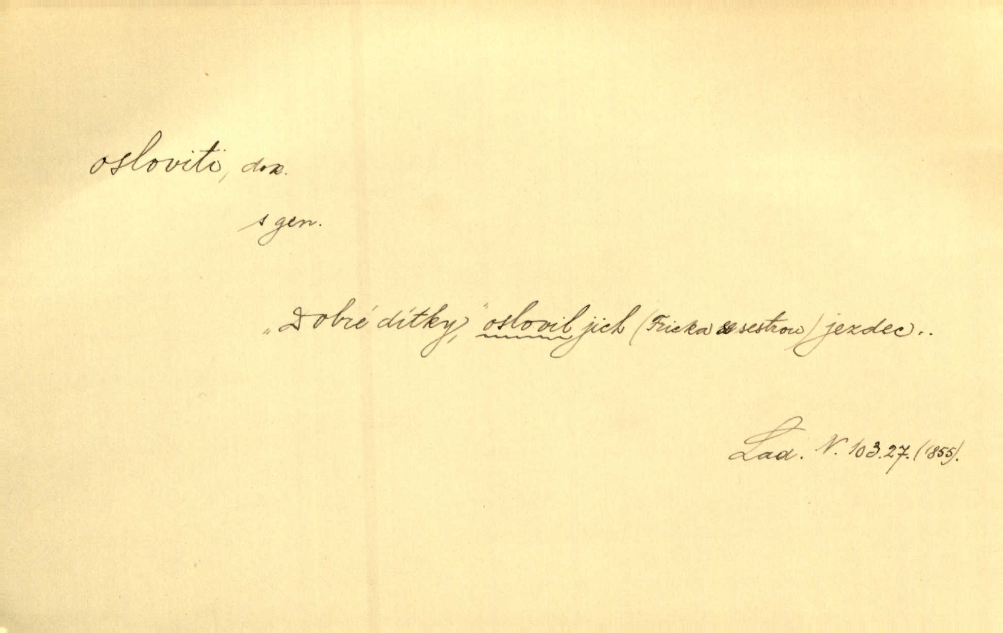 - osloviti dok. (koho) obrátiti se s řečí na někoho, začíti mluviti k někomu. Vztáhla ruku k němu, jak by jej osloviti chtěla otázkou. Zey. Oslovil ho [rytmistra] po česku. Jir. „Hosté již přijeli,“ oslovil Václav Olšovského. Pfleg. Na tribuně stál řečník a oslovil shromáždění. Baar. D pojmenovati titulem, jménem, titulovati. Proslýchalo se, kdož by chtěl k němu [k pánovi] promluviti, maje jakousi žádosť, že by jej musil osloviti „nejmocnější pane hrabě“. Svět. Chtěl zvolati: „Caterino!“ Nebyl jí posud nikdy jménem jejím oslovil. Zey. Modlitba Páně se skládá z oslovení a sedmi proseb. Podlaha.