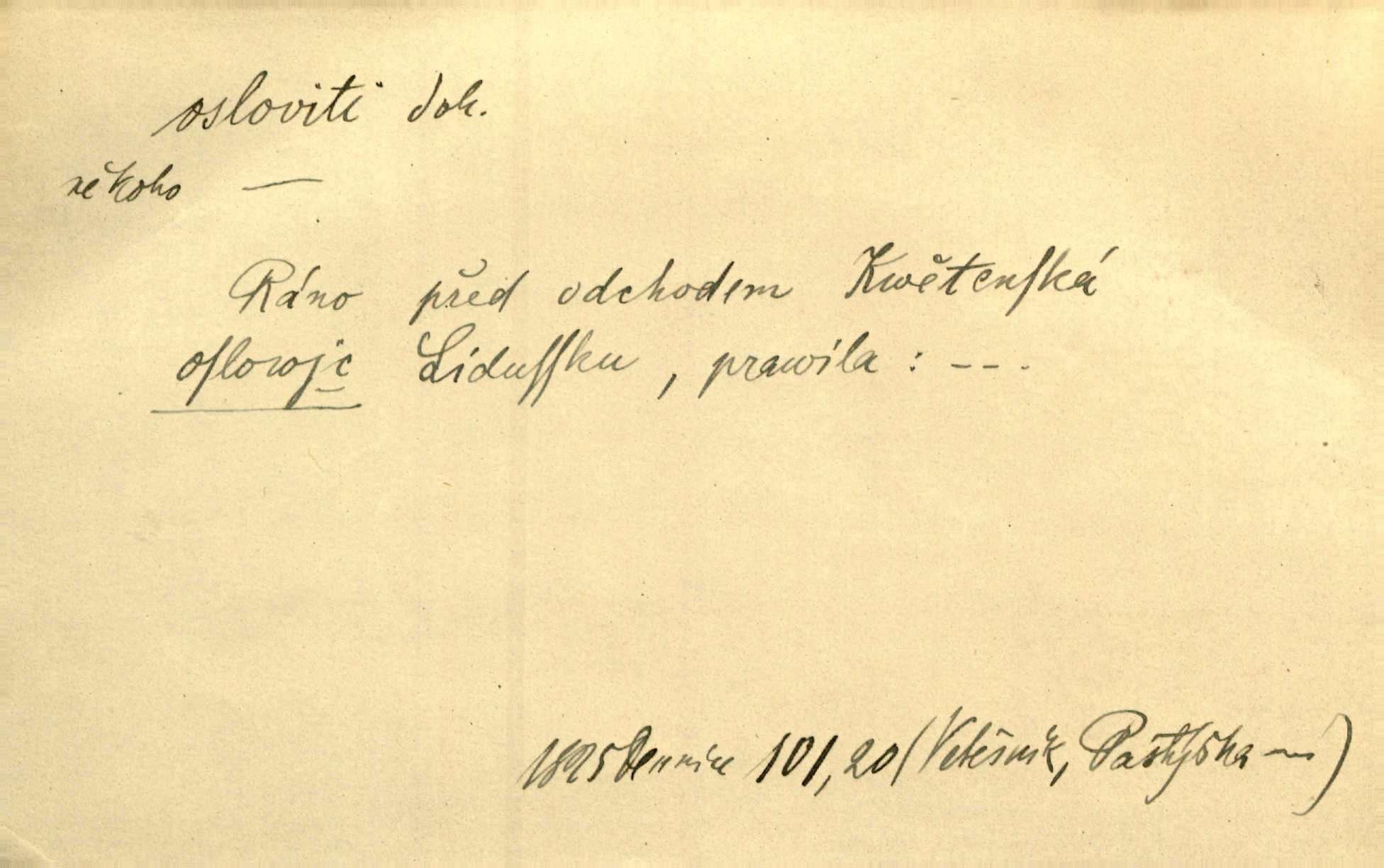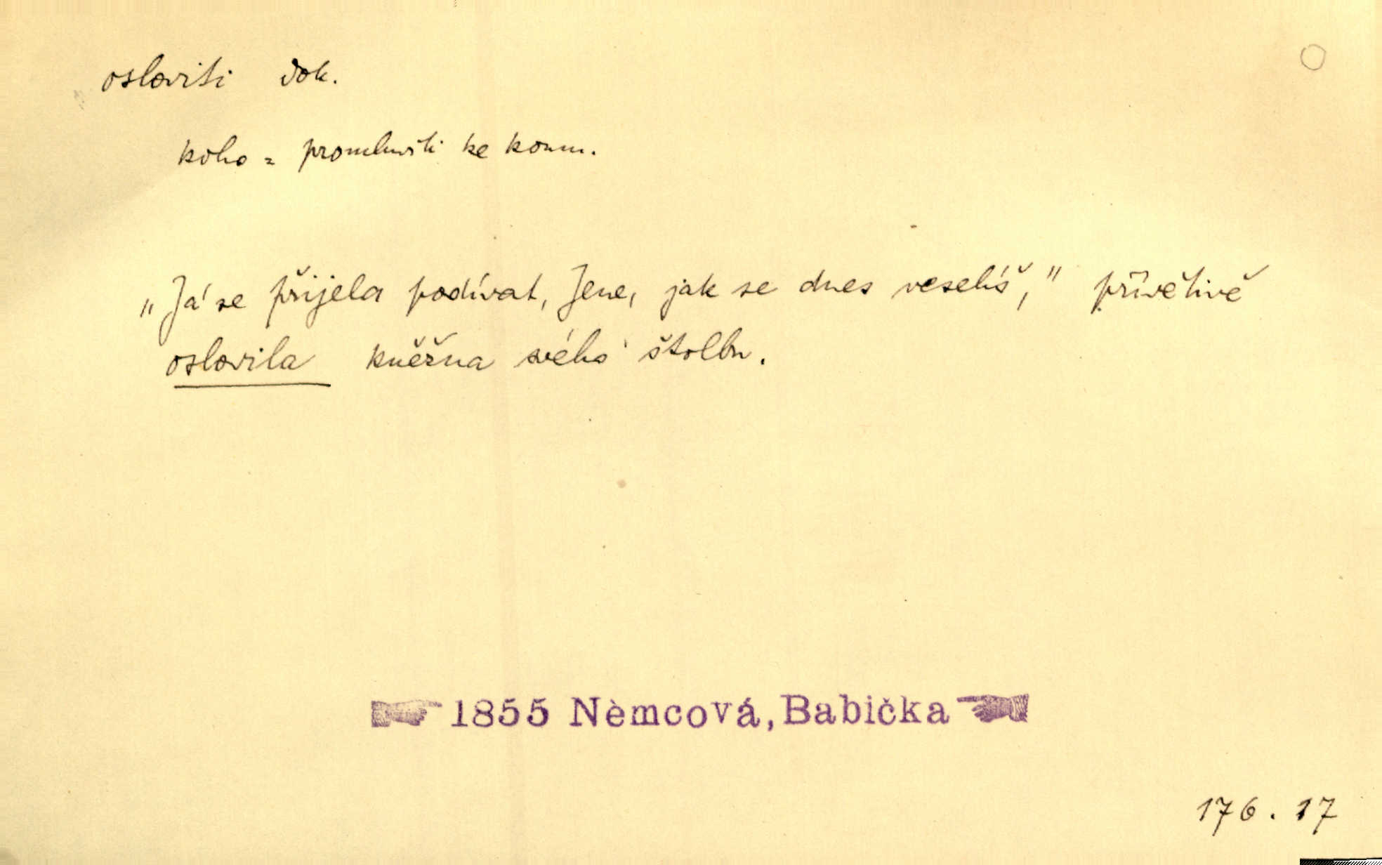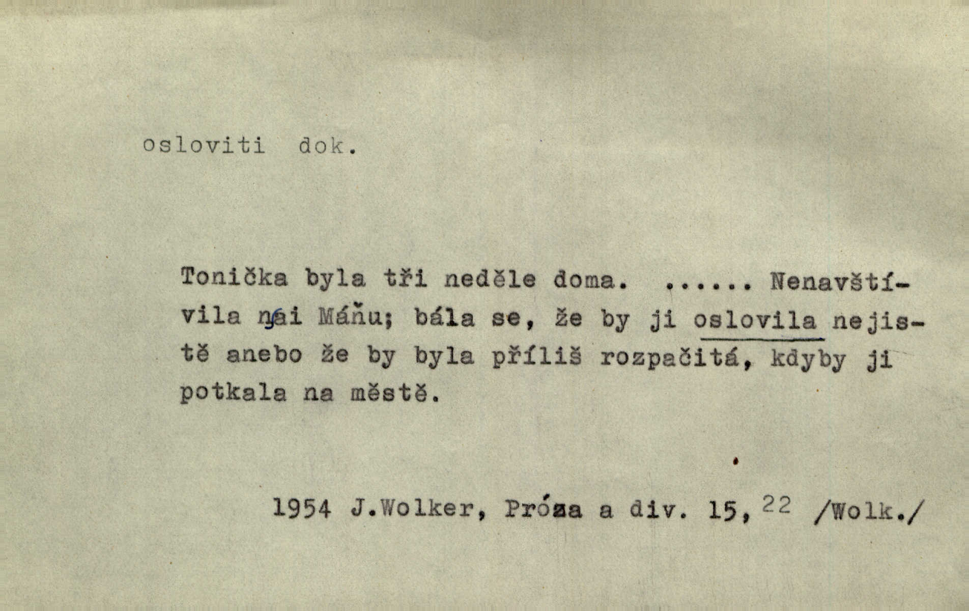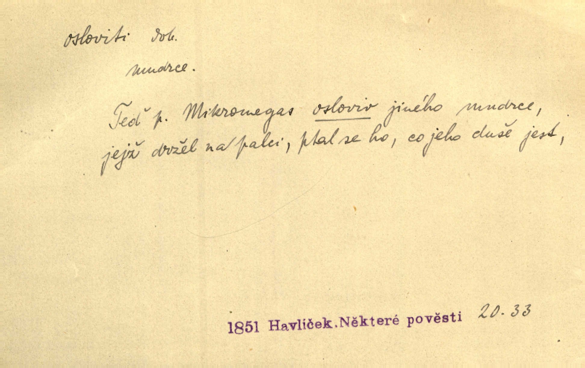 - osloviti dok. (koho) obrátiti se s řečí na někoho, začíti mluviti k někomu. Vztáhla ruku k němu, jak by jej osloviti chtěla otázkou. Zey. Oslovil ho [rytmistra] po česku. Jir. „Hosté již přijeli,“ oslovil Václav Olšovského. Pfleg. Na tribuně stál řečník a oslovil shromáždění. Baar. D pojmenovati titulem, jménem, titulovati. Proslýchalo se, kdož by chtěl k němu [k pánovi] promluviti, maje jakousi žádosť, že by jej musil osloviti „nejmocnější pane hrabě“. Svět. Chtěl zvolati: „Caterino!“ Nebyl jí posud nikdy jménem jejím oslovil. Zey. Modlitba Páně se skládá z oslovení a sedmi proseb. Podlaha.