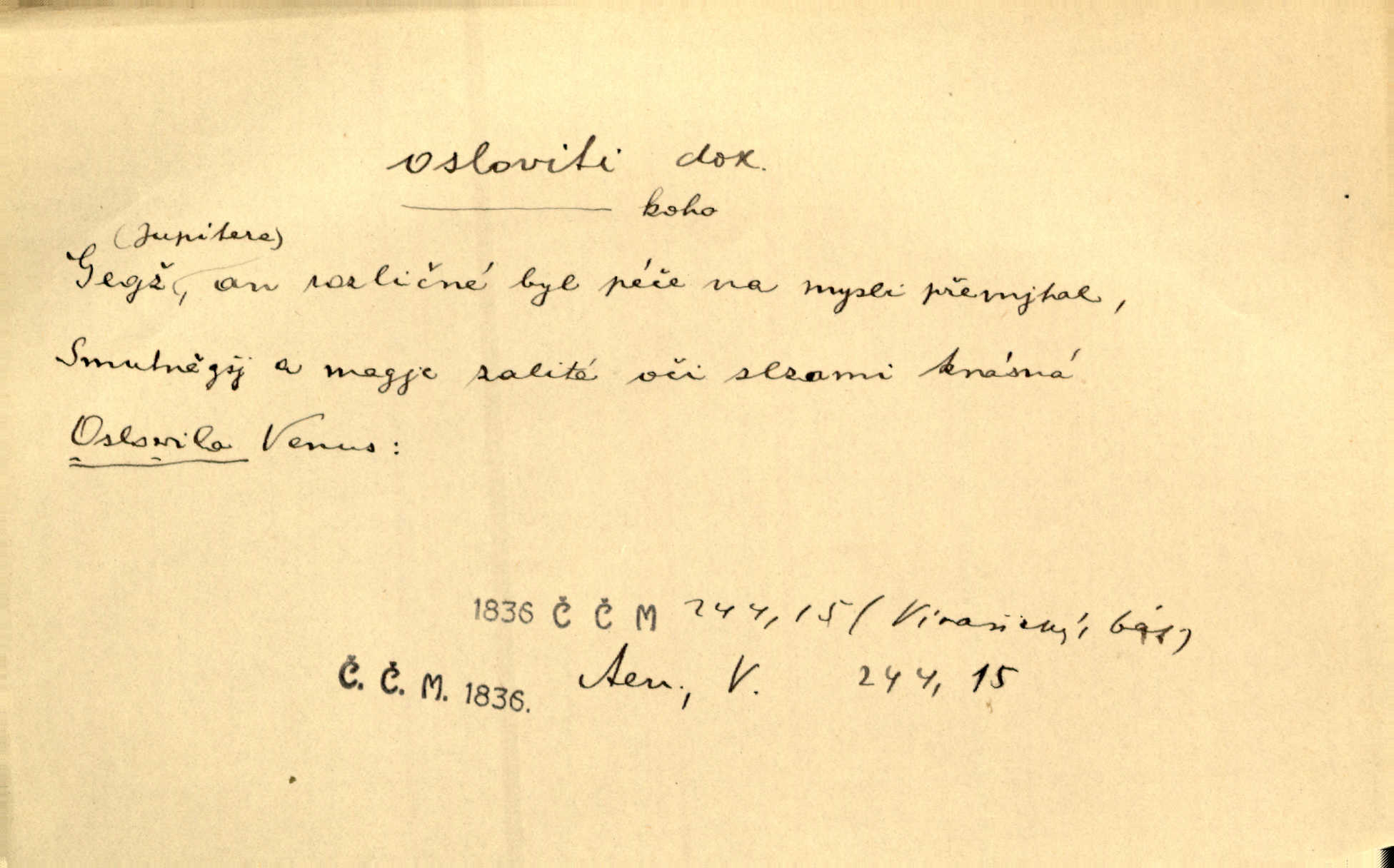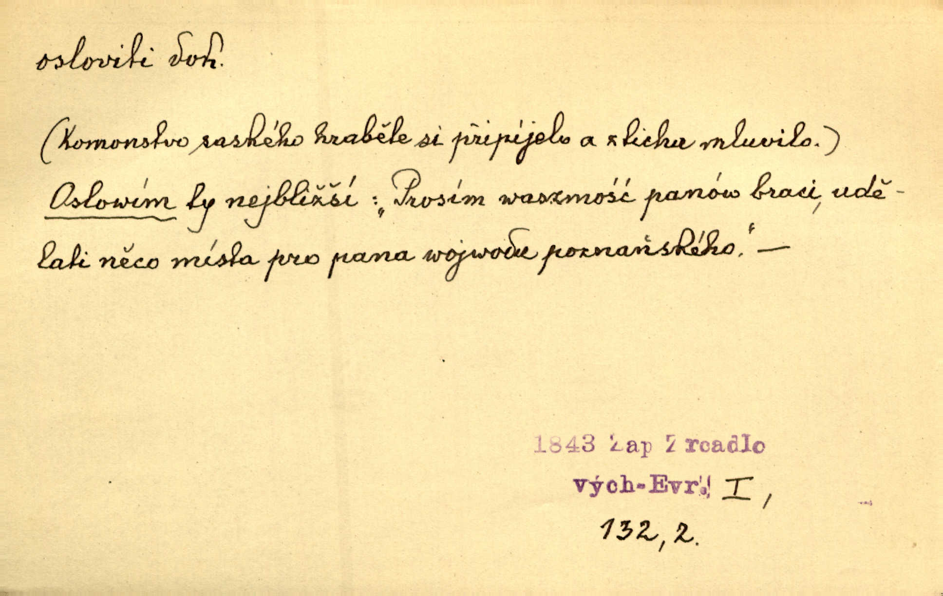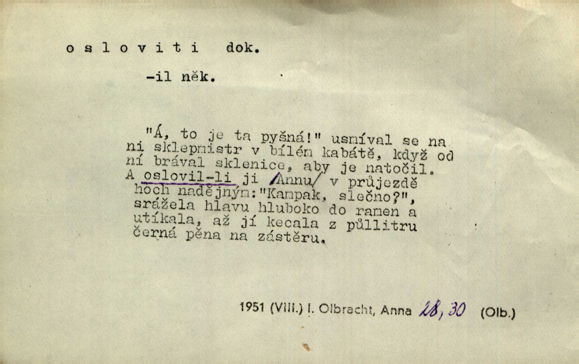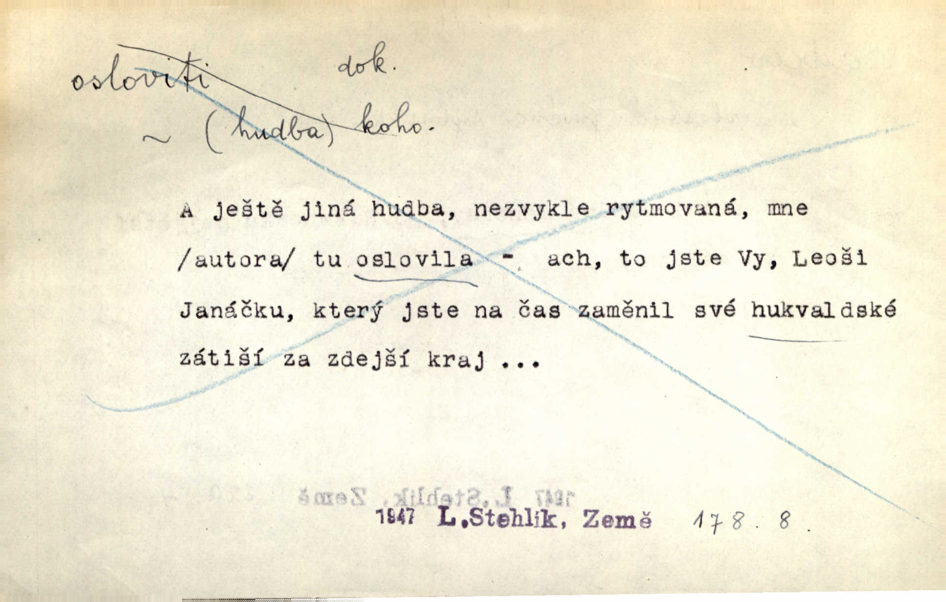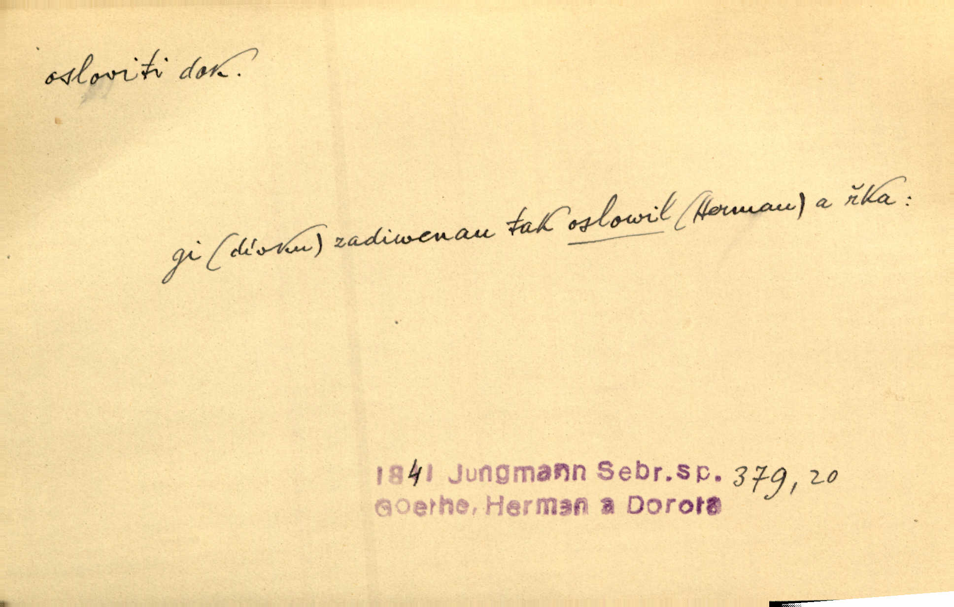 - osloviti dok. (koho) obrátiti se s řečí na někoho, začíti mluviti k někomu. Vztáhla ruku k němu, jak by jej osloviti chtěla otázkou. Zey. Oslovil ho [rytmistra] po česku. Jir. „Hosté již přijeli,“ oslovil Václav Olšovského. Pfleg. Na tribuně stál řečník a oslovil shromáždění. Baar. D pojmenovati titulem, jménem, titulovati. Proslýchalo se, kdož by chtěl k němu [k pánovi] promluviti, maje jakousi žádosť, že by jej musil osloviti „nejmocnější pane hrabě“. Svět. Chtěl zvolati: „Caterino!“ Nebyl jí posud nikdy jménem jejím oslovil. Zey. Modlitba Páně se skládá z oslovení a sedmi proseb. Podlaha.
