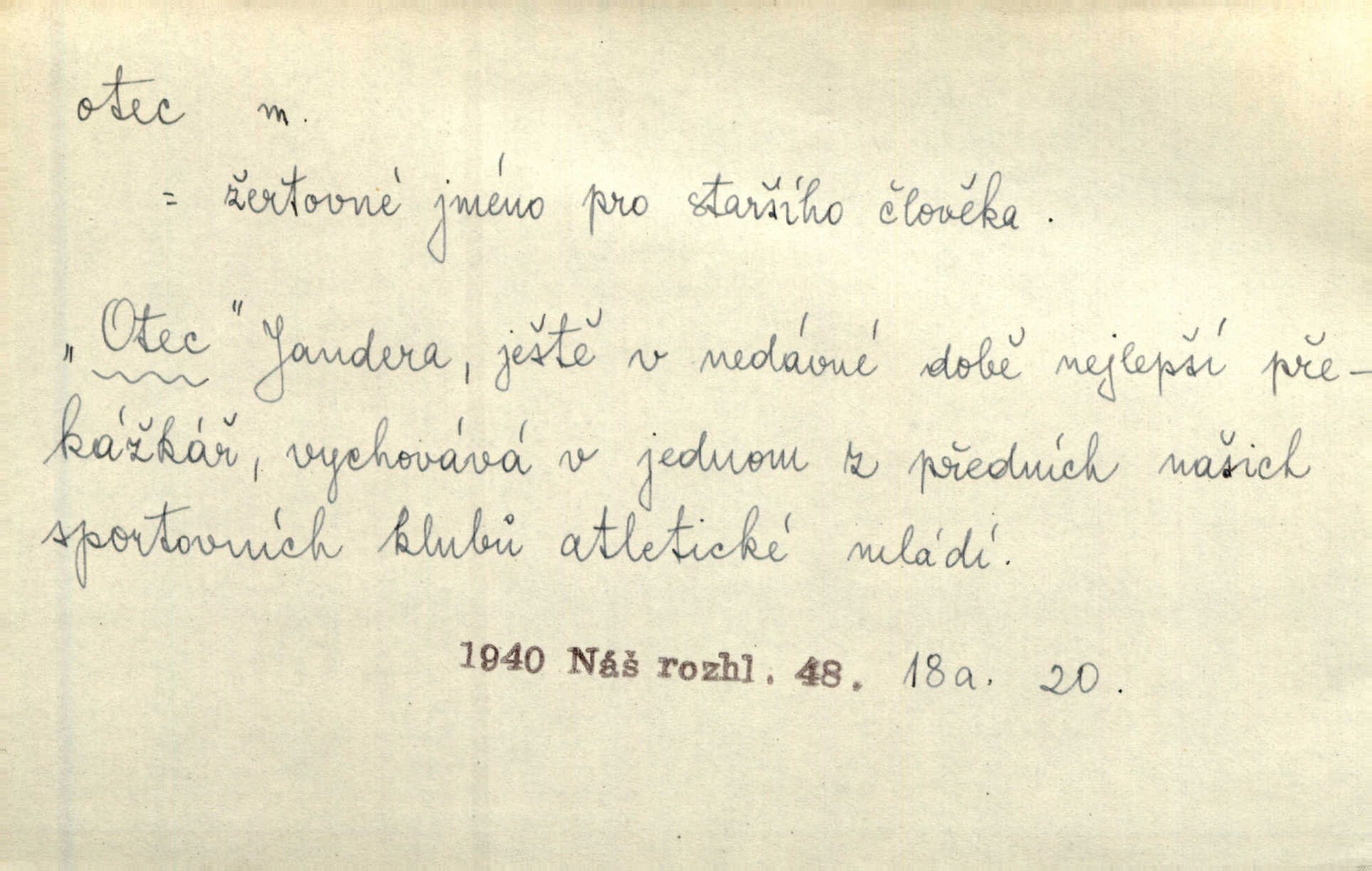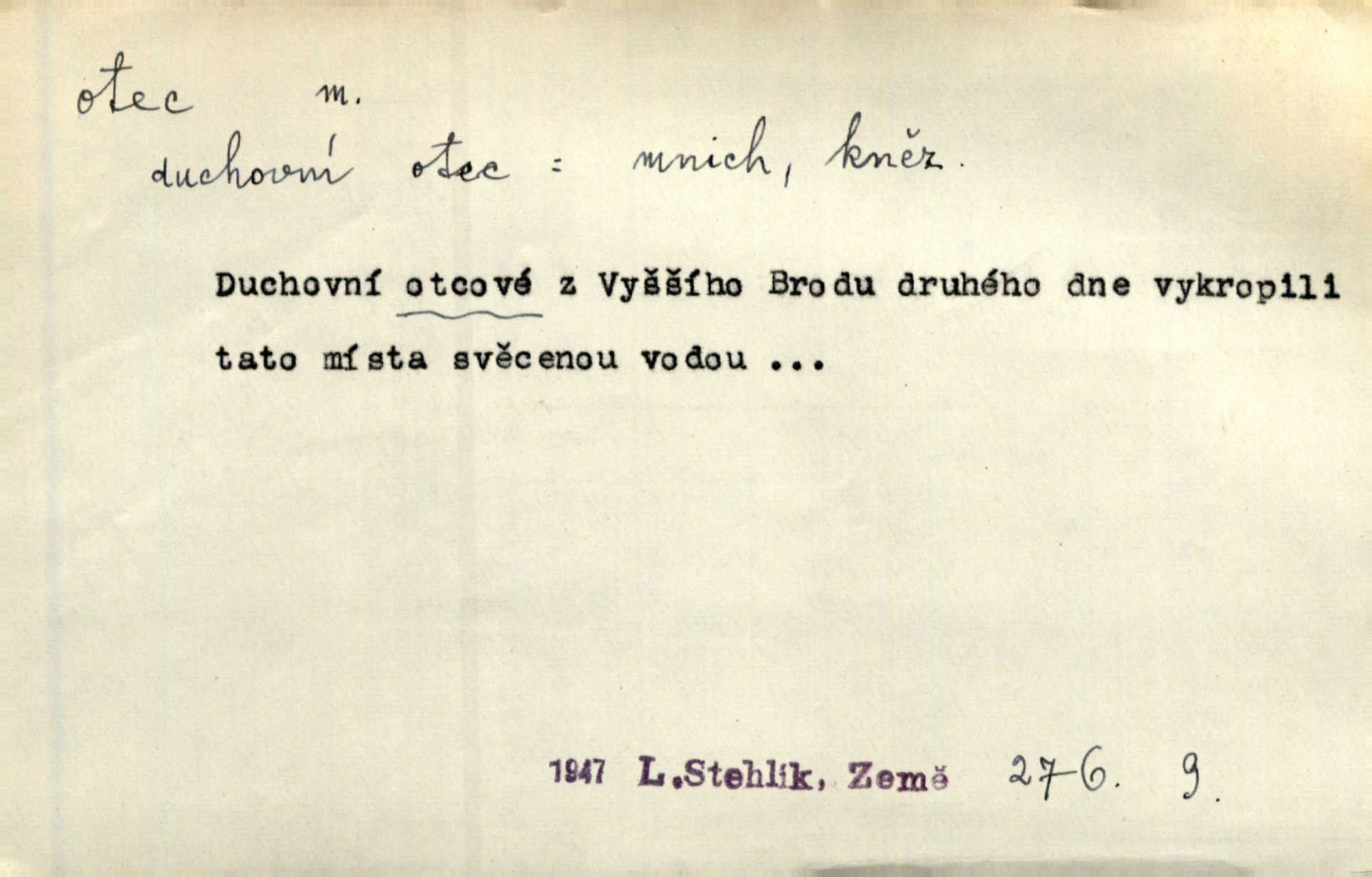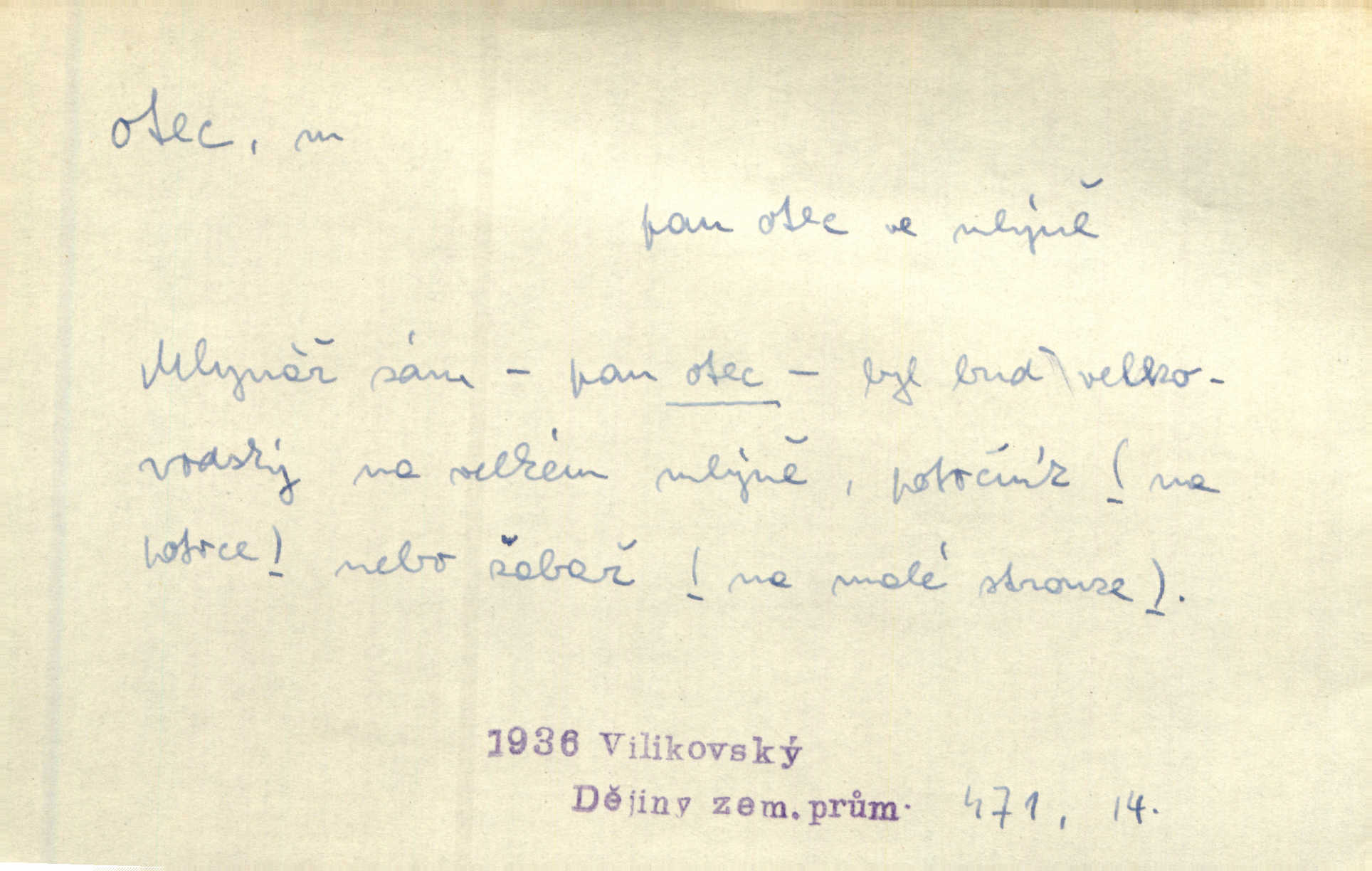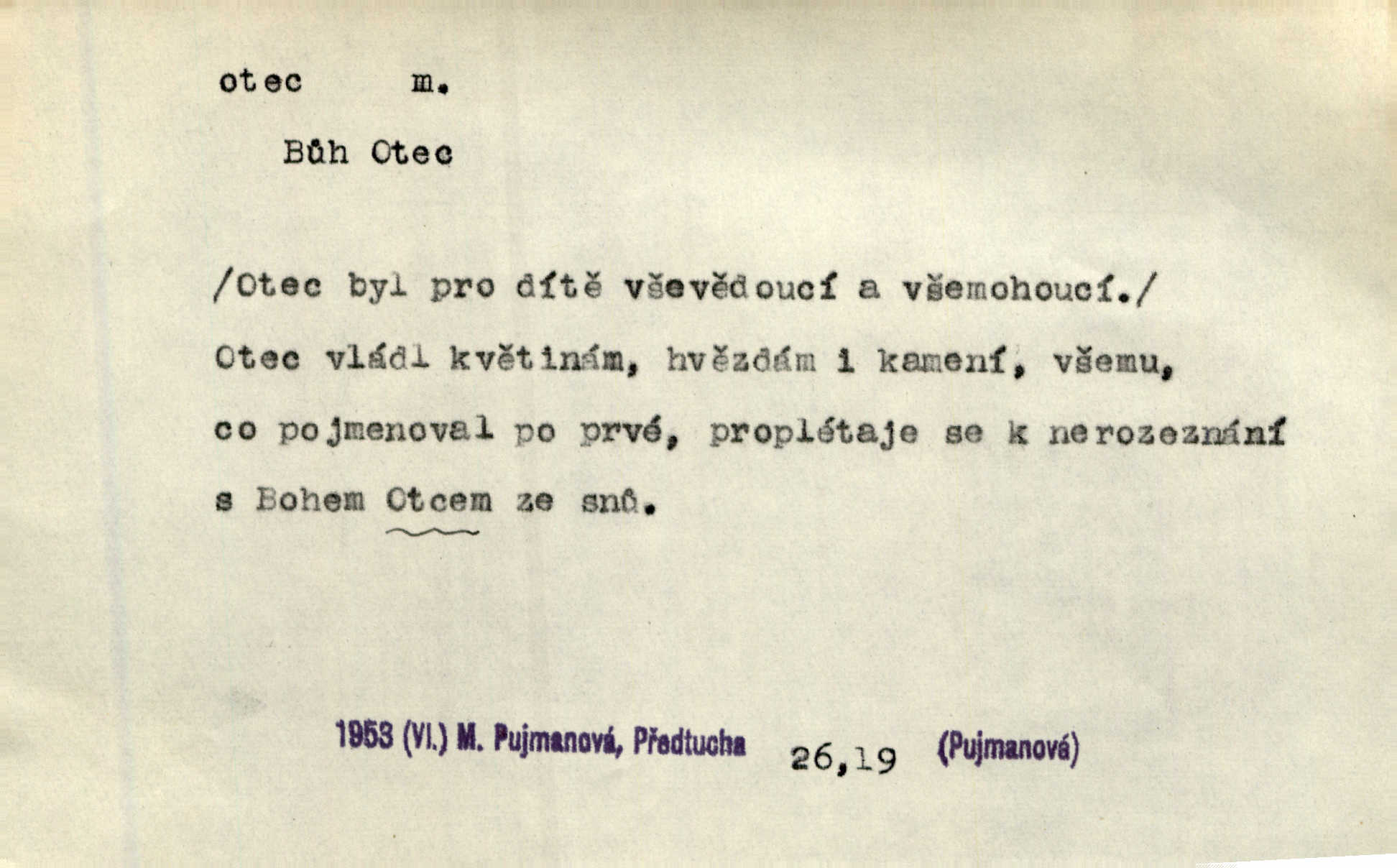 - otec, otce m. muž, jenž zplodil potomky. Nebylo pochybnosti, že Hanuš bude otcem a matka jeho babičkou. Šmil. Mně pravil otec na smrtelném loži: tys, dcero, rodu mého poslední. Krás. Jaký otec, taký syn. Hol. Nebyl bych tě poznal po tolika letech! Ukaž se přece! Jsi po otci, ano, po otci. K. Čap. Staří i mladí se sdružují. Jsou zcela patrné dvě vrstvy: „otcové a děti“. Herb. Nejsvětější z všeho krev je lidí, již k Bohu zří co k otci! Vrch. Doktor poslouchal pobožně; chtělť si svou trpělivostí dobré oko u nastávajícího pana otce koupiti. Šmil. Práv. otec manželský u něhož platí zákonná domněnka otcovství; otec nemanželský kdo otcovství dítěti nemanželskému uzná n. kdo je po žalobě paternitní za otce soudem prohlášen; otec adoptivní kdo smlouvou uměle založil poměr otcovský adopcí dítěte. D muž starající se o někoho n. o něco, moudře řídící něco, příznivec, ochránce, dobrodinec a pod. [Král mluví k lidu:] Jsemť, lide, otcem tvým, proč rouháš se mi směle vzdorem svým? Zey. O kázání před svatým požehnáním shrnuje otec dědiny všechny šťastné i nešťastné události své farnosti v jedno. A. Mrš. Podívejte se mi do očí, strýčku, otče náš. Šmil. Appoll, otec básníků. Mach. Zvědavě vyčkávali, cože nového na radnici upekli otcové města obecní starší, radní. Vrba. Na radnici zasedá odbor chudinský, který jmenuje pro jednotlivé okresy otce chudých referenty o chudinských věcech. Mach. D čestné pojmenování zasloužilého n. významného muže. Karel Čtvrtý, Otec vlasti. Něm. Palacký, Otec národa. MSN. [Vlastenci] zastyděli se za netečnost českého čtenářstva k otci Homerovi. Dibl. Rád myslí zalétám v ty krásné doby, když otec Radecký nás k slávě ved! Čech. D pan otec mlynář, majitel mlýna. Babička říkala o panu mlynáři, či lépe o panu otci, jak ho vůbec každý nazýval, že je rozšafný člověk. Něm. U nádržky deštěm nakypělé rád vytáhl pan otec stavidla. Krás. Vedlo se mu jako panu otci na horském mlýně přede žněmi. Vrba. D Dial. křestný, křestní, krstný otec kmotr. Císař Konstantin Porphyrogeneta [byl] jejím křestným otcem. Šaf. Nemohli se tomu dítěti rodiče dosti vynadiviti, až jim po chvíli na rozum přicházelo, že ji to asi ti krstní otcové obdařili [krásou]. Něm. D titul dávaný duchovním, zvl. členům církevních řádů. Mluvila jsem o té věci s otcem Bonaventurou, svým zpovědníkem. Bozd. Anidas, pomocník otce Pedra, poustevníka. Dyk. „Otče důstojný,“ pravím k němu [k jesuitovi]‚ „co jest mi činiti, abych šťastně a pokojně byl živ.“ Šmil. Hajná byla by duchovnímu otci ráda sklesla k nohoum. Schulz. Chodil do latinských škol, v nichž vyučovali otcové pobožných škol piaristé. Šmil. [Studentovi] latina otců piaristů valně nevoněla. Jir. Otcové řádu Ježíšova neobmezují se na pouhou inkvisici. Lum. Prvního vychování nabyl hoch u otců dominikánů. Ner. D Otcové (církevní) vynikající spisovatelé církevní staré doby. Nejznamenitější církevní otcové jsou na západě: sv. Ambrož, sv. Jeroným, sv. Augustin, sv. Řehoř Veliký. Podlaha. [Mistr Jaroš] nalézal v písmu svatém i v církevních otcích doklady a podporu pro svoje tvrzení. Podl. D svatý Otec papež. Vyjednává [Josef II.] již se samým papežem, aby byl řád [jesuitský] v jeho zemích zrušen, a sv. otec k přání tomu již již se nakloňuje. Svět. Jsou lidé, kteří si svaté katolické církve a svatého otce neváží a na lehko i jeho svatost berou. A. Mrš. D Otec křesťanský Bůh, zvl. první osoba svaté Trojice (Bůh Otec). Člověk tu se modlí k Otci svému o chléb vezdejší, tu zas vzývá matku boží o přímluvu. Hol. Všichni lidé jsou synové jednoho Otce na nebesích. Pal. Jeden z nich [vrabců] nepadne na zem bez vůle Otce Nebeského. Havl. Tam Věčný Otec sedí na oblaku. Vrch. Když chodili svatý Petr s Otcem nebeským po širokém údolí, přišli do jedné dědiny s Pánem Ježíšem. Něm. Zaklínám tě, duchu nečistý, ve jménu Boha Otce, Boha Syna, Boha Ducha svatého. Jir. Tu zazpíval Martinec zvučným hlasem: „Zdrávas, dcero Boha otce!“ Něm. D otec zakladatel rodu, praotec. První [díl země] dal [Noe] synu svému Chamovi, jenž byl otcem Sudanů, druhý Semovi, otci Arabů a Peršanů, a třetí Jafetovi, otci Turků. Pal. Já hledal všady [na Řípu] otce Čecha sled. Vrch. Hněte [sochař] hlínu podoben Tvůrci svému, v ráj když smavý postavil otce lidí Adama. Vrch. D otcové předkové, dědové. Bulharský selský lid spravuje se doposud dle obyčeje starých svých otcův. Něm. Dávný jazyk otců stal se mu čímsi posvátným. Zey. Dědici jen s namáháním udrželi, co ještě zachytili otcové. A. Mrš. Dočítám-li se se zalíbením o osudech osob mi nepovědomých, jakž bych ráda neseznala osudy otcův našich? Svět. Všichni se sjeli, aby uvítali mladého hraběte a jeho manželku, kterou poprvé na zámek svých otců přivážel. Jir. Zajisté ještě v duchu vidíte postavu bodrého našeho Baráka — o málo překročil padesátku a zašel k otcům zemřel. Herrm. Odešel k otcům a není ho více mezi živými. Šmil. D otec (čeho) původce, tvůrce, strůjce, zakladatel. Mistr Hanuš, otec a mistr nového orloje. Jir. Dobrovský naznačoval Jungmanna a Hanku co otce „Rukopisu Zelenohorského“. Ner. Pracoval [Měchura] o hudebním dramatě, o novověké spůsobě hudební, jejíž otcem vedle starého Glucka jest Wagner. Šmil. Za mlýnem je přirozený vodopád, který tu býval již před založením mlýna i rybníka — a který jistě byl otcem myšlenky předcházející obojímu činu. Vrba. Nekritisuji jejich [slov] duchovní otce — namnoze už nezvěstné —, nýbrž jejich obecné užití. K. Čap. Zaslouží si [Herodot] p