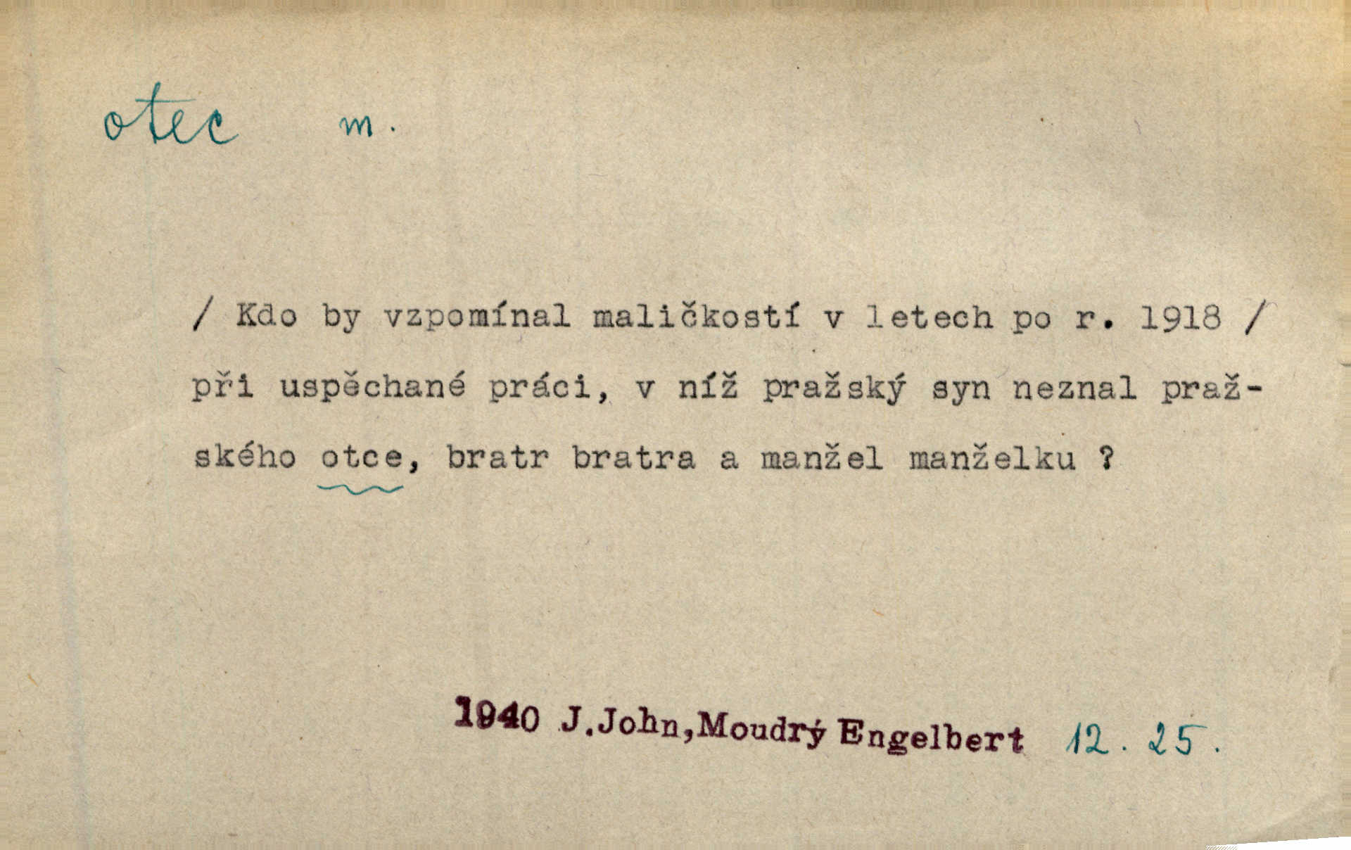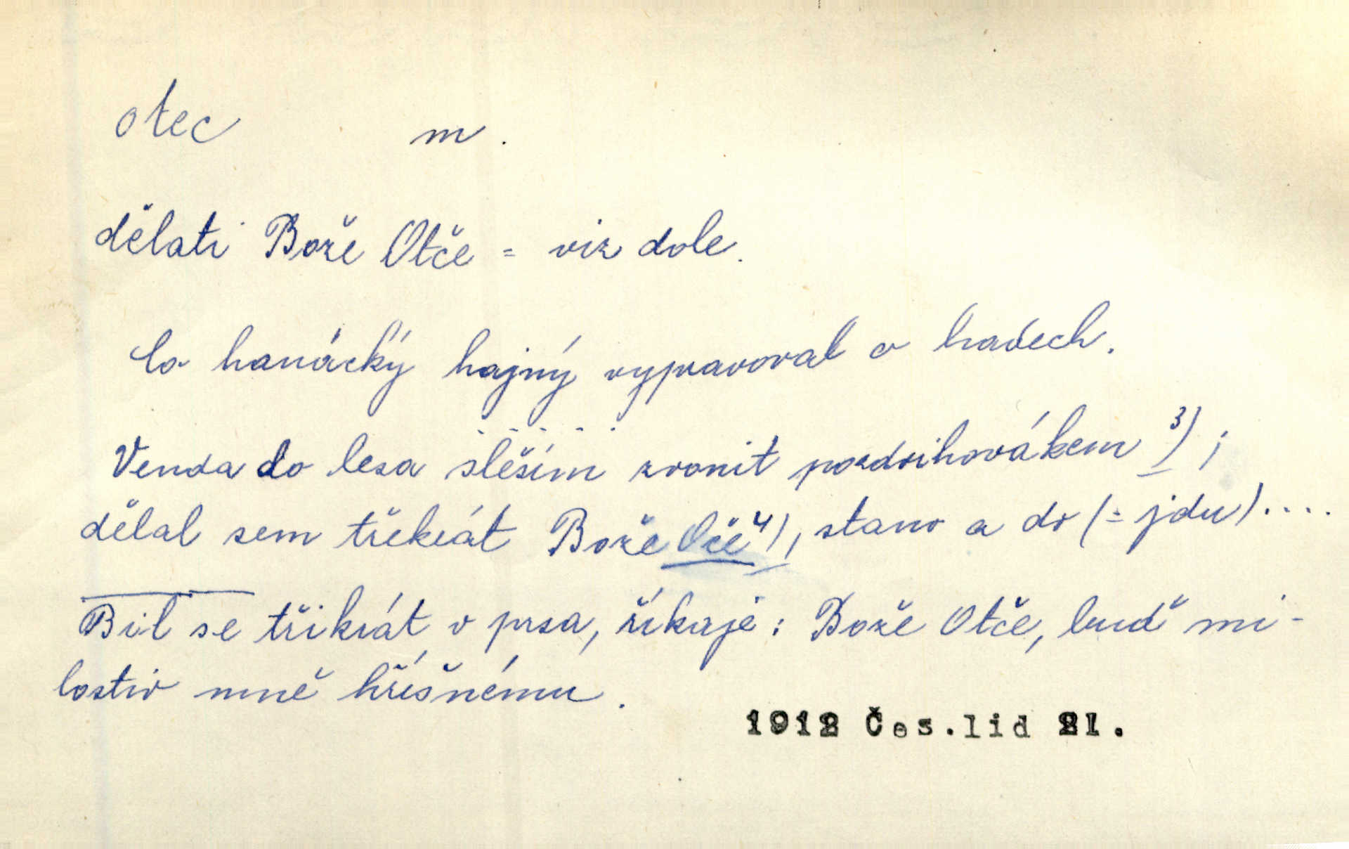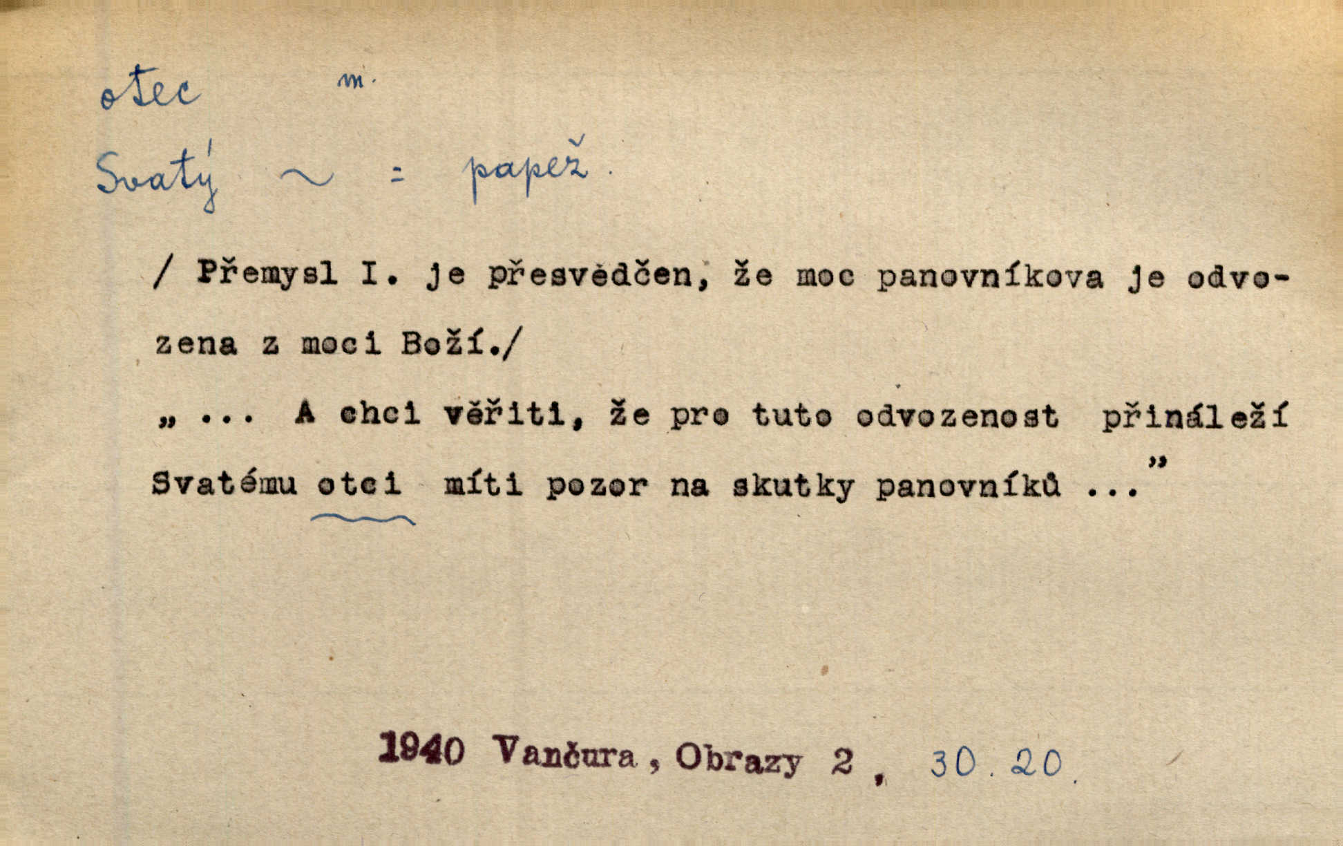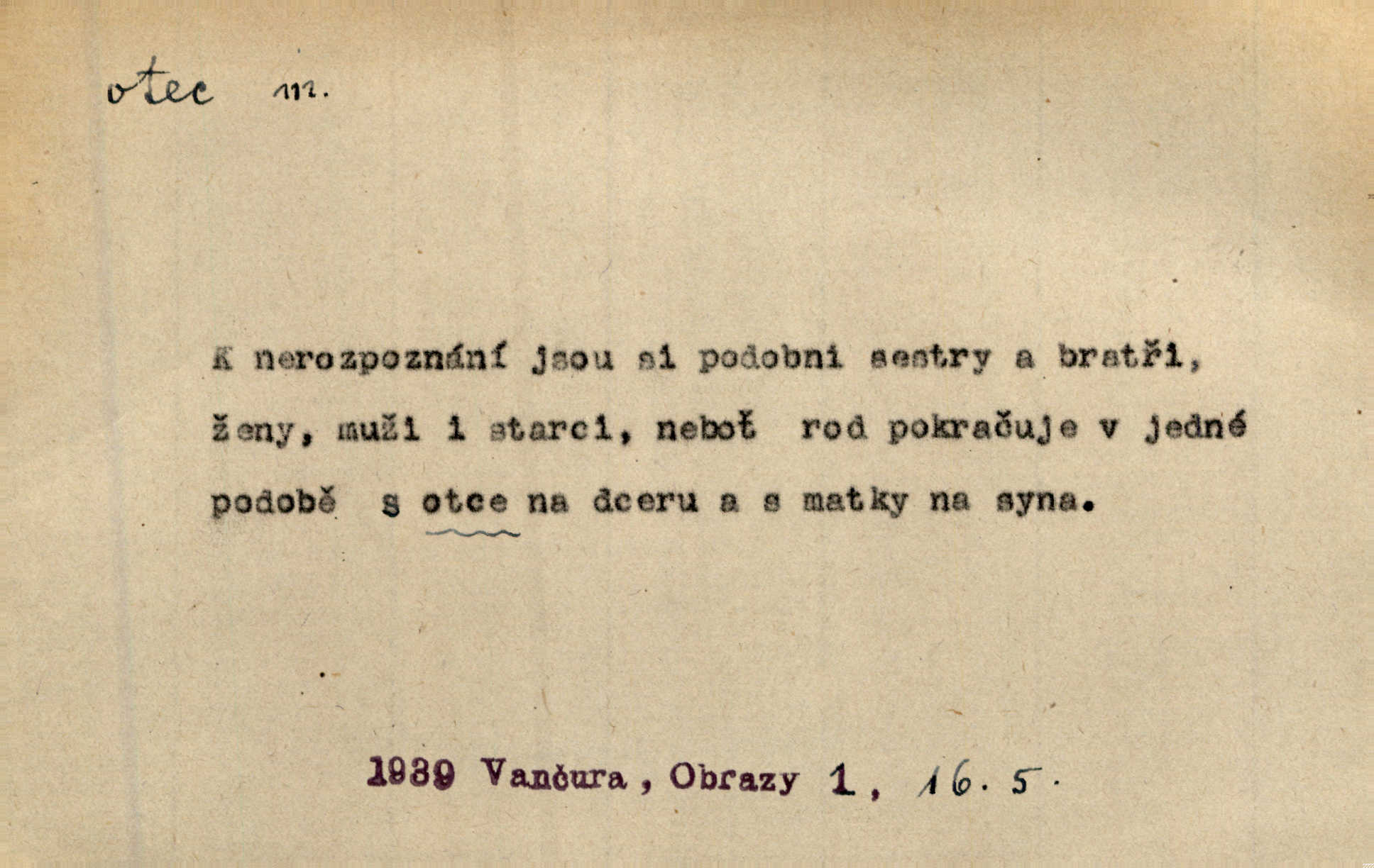 - otec, otce m. muž, jenž zplodil potomky. Nebylo pochybnosti, že Hanuš bude otcem a matka jeho babičkou. Šmil. Mně pravil otec na smrtelném loži: tys, dcero, rodu mého poslední. Krás. Jaký otec, taký syn. Hol. Nebyl bych tě poznal po tolika letech! Ukaž se přece! Jsi po otci, ano, po otci. K. Čap. Staří i mladí se sdružují. Jsou zcela patrné dvě vrstvy: „otcové a děti“. Herb. Nejsvětější z všeho krev je lidí, již k Bohu zří co k otci! Vrch. Doktor poslouchal pobožně; chtělť si svou trpělivostí dobré oko u nastávajícího pana otce koupiti. Šmil. Práv. otec manželský u něhož platí zákonná domněnka otcovství; otec nemanželský kdo otcovství dítěti nemanželskému uzná n. kdo je po žalobě paternitní za otce soudem prohlášen; otec adoptivní kdo smlouvou uměle založil poměr otcovský adopcí dítěte. D muž starající se o někoho n. o něco, moudře řídící něco, příznivec, ochránce, dobrodinec a pod. [Král mluví k lidu:] Jsemť, lide, otcem tvým, proč rouháš se mi směle vzdorem svým? Zey. O kázání před svatým požehnáním shrnuje otec dědiny všechny šťastné i nešťastné události své farnosti v jedno. A. Mrš. Podívejte se mi do očí, strýčku, otče náš. Šmil. Appoll, otec básníků. Mach. Zvědavě vyčkávali, cože nového na radnici upekli otcové města obecní starší, radní. Vrba. Na radnici zasedá odbor chudinský, který jmenuje pro jednotlivé okresy otce chudých referenty o chudinských věcech. Mach. D čestné pojmenování zasloužilého n. významného muže. Karel Čtvrtý, Otec vlasti. Něm. Palacký, Otec národa. MSN. [Vlastenci] zastyděli se za netečnost českého čtenářstva k otci Homerovi. Dibl. Rád myslí zalétám v ty krásné doby, když otec Radecký nás k slávě ved! Čech. D pan otec mlynář, majitel mlýna. Babička říkala o panu mlynáři, či lépe o panu otci, jak ho vůbec každý nazýval, že je rozšafný člověk. Něm. U nádržky deštěm nakypělé rád vytáhl pan otec stavidla. Krás. Vedlo se mu jako panu otci na horském mlýně přede žněmi. Vrba. D Dial. křestný, křestní, krstný otec kmotr. Císař Konstantin Porphyrogeneta [byl] jejím křestným otcem. Šaf. Nemohli se tomu dítěti rodiče dosti vynadiviti, až jim po chvíli na rozum přicházelo, že ji to asi ti krstní otcové obdařili [krásou]. Něm. D titul dávaný duchovním, zvl. členům církevních řádů. Mluvila jsem o té věci s otcem Bonaventurou, svým zpovědníkem. Bozd. Anidas, pomocník otce Pedra, poustevníka. Dyk. „Otče důstojný,“ pravím k němu [k jesuitovi]‚ „co jest mi činiti, abych šťastně a pokojně byl živ.“ Šmil. Hajná byla by duchovnímu otci ráda sklesla k nohoum. Schulz. Chodil do latinských škol, v nichž vyučovali otcové pobožných škol piaristé. Šmil. [Studentovi] latina otců piaristů valně nevoněla. Jir. Otcové řádu Ježíšova neobmezují se na pouhou inkvisici. Lum. Prvního vychování nabyl hoch u otců dominikánů. Ner. D Otcové (církevní) vynikající spisovatelé církevní staré doby. Nejznamenitější církevní otcové jsou na západě: sv. Ambrož, sv. Jeroným, sv. Augustin, sv. Řehoř Veliký. Podlaha. [Mistr Jaroš] nalézal v písmu svatém i v církevních otcích doklady a podporu pro svoje tvrzení. Podl. D svatý Otec papež. Vyjednává [Josef II.] již se samým papežem, aby byl řád [jesuitský] v jeho zemích zrušen, a sv. otec k přání tomu již již se nakloňuje. Svět. Jsou lidé, kteří si svaté katolické církve a svatého otce neváží a na lehko i jeho svatost berou. A. Mrš. D Otec křesťanský Bůh, zvl. první osoba svaté Trojice (Bůh Otec). Člověk tu se modlí k Otci svému o chléb vezdejší, tu zas vzývá matku boží o přímluvu. Hol. Všichni lidé jsou synové jednoho Otce na nebesích. Pal. Jeden z nich [vrabců] nepadne na zem bez vůle Otce Nebeského. Havl. Tam Věčný Otec sedí na oblaku. Vrch. Když chodili svatý Petr s Otcem nebeským po širokém údolí, přišli do jedné dědiny s Pánem Ježíšem. Něm. Zaklínám tě, duchu nečistý, ve jménu Boha Otce, Boha Syna, Boha Ducha svatého. Jir. Tu zazpíval Martinec zvučným hlasem: „Zdrávas, dcero Boha otce!“ Něm. D otec zakladatel rodu, praotec. První [díl země] dal [Noe] synu svému Chamovi, jenž byl otcem Sudanů, druhý Semovi, otci Arabů a Peršanů, a třetí Jafetovi, otci Turků. Pal. Já hledal všady [na Řípu] otce Čecha sled. Vrch. Hněte [sochař] hlínu podoben Tvůrci svému, v ráj když smavý postavil otce lidí Adama. Vrch. D otcové předkové, dědové. Bulharský selský lid spravuje se doposud dle obyčeje starých svých otcův. Něm. Dávný jazyk otců stal se mu čímsi posvátným. Zey. Dědici jen s namáháním udrželi, co ještě zachytili otcové. A. Mrš. Dočítám-li se se zalíbením o osudech osob mi nepovědomých, jakž bych ráda neseznala osudy otcův našich? Svět. Všichni se sjeli, aby uvítali mladého hraběte a jeho manželku, kterou poprvé na zámek svých otců přivážel. Jir. Zajisté ještě v duchu vidíte postavu bodrého našeho Baráka — o málo překročil padesátku a zašel k otcům zemřel. Herrm. Odešel k otcům a není ho více mezi živými. Šmil. D otec (čeho) původce, tvůrce, strůjce, zakladatel. Mistr Hanuš, otec a mistr nového orloje. Jir. Dobrovský naznačoval Jungmanna a Hanku co otce „Rukopisu Zelenohorského“. Ner. Pracoval [Měchura] o hudebním dramatě, o novověké spůsobě hudební, jejíž otcem vedle starého Glucka jest Wagner. Šmil. Za mlýnem je přirozený vodopád, který tu býval již před založením mlýna i rybníka — a který jistě byl otcem myšlenky předcházející obojímu činu. Vrba. Nekritisuji jejich [slov] duchovní otce — namnoze už nezvěstné —, nýbrž jejich obecné užití. K. Čap. Zaslouží si [Herodot] p