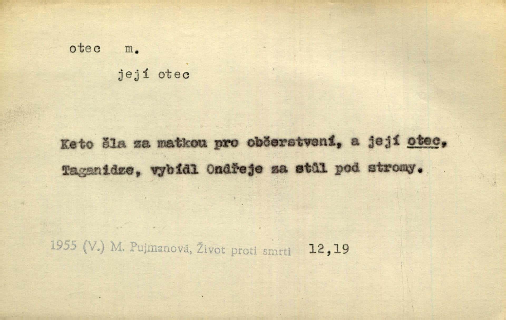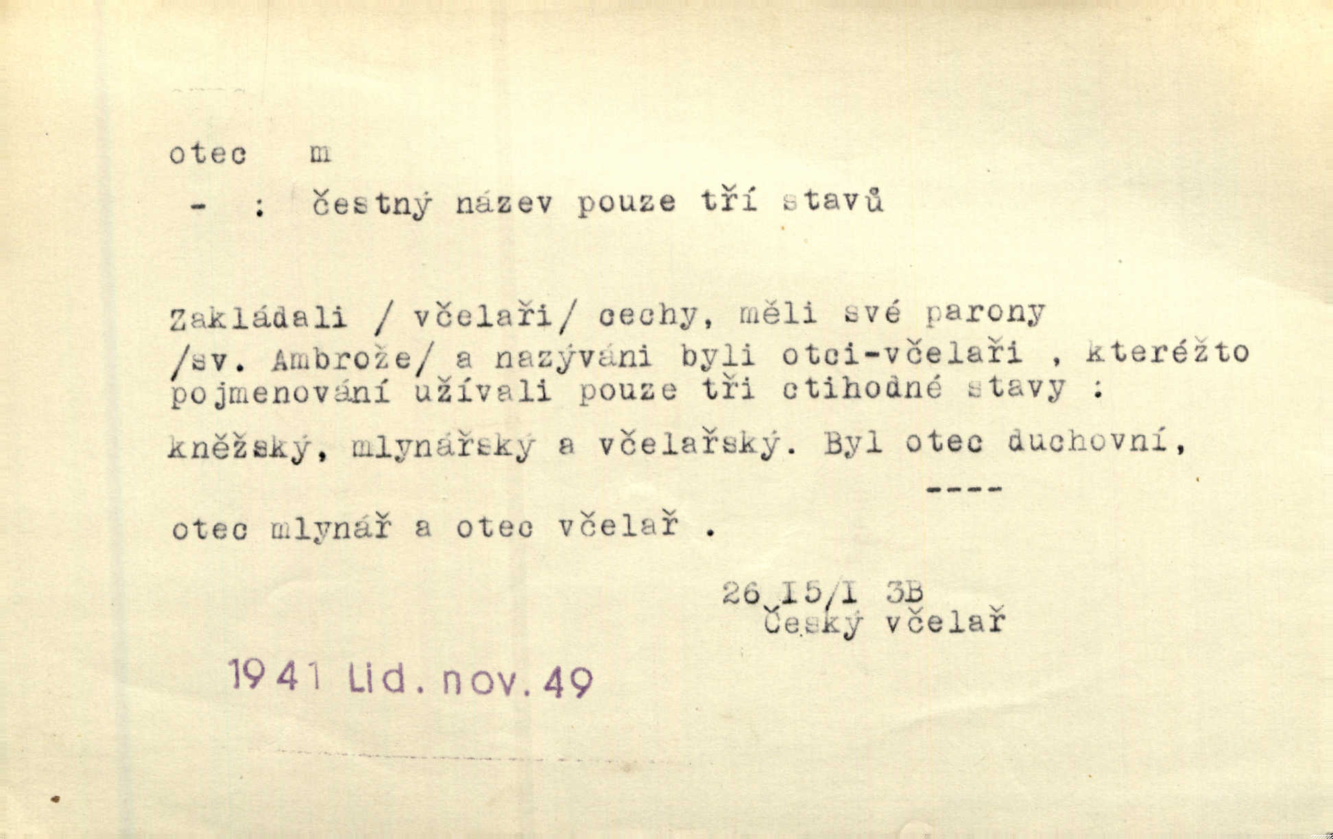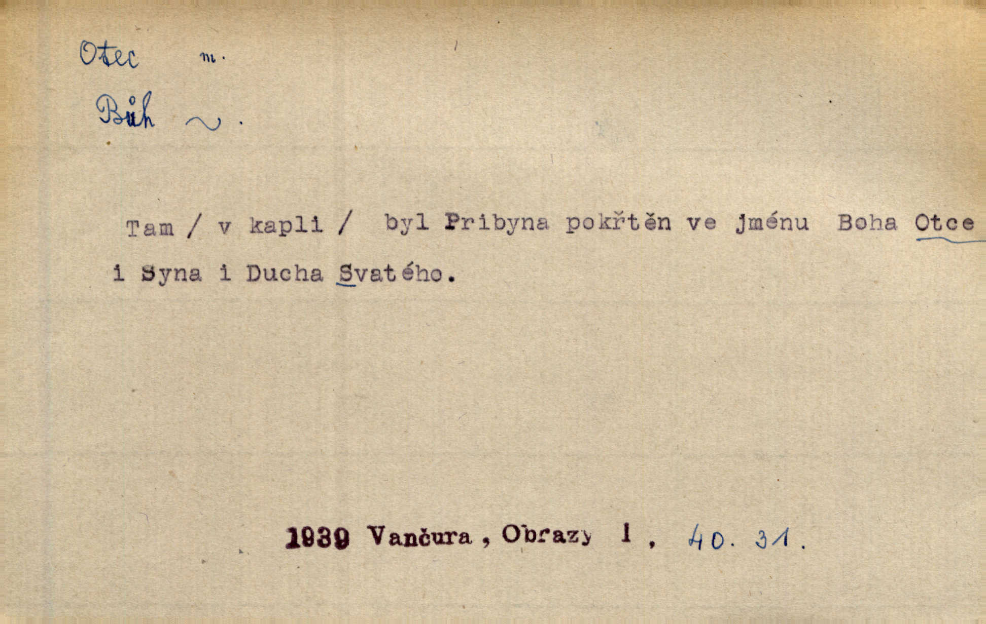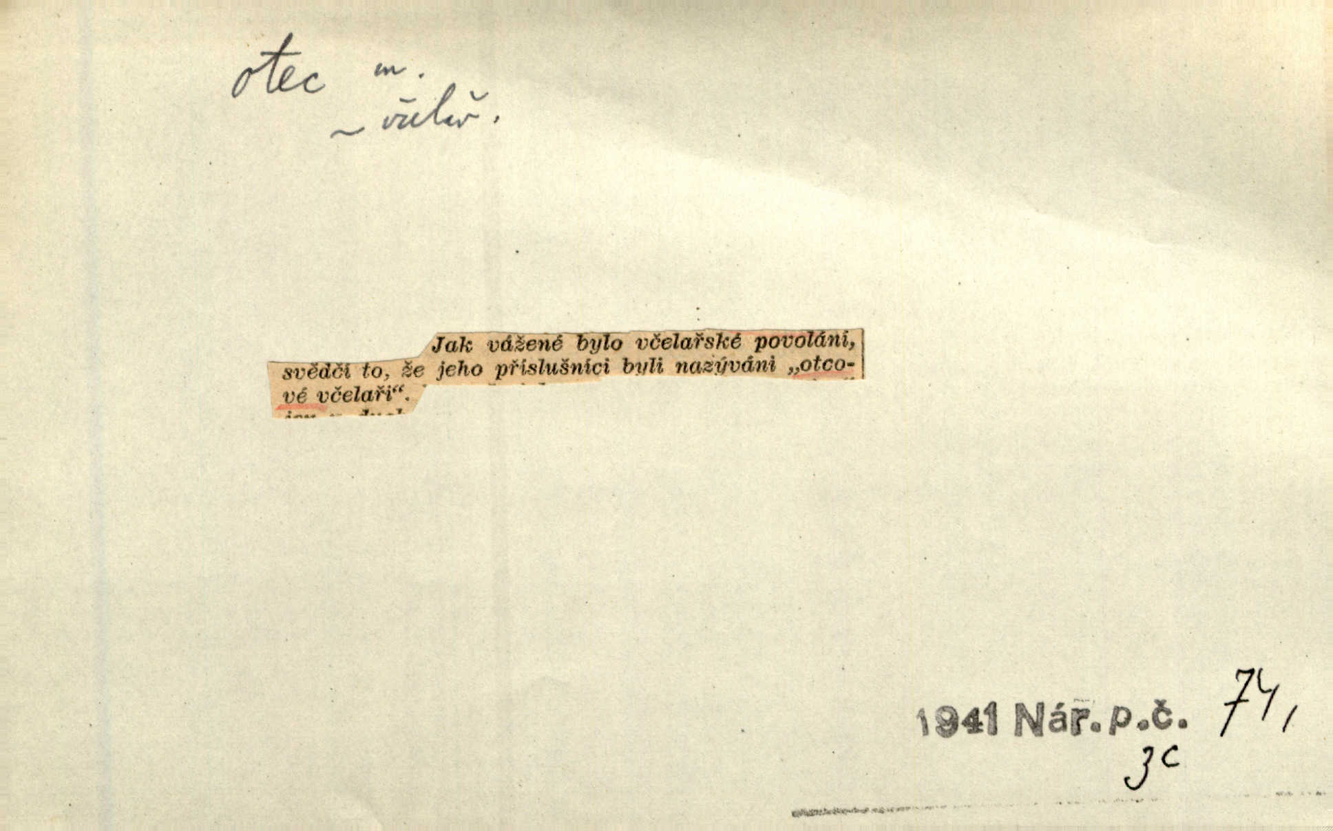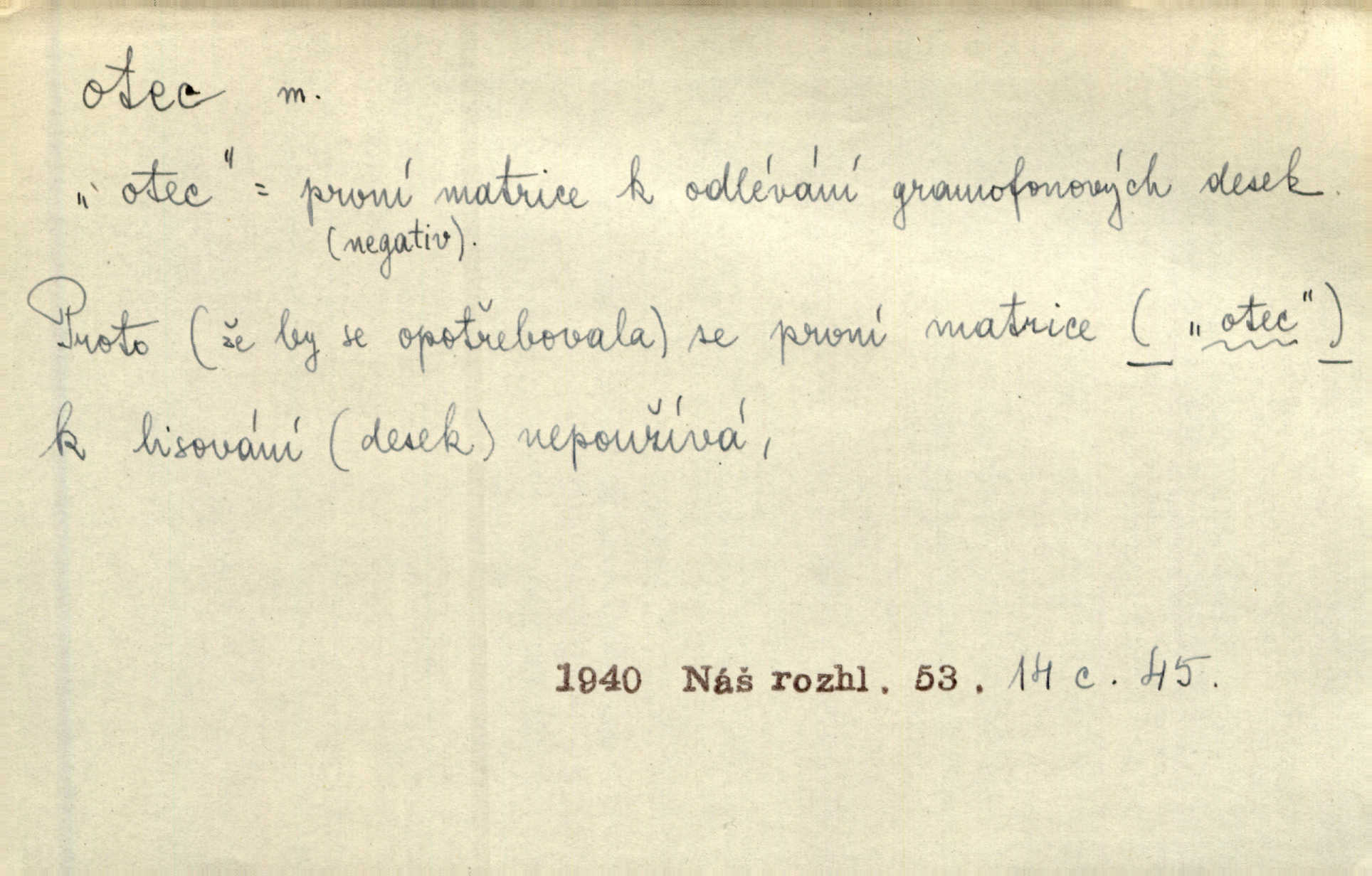 - otec, otce m. muž, jenž zplodil potomky. Nebylo pochybnosti, že Hanuš bude otcem a matka jeho babičkou. Šmil. Mně pravil otec na smrtelném loži: tys, dcero, rodu mého poslední. Krás. Jaký otec, taký syn. Hol. Nebyl bych tě poznal po tolika letech! Ukaž se přece! Jsi po otci, ano, po otci. K. Čap. Staří i mladí se sdružují. Jsou zcela patrné dvě vrstvy: „otcové a děti“. Herb. Nejsvětější z všeho krev je lidí, již k Bohu zří co k otci! Vrch. Doktor poslouchal pobožně; chtělť si svou trpělivostí dobré oko u nastávajícího pana otce koupiti. Šmil. Práv. otec manželský u něhož platí zákonná domněnka otcovství; otec nemanželský kdo otcovství dítěti nemanželskému uzná n. kdo je po žalobě paternitní za otce soudem prohlášen; otec adoptivní kdo smlouvou uměle založil poměr otcovský adopcí dítěte. D muž starající se o někoho n. o něco, moudře řídící něco, příznivec, ochránce, dobrodinec a pod. [Král mluví k lidu:] Jsemť, lide, otcem tvým, proč rouháš se mi směle vzdorem svým? Zey. O kázání před svatým požehnáním shrnuje otec dědiny všechny šťastné i nešťastné události své farnosti v jedno. A. Mrš. Podívejte se mi do očí, strýčku, otče náš. Šmil. Appoll, otec básníků. Mach. Zvědavě vyčkávali, cože nového na radnici upekli otcové města obecní starší, radní. Vrba. Na radnici zasedá odbor chudinský, který jmenuje pro jednotlivé okresy otce chudých referenty o chudinských věcech. Mach. D čestné pojmenování zasloužilého n. významného muže. Karel Čtvrtý, Otec vlasti. Něm. Palacký, Otec národa. MSN. [Vlastenci] zastyděli se za netečnost českého čtenářstva k otci Homerovi. Dibl. Rád myslí zalétám v ty krásné doby, když otec Radecký nás k slávě ved! Čech. D pan otec mlynář, majitel mlýna. Babička říkala o panu mlynáři, či lépe o panu otci, jak ho vůbec každý nazýval, že je rozšafný člověk. Něm. U nádržky deštěm nakypělé rád vytáhl pan otec stavidla. Krás. Vedlo se mu jako panu otci na horském mlýně přede žněmi. Vrba. D Dial. křestný, křestní, krstný otec kmotr. Císař Konstantin Porphyrogeneta [byl] jejím křestným otcem. Šaf. Nemohli se tomu dítěti rodiče dosti vynadiviti, až jim po chvíli na rozum přicházelo, že ji to asi ti krstní otcové obdařili [krásou]. Něm. D titul dávaný duchovním, zvl. členům církevních řádů. Mluvila jsem o té věci s otcem Bonaventurou, svým zpovědníkem. Bozd. Anidas, pomocník otce Pedra, poustevníka. Dyk. „Otče důstojný,“ pravím k němu [k jesuitovi]‚ „co jest mi činiti, abych šťastně a pokojně byl živ.“ Šmil. Hajná byla by duchovnímu otci ráda sklesla k nohoum. Schulz. Chodil do latinských škol, v nichž vyučovali otcové pobožných škol piaristé. Šmil. [Studentovi] latina otců piaristů valně nevoněla. Jir. Otcové řádu Ježíšova neobmezují se na pouhou inkvisici. Lum. Prvního vychování nabyl hoch u otců dominikánů. Ner. D Otcové (církevní) vynikající spisovatelé církevní staré doby. Nejznamenitější církevní otcové jsou na západě: sv. Ambrož, sv. Jeroným, sv. Augustin, sv. Řehoř Veliký. Podlaha. [Mistr Jaroš] nalézal v písmu svatém i v církevních otcích doklady a podporu pro svoje tvrzení. Podl. D svatý Otec papež. Vyjednává [Josef II.] již se samým papežem, aby byl řád [jesuitský] v jeho zemích zrušen, a sv. otec k přání tomu již již se nakloňuje. Svět. Jsou lidé, kteří si svaté katolické církve a svatého otce neváží a na lehko i jeho svatost berou. A. Mrš. D Otec křesťanský Bůh, zvl. první osoba svaté Trojice (Bůh Otec). Člověk tu se modlí k Otci svému o chléb vezdejší, tu zas vzývá matku boží o přímluvu. Hol. Všichni lidé jsou synové jednoho Otce na nebesích. Pal. Jeden z nich [vrabců] nepadne na zem bez vůle Otce Nebeského. Havl. Tam Věčný Otec sedí na oblaku. Vrch. Když chodili svatý Petr s Otcem nebeským po širokém údolí, přišli do jedné dědiny s Pánem Ježíšem. Něm. Zaklínám tě, duchu nečistý, ve jménu Boha Otce, Boha Syna, Boha Ducha svatého. Jir. Tu zazpíval Martinec zvučným hlasem: „Zdrávas, dcero Boha otce!“ Něm. D otec zakladatel rodu, praotec. První [díl země] dal [Noe] synu svému Chamovi, jenž byl otcem Sudanů, druhý Semovi, otci Arabů a Peršanů, a třetí Jafetovi, otci Turků. Pal. Já hledal všady [na Řípu] otce Čecha sled. Vrch. Hněte [sochař] hlínu podoben Tvůrci svému, v ráj když smavý postavil otce lidí Adama. Vrch. D otcové předkové, dědové. Bulharský selský lid spravuje se doposud dle obyčeje starých svých otcův. Něm. Dávný jazyk otců stal se mu čímsi posvátným. Zey. Dědici jen s namáháním udrželi, co ještě zachytili otcové. A. Mrš. Dočítám-li se se zalíbením o osudech osob mi nepovědomých, jakž bych ráda neseznala osudy otcův našich? Svět. Všichni se sjeli, aby uvítali mladého hraběte a jeho manželku, kterou poprvé na zámek svých otců přivážel. Jir. Zajisté ještě v duchu vidíte postavu bodrého našeho Baráka — o málo překročil padesátku a zašel k otcům zemřel. Herrm. Odešel k otcům a není ho více mezi živými. Šmil. D otec (čeho) původce, tvůrce, strůjce, zakladatel. Mistr Hanuš, otec a mistr nového orloje. Jir. Dobrovský naznačoval Jungmanna a Hanku co otce „Rukopisu Zelenohorského“. Ner. Pracoval [Měchura] o hudebním dramatě, o novověké spůsobě hudební, jejíž otcem vedle starého Glucka jest Wagner. Šmil. Za mlýnem je přirozený vodopád, který tu býval již před založením mlýna i rybníka — a který jistě byl otcem myšlenky předcházející obojímu činu. Vrba. Nekritisuji jejich [slov] duchovní otce — namnoze už nezvěstné —, nýbrž jejich obecné užití. K. Čap. Zaslouží si [Herodot] p