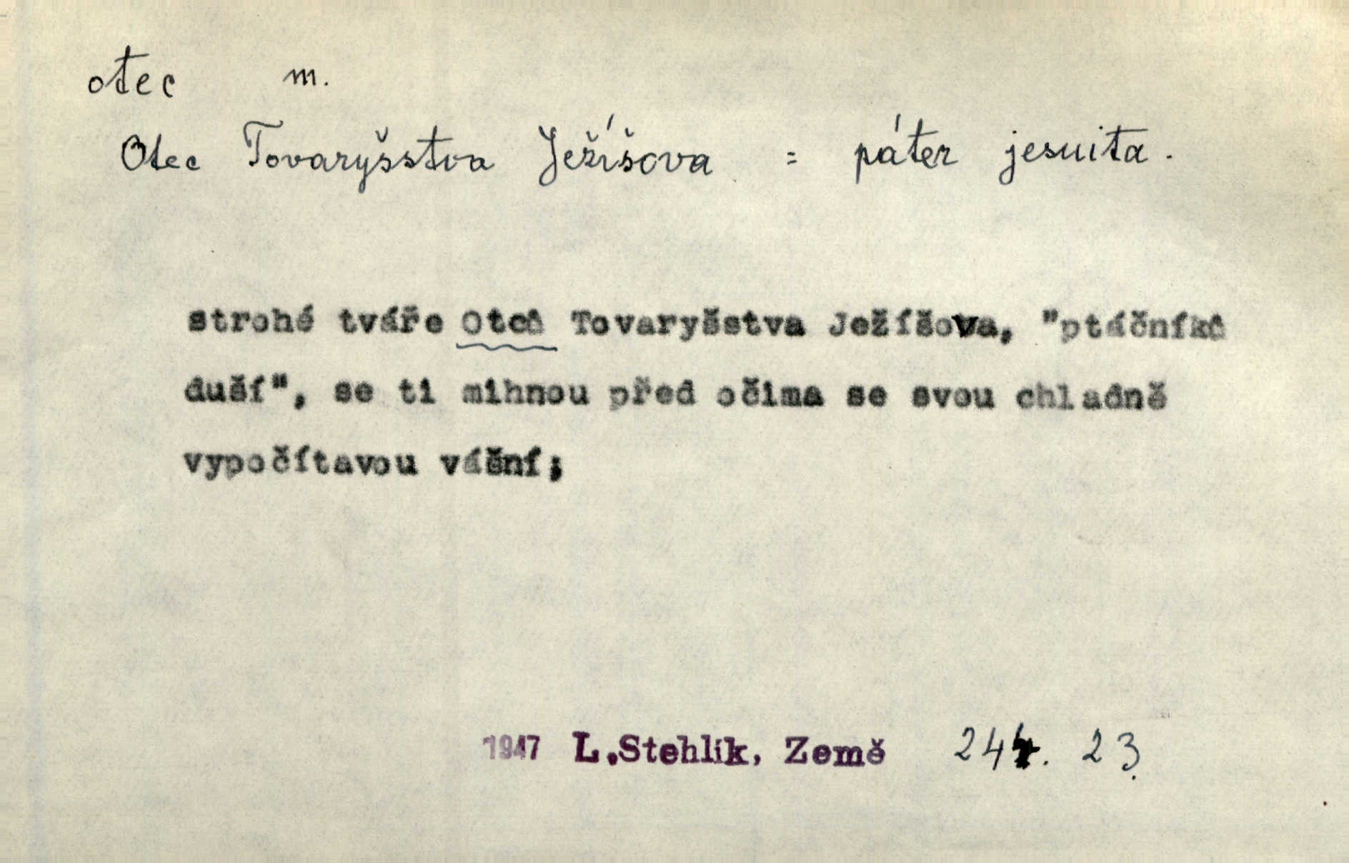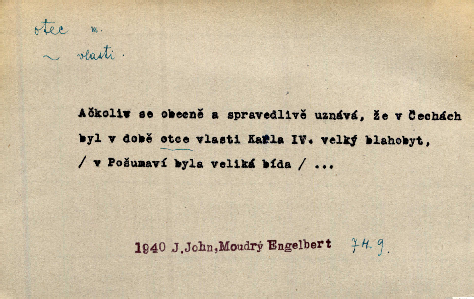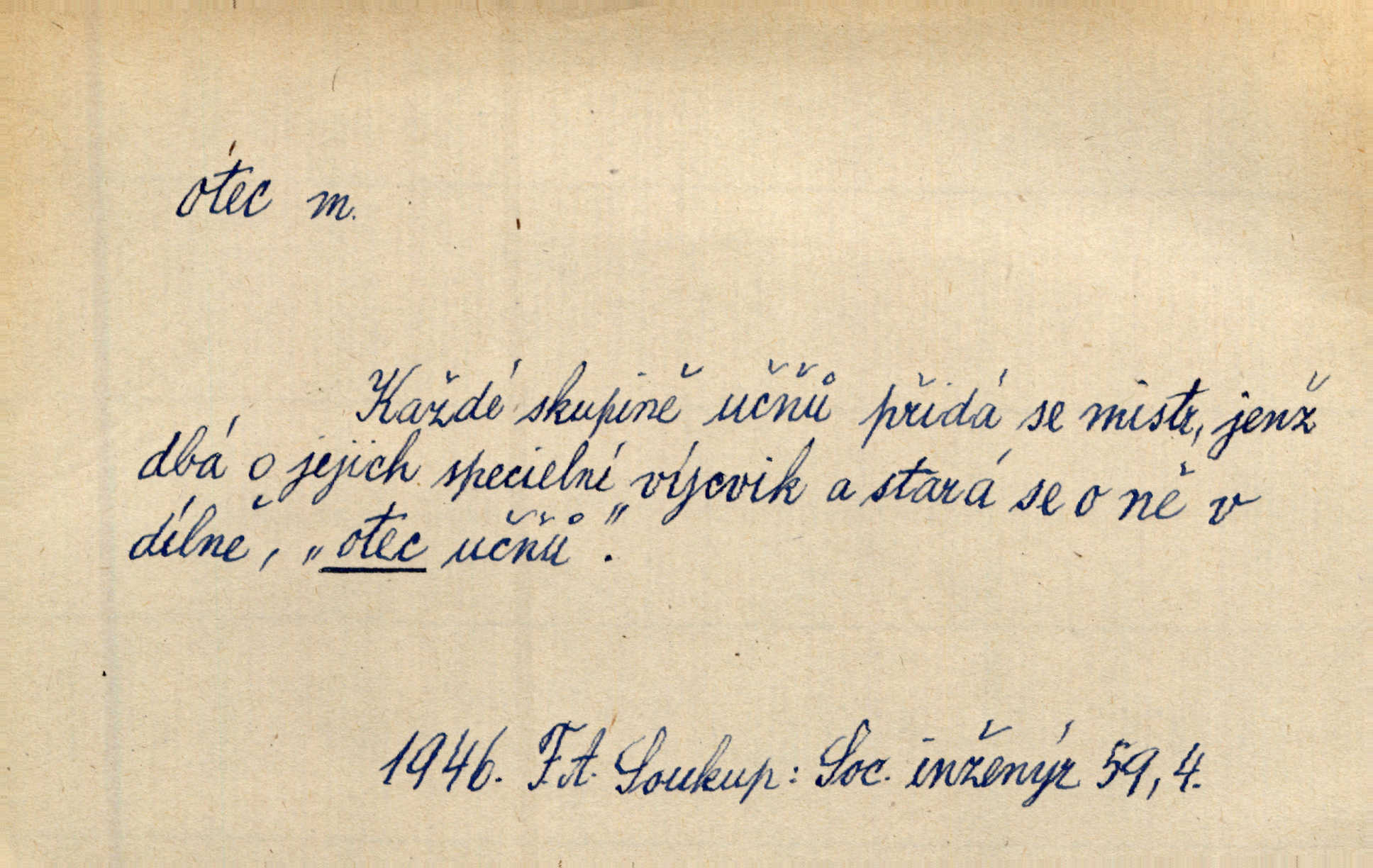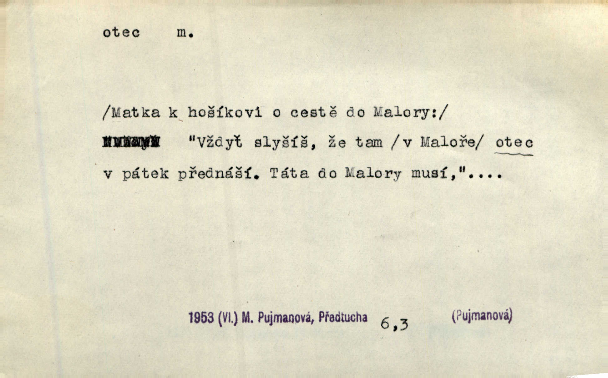 - otec, otce m. muž, jenž zplodil potomky. Nebylo pochybnosti, že Hanuš bude otcem a matka jeho babičkou. Šmil. Mně pravil otec na smrtelném loži: tys, dcero, rodu mého poslední. Krás. Jaký otec, taký syn. Hol. Nebyl bych tě poznal po tolika letech! Ukaž se přece! Jsi po otci, ano, po otci. K. Čap. Staří i mladí se sdružují. Jsou zcela patrné dvě vrstvy: „otcové a děti“. Herb. Nejsvětější z všeho krev je lidí, již k Bohu zří co k otci! Vrch. Doktor poslouchal pobožně; chtělť si svou trpělivostí dobré oko u nastávajícího pana otce koupiti. Šmil. Práv. otec manželský u něhož platí zákonná domněnka otcovství; otec nemanželský kdo otcovství dítěti nemanželskému uzná n. kdo je po žalobě paternitní za otce soudem prohlášen; otec adoptivní kdo smlouvou uměle založil poměr otcovský adopcí dítěte. D muž starající se o někoho n. o něco, moudře řídící něco, příznivec, ochránce, dobrodinec a pod. [Král mluví k lidu:] Jsemť, lide, otcem tvým, proč rouháš se mi směle vzdorem svým? Zey. O kázání před svatým požehnáním shrnuje otec dědiny všechny šťastné i nešťastné události své farnosti v jedno. A. Mrš. Podívejte se mi do očí, strýčku, otče náš. Šmil. Appoll, otec básníků. Mach. Zvědavě vyčkávali, cože nového na radnici upekli otcové města obecní starší, radní. Vrba. Na radnici zasedá odbor chudinský, který jmenuje pro jednotlivé okresy otce chudých referenty o chudinských věcech. Mach. D čestné pojmenování zasloužilého n. významného muže. Karel Čtvrtý, Otec vlasti. Něm. Palacký, Otec národa. MSN. [Vlastenci] zastyděli se za netečnost českého čtenářstva k otci Homerovi. Dibl. Rád myslí zalétám v ty krásné doby, když otec Radecký nás k slávě ved! Čech. D pan otec mlynář, majitel mlýna. Babička říkala o panu mlynáři, či lépe o panu otci, jak ho vůbec každý nazýval, že je rozšafný člověk. Něm. U nádržky deštěm nakypělé rád vytáhl pan otec stavidla. Krás. Vedlo se mu jako panu otci na horském mlýně přede žněmi. Vrba. D Dial. křestný, křestní, krstný otec kmotr. Císař Konstantin Porphyrogeneta [byl] jejím křestným otcem. Šaf. Nemohli se tomu dítěti rodiče dosti vynadiviti, až jim po chvíli na rozum přicházelo, že ji to asi ti krstní otcové obdařili [krásou]. Něm. D titul dávaný duchovním, zvl. členům církevních řádů. Mluvila jsem o té věci s otcem Bonaventurou, svým zpovědníkem. Bozd. Anidas, pomocník otce Pedra, poustevníka. Dyk. „Otče důstojný,“ pravím k němu [k jesuitovi]‚ „co jest mi činiti, abych šťastně a pokojně byl živ.“ Šmil. Hajná byla by duchovnímu otci ráda sklesla k nohoum. Schulz. Chodil do latinských škol, v nichž vyučovali otcové pobožných škol piaristé. Šmil. [Studentovi] latina otců piaristů valně nevoněla. Jir. Otcové řádu Ježíšova neobmezují se na pouhou inkvisici. Lum. Prvního vychování nabyl hoch u otců dominikánů. Ner. D Otcové (církevní) vynikající spisovatelé církevní staré doby. Nejznamenitější církevní otcové jsou na západě: sv. Ambrož, sv. Jeroným, sv. Augustin, sv. Řehoř Veliký. Podlaha. [Mistr Jaroš] nalézal v písmu svatém i v církevních otcích doklady a podporu pro svoje tvrzení. Podl. D svatý Otec papež. Vyjednává [Josef II.] již se samým papežem, aby byl řád [jesuitský] v jeho zemích zrušen, a sv. otec k přání tomu již již se nakloňuje. Svět. Jsou lidé, kteří si svaté katolické církve a svatého otce neváží a na lehko i jeho svatost berou. A. Mrš. D Otec křesťanský Bůh, zvl. první osoba svaté Trojice (Bůh Otec). Člověk tu se modlí k Otci svému o chléb vezdejší, tu zas vzývá matku boží o přímluvu. Hol. Všichni lidé jsou synové jednoho Otce na nebesích. Pal. Jeden z nich [vrabců] nepadne na zem bez vůle Otce Nebeského. Havl. Tam Věčný Otec sedí na oblaku. Vrch. Když chodili svatý Petr s Otcem nebeským po širokém údolí, přišli do jedné dědiny s Pánem Ježíšem. Něm. Zaklínám tě, duchu nečistý, ve jménu Boha Otce, Boha Syna, Boha Ducha svatého. Jir. Tu zazpíval Martinec zvučným hlasem: „Zdrávas, dcero Boha otce!“ Něm. D otec zakladatel rodu, praotec. První [díl země] dal [Noe] synu svému Chamovi, jenž byl otcem Sudanů, druhý Semovi, otci Arabů a Peršanů, a třetí Jafetovi, otci Turků. Pal. Já hledal všady [na Řípu] otce Čecha sled. Vrch. Hněte [sochař] hlínu podoben Tvůrci svému, v ráj když smavý postavil otce lidí Adama. Vrch. D otcové předkové, dědové. Bulharský selský lid spravuje se doposud dle obyčeje starých svých otcův. Něm. Dávný jazyk otců stal se mu čímsi posvátným. Zey. Dědici jen s namáháním udrželi, co ještě zachytili otcové. A. Mrš. Dočítám-li se se zalíbením o osudech osob mi nepovědomých, jakž bych ráda neseznala osudy otcův našich? Svět. Všichni se sjeli, aby uvítali mladého hraběte a jeho manželku, kterou poprvé na zámek svých otců přivážel. Jir. Zajisté ještě v duchu vidíte postavu bodrého našeho Baráka — o málo překročil padesátku a zašel k otcům zemřel. Herrm. Odešel k otcům a není ho více mezi živými. Šmil. D otec (čeho) původce, tvůrce, strůjce, zakladatel. Mistr Hanuš, otec a mistr nového orloje. Jir. Dobrovský naznačoval Jungmanna a Hanku co otce „Rukopisu Zelenohorského“. Ner. Pracoval [Měchura] o hudebním dramatě, o novověké spůsobě hudební, jejíž otcem vedle starého Glucka jest Wagner. Šmil. Za mlýnem je přirozený vodopád, který tu býval již před založením mlýna i rybníka — a který jistě byl otcem myšlenky předcházející obojímu činu. Vrba. Nekritisuji jejich [slov] duchovní otce — namnoze už nezvěstné —, nýbrž jejich obecné užití. K. Čap. Zaslouží si [Herodot] p